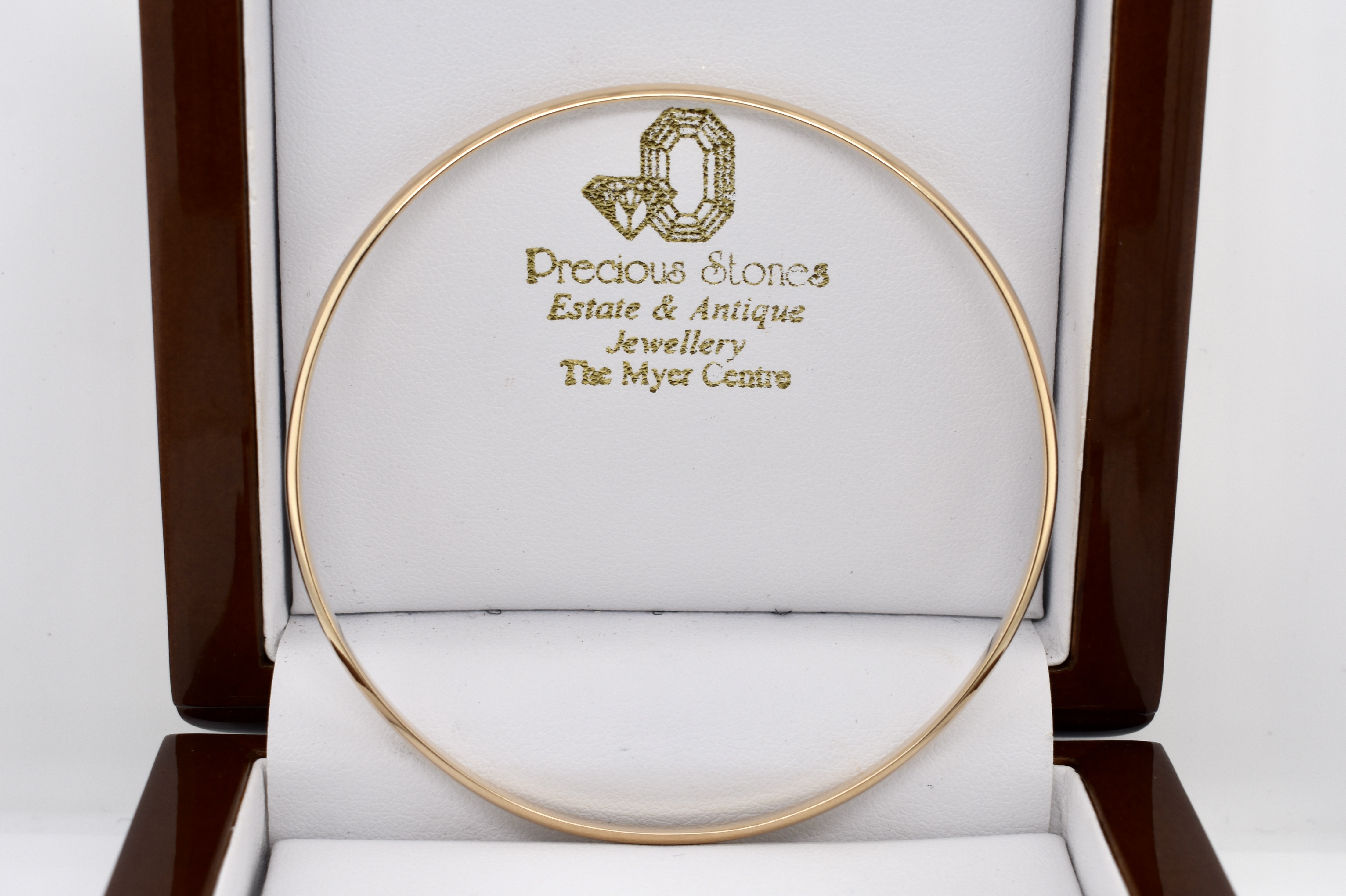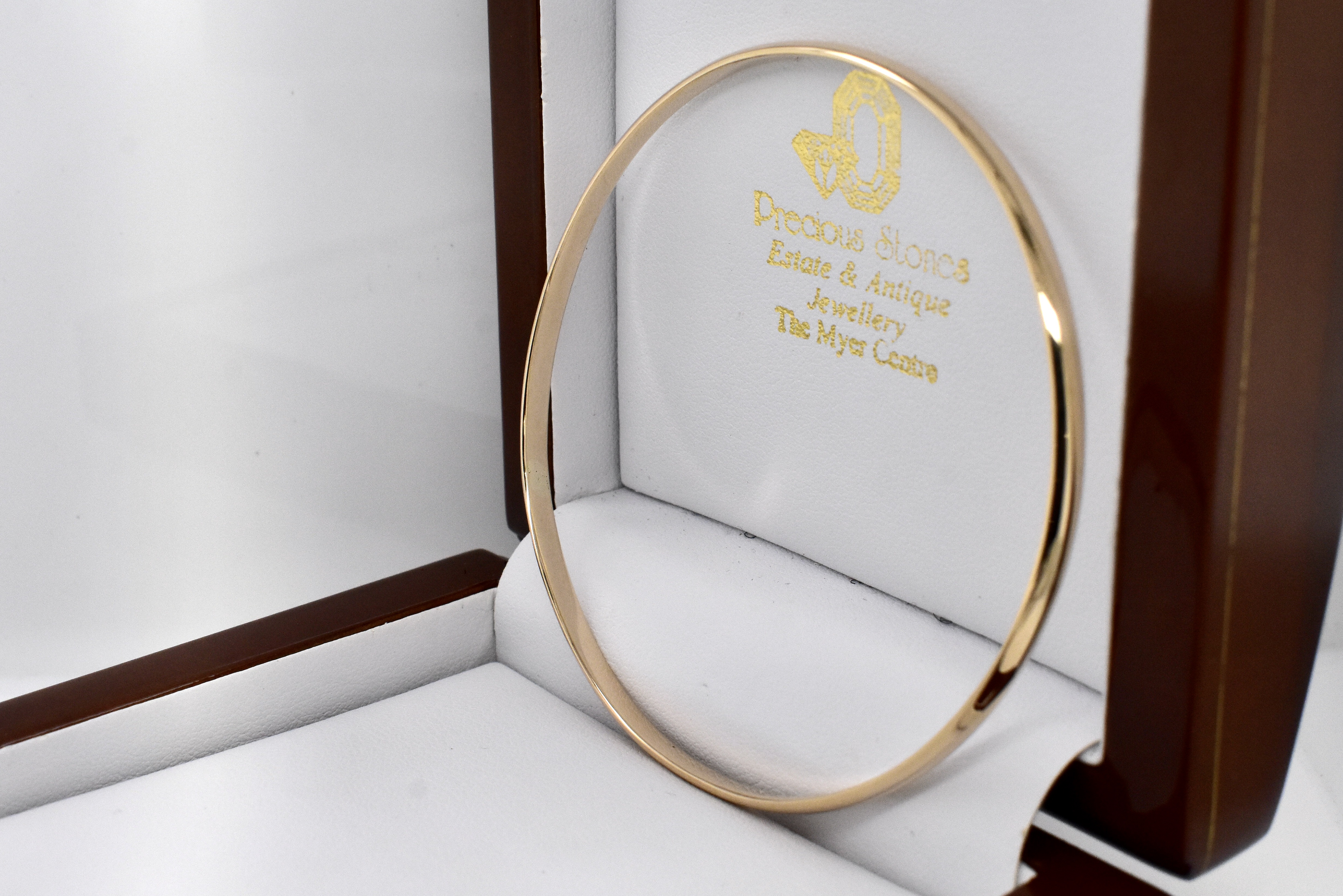 A timeless jewellery collection staple, this handmade solid, round bangle has been crafted in 9ct yellow gold with a high dome profile and comfort fit to the inside. Bangle is hand size 66mm and 3.5mm wide with a depth of 1.52mm. Weighing 10.1grams.