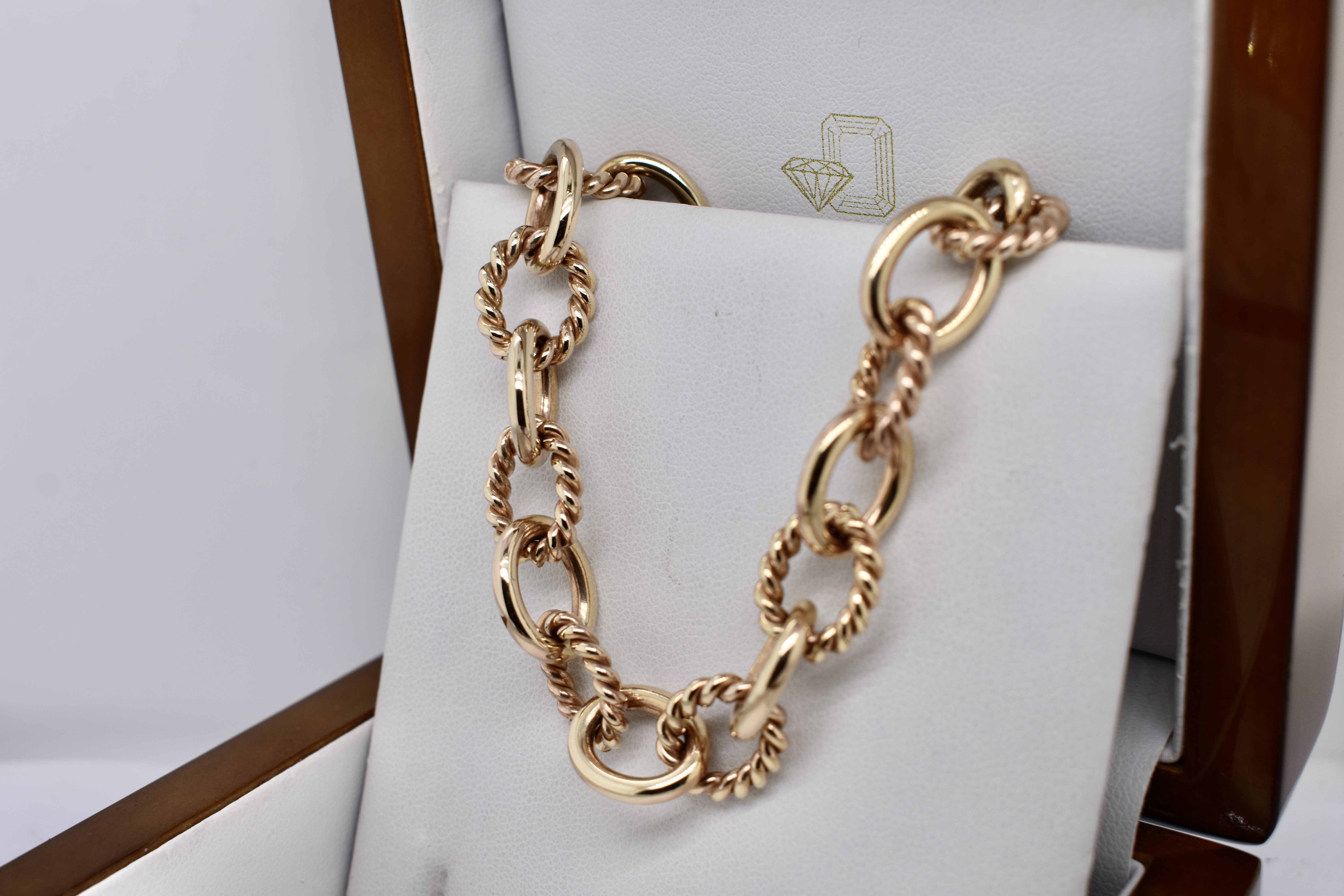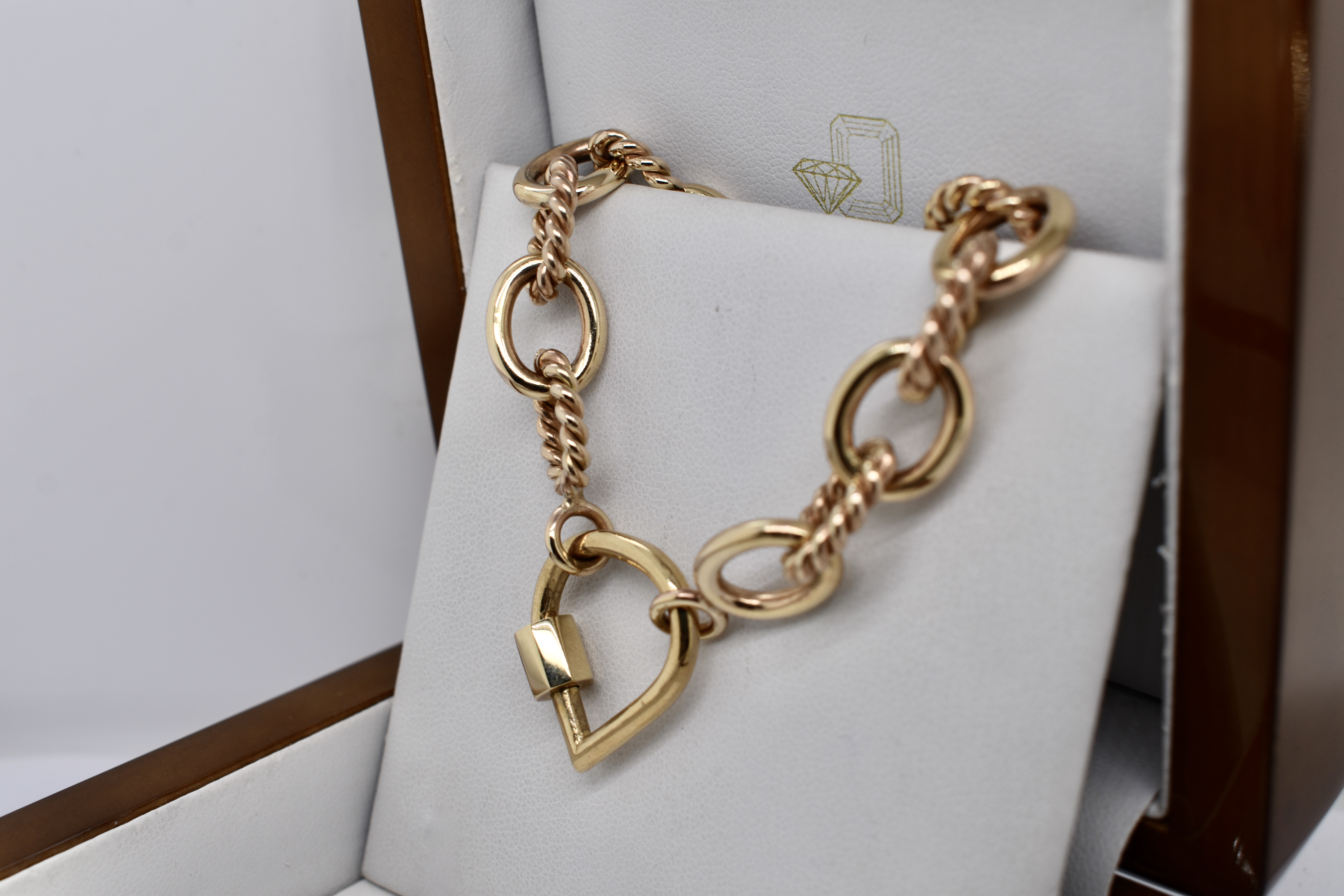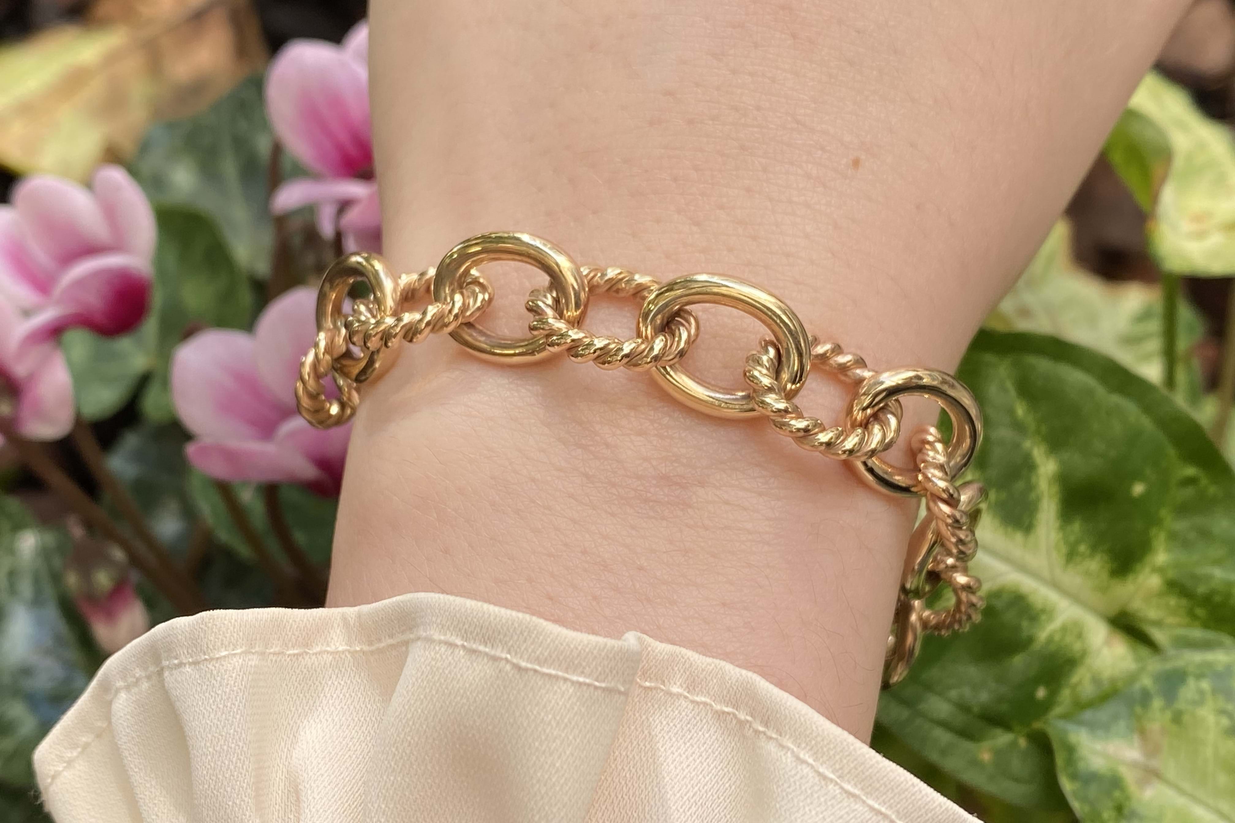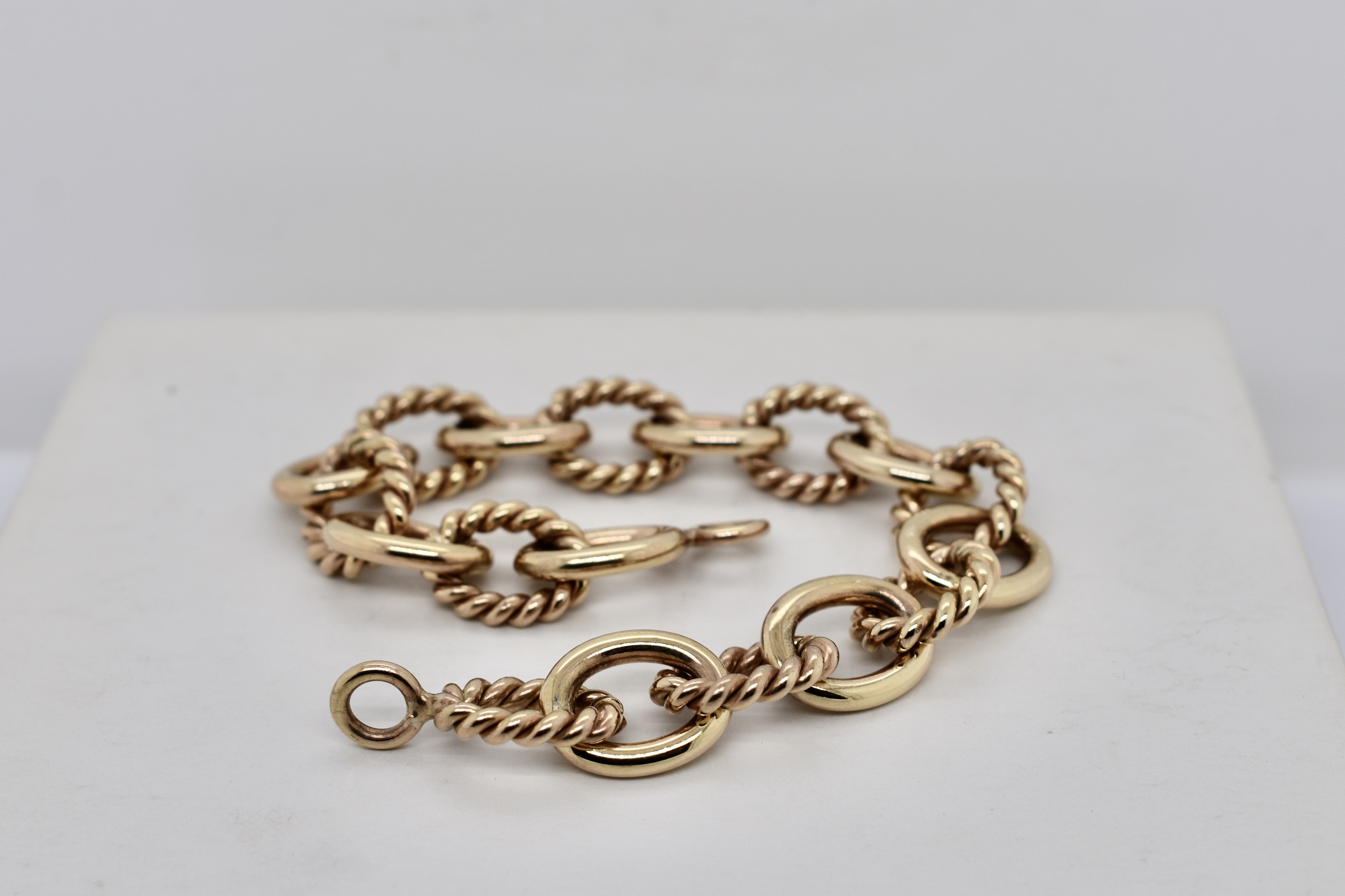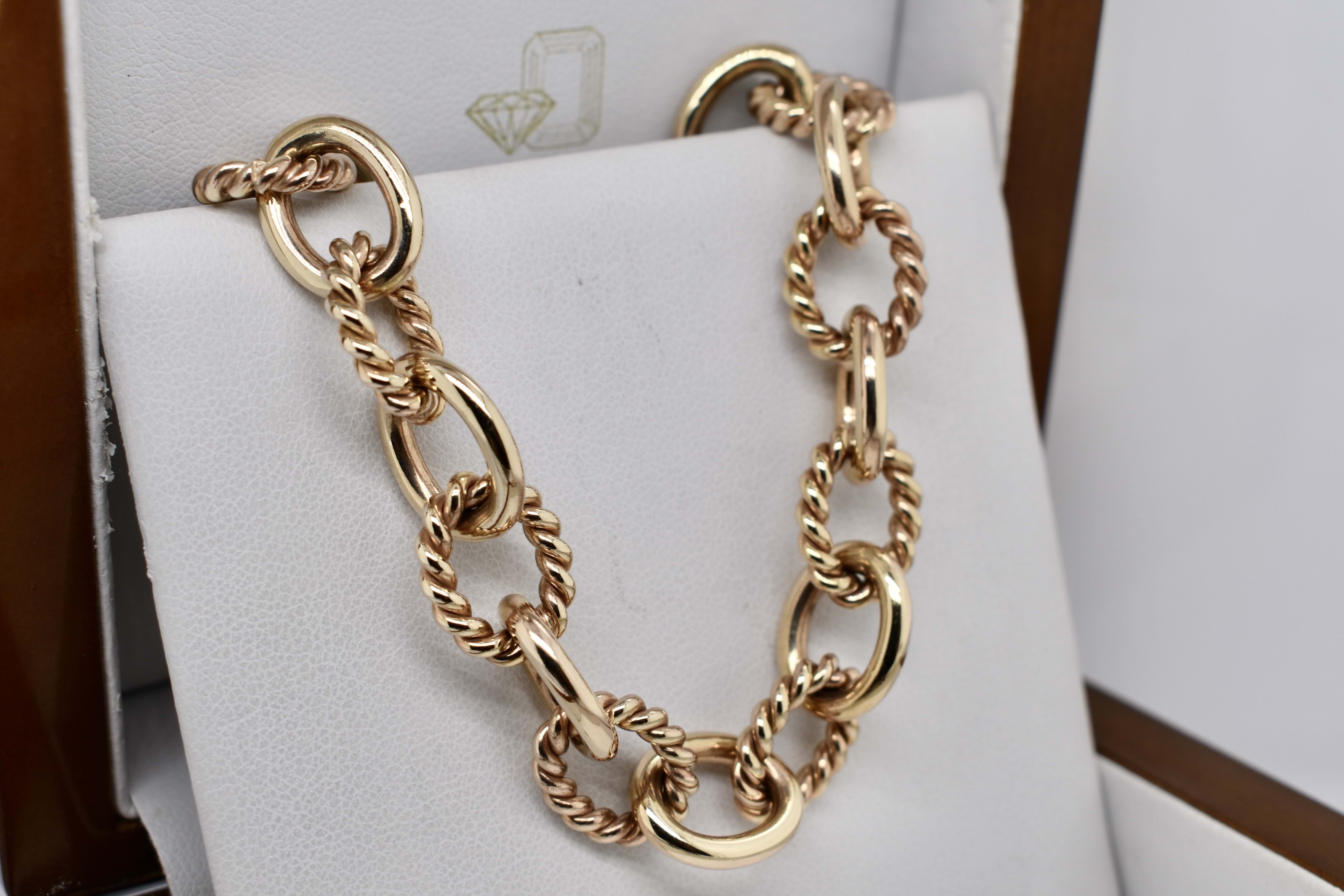 A magnificent piece of craftsmanship, this bracelet is hand crafted in solid 9ct yellow gold and features oval shaped links alternating with plain and twisted rope design giving the bracelet a nautical theme. This bracelet has no clasp and is instead finished with two jump rings, allowing a carabiner, padlock or other type of clasp to be attached. Bracelet weighs 30.70 grams and is 18.5cm long.