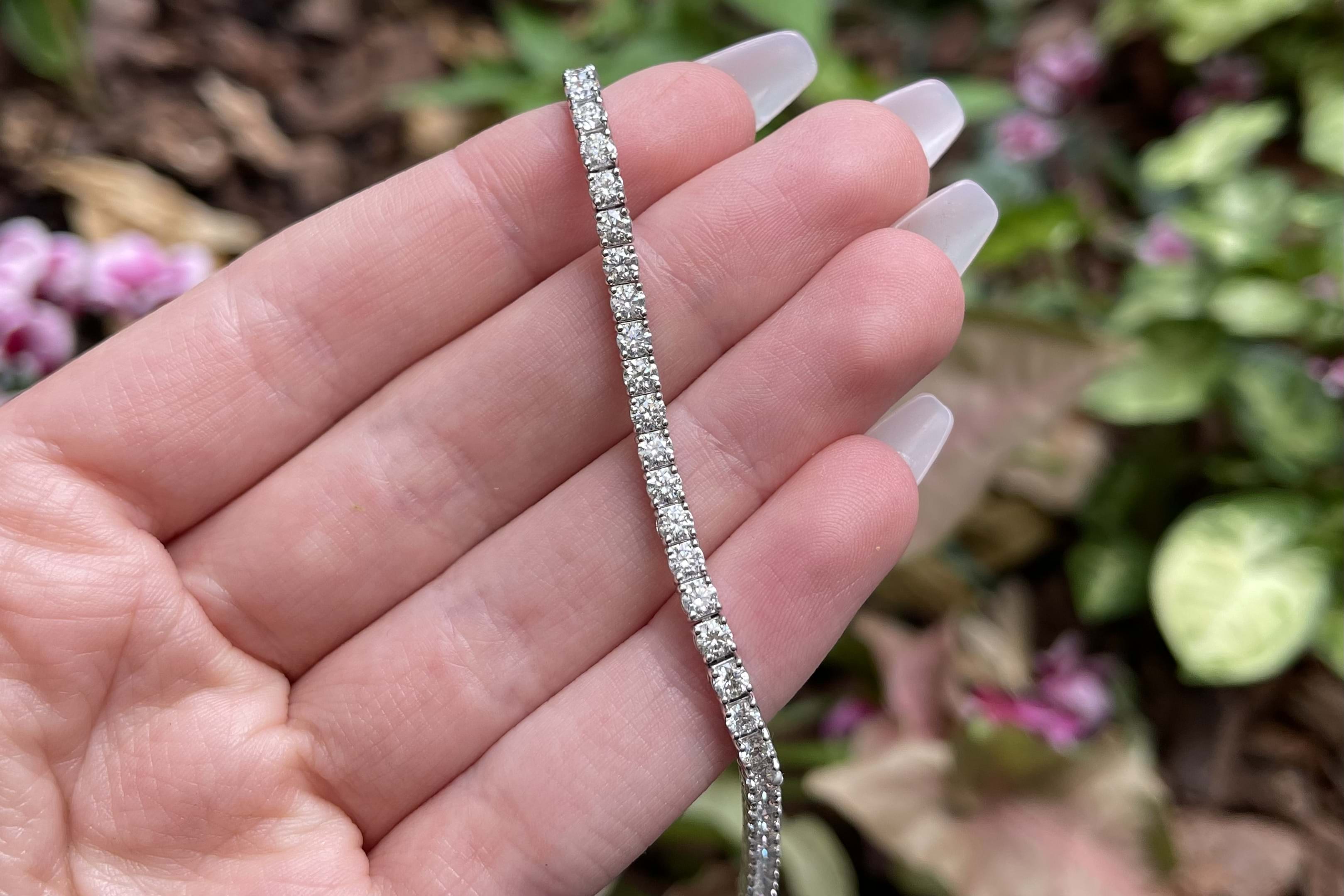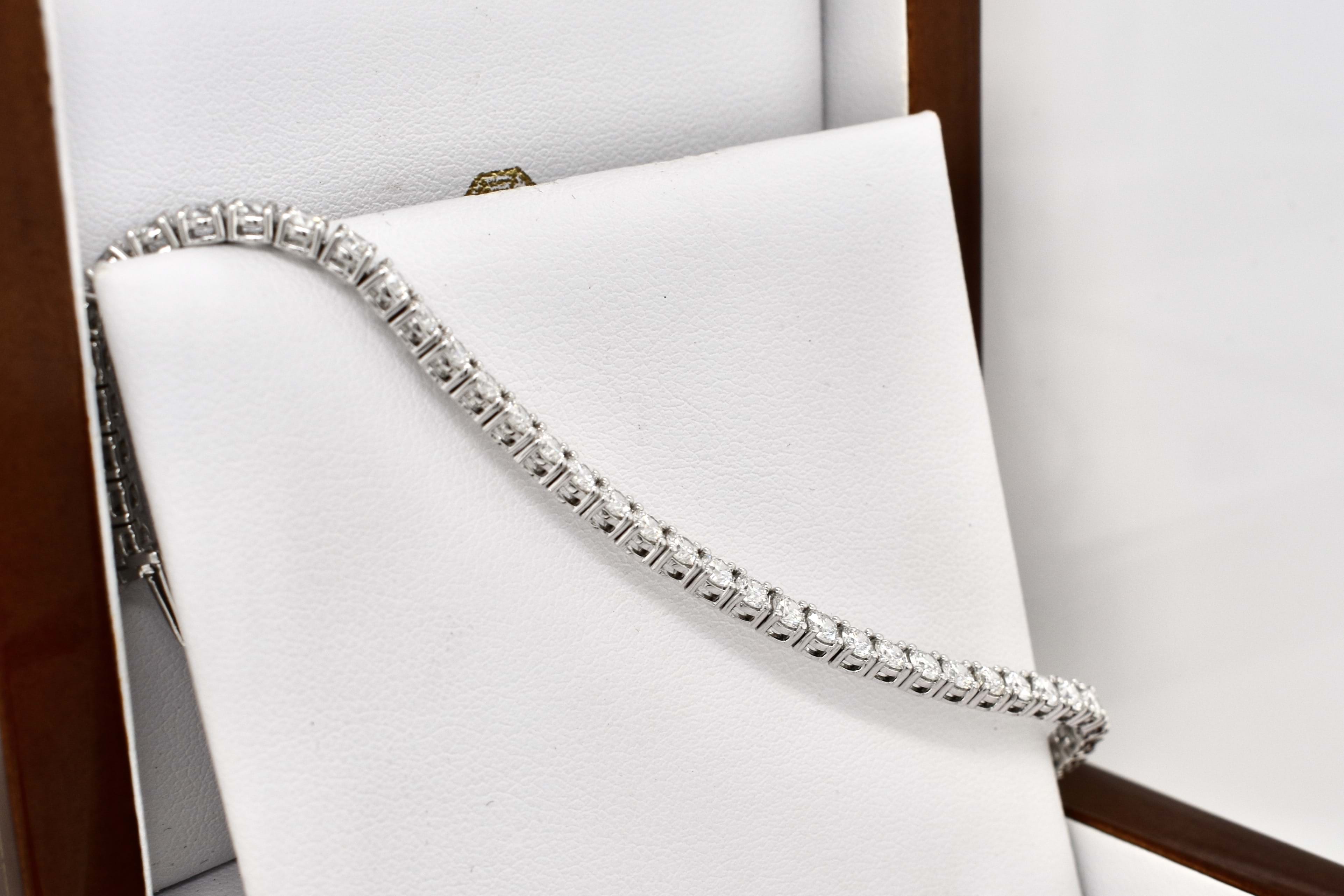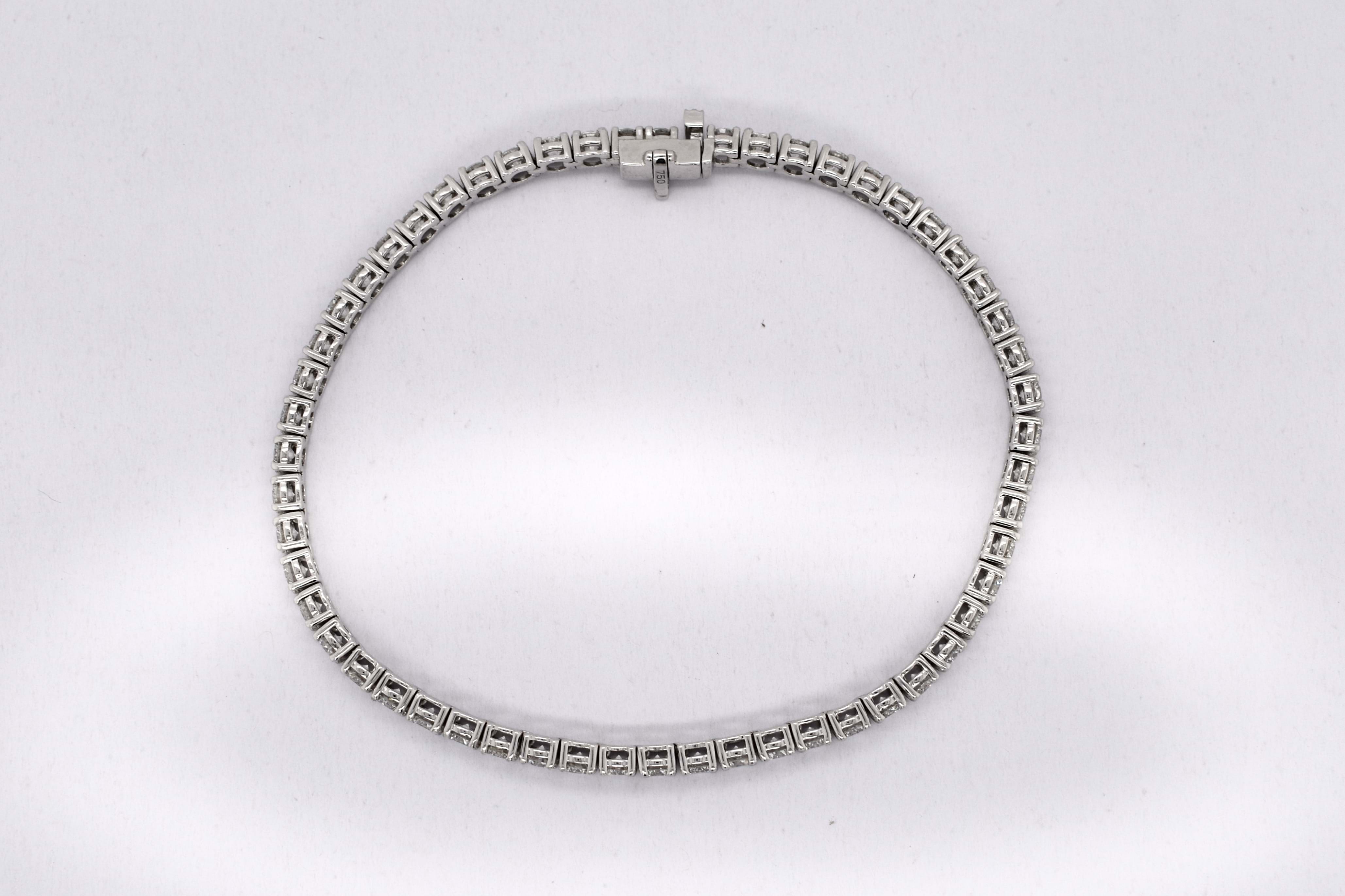This striking diamond bracelet has been beautifully crafted in 18ct white gold, measuring 18cm, with each of the 55 round brilliant cut diamonds four claw two bar set in a line. This bracelet has a total of 5.33ct G SI white sparkling diamonds and is completed with a concealed catch under safety bar. Weighing 11.58 grams. Independent Valuation Supplied