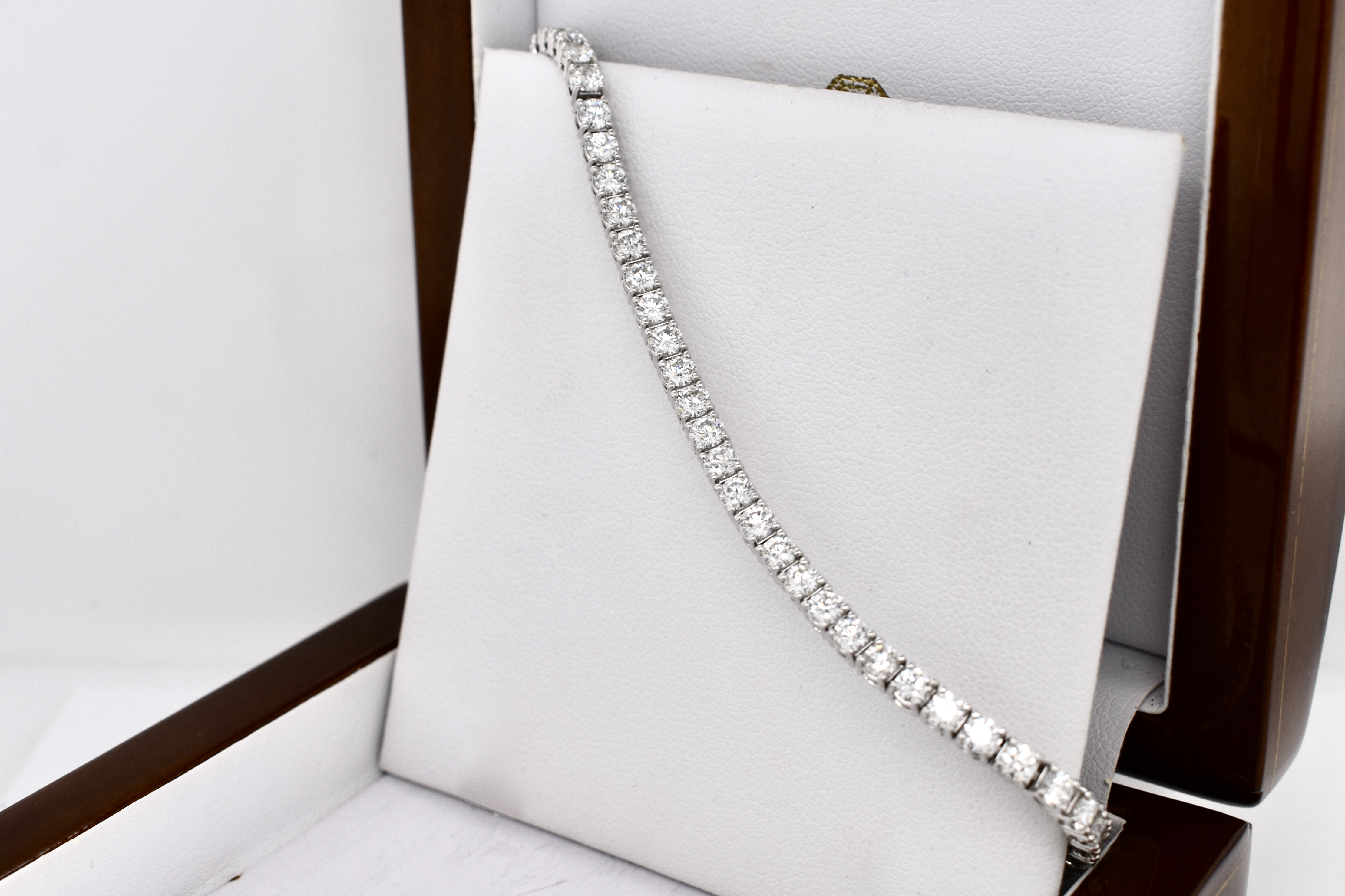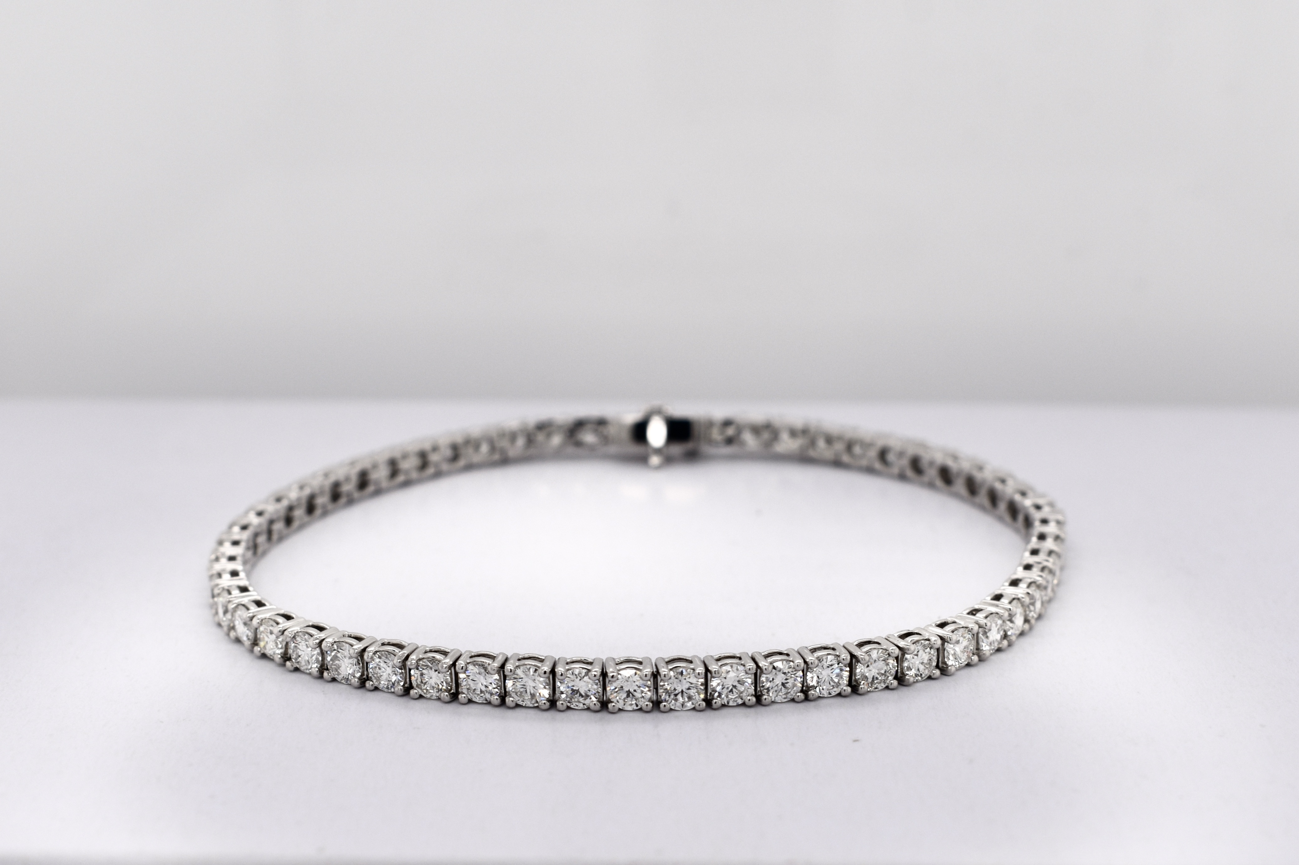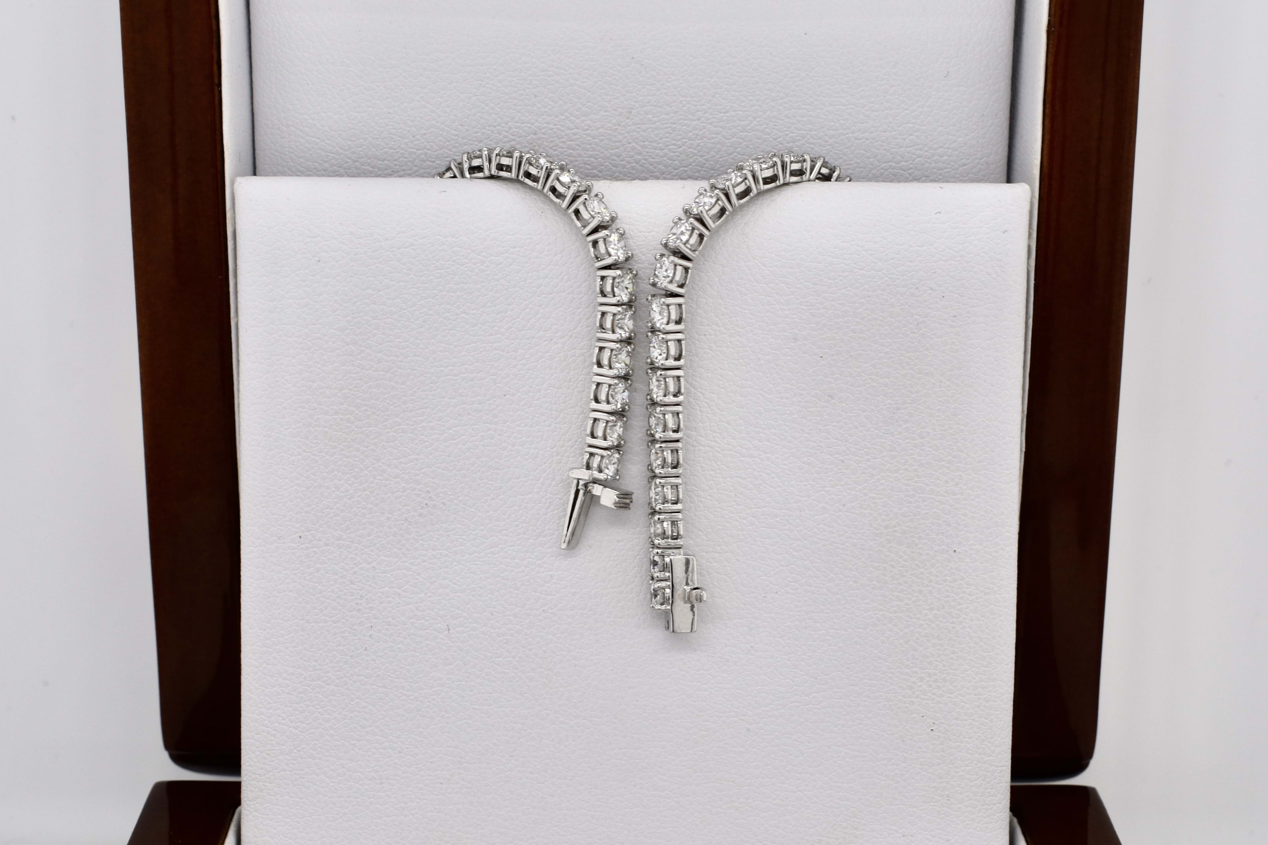 This striking diamond bracelet has been beautifully crafted in 18ct white gold, measuring 18cm, with each of the 55 round brilliant cut diamonds four claw two bar set in a line. This bracelet has a total of 5.33ct G SI white sparkling diamonds and is completed with a concealed catch under safety bar. Weighing 11.58 grams. Independent Valuation Supplied