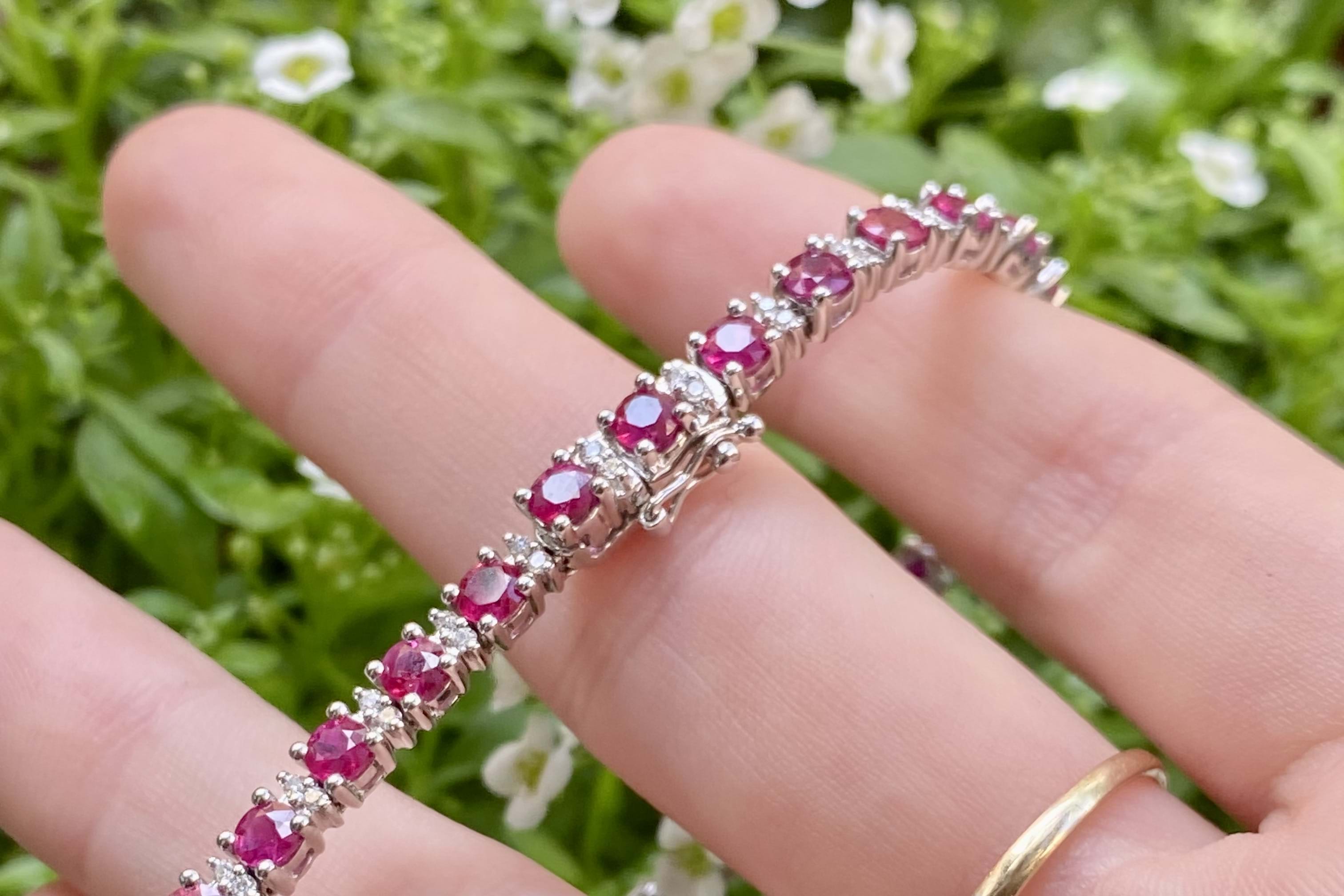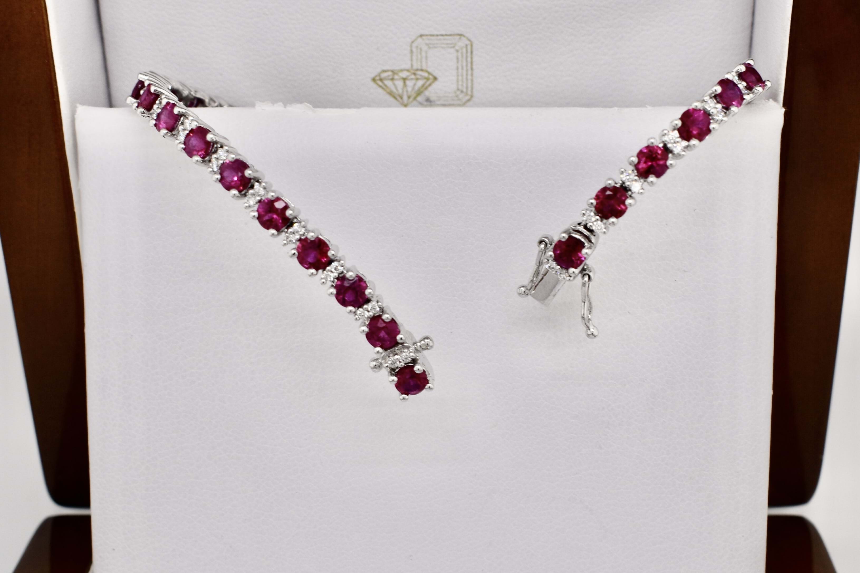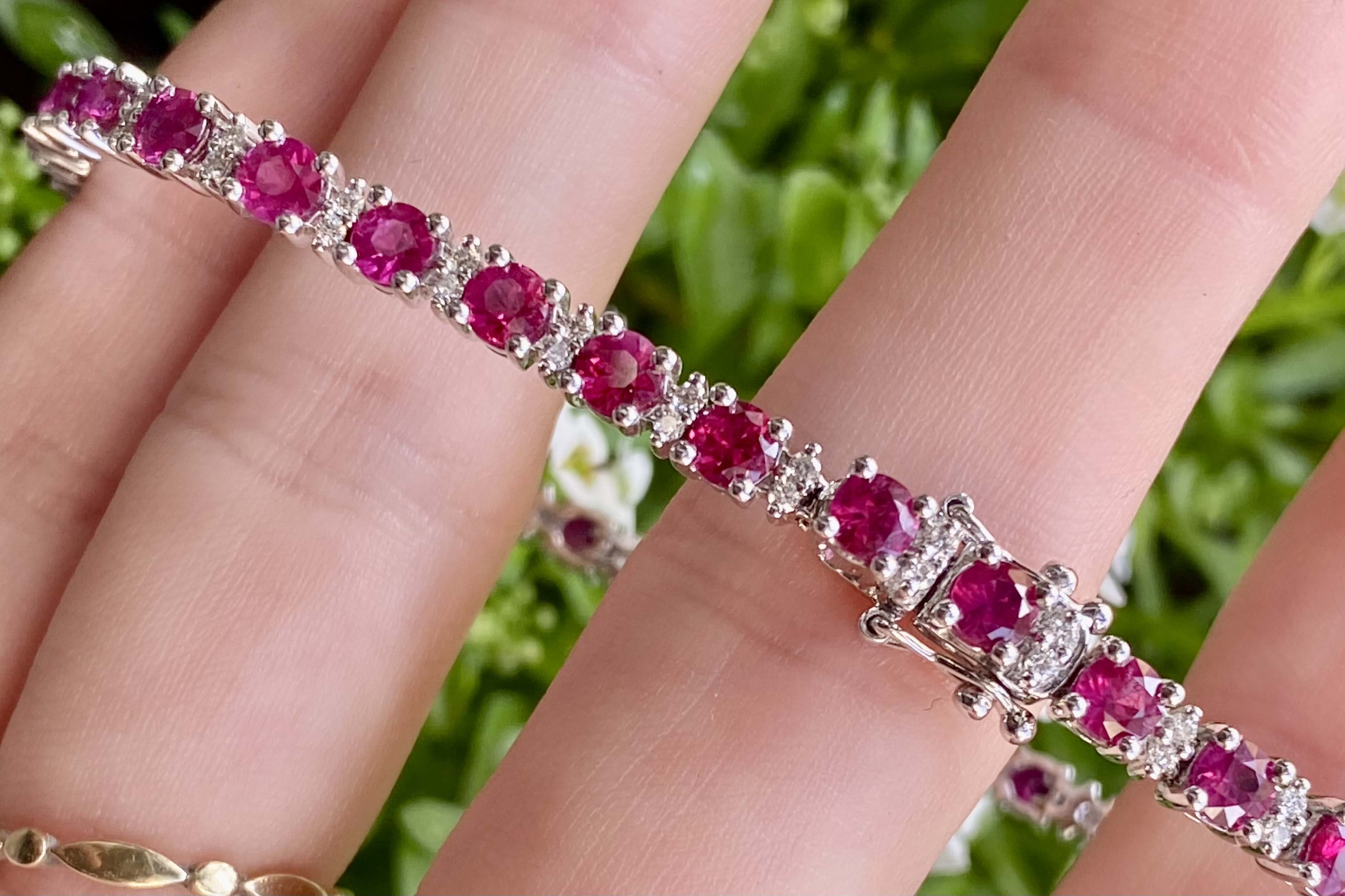 This elegant pop of colour red tennis bracelet is crafted in 18ct white gold, set with 22 round bright mid pinkish-red rubies totalling 6.63ct. It also features 66 round brilliant cut diamonds, shared claw set in groups of two, around the rubies, adding extra sparkle. 18cm long with a concealed clasp and two figure of 8 safety catches.