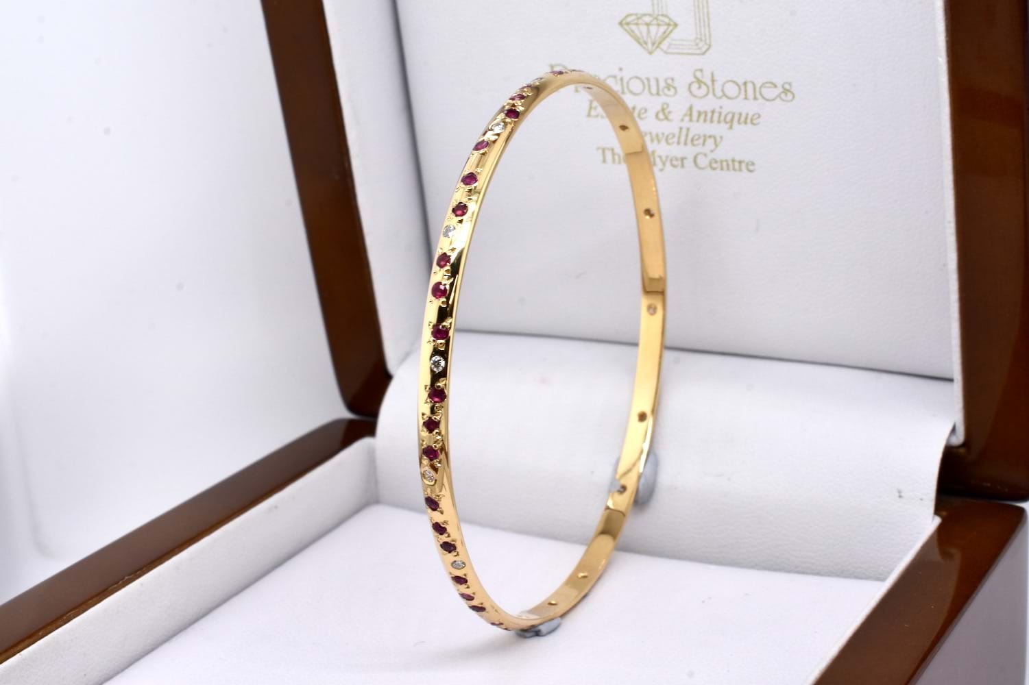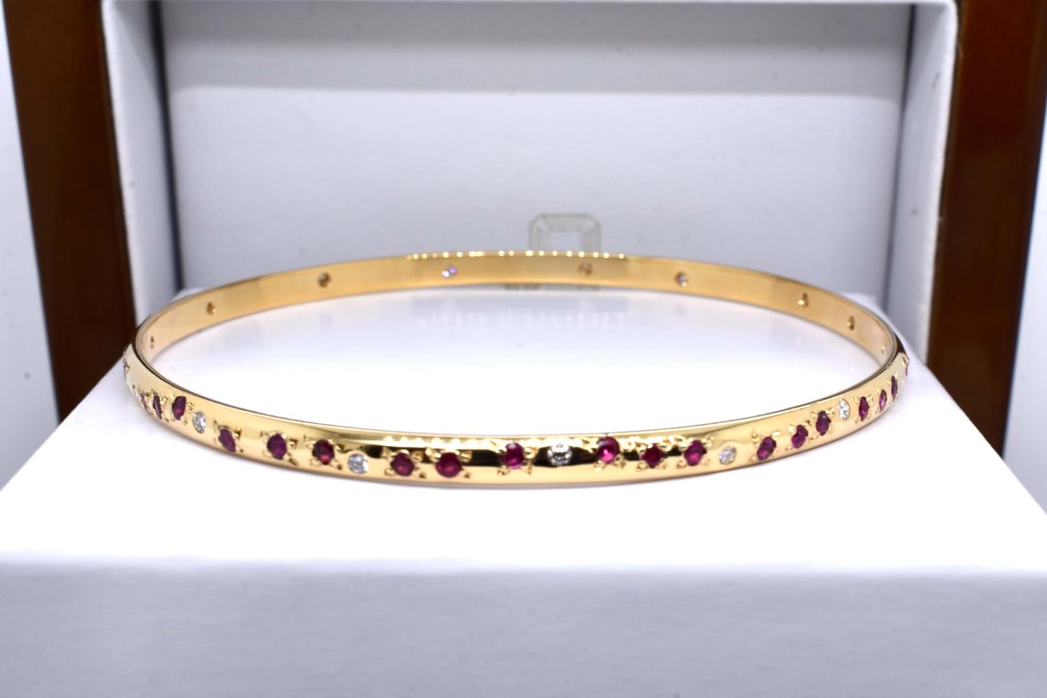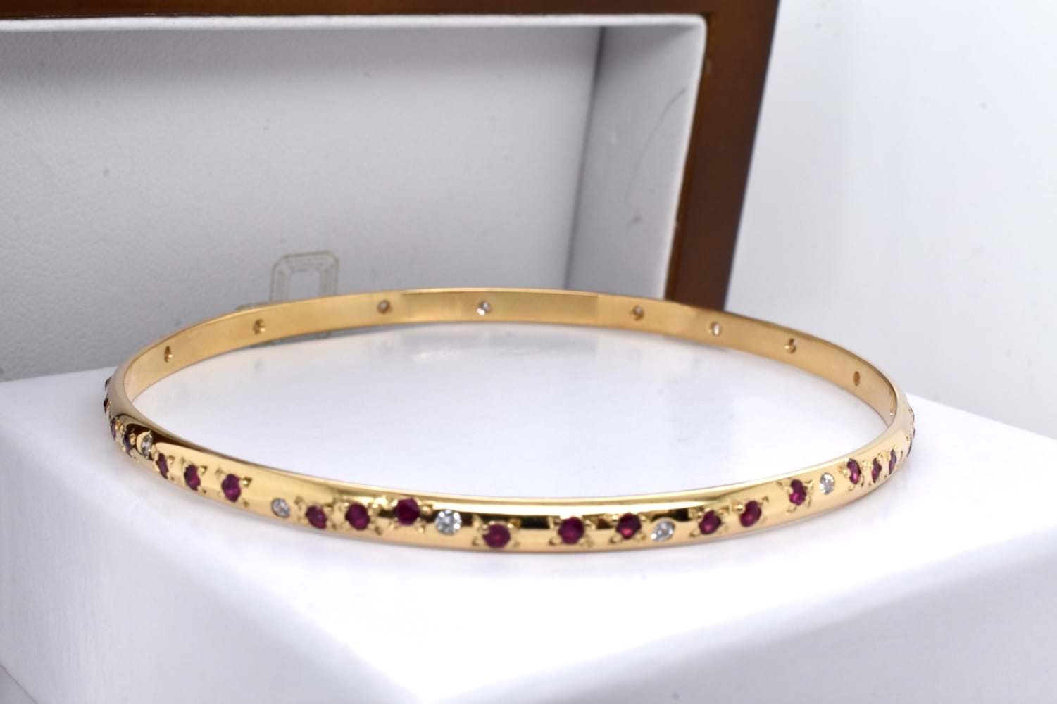A gorgeous and elegant bangle with a petite design, made from 18ct yellow gold and set with a total of 48 rubies equalling 1.93ct with 16 diamonds equalling 0.30ct GH/SI, in a gentle wave type pattern. Bangle is 3.4mm wide and hand size 61mm