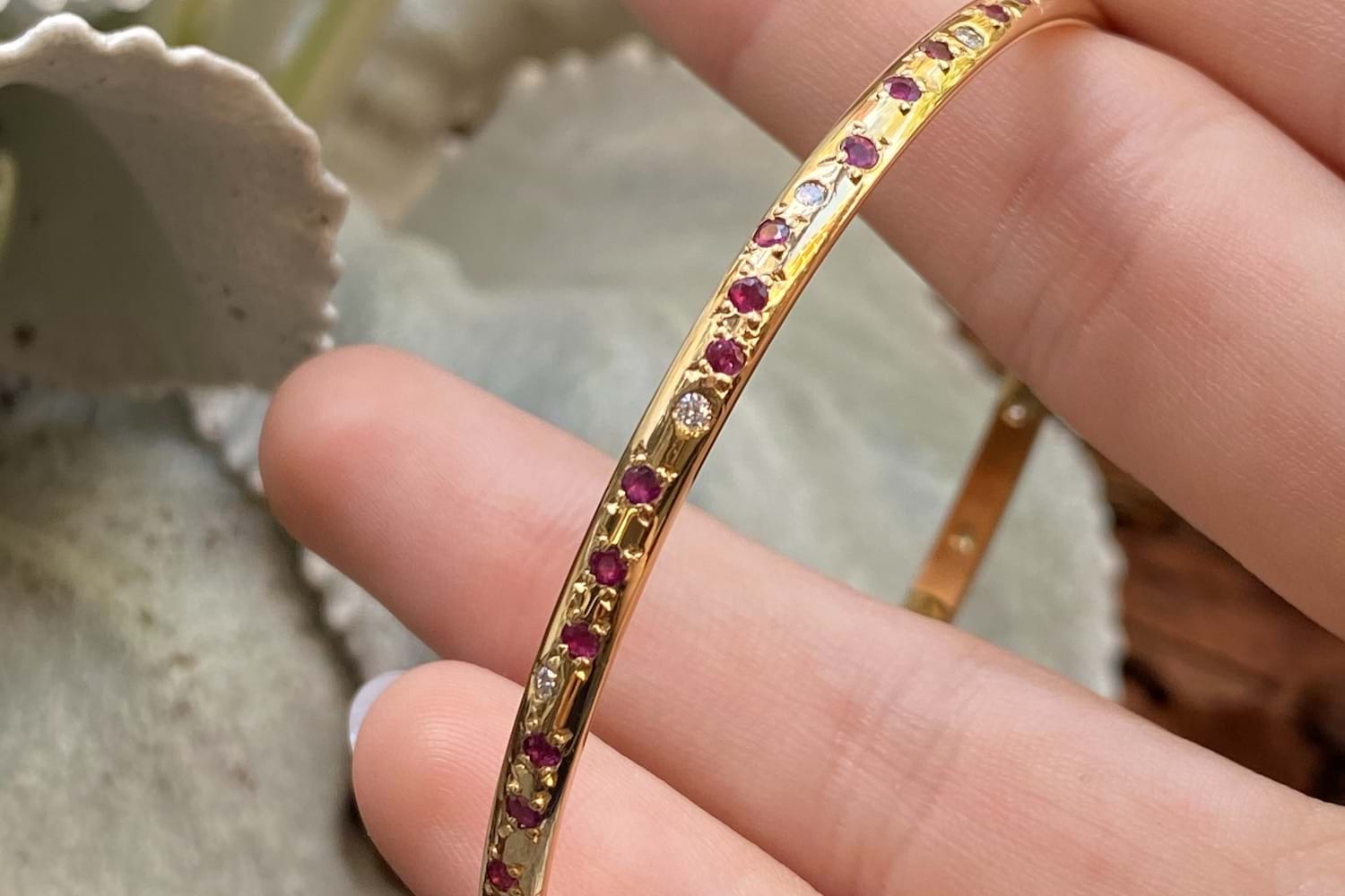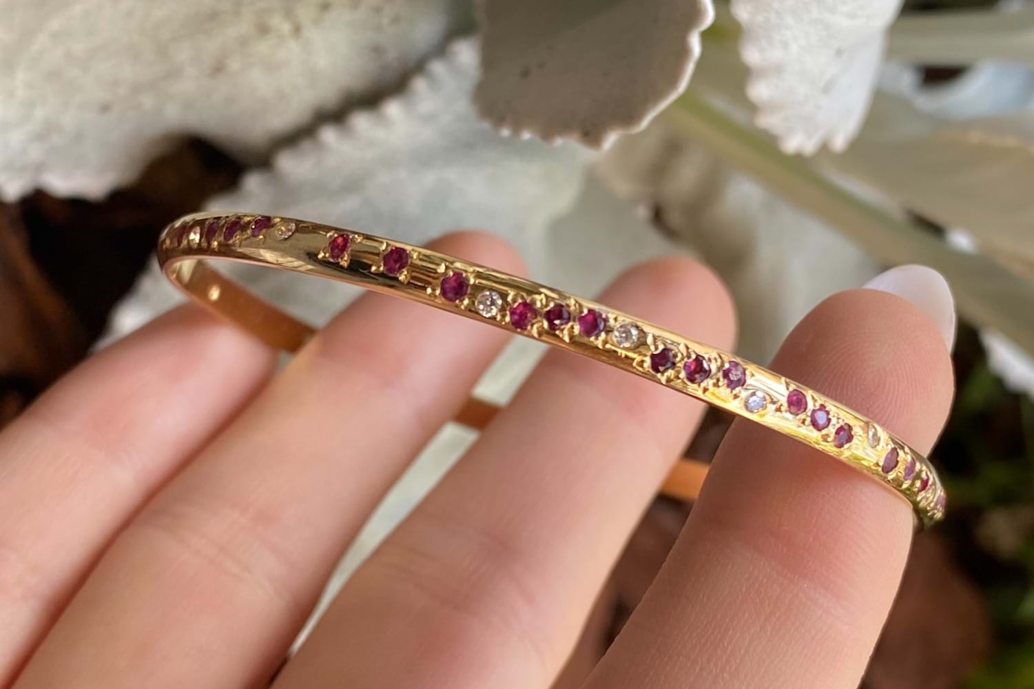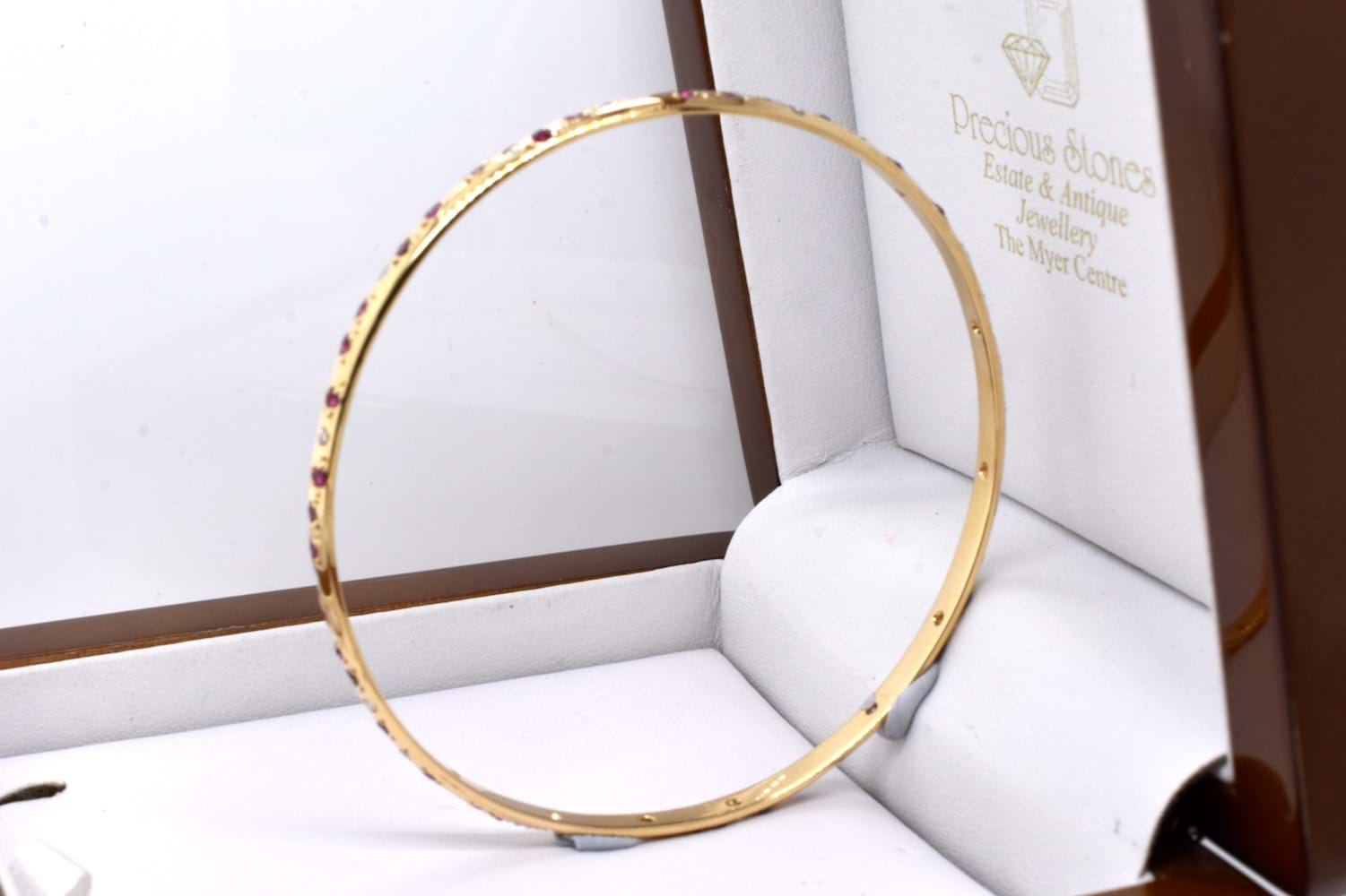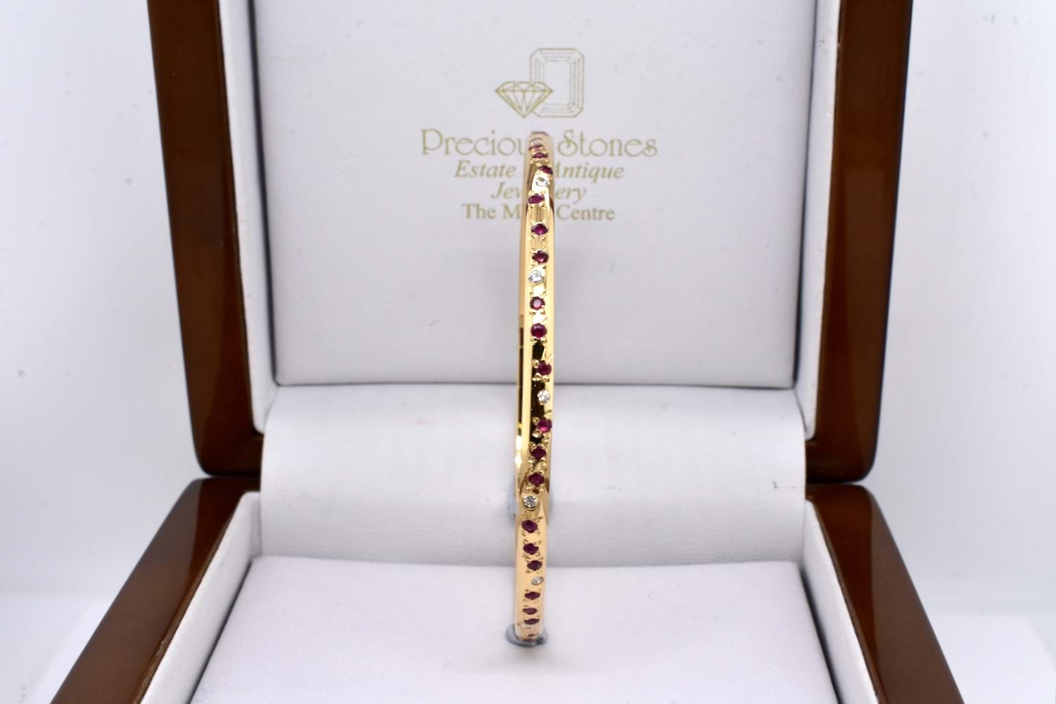 A gorgeous and elegant bangle with a petite design, made from 18ct yellow gold and set with a total of 48 rubies equalling 1.93ct with 16 diamonds equalling 0.30ct GH/SI, in a gentle wave type pattern. Bangle is 3.4mm wide and hand size 61mm