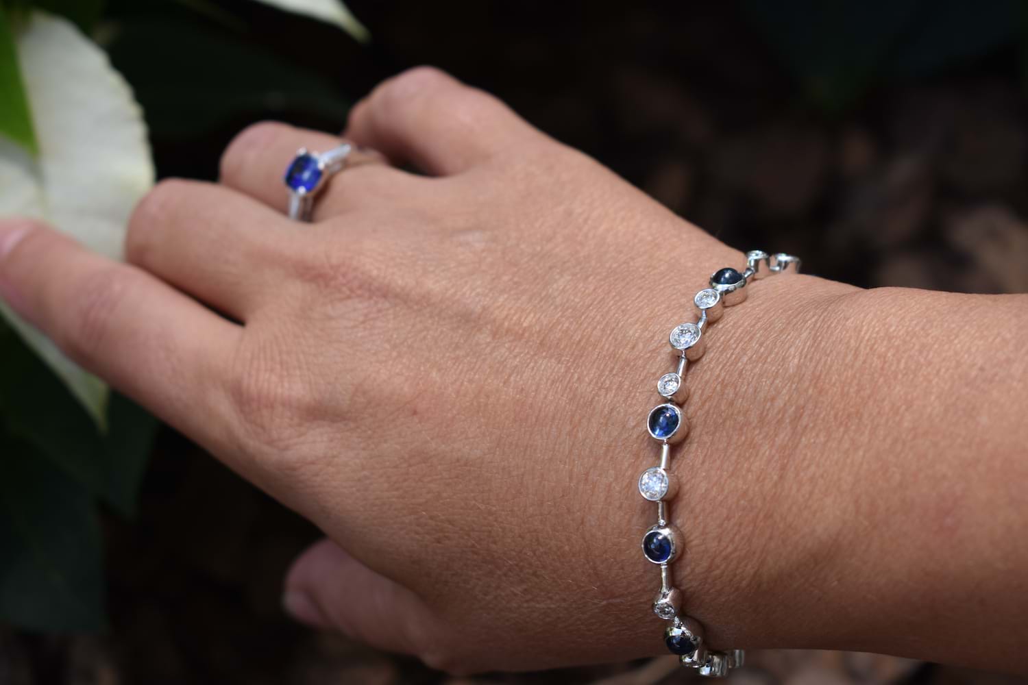The prettiest sapphire and diamond bracelet, consisting of 8 cabochon blue round sapphires, bezel set, stationed between 16 round brilliant cut diamonds, also bezel set. Total sapphire weight of 6.74ct and a total diamond weight of 2.50ct FG SI. All in various sizes set along the 9ct white gold bracelet creating a 'bubble' design. Complete with a box clasp and figure 8 safety catch. Length of 19.5cm.