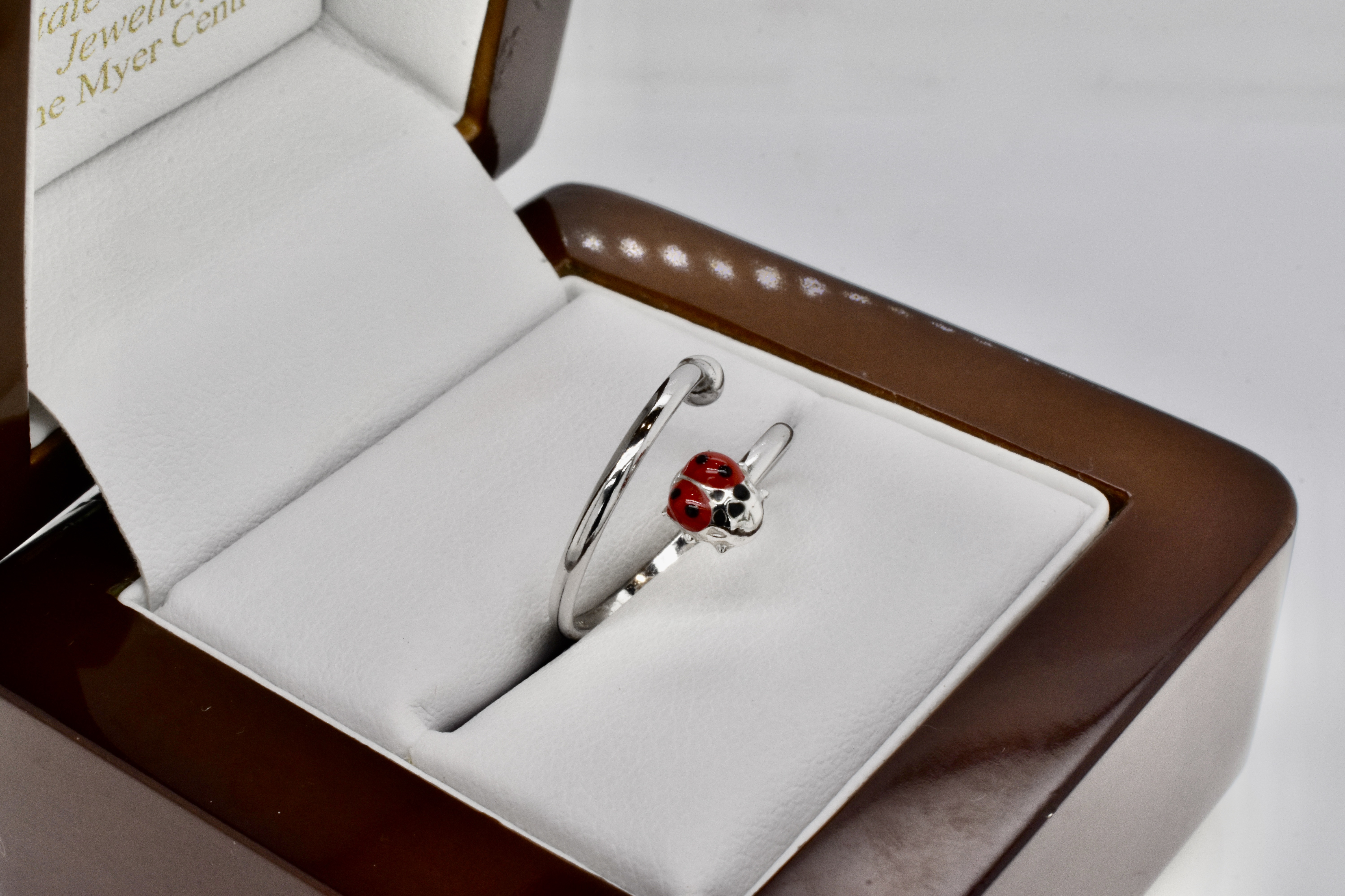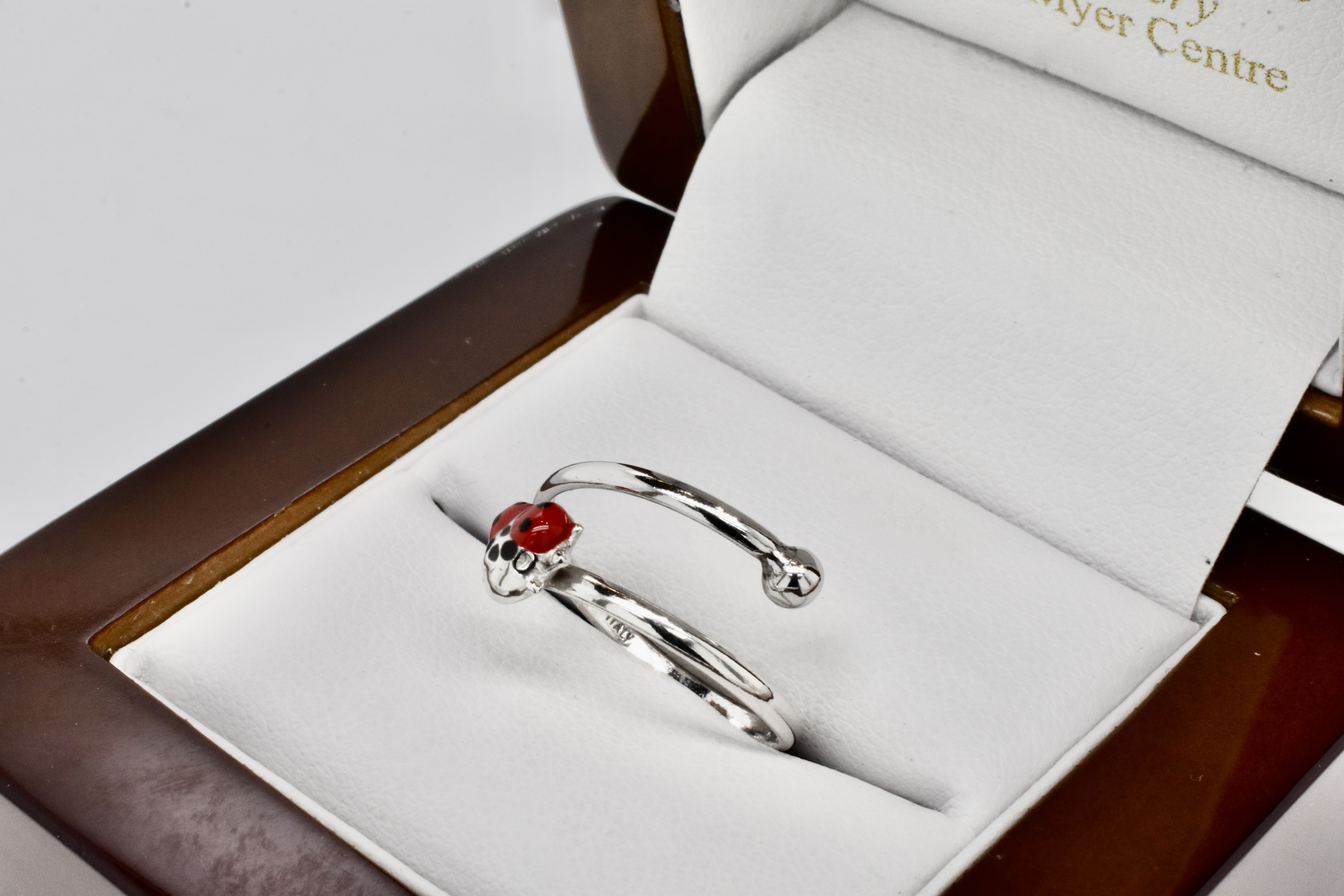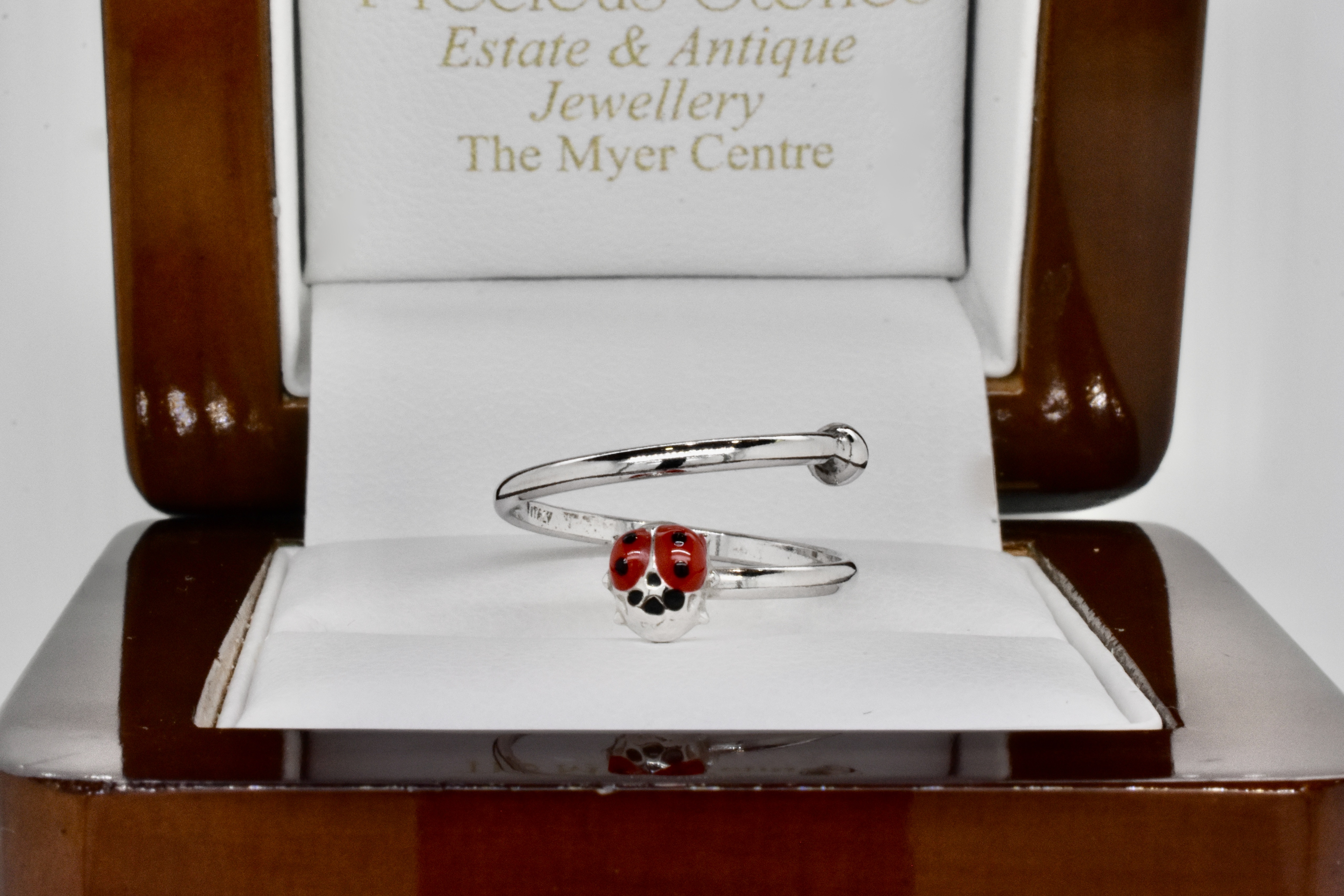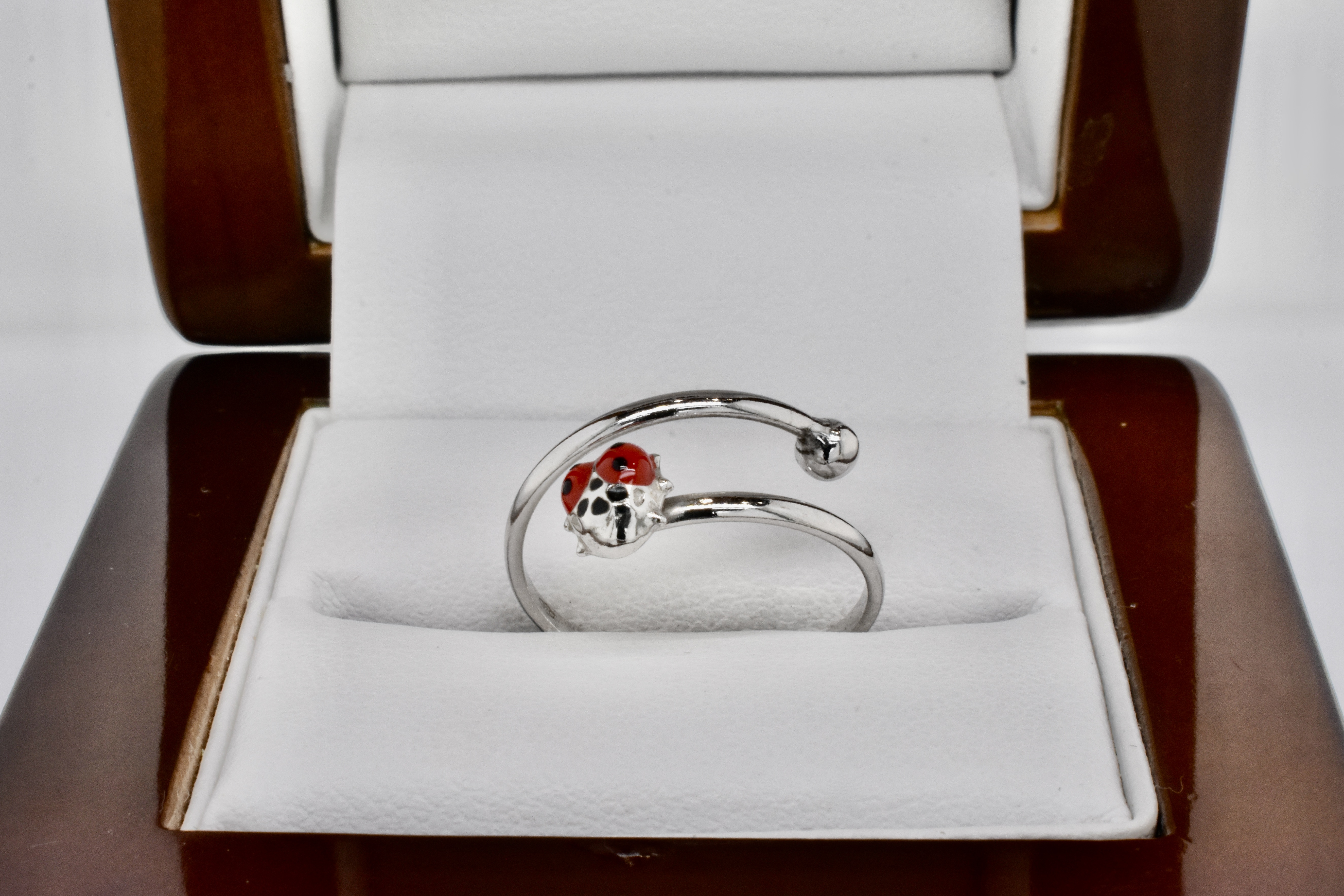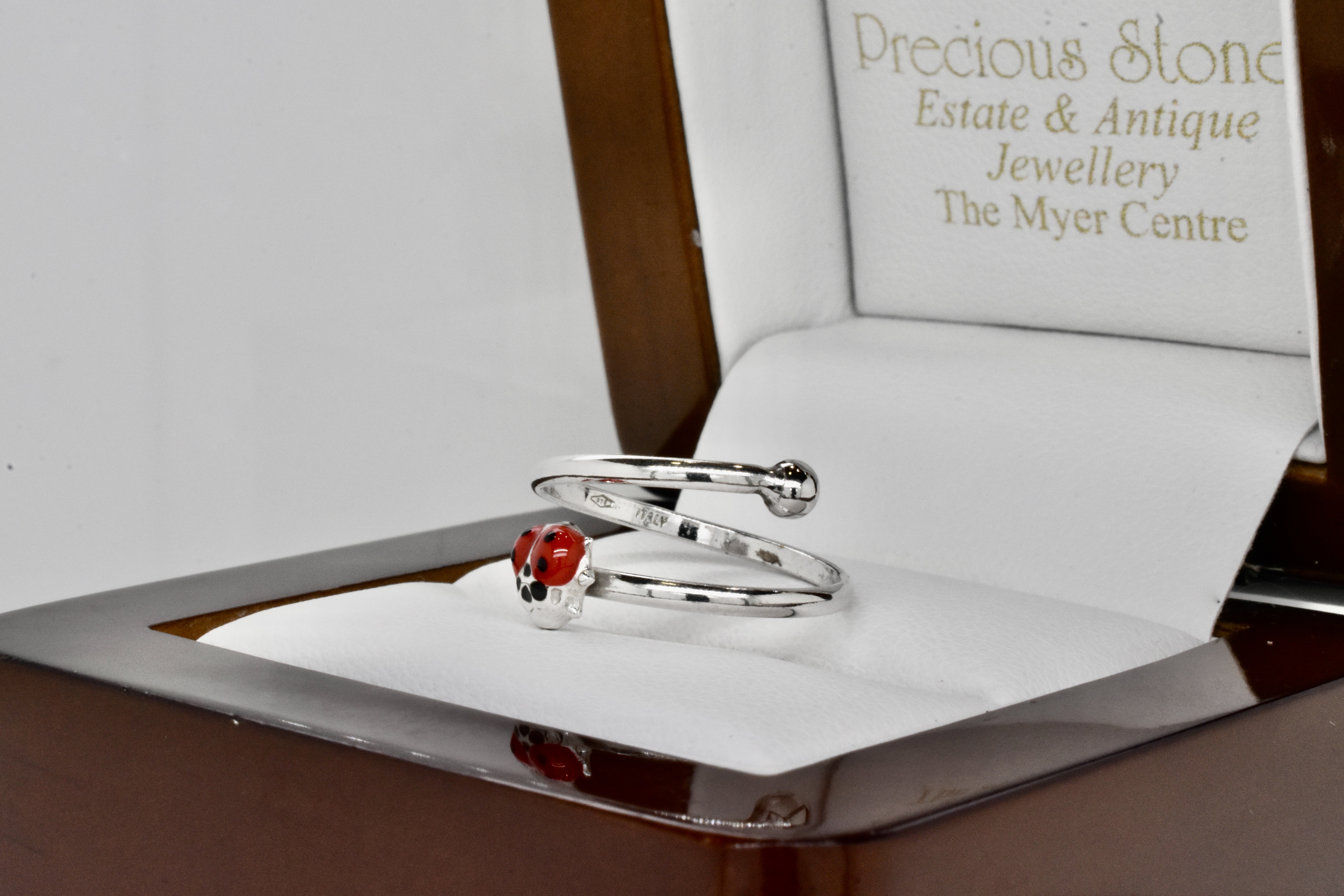 This adorable ring is made from 9ct white gold and features an interesting twist design with a cute red and black enamel ladybird and plain ball detail. Finger size is adjustable