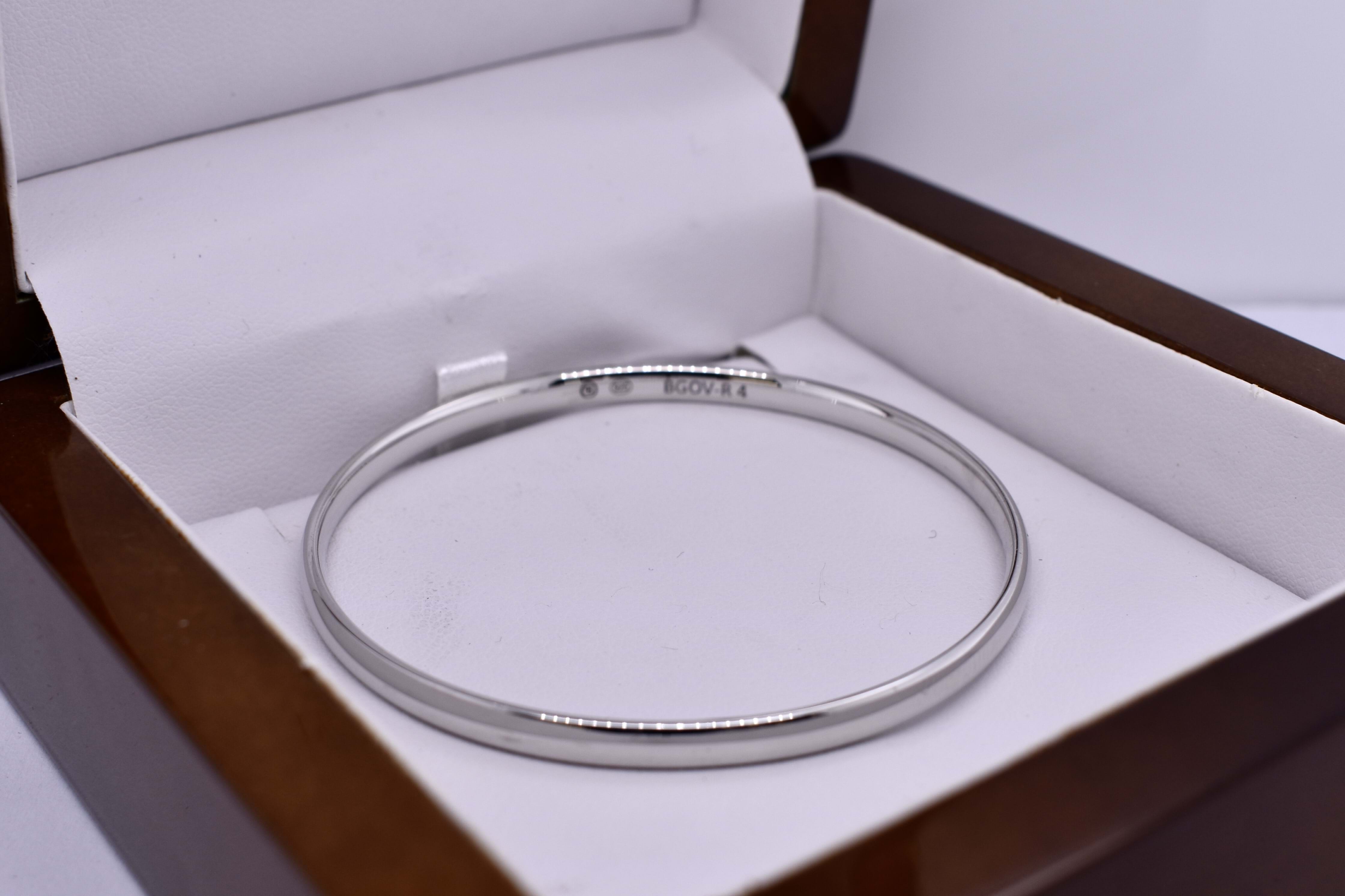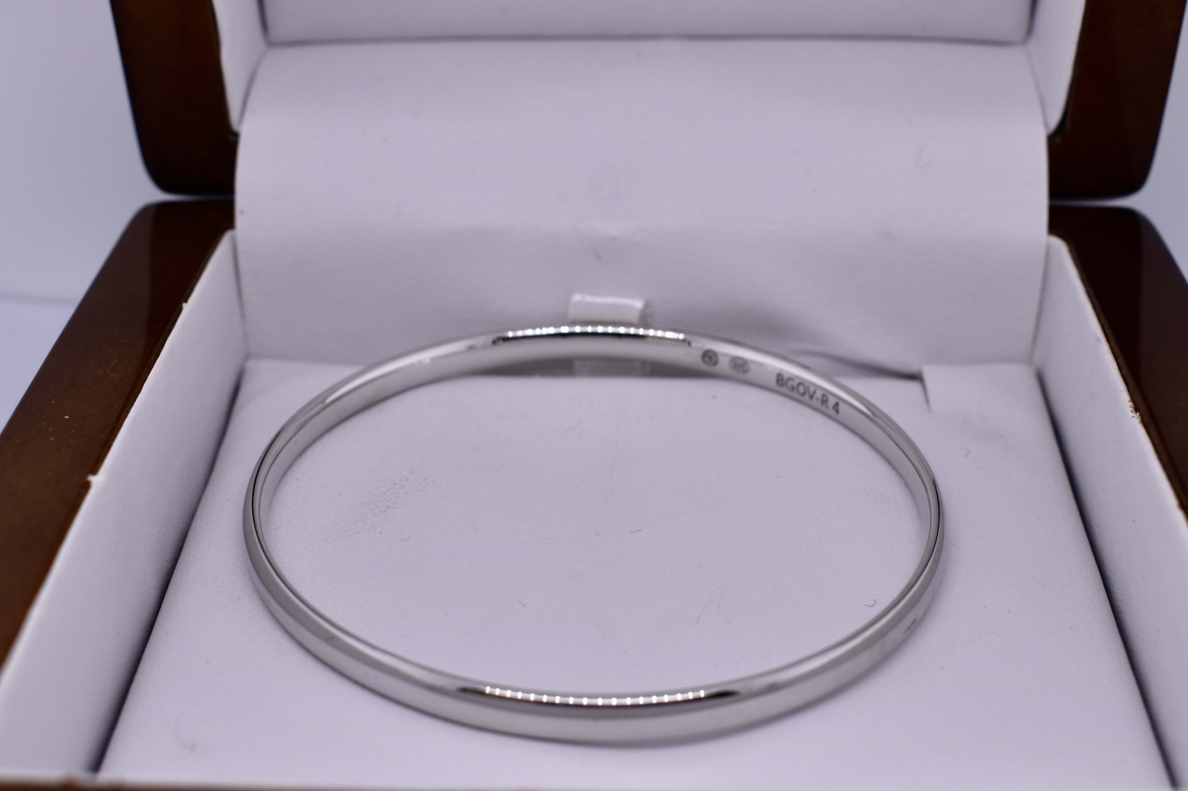 This classic solid round bangle has been crafted in sterling silver with a comfort profile. Bangle is a small hand size 55mm and measures 4mm wide. Weighing 11.65 grams.