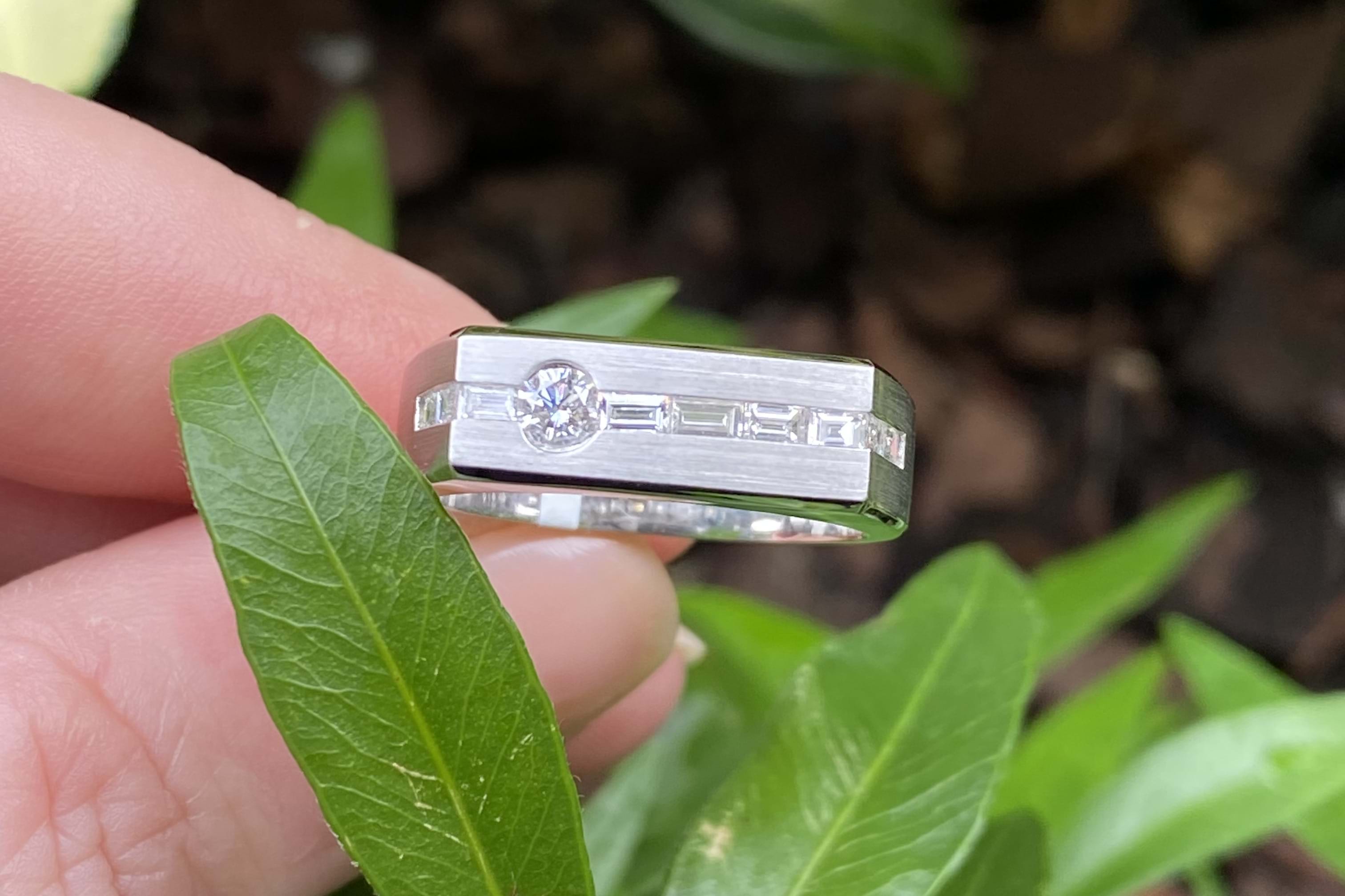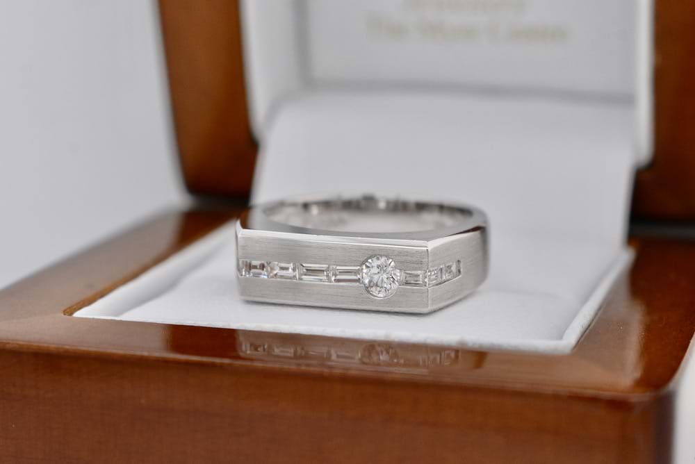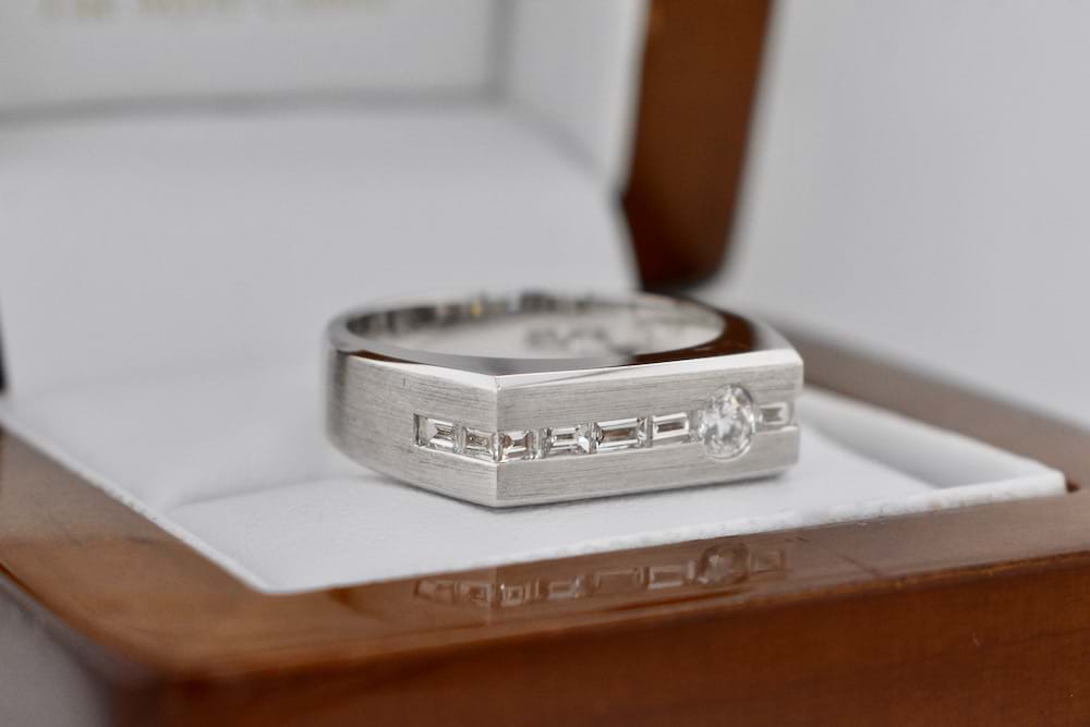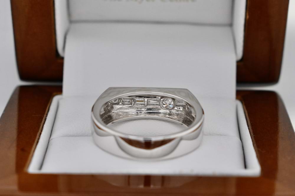 An elegant diamond ring for a gentleman. Crafted in 18ct white gold this ring is the epitome of understated class with a brush finish to soften the impact these high white diamonds are shown off to their full potential. With the round brilliant cut weighing 0.15cts and nine baguette cuts totalling 0.56cts this makes a great wedding band or dress ring. Independent Valuation Supplied. Finger size Q