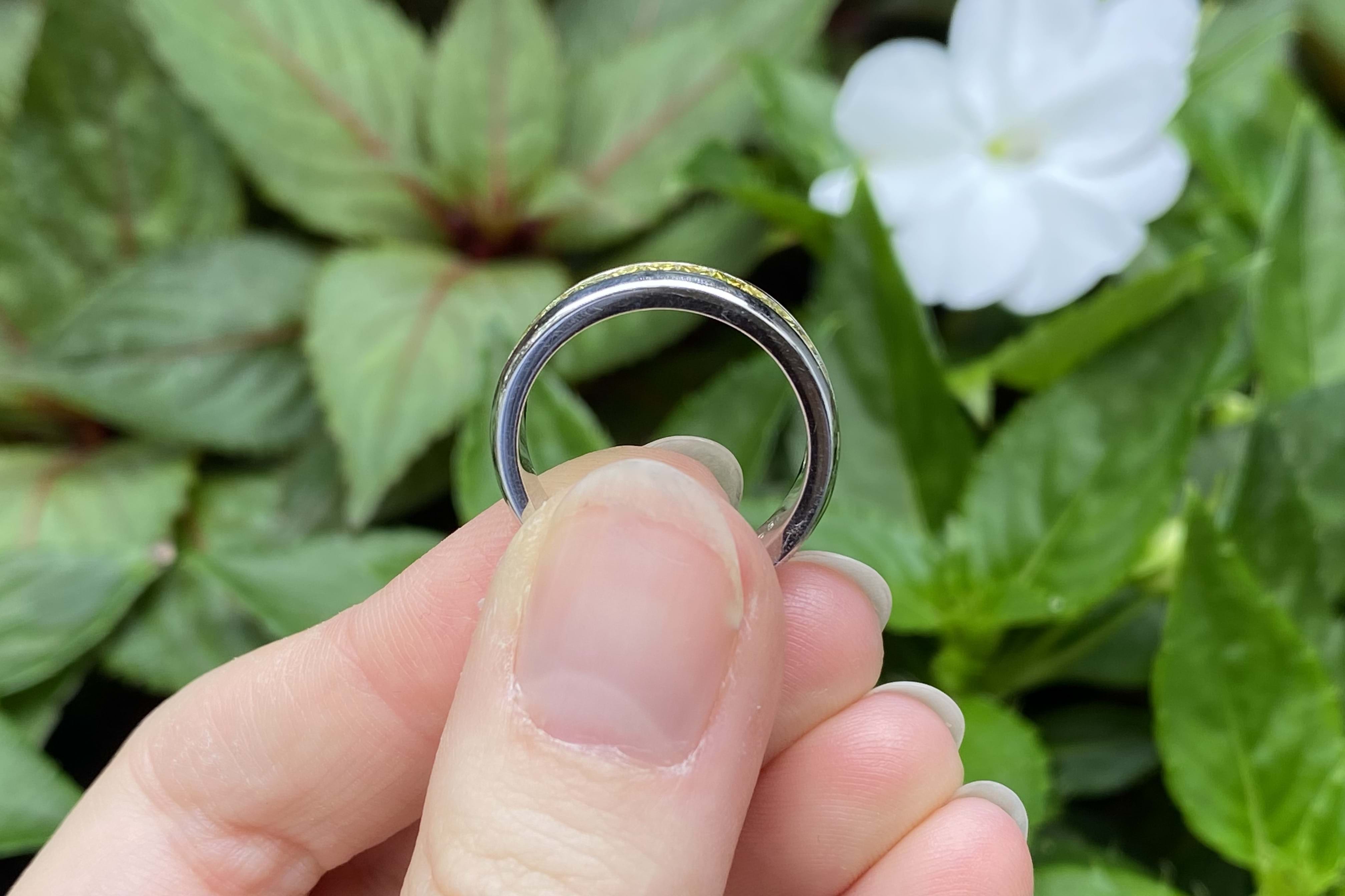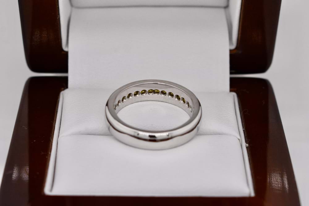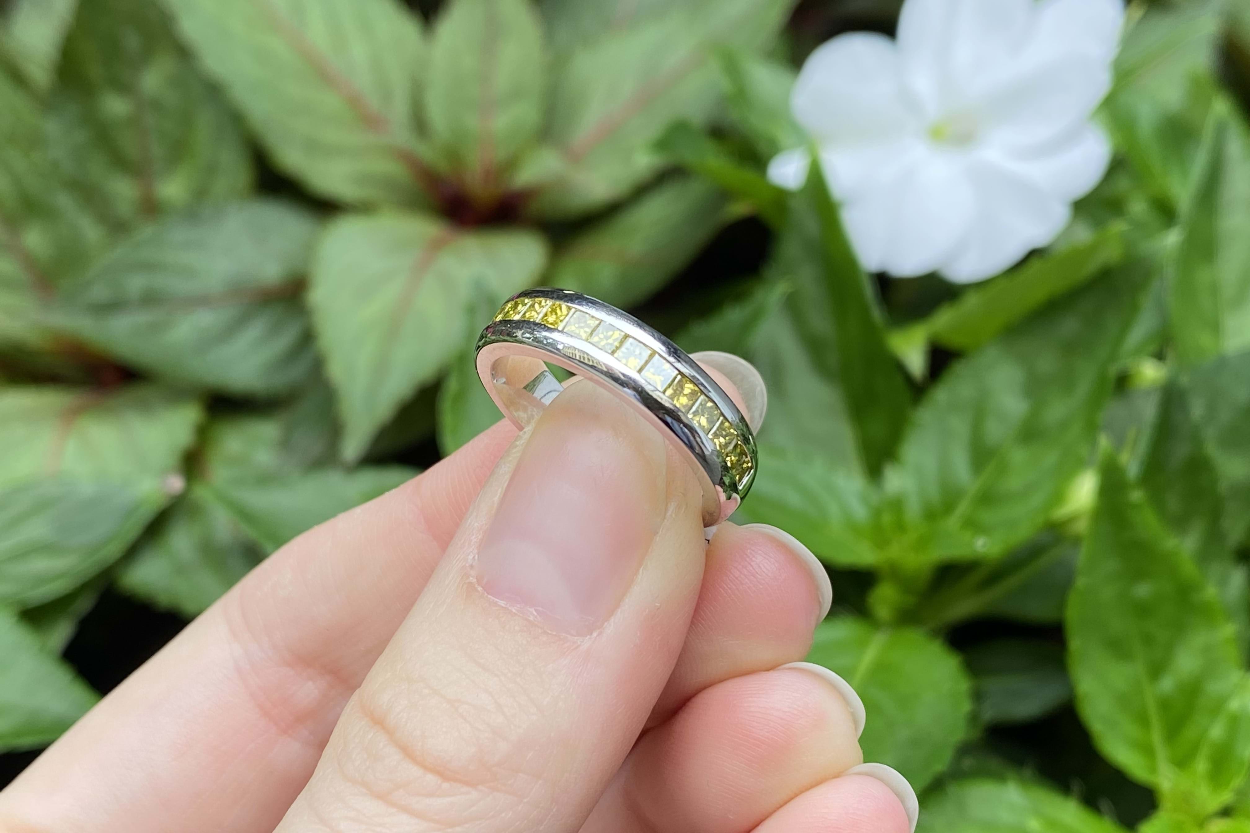 A channel set 18ct white gold ring featuring 15 princess cut treated yellow diamonds totalling 0.81cts (treated to mid greenish yellow, VS-SI clarity). Finger size P. Independent Valuation Supplied