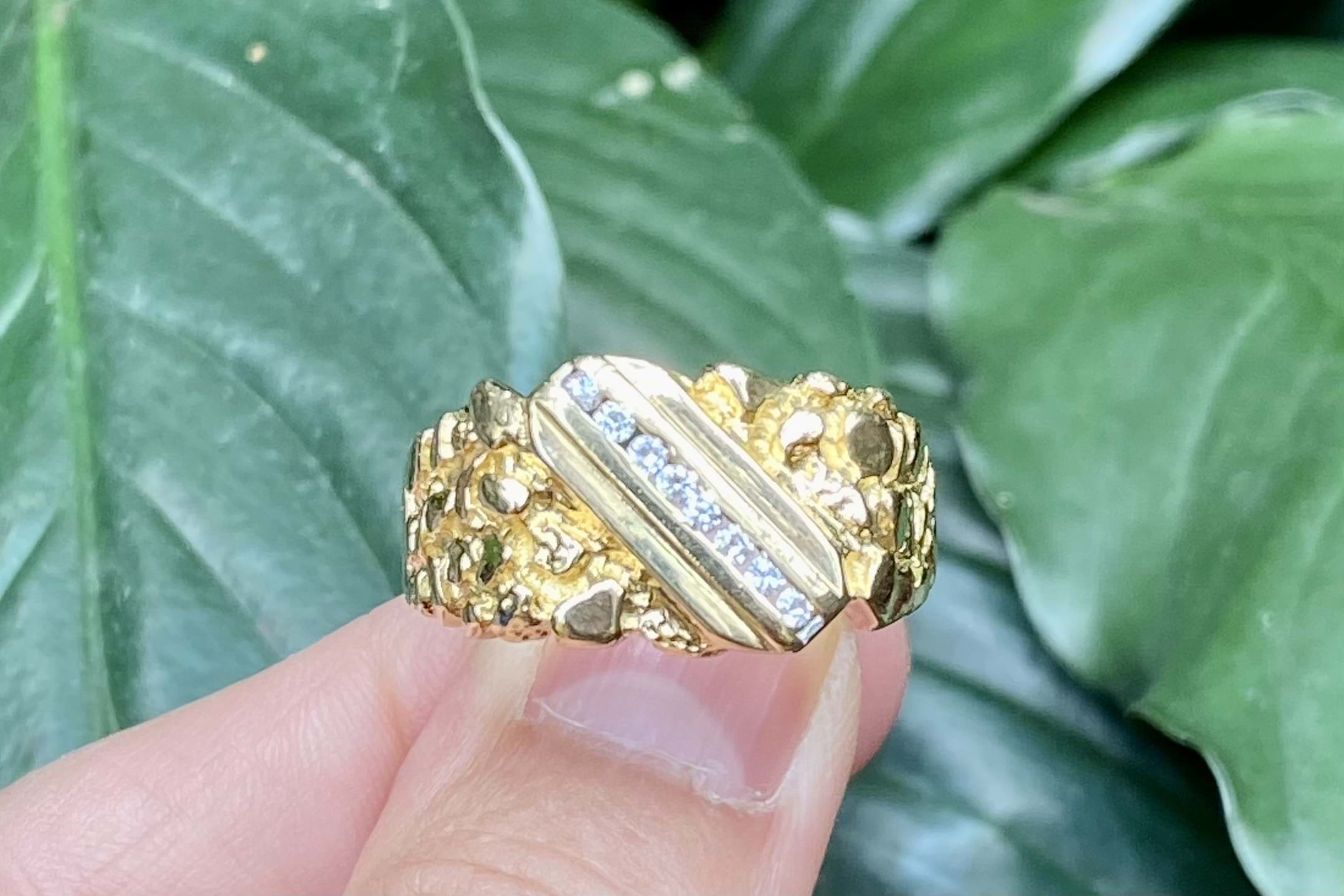 This flat top ring is crafted in 18ct yellow gold and has been made to look like a rough gold nugget. Featuring 8 round brilliant cut diamonds diagonal channel set across the top, weighing approx. 0.16ct and independently graded as HI/SI. Finger size Z. Total weight 12.7grams. Independent valuation supplied.