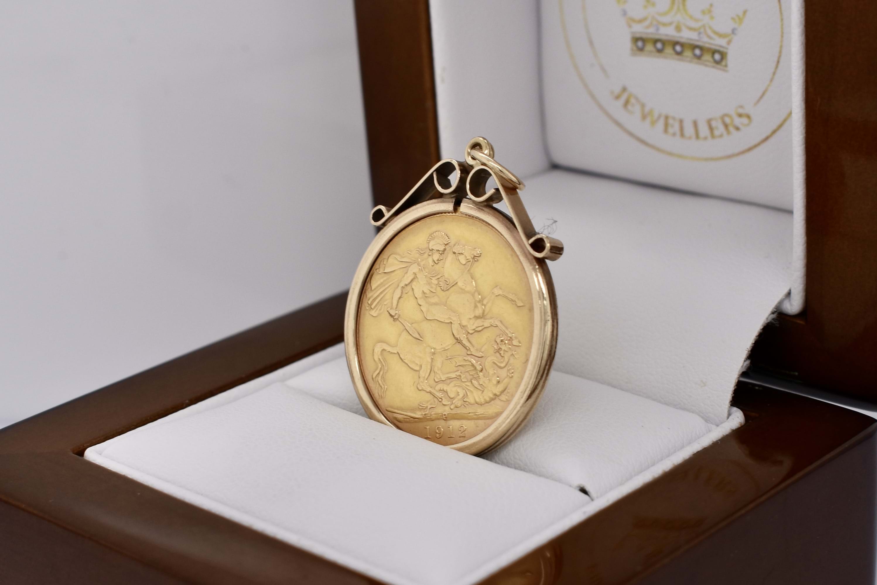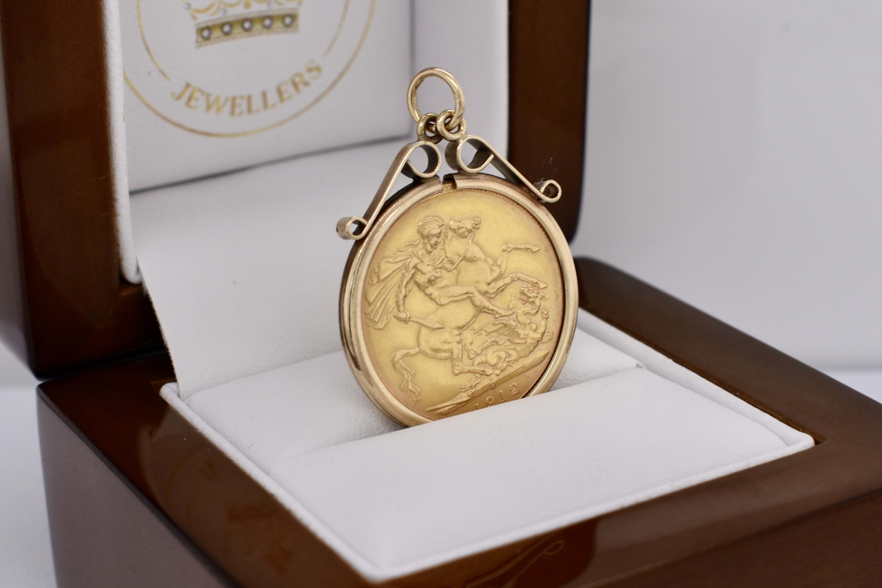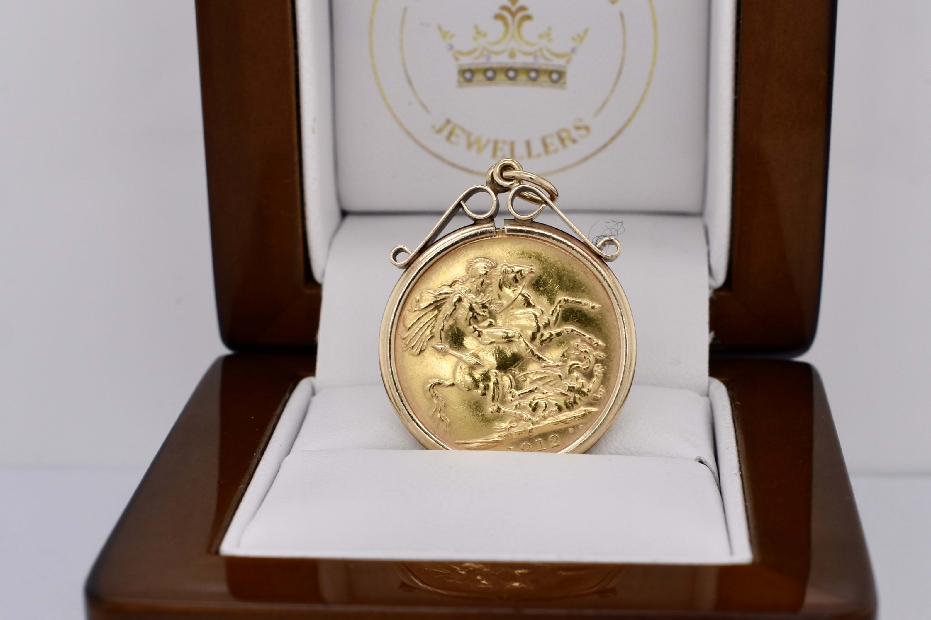 An England 1912 sovereign coin depicting George V, set in a 9ct yellow gold frame with scroll design top and jump ring. Weighing 9.529 grams. Independent Valuation Supplied.