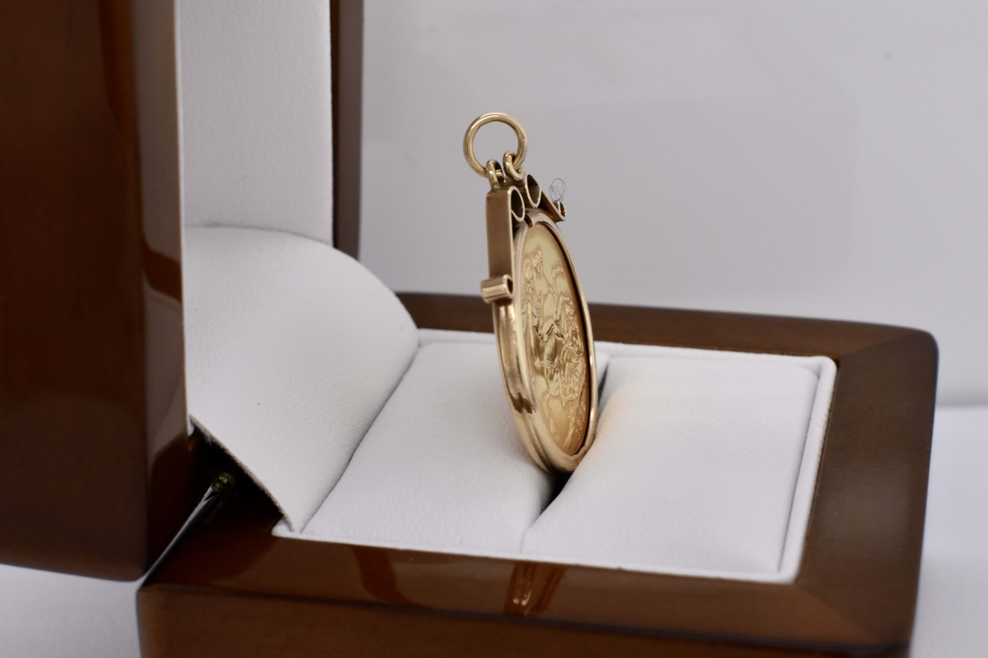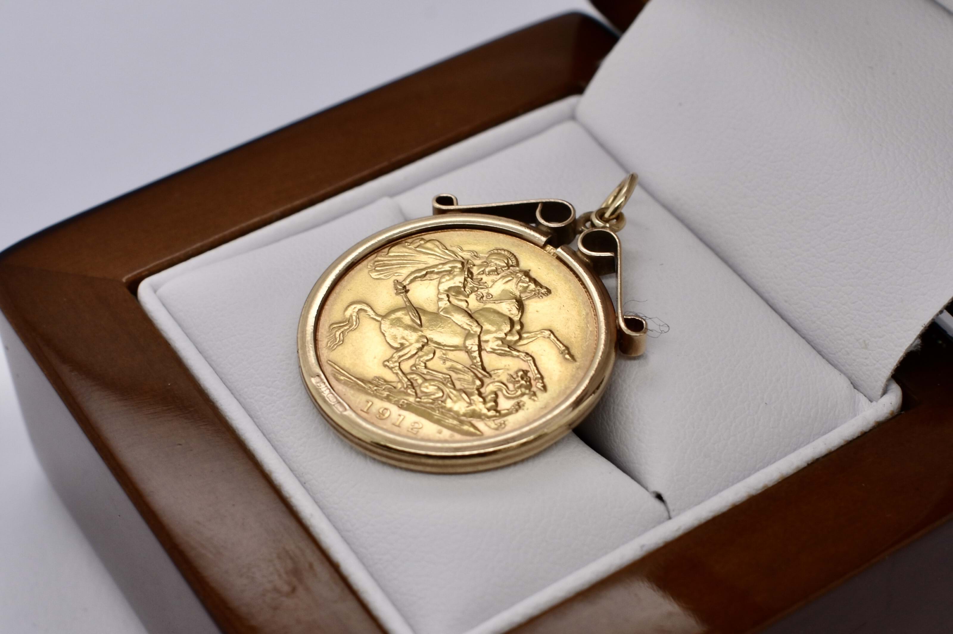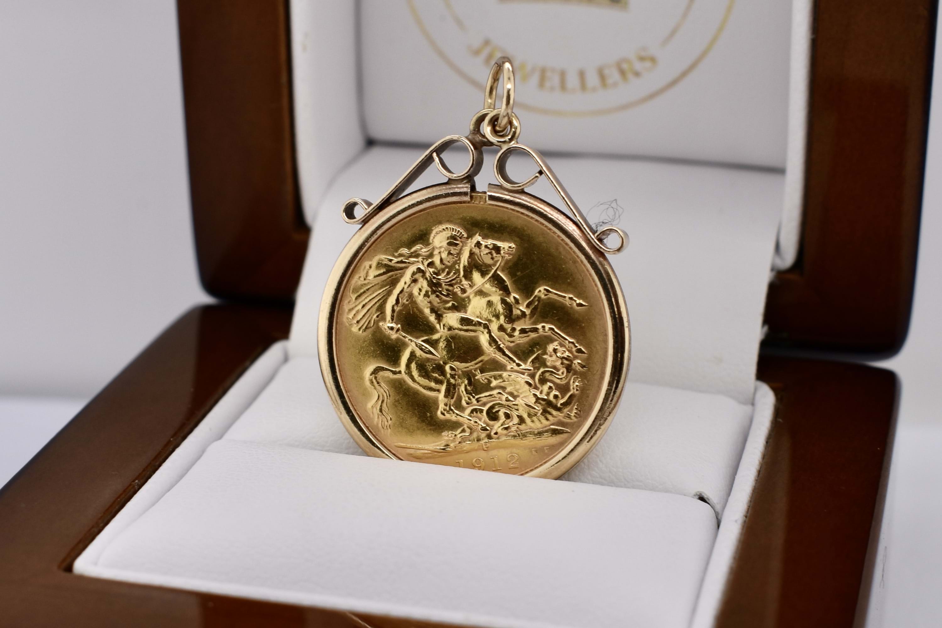 An England 1912 sovereign coin depicting George V, set in a 9ct yellow gold frame with scroll design top and jump ring. Weighing 9.529 grams. Independent Valuation Supplied.