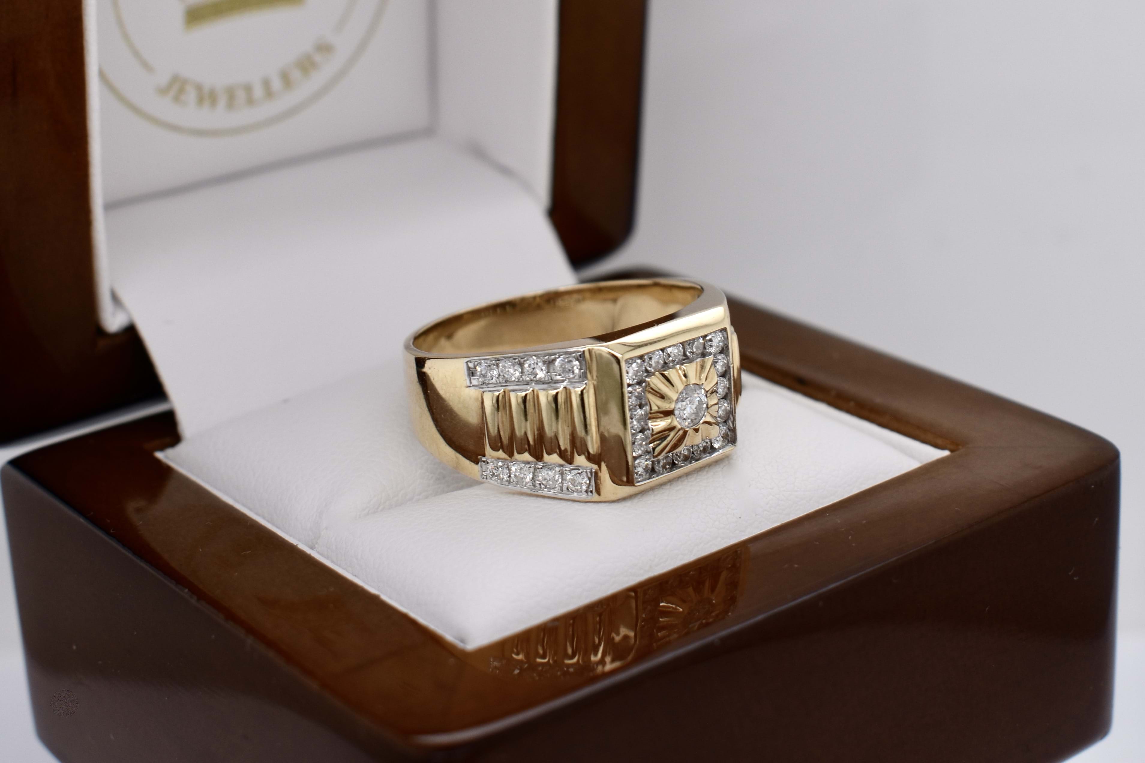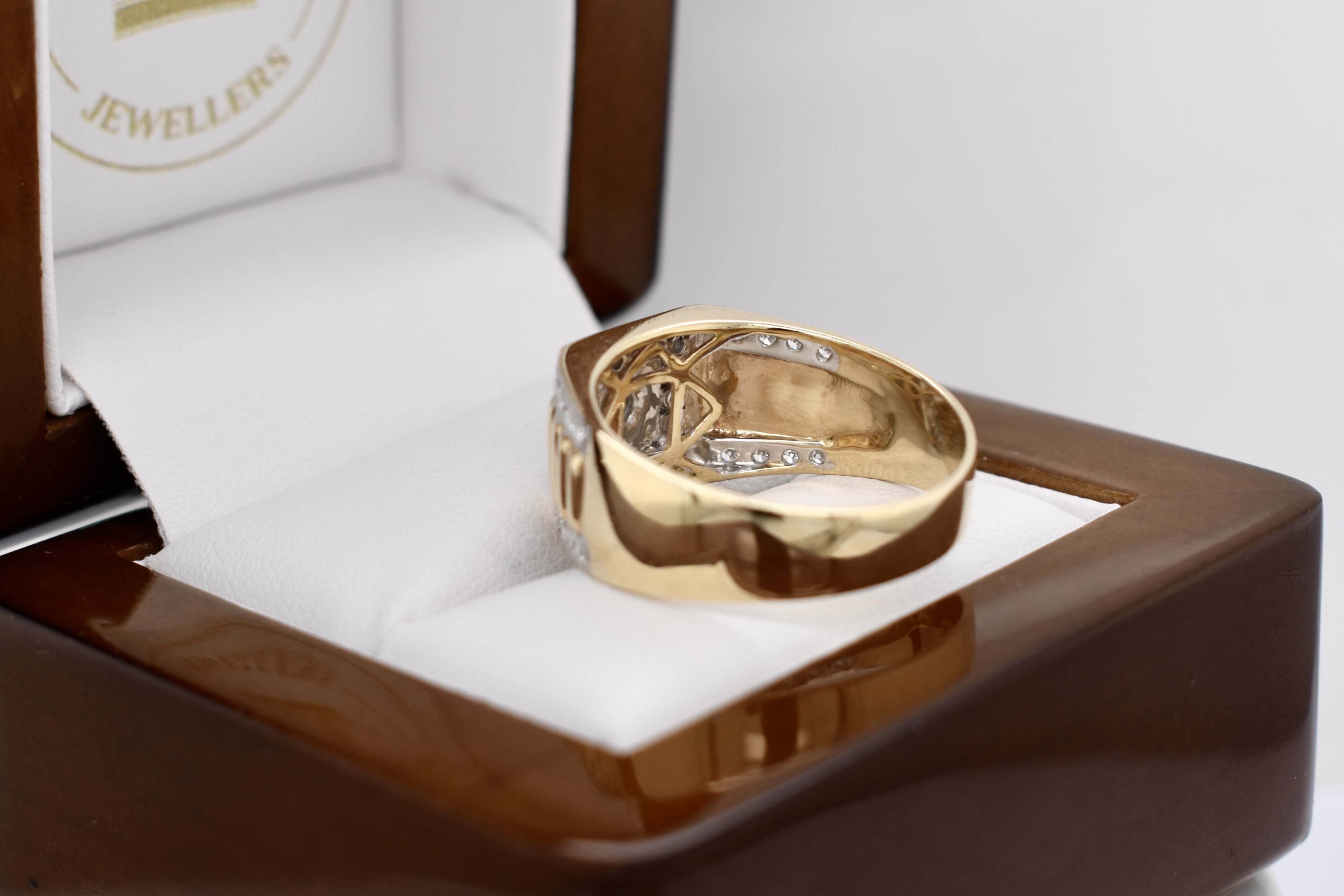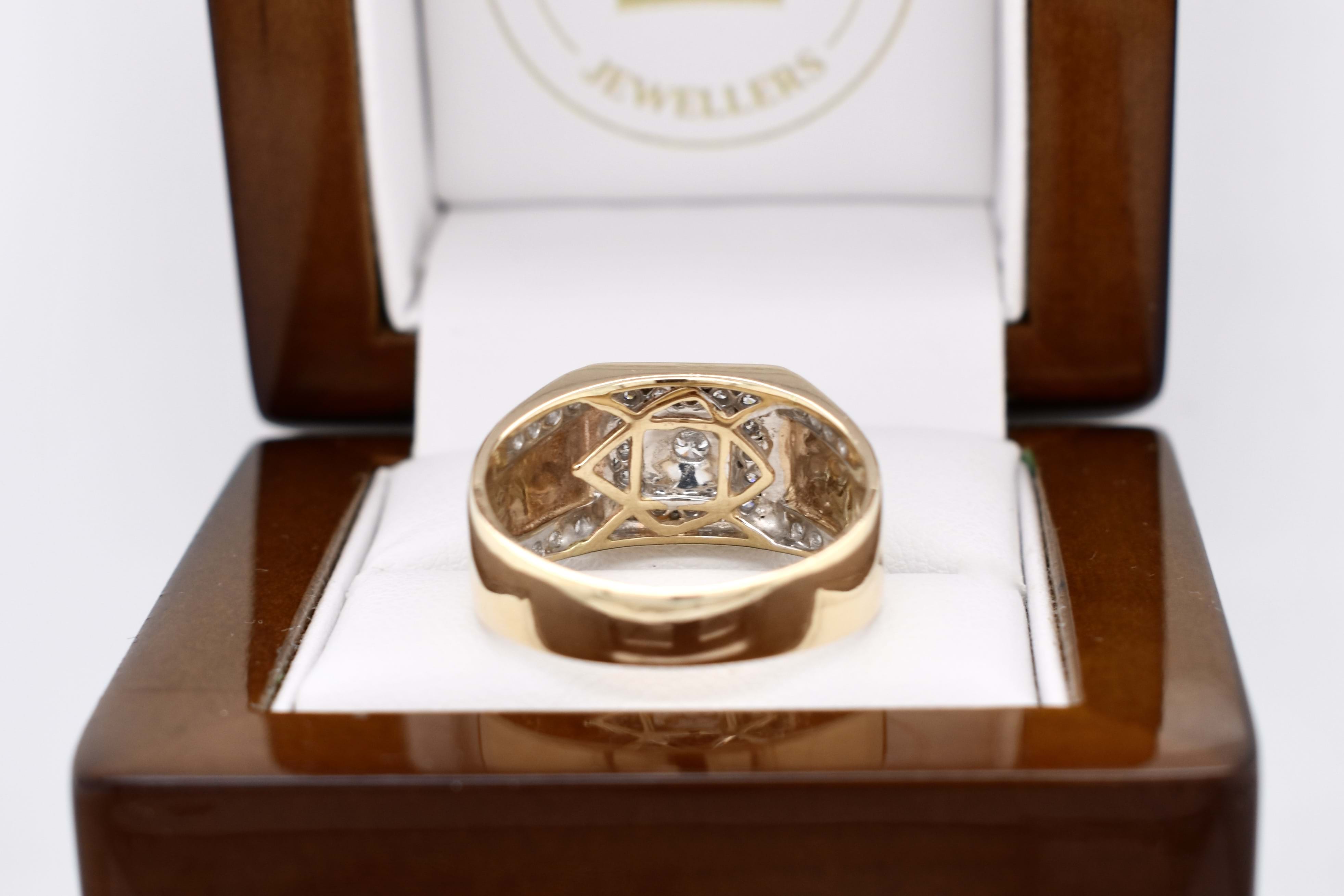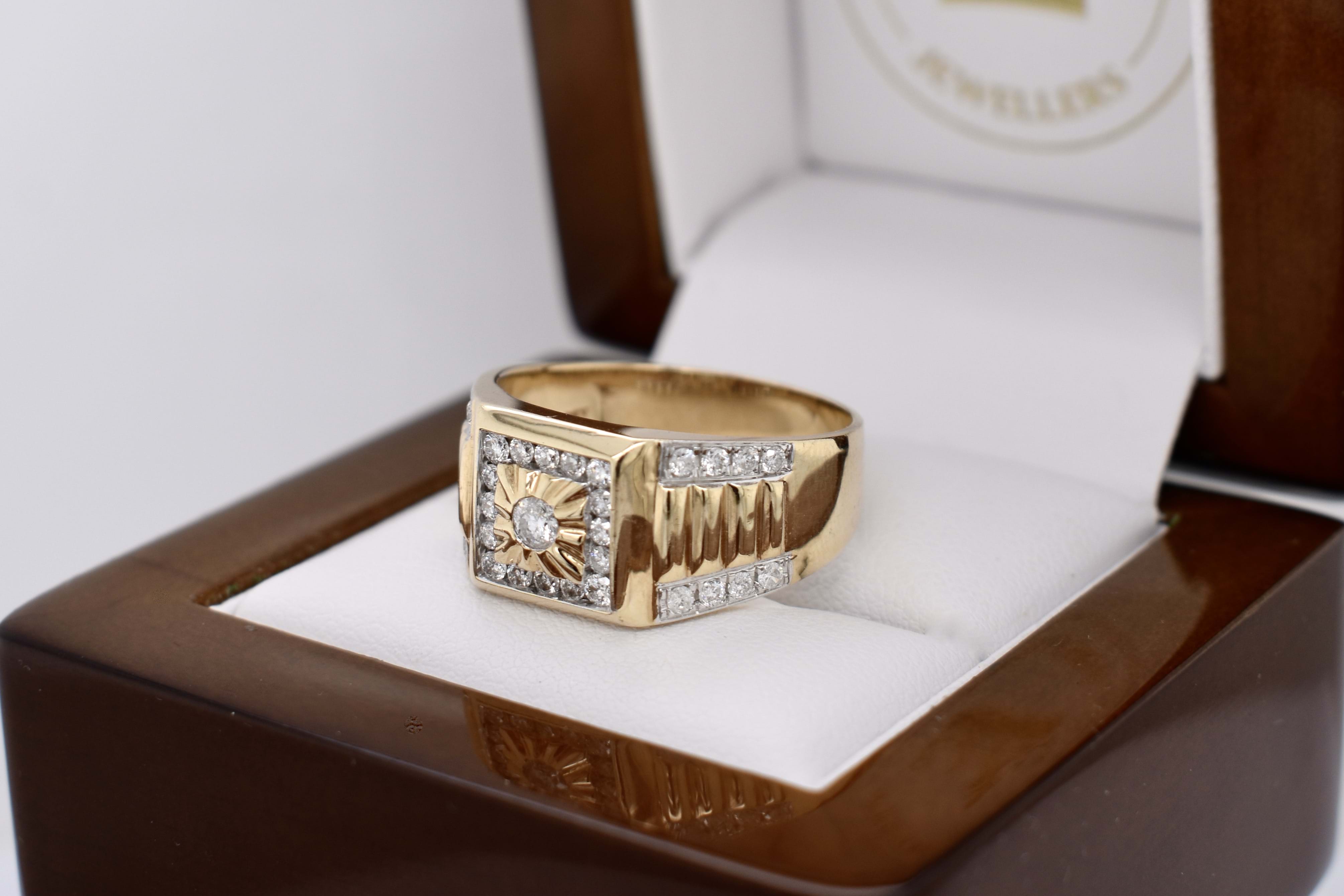 The most amazing vintage diamond gents ring, featuring one centre 3.00mm diamond of 0.10ct HP2, pressure set in a grooved raised square flat top, in 9ct yellow gold. Surrounded with 16 round brilliant cut diamonds channel set in a square totalling 0.32ct HP2, with a further 16 round brilliant cut diamonds rhodium plated grain set down the tapering fluted shoulders, 0.28ct HP2. The total diamond weight being 0.70ct HP2, ranging from 1.50-1.70mm round in size. This stunning ring is completed with a tapering flat 11.12-4.70mm wide band. 6.78 grams. Finger size U+. Independent Valuation Supplied.
