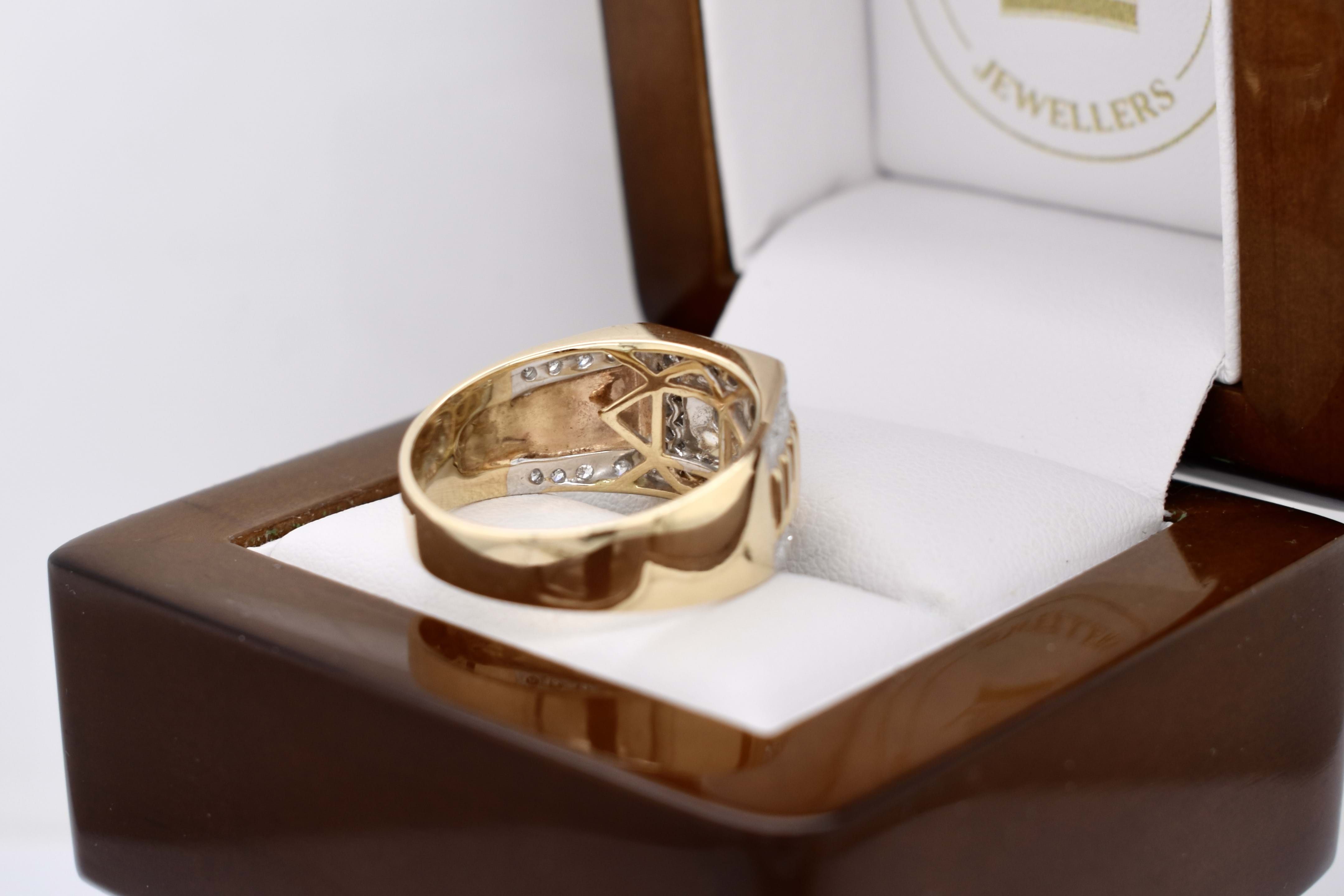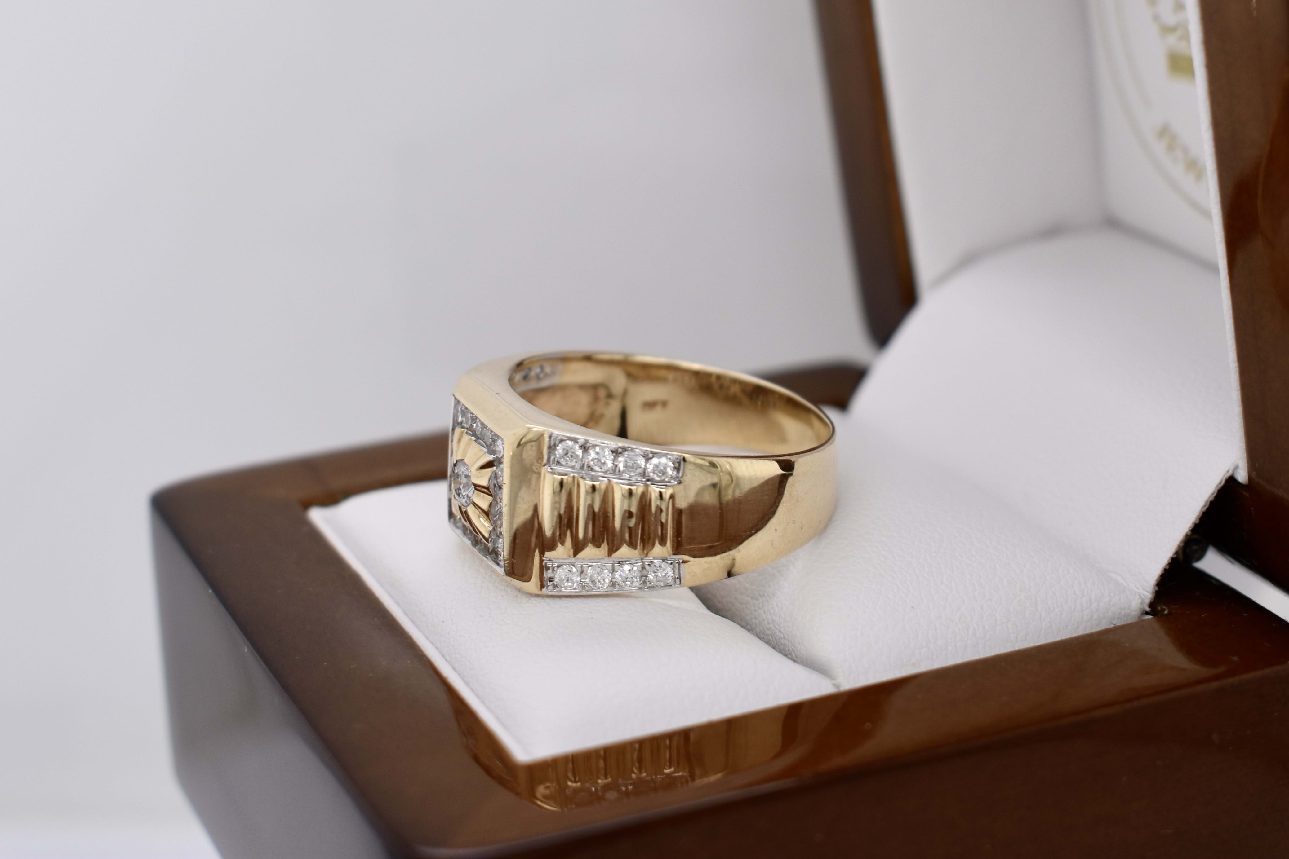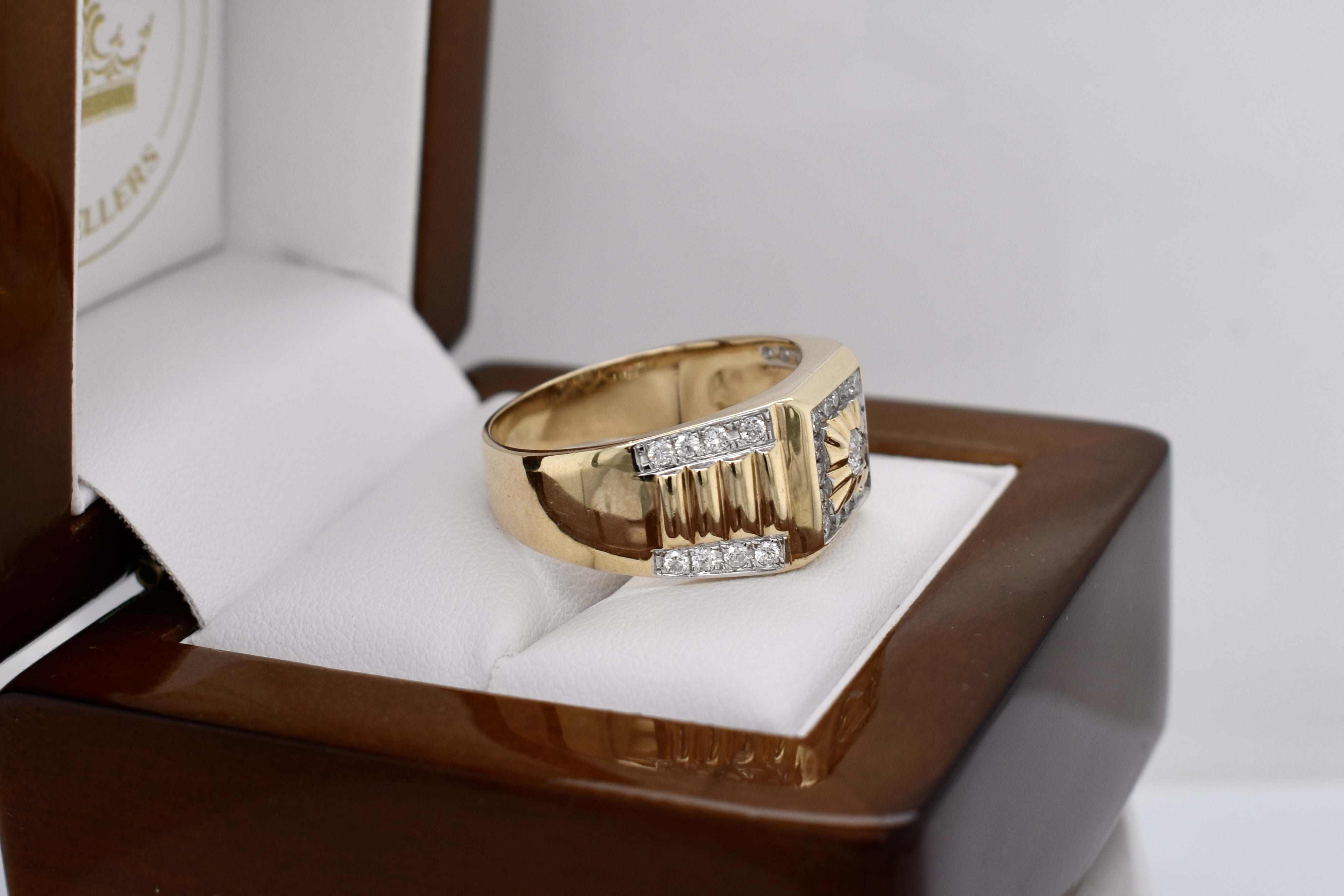 The most amazing vintage diamond gents ring, featuring one centre 3.00mm diamond of 0.10ct HP2, pressure set in a grooved raised square flat top, in 9ct yellow gold. Surrounded with 16 round brilliant cut diamonds channel set in a square totalling 0.32ct HP2, with a further 16 round brilliant cut diamonds rhodium plated grain set down the tapering fluted shoulders, 0.28ct HP2. The total diamond weight being 0.70ct HP2, ranging from 1.50-1.70mm round in size. This stunning ring is completed with a tapering flat 11.12-4.70mm wide band. 6.78 grams. Finger size U+. Independent Valuation Supplied.