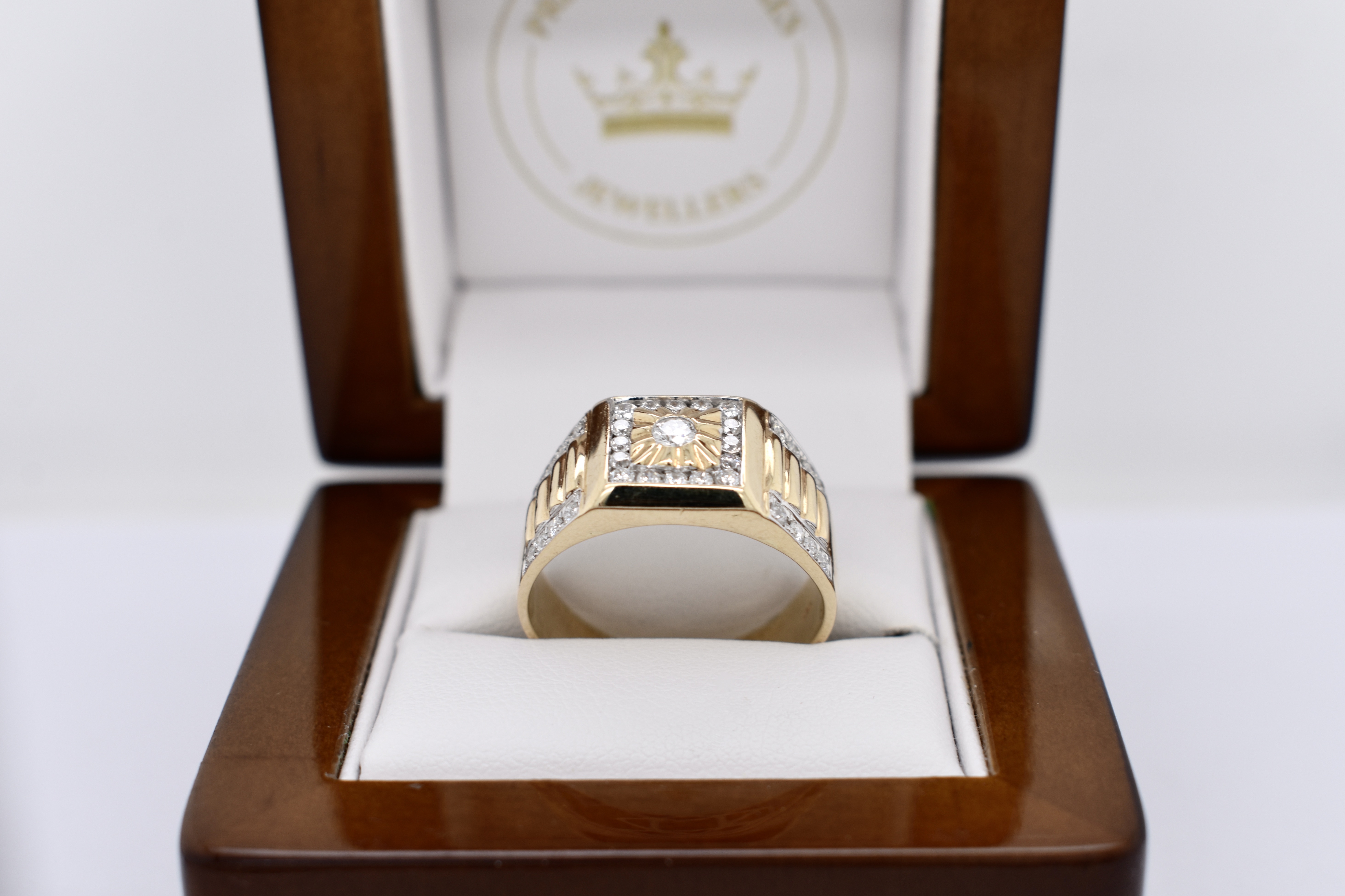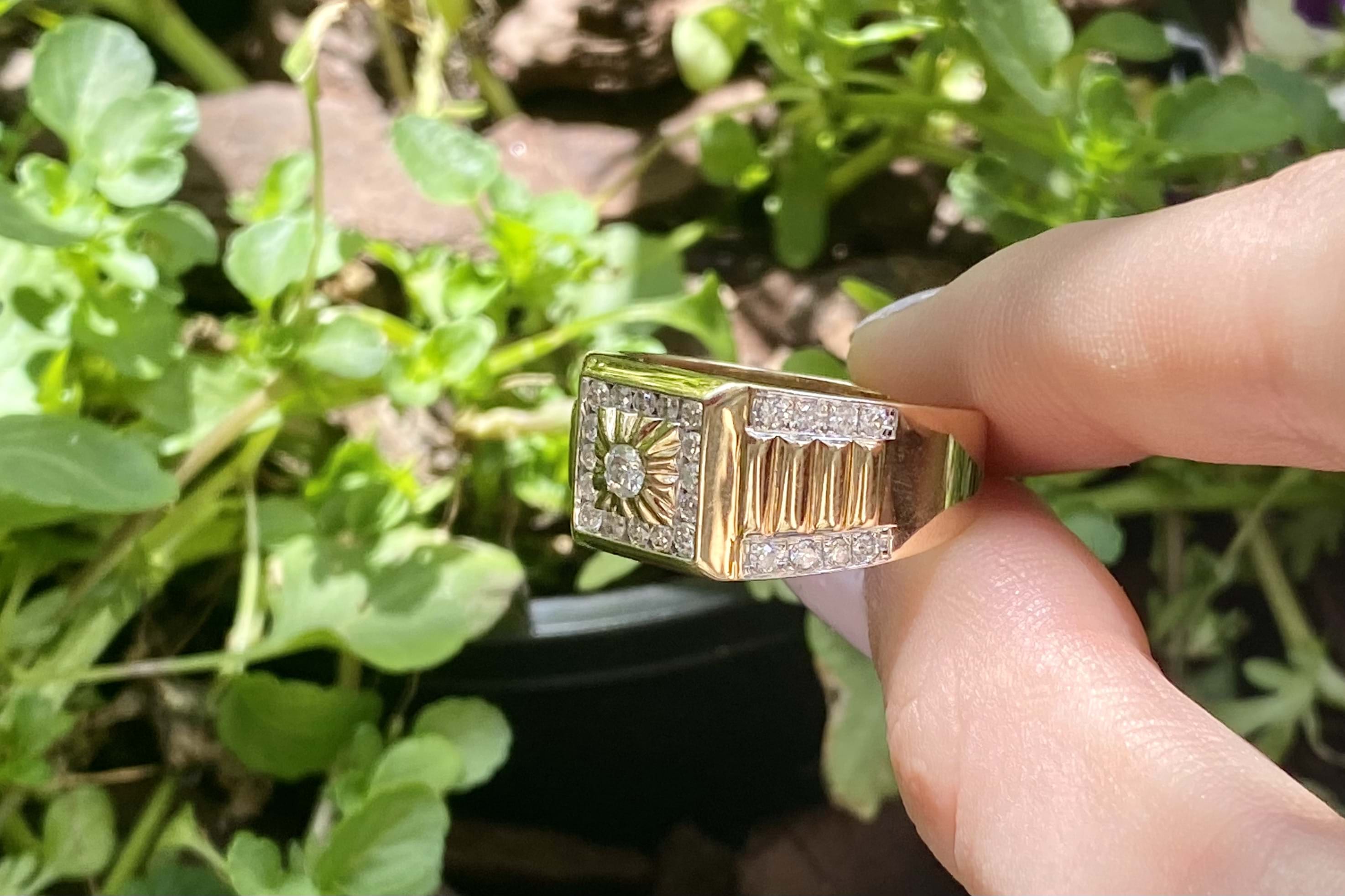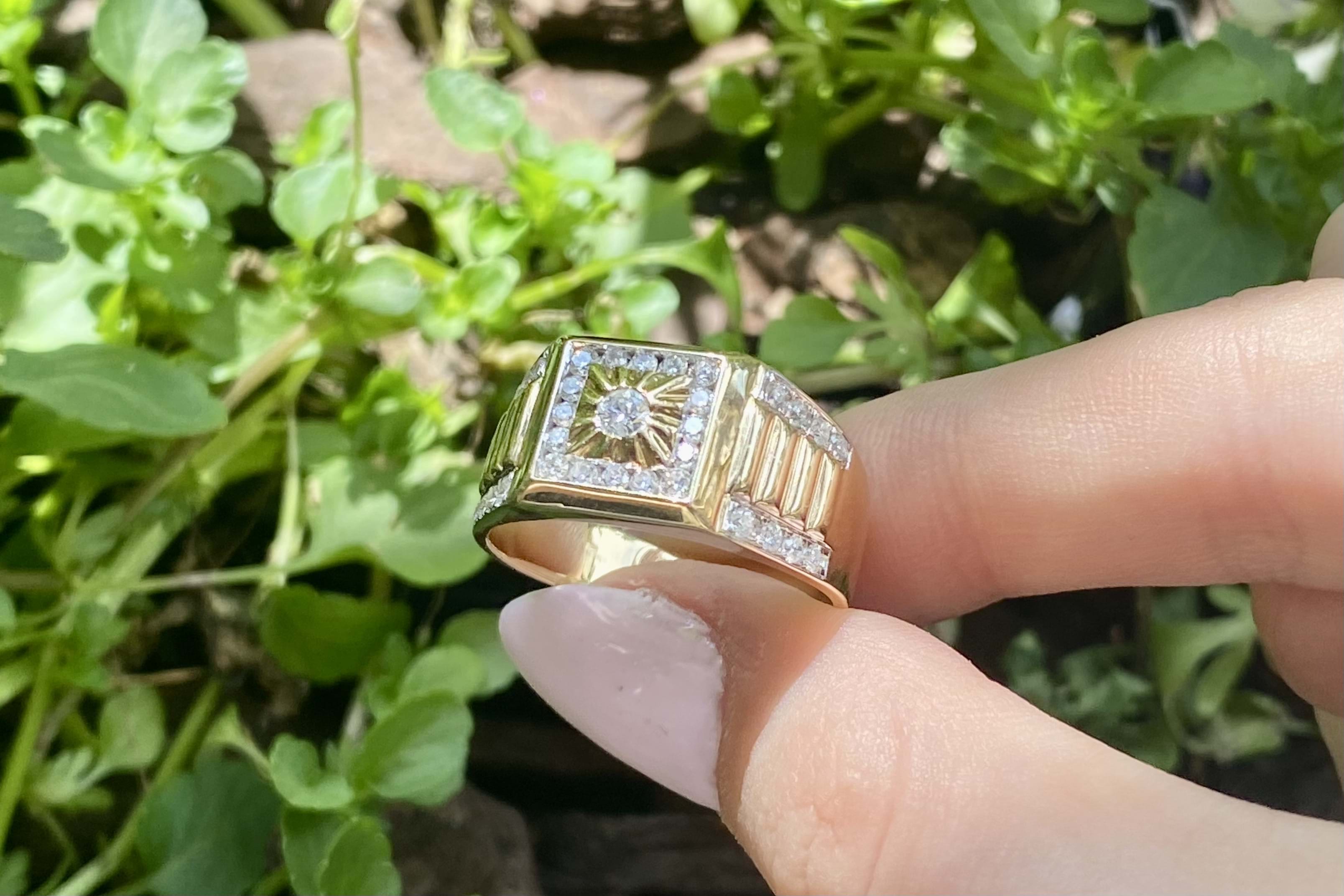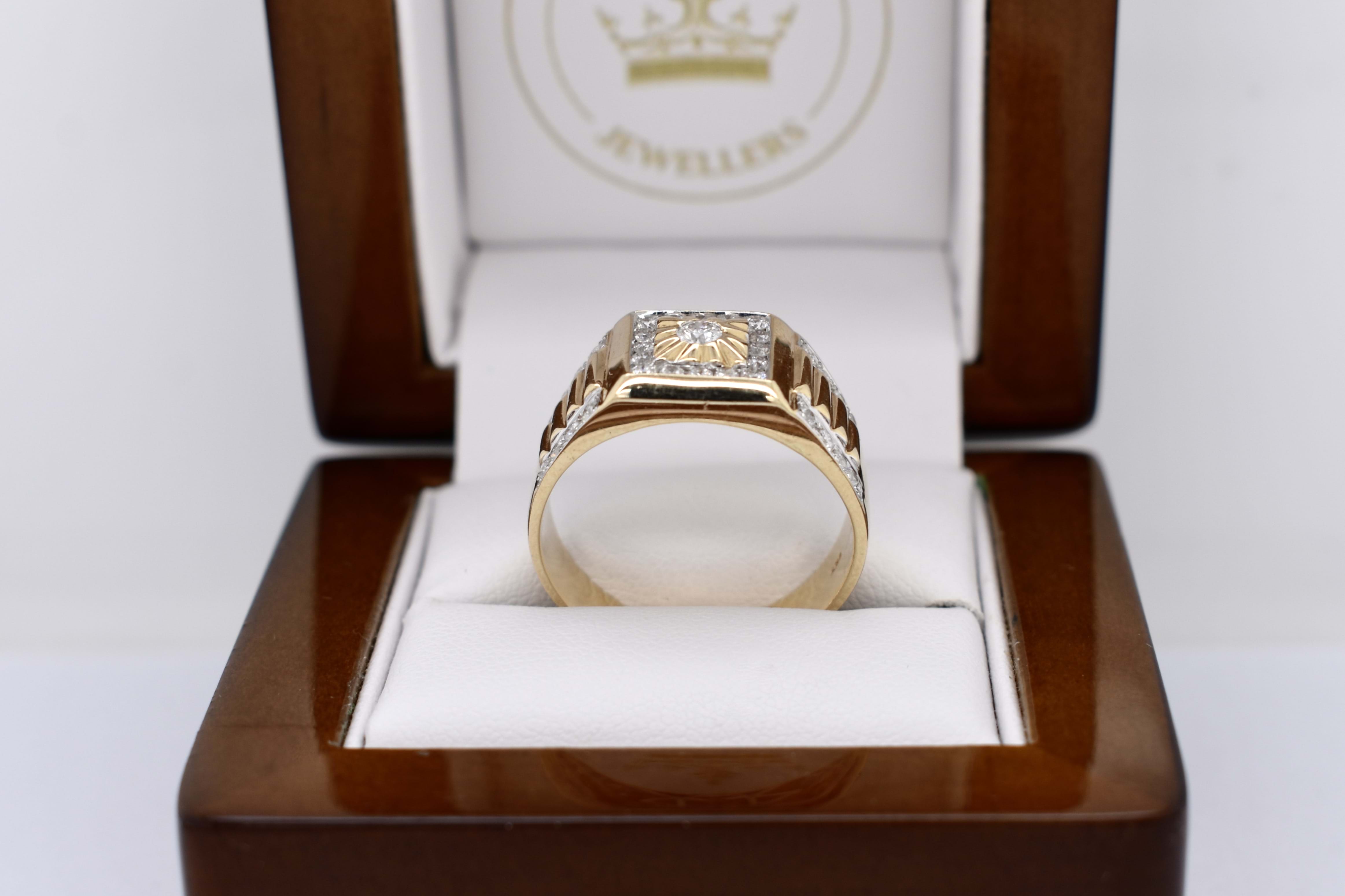 The most amazing vintage diamond gents ring, featuring one centre 3.00mm diamond of 0.10ct HP2, pressure set in a grooved raised square flat top, in 9ct yellow gold. Surrounded with 16 round brilliant cut diamonds channel set in a square totalling 0.32ct HP2, with a further 16 round brilliant cut diamonds rhodium plated grain set down the tapering fluted shoulders, 0.28ct HP2. The total diamond weight being 0.70ct HP2, ranging from 1.50-1.70mm round in size. This stunning ring is completed with a tapering flat 11.12-4.70mm wide band. 6.78 grams. Finger size U+. Independent Valuation Supplied.