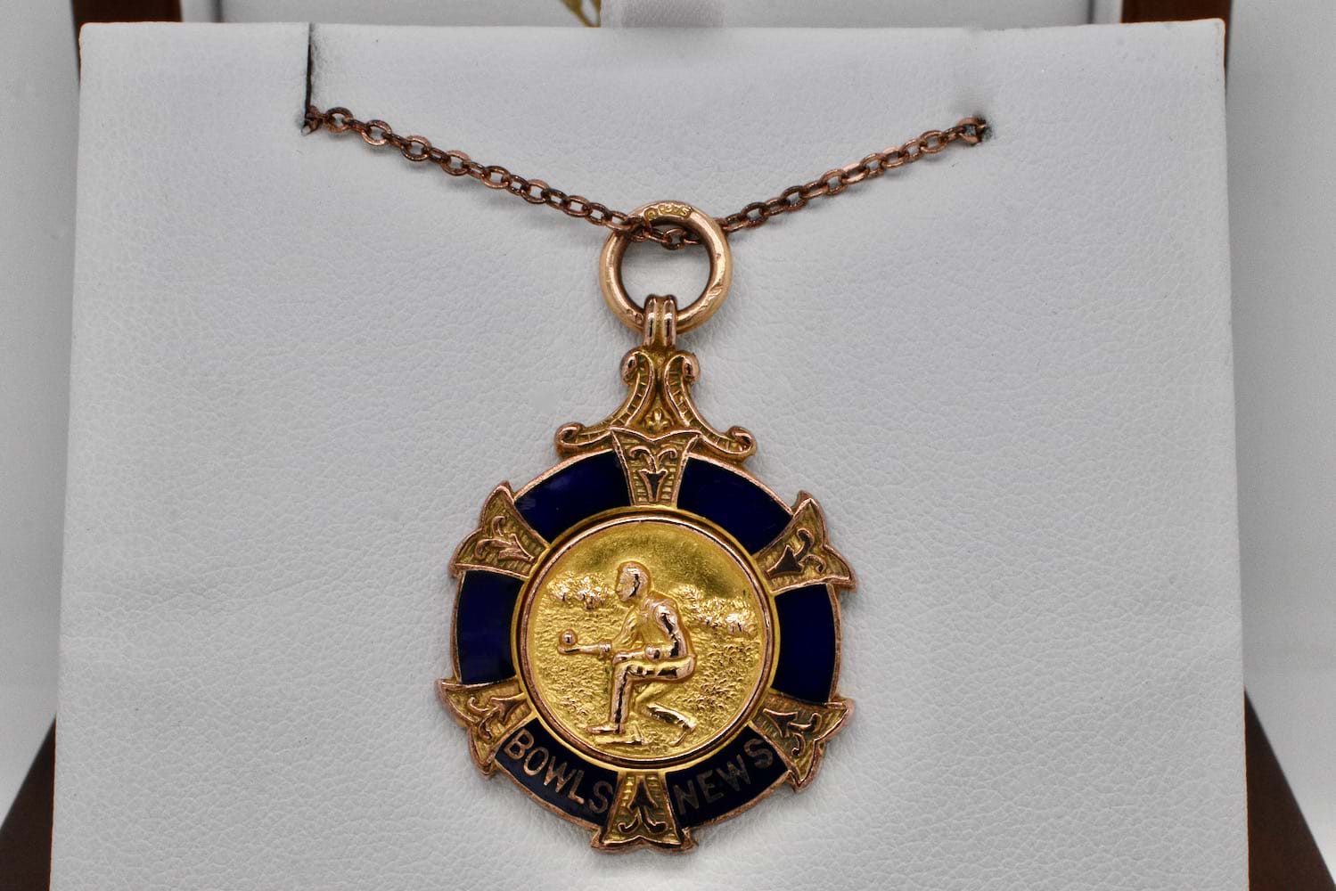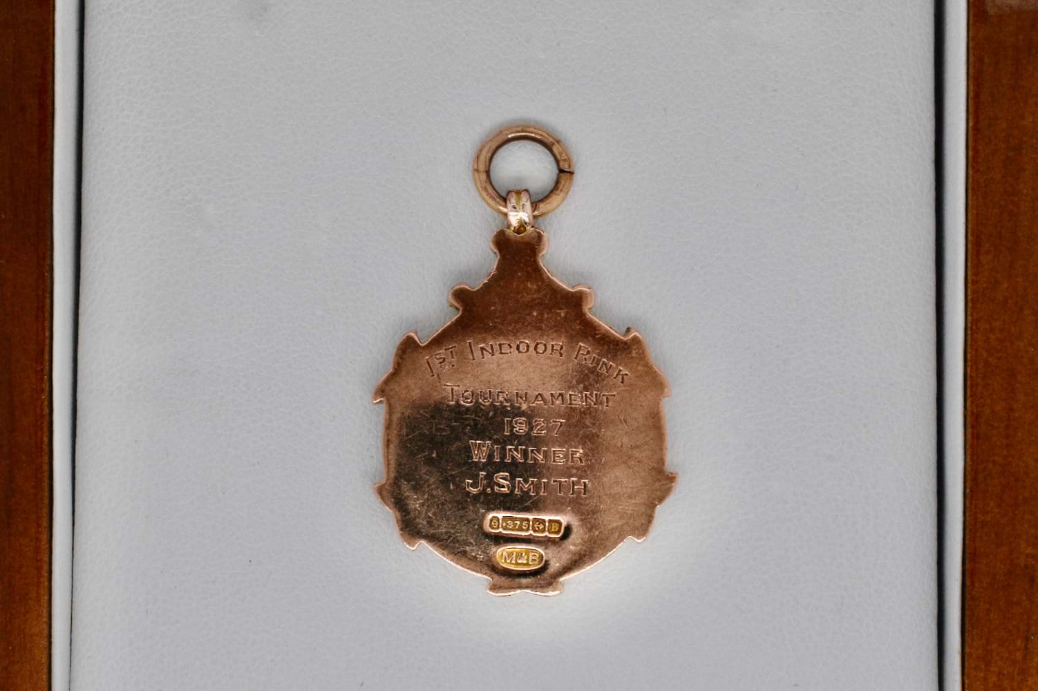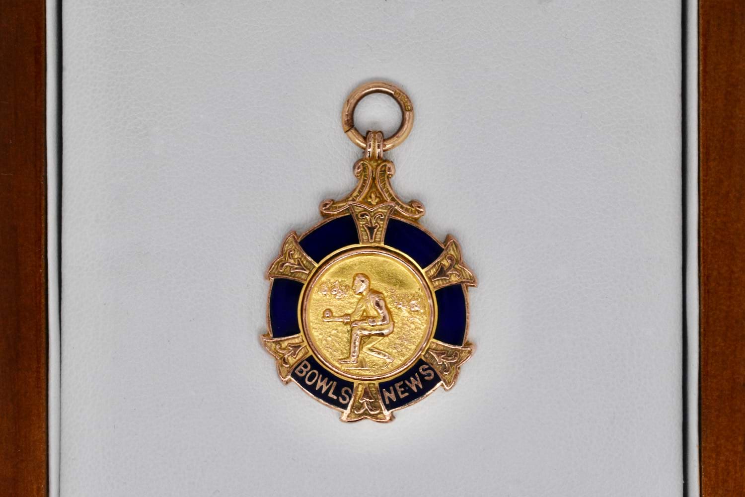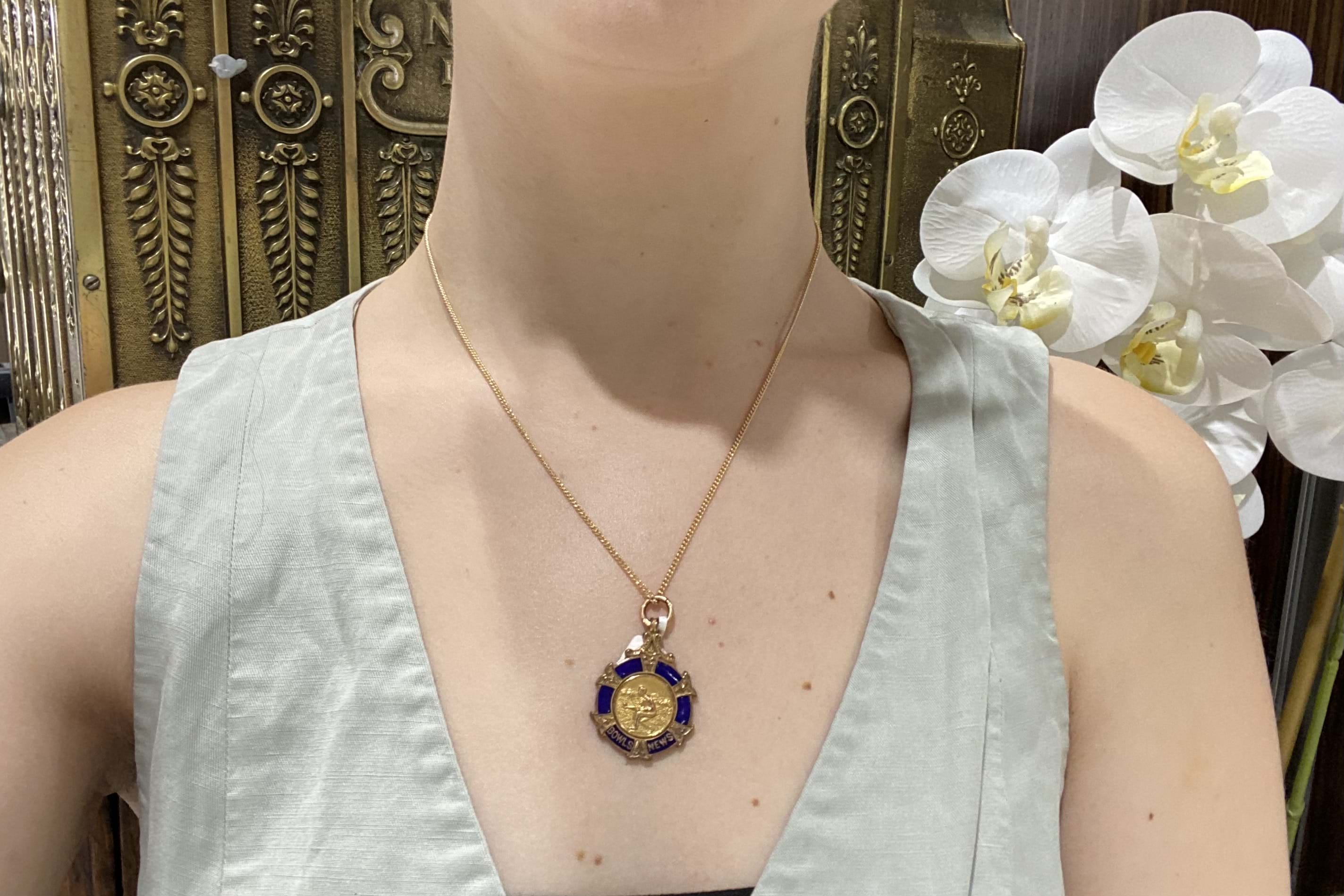 9ct yellow gold antique medal with embossed lawn bowls on the front and blue enamel border with the test "Bowls News". The medal is hallmarked Birmingham 1926, with engraving " 1st Indoor Rink Tournament 1927 Winner J.Smith". Measures approx. 25mm