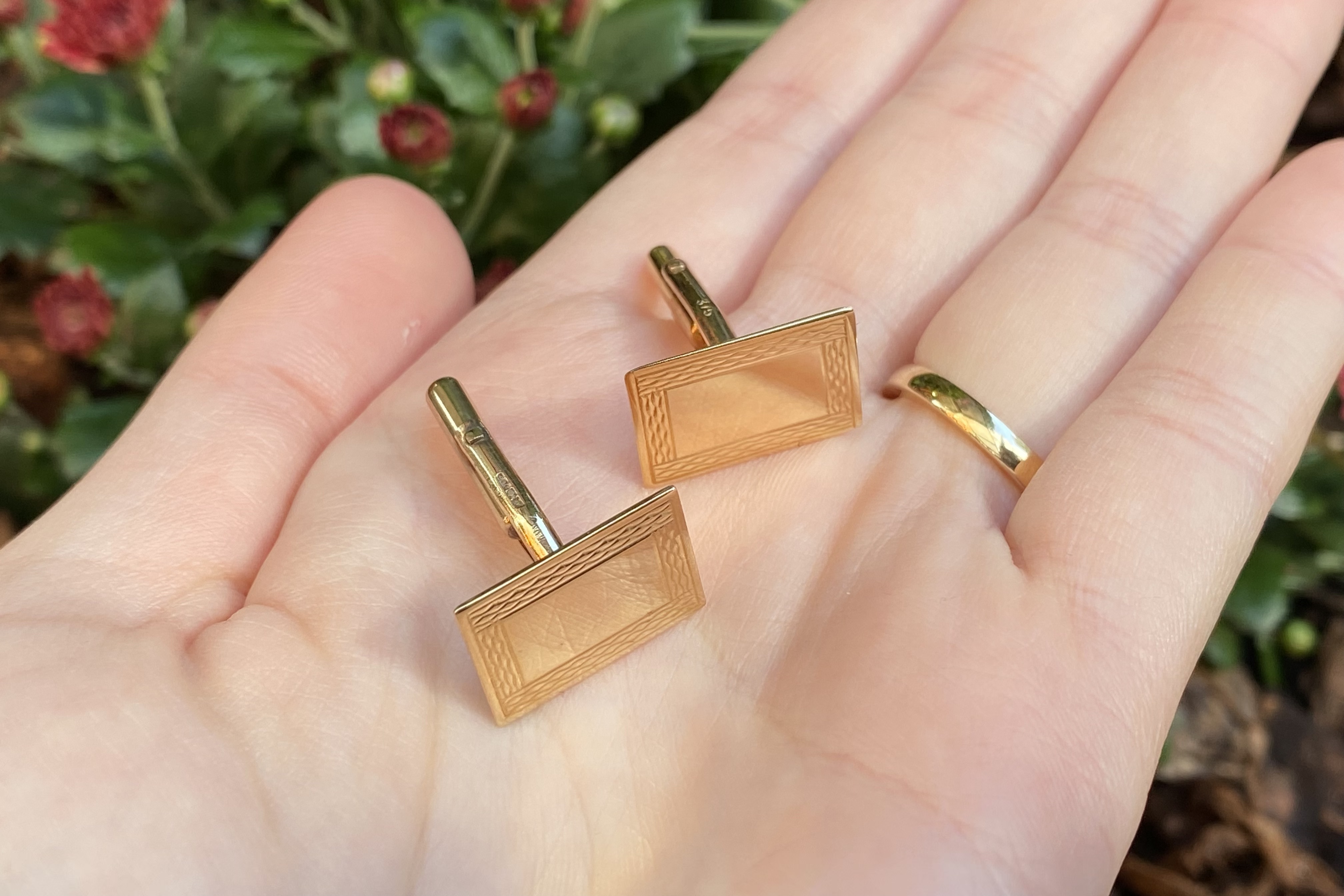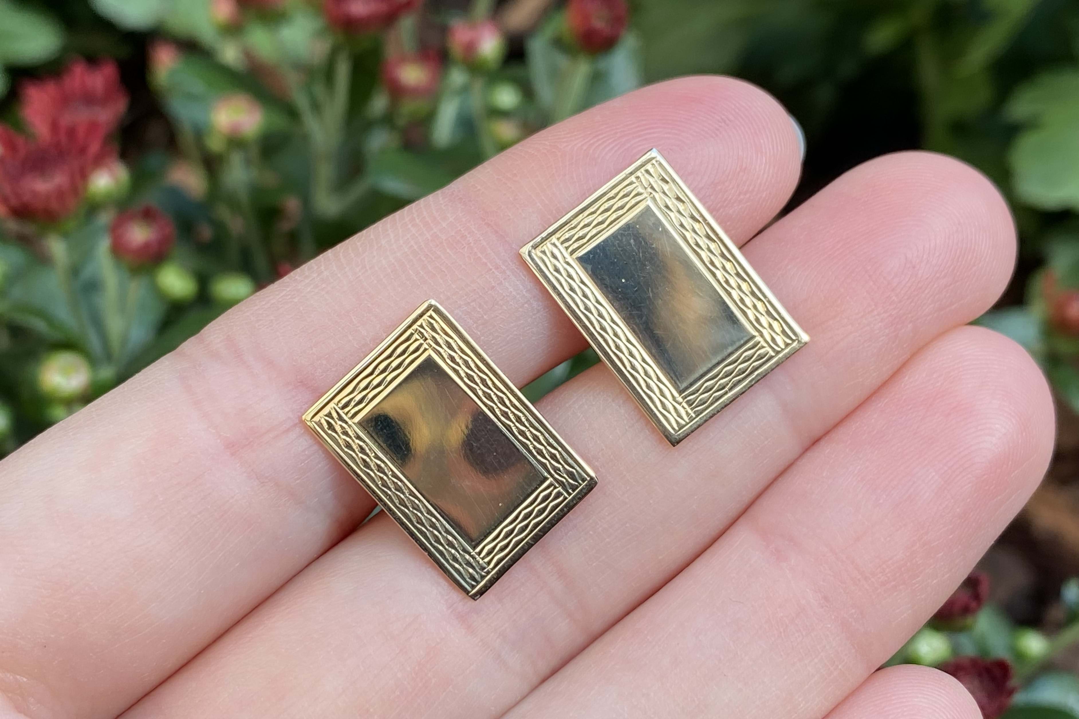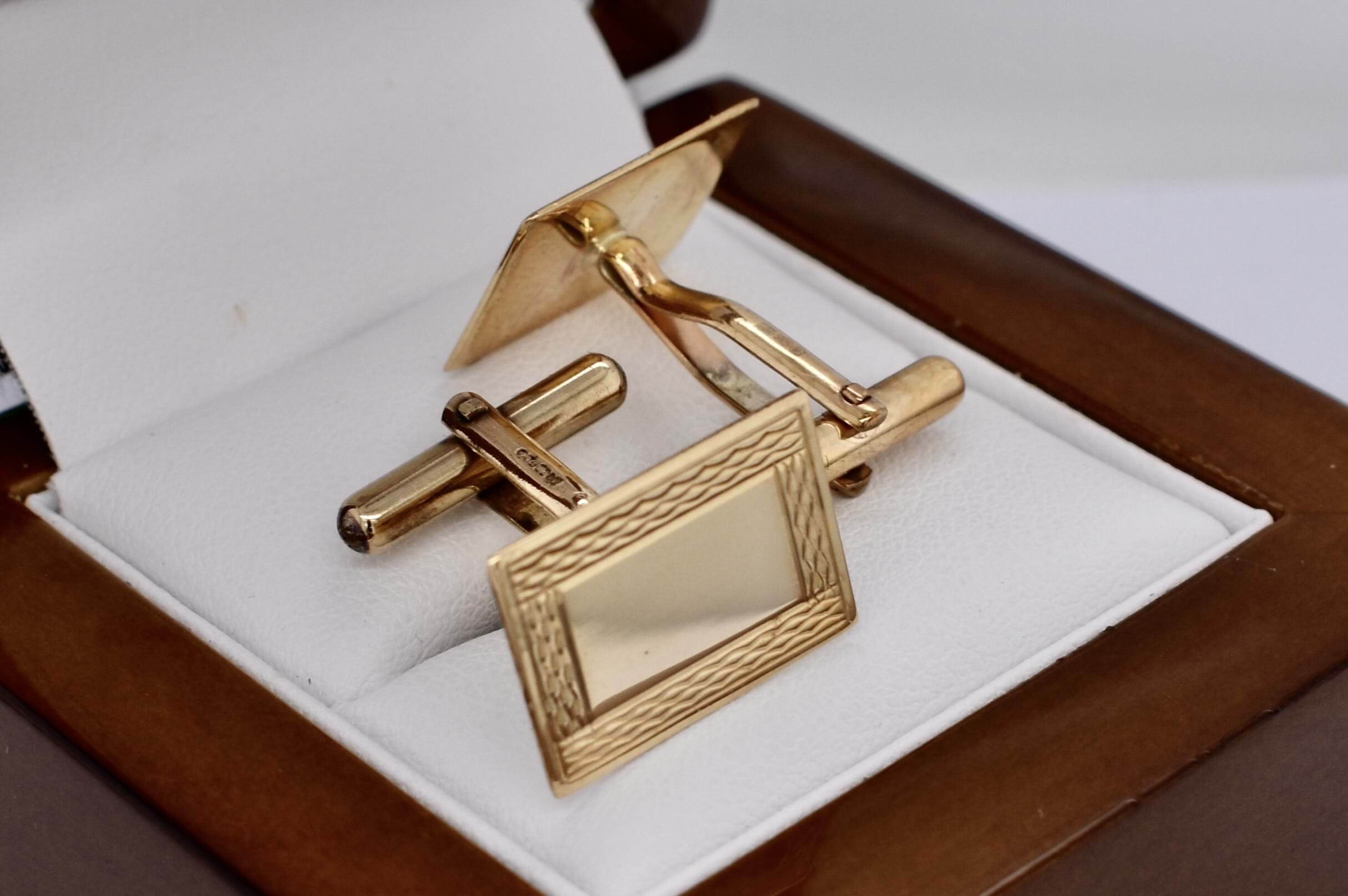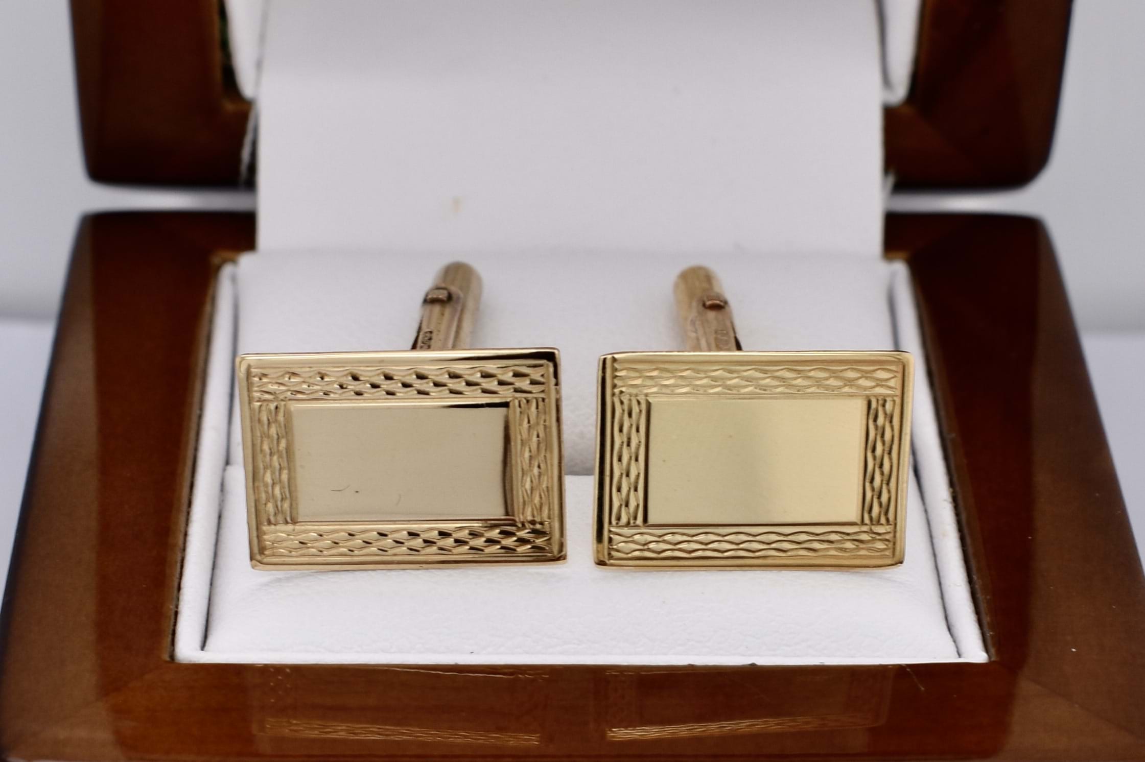 A classy pair of 9ct yellow gold cufflinks in a rectangular shape with engine turned border detailing.
