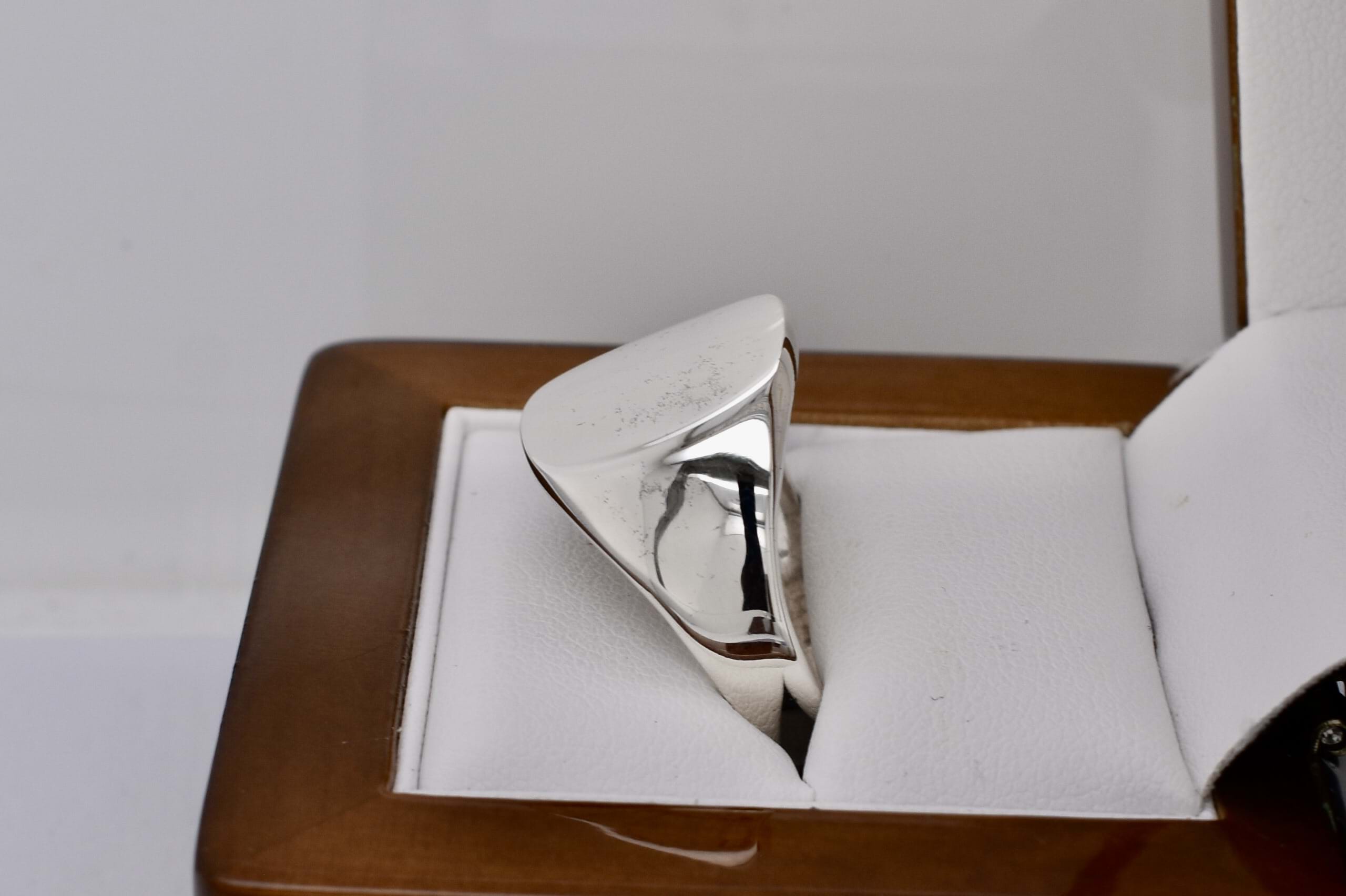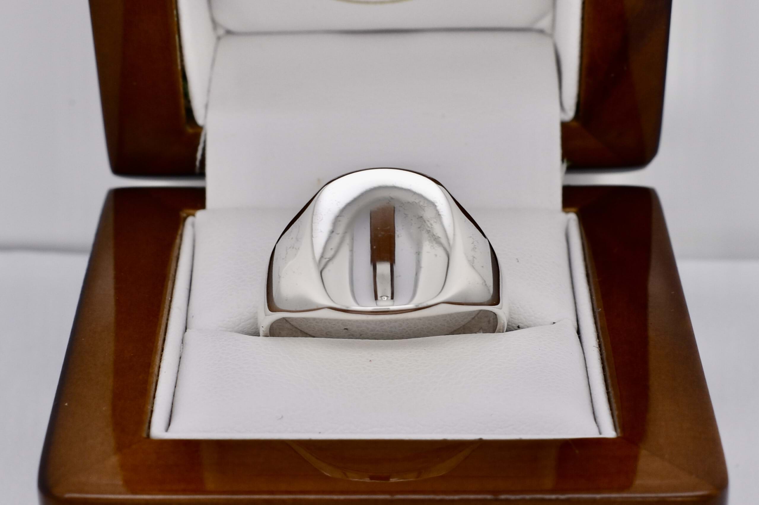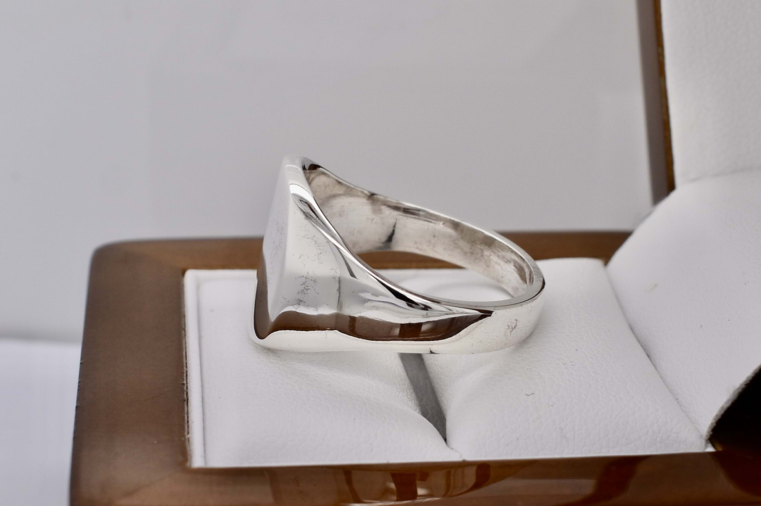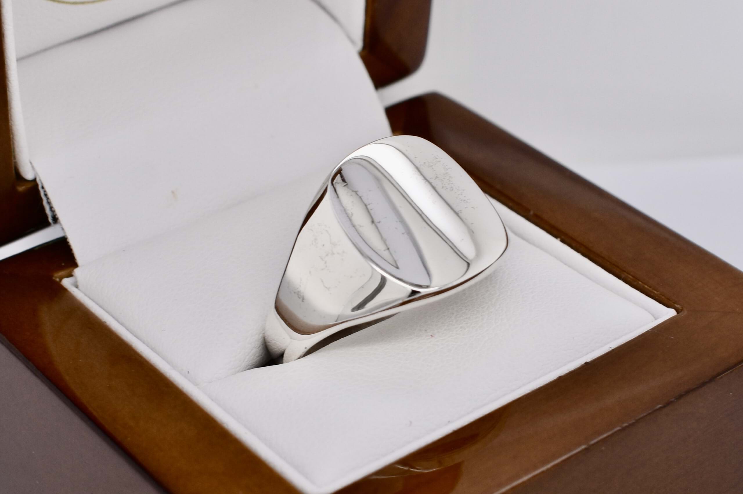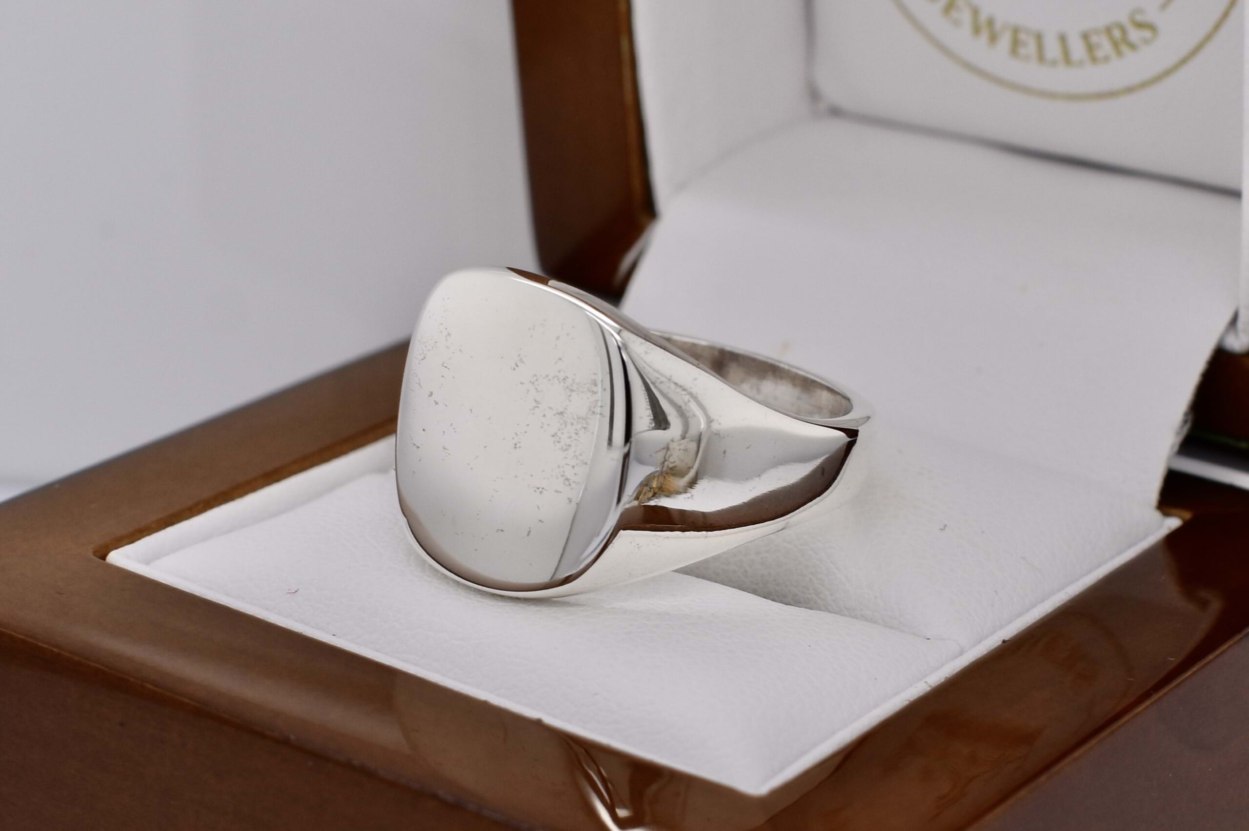 A classic solid signet ring, crafted in sterling silver, with a flat cushion top. Finger size Z.