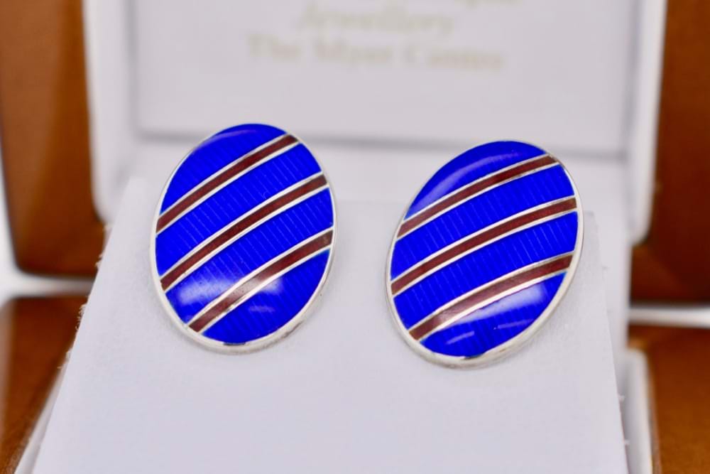 A pair of modern sterling silver cufflinks crafted in the traditional style with each cufflink having a front and back side and a chain connecting them. This stunning pair feature beautiful enamel work in a very Art Deco inspired design of diagonal red enamel strips with a geometric guilloche blue enamel in between each stripe. Measures 19x14mm