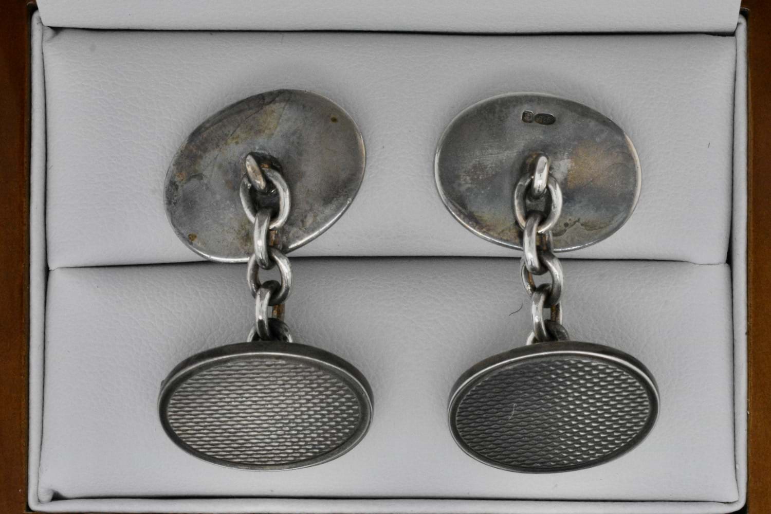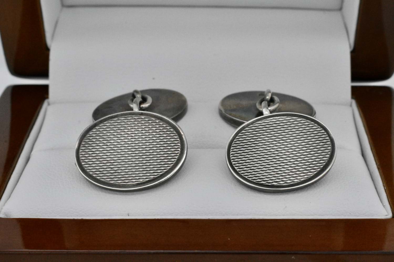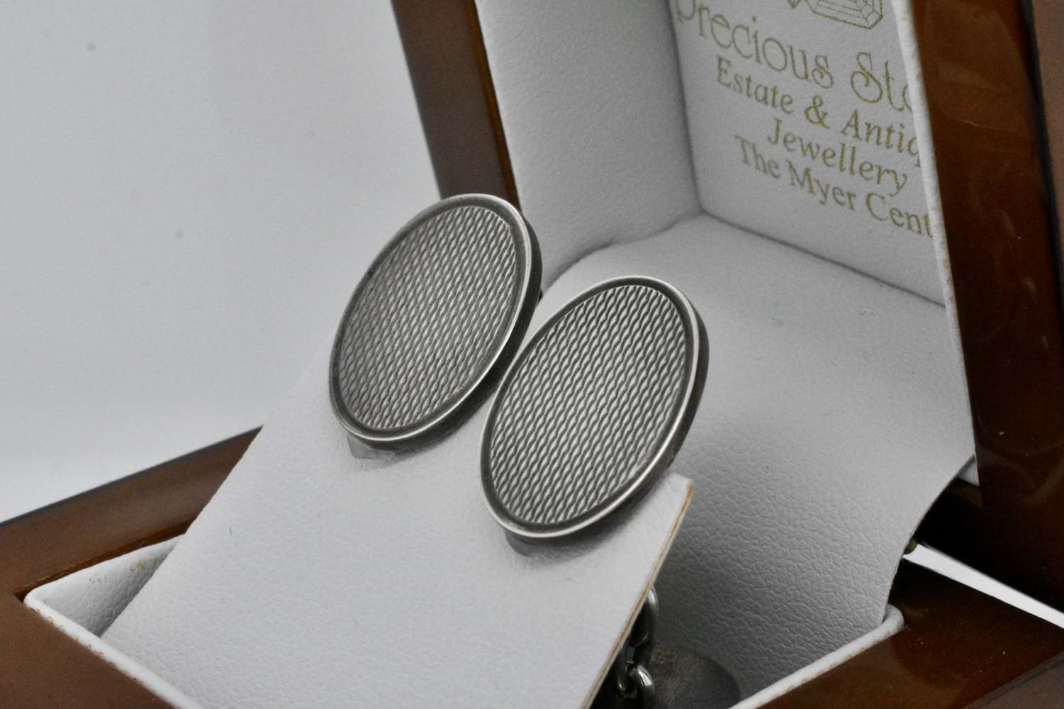 Simple and classic darkened solid sterling silver cufflinks in an oval shape with an engine turned finish
