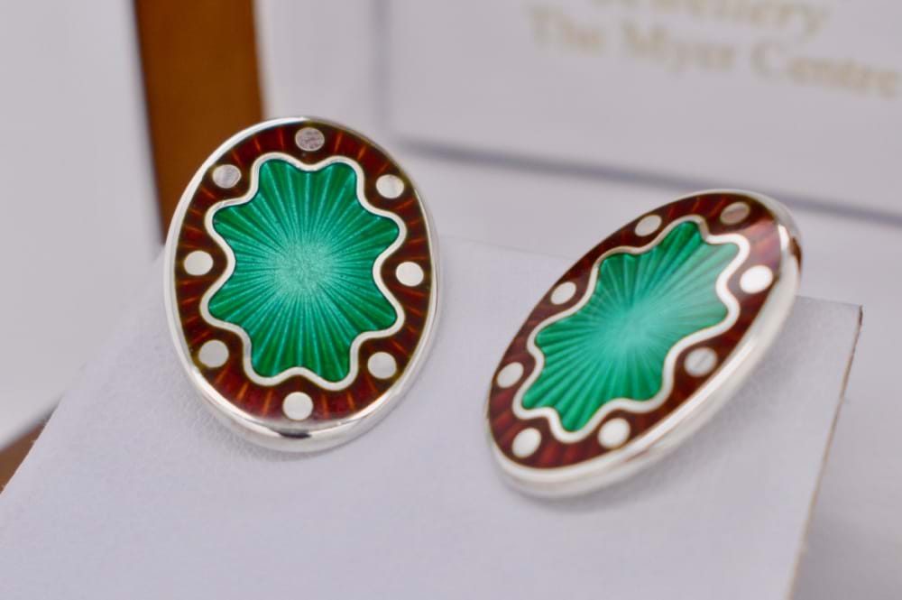 A pair of modern sterling silver cufflinks crafted in the traditional style with each cufflink having a front and back side and a chain connecting them. This stunning pair feature beautiful enamel work with a green center and red enamel surround with remaining silver dots. Measures 19x14mm
