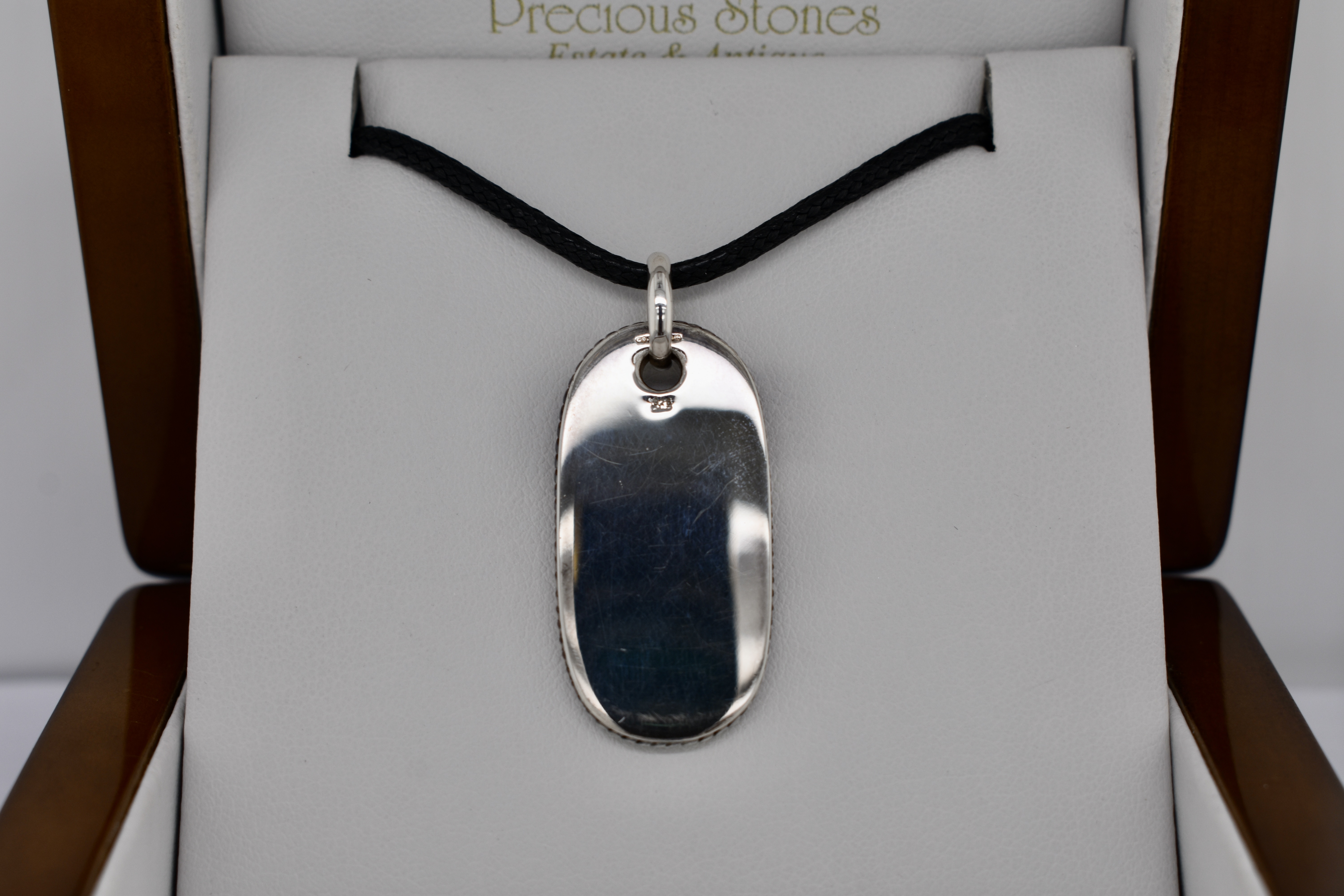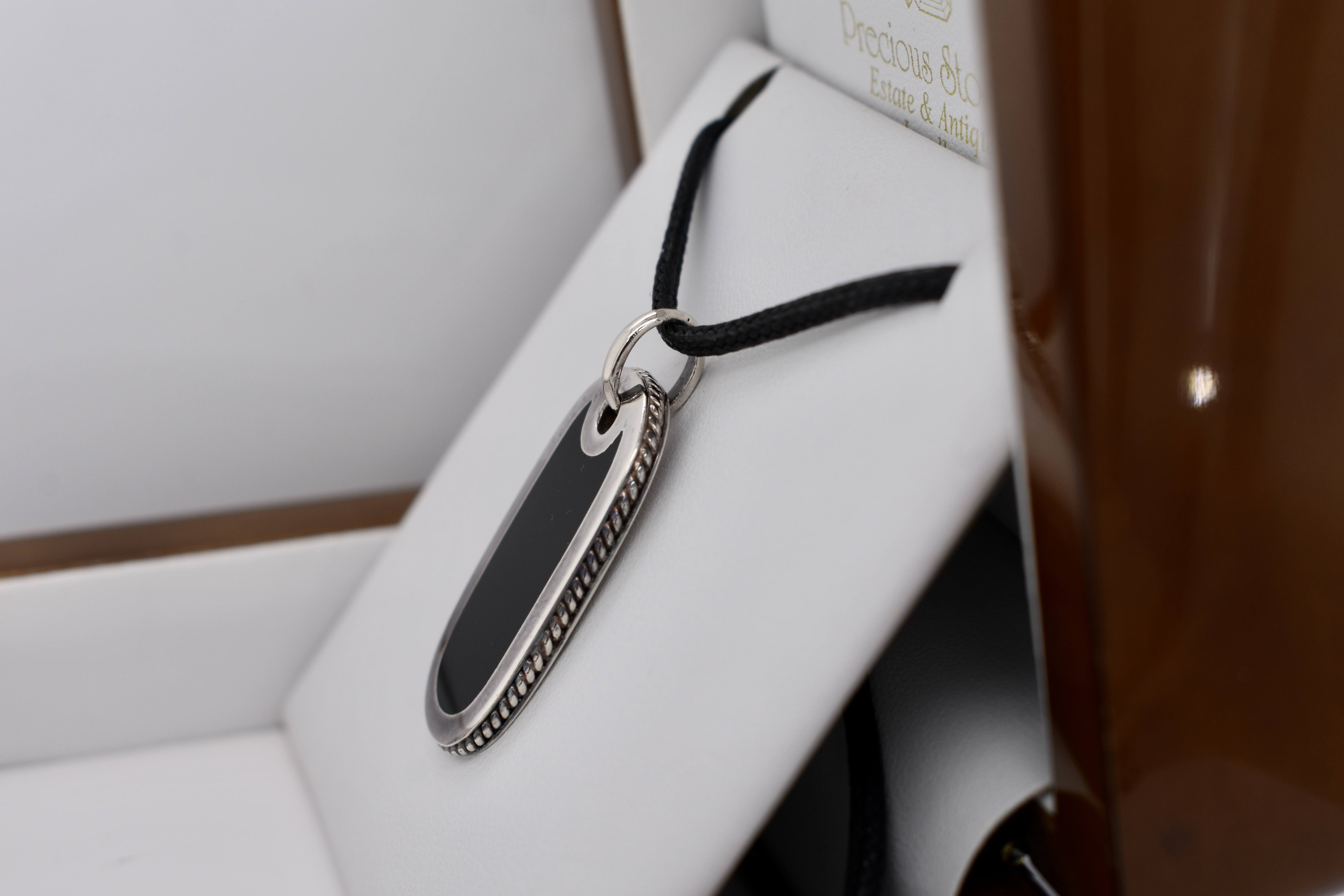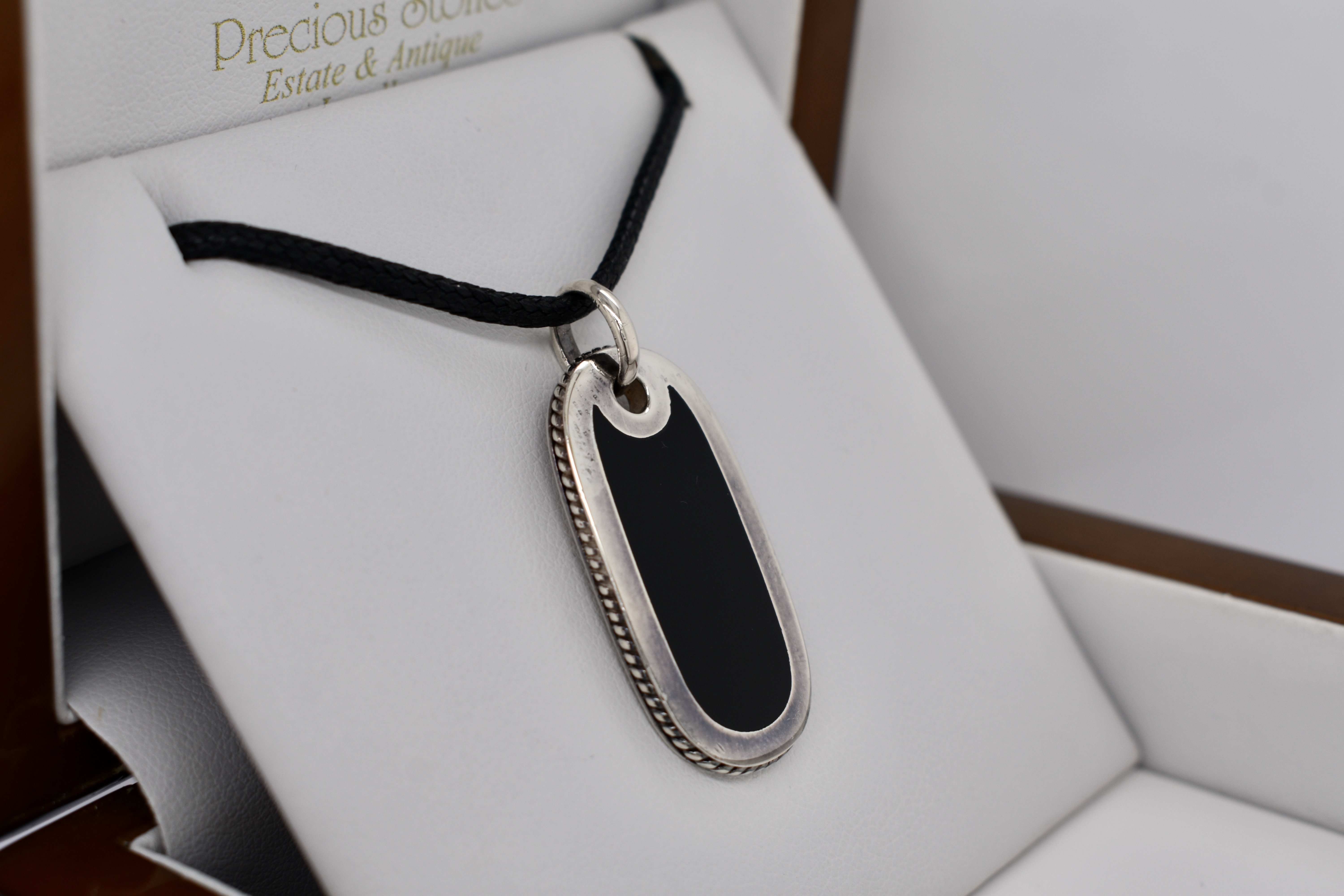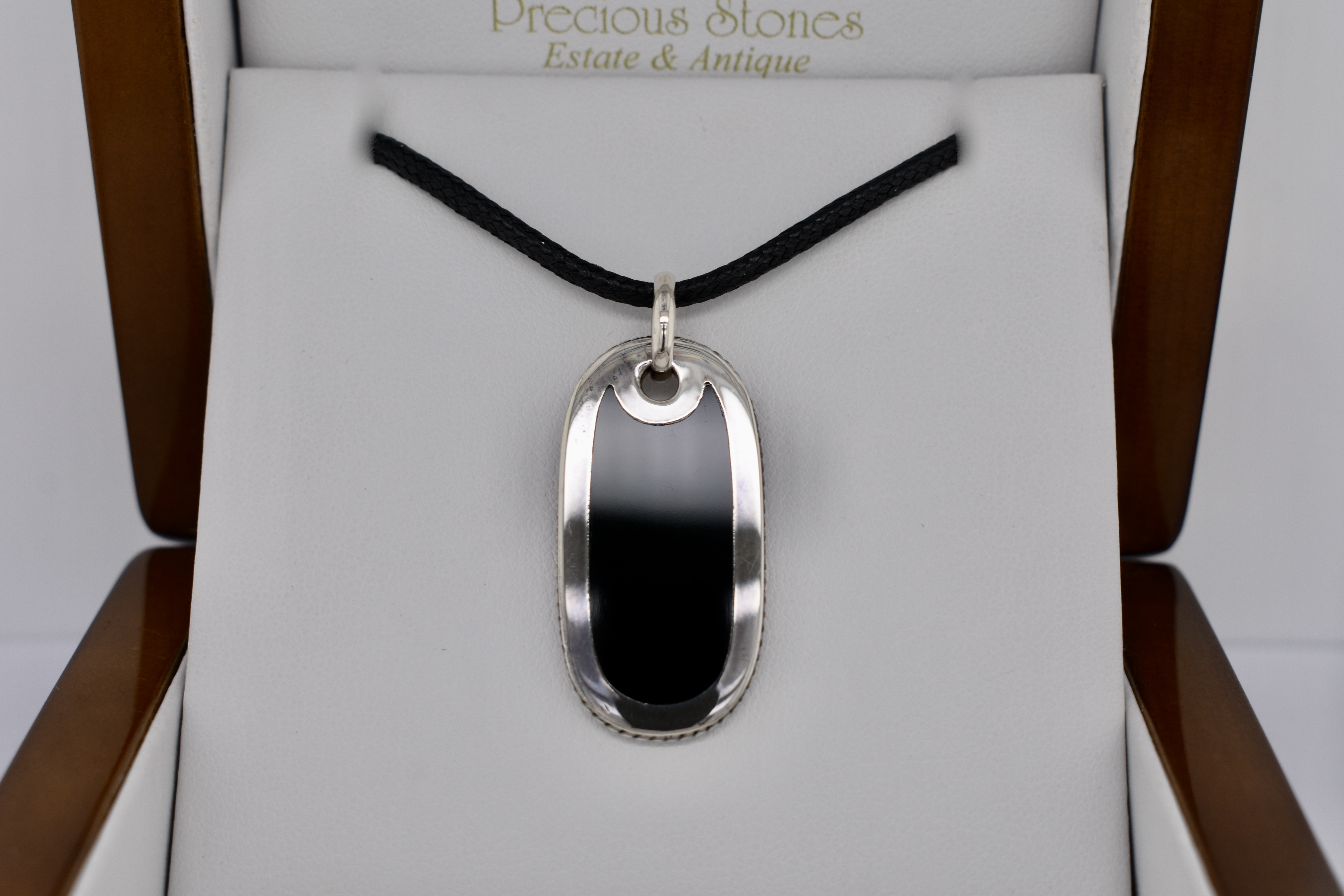 This classic dog tag style necklet, is crafted in sterling silver, with an onyx panel in the centre. The dog tag has a plain bale and comes with a black leather strand/chain, which ties in the black of the onyx beautifully.