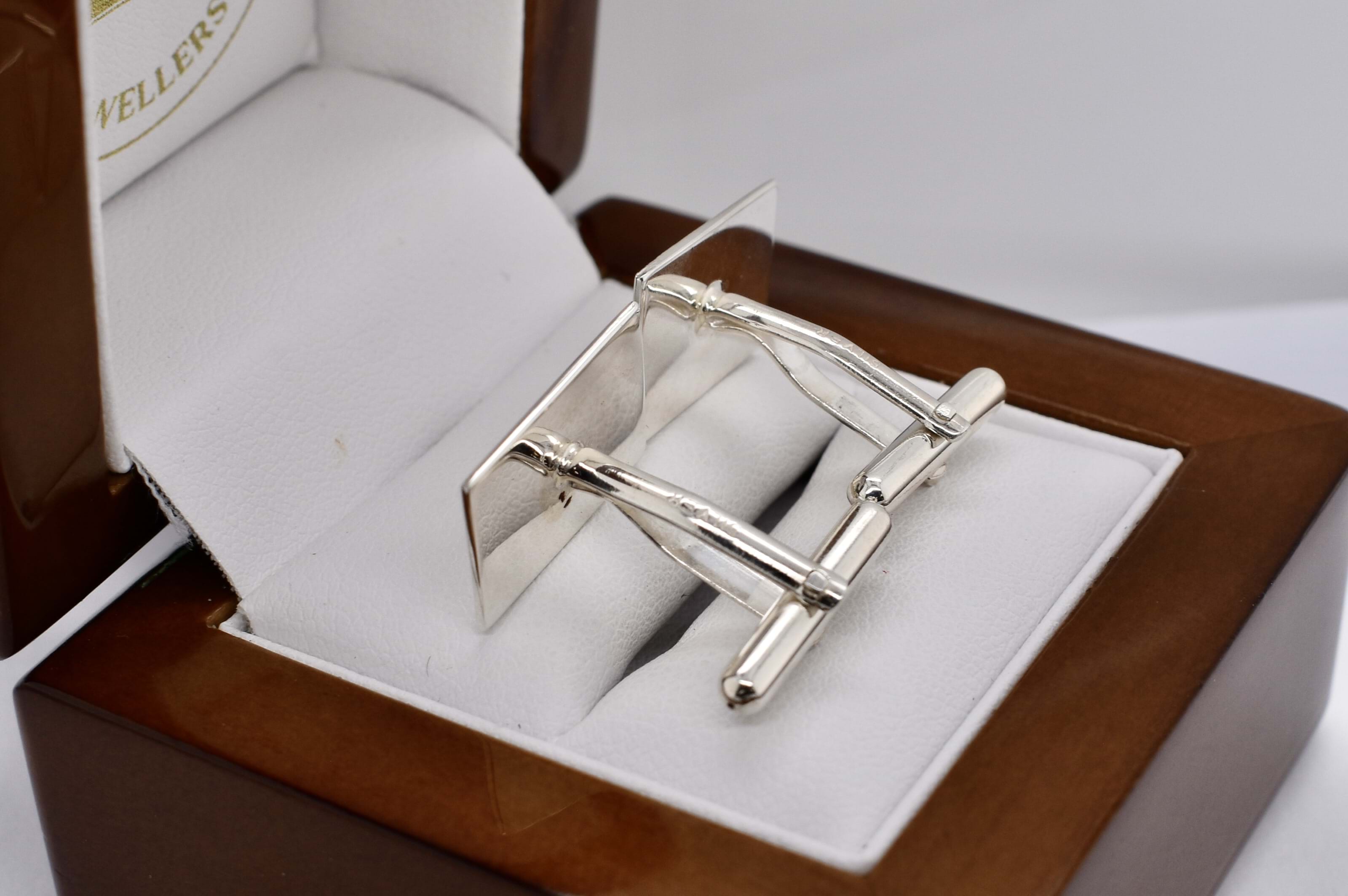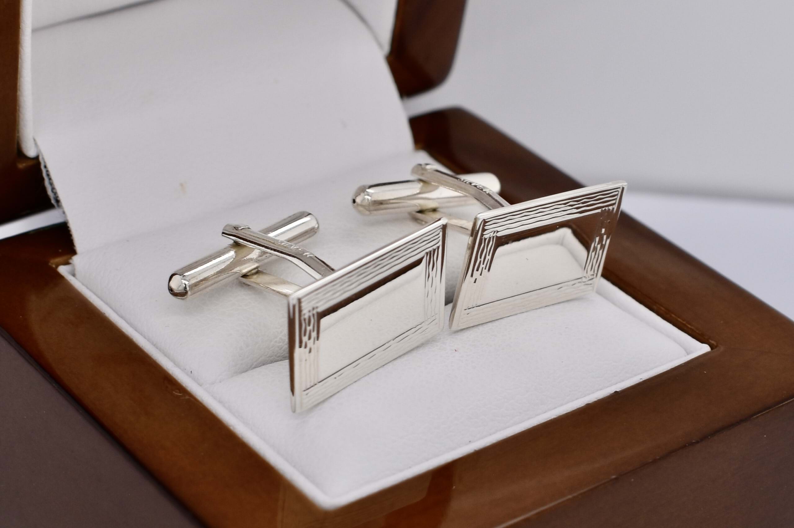 Classy and classic, a pair of rectangular cufflinks, crafted in sterling silver, with engine turned border detailing.
