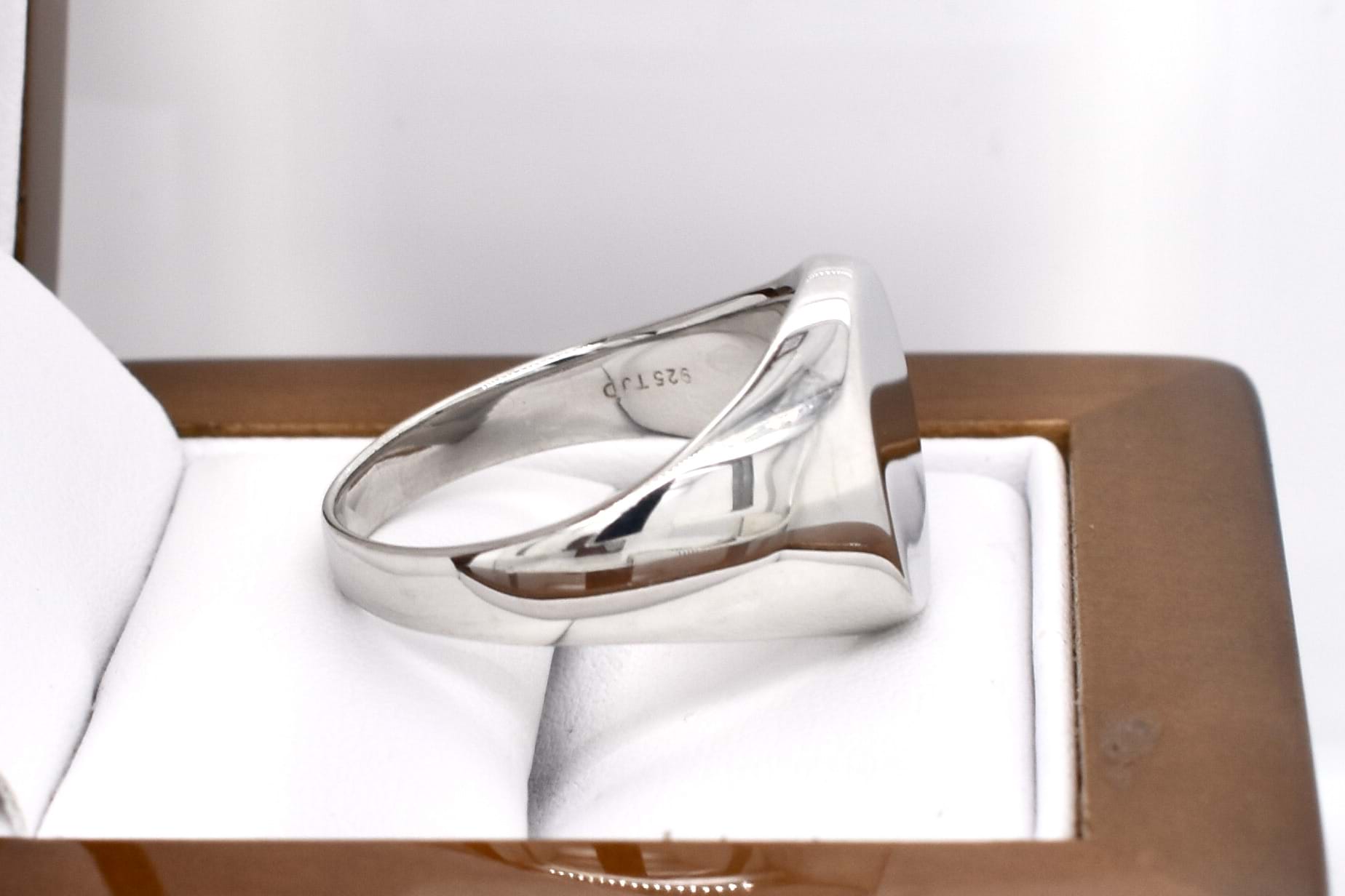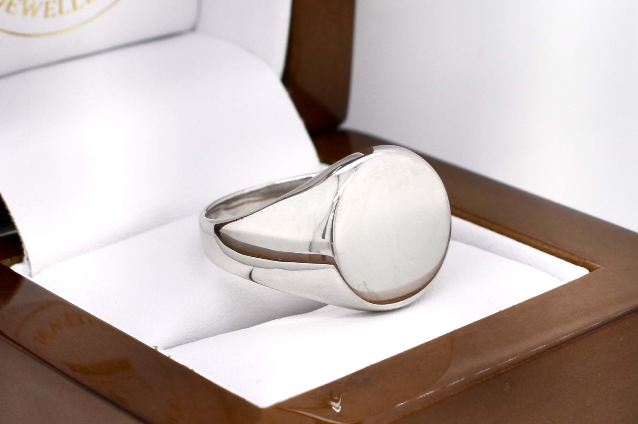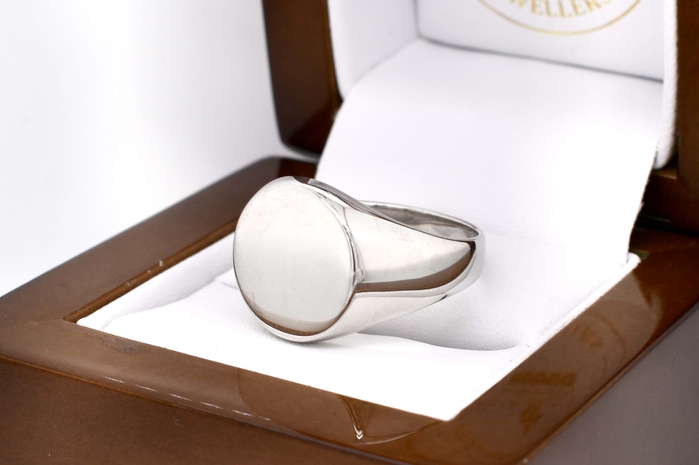 A classic solid signet ring, crafted in sterling silver, with a flat round top. Finger size V+.