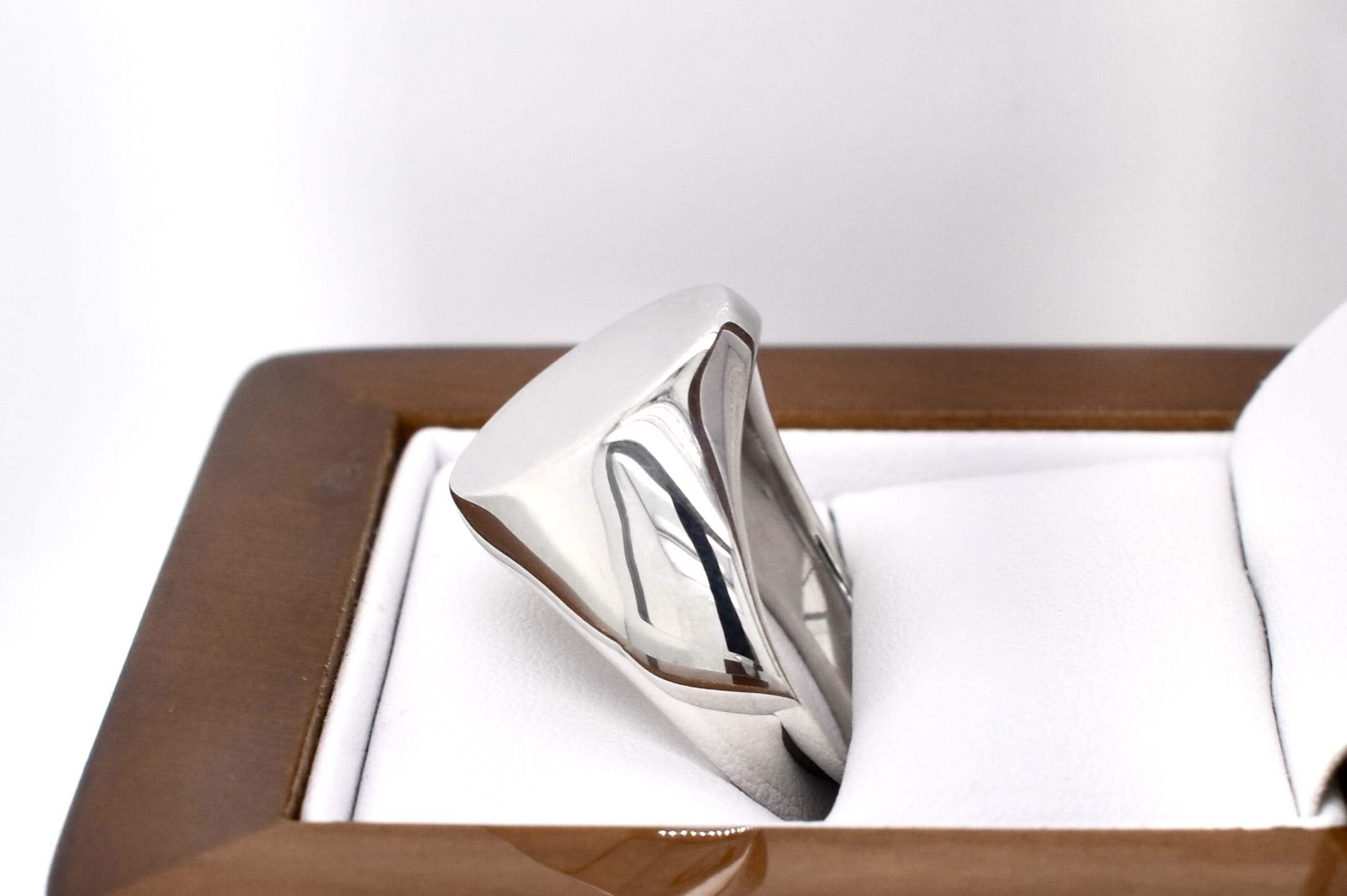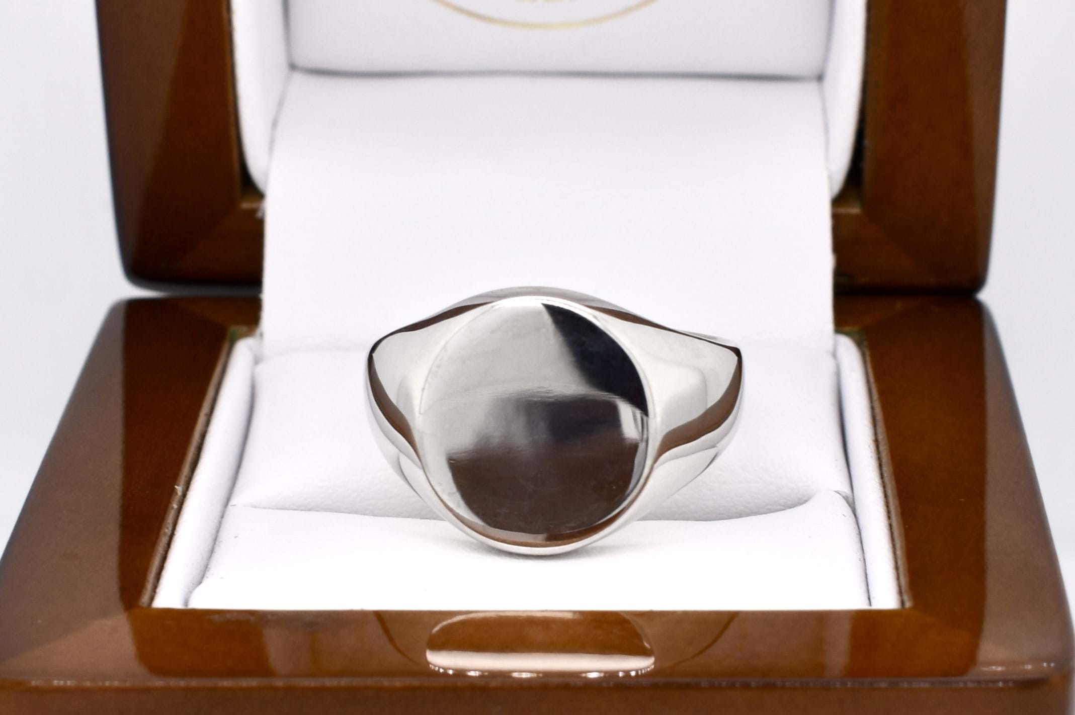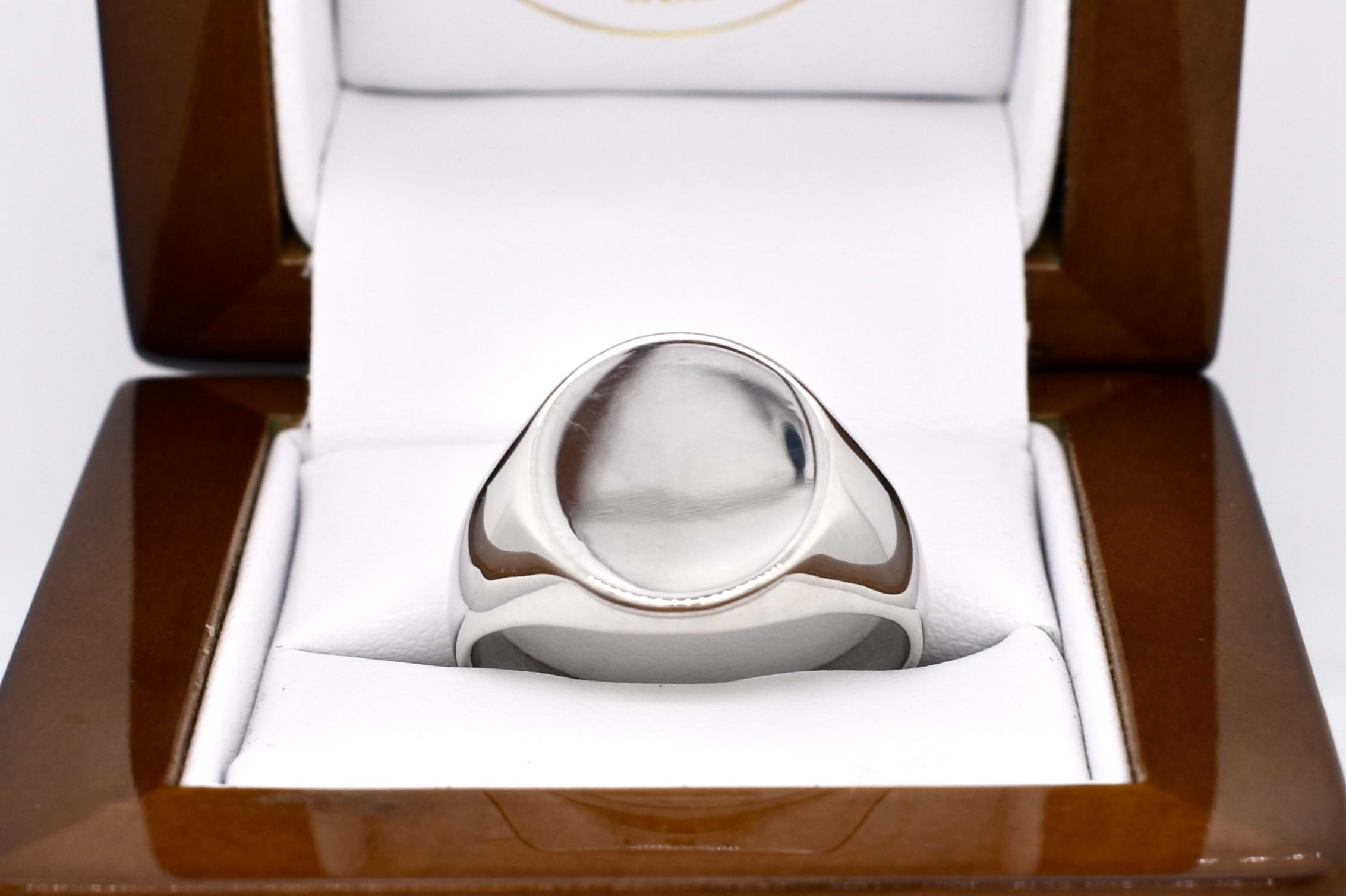 A classic solid signet ring, crafted in sterling silver, with a flat round top. Finger size V+.