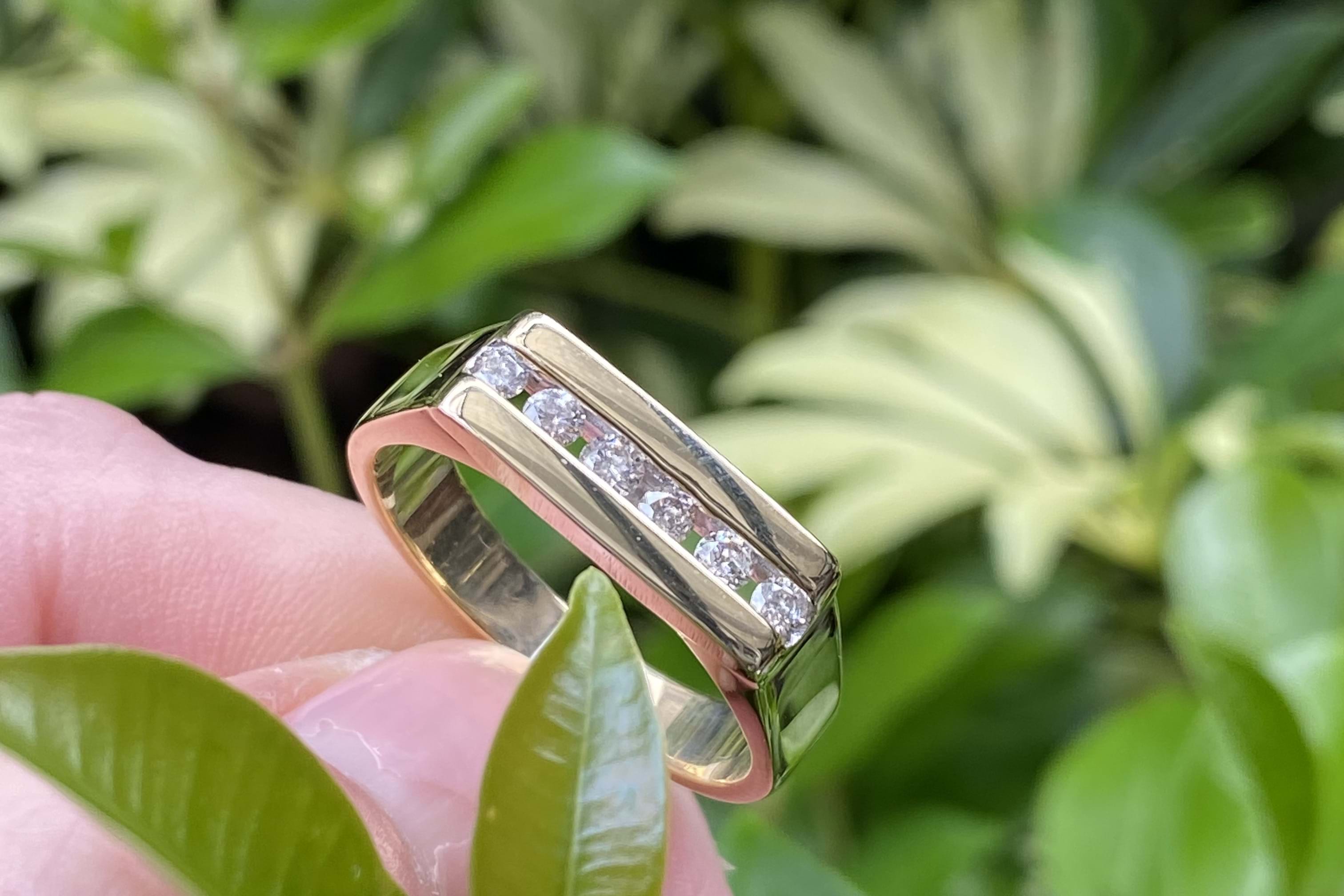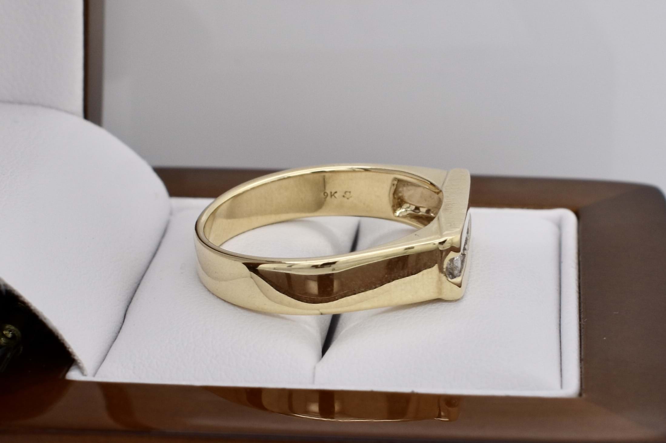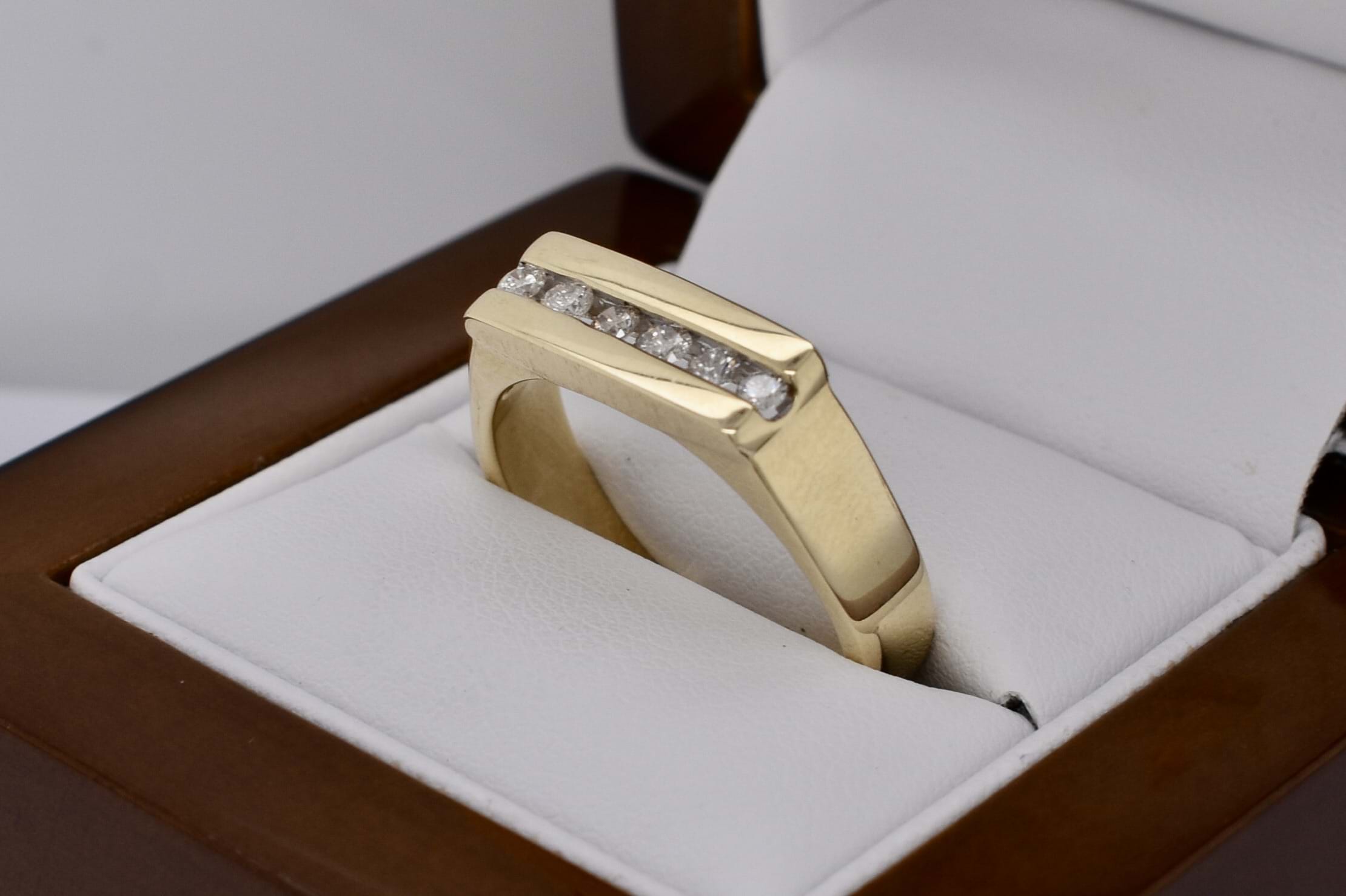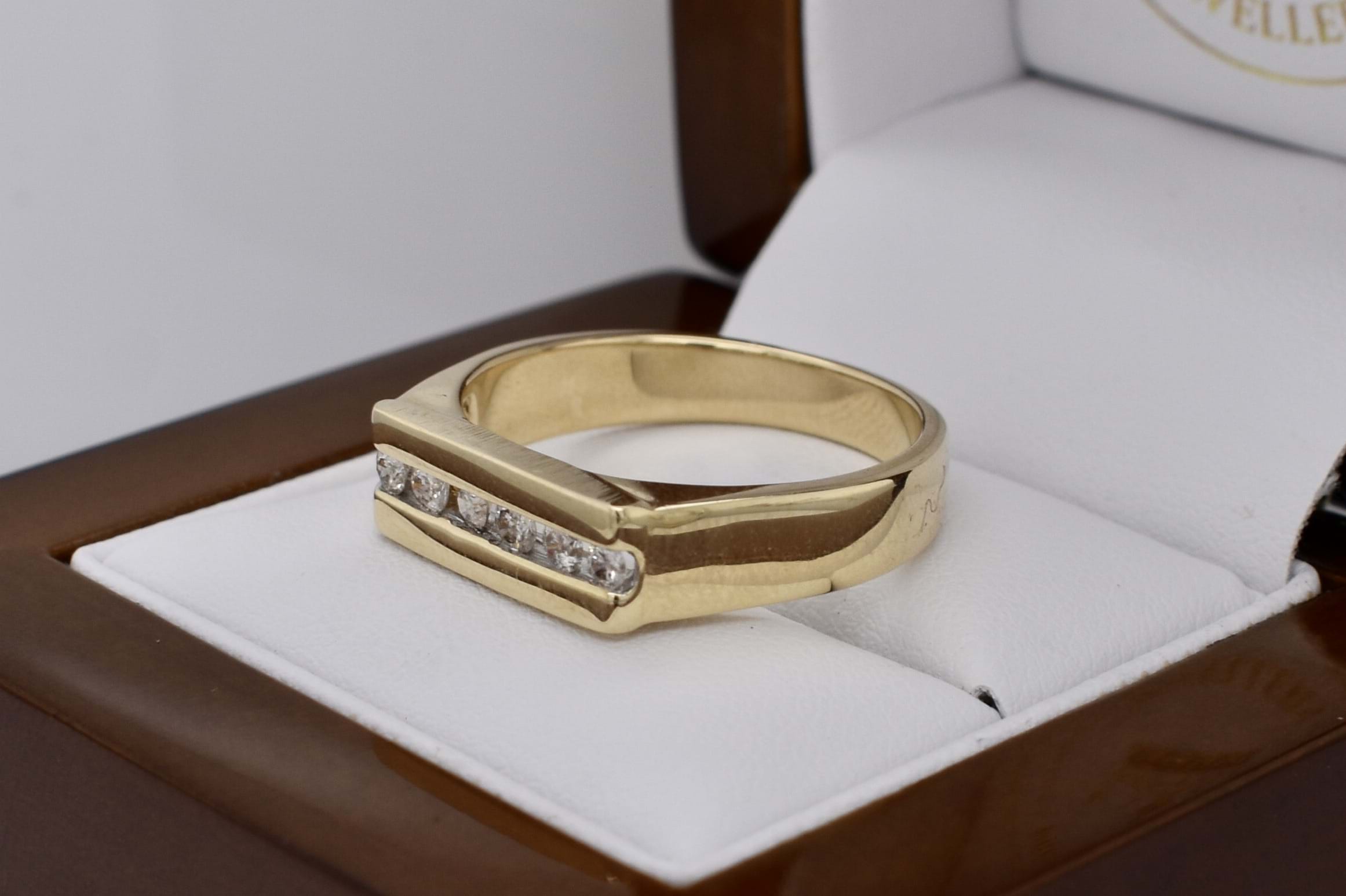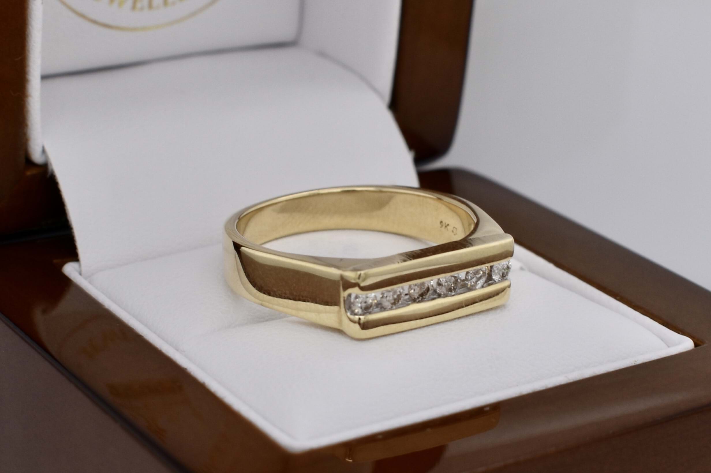Vintage 9ct yellow gold flat top mens ring with six channel set white stones (likely cubic zirconias) measuring approx 2.5mm each. Finger size W+