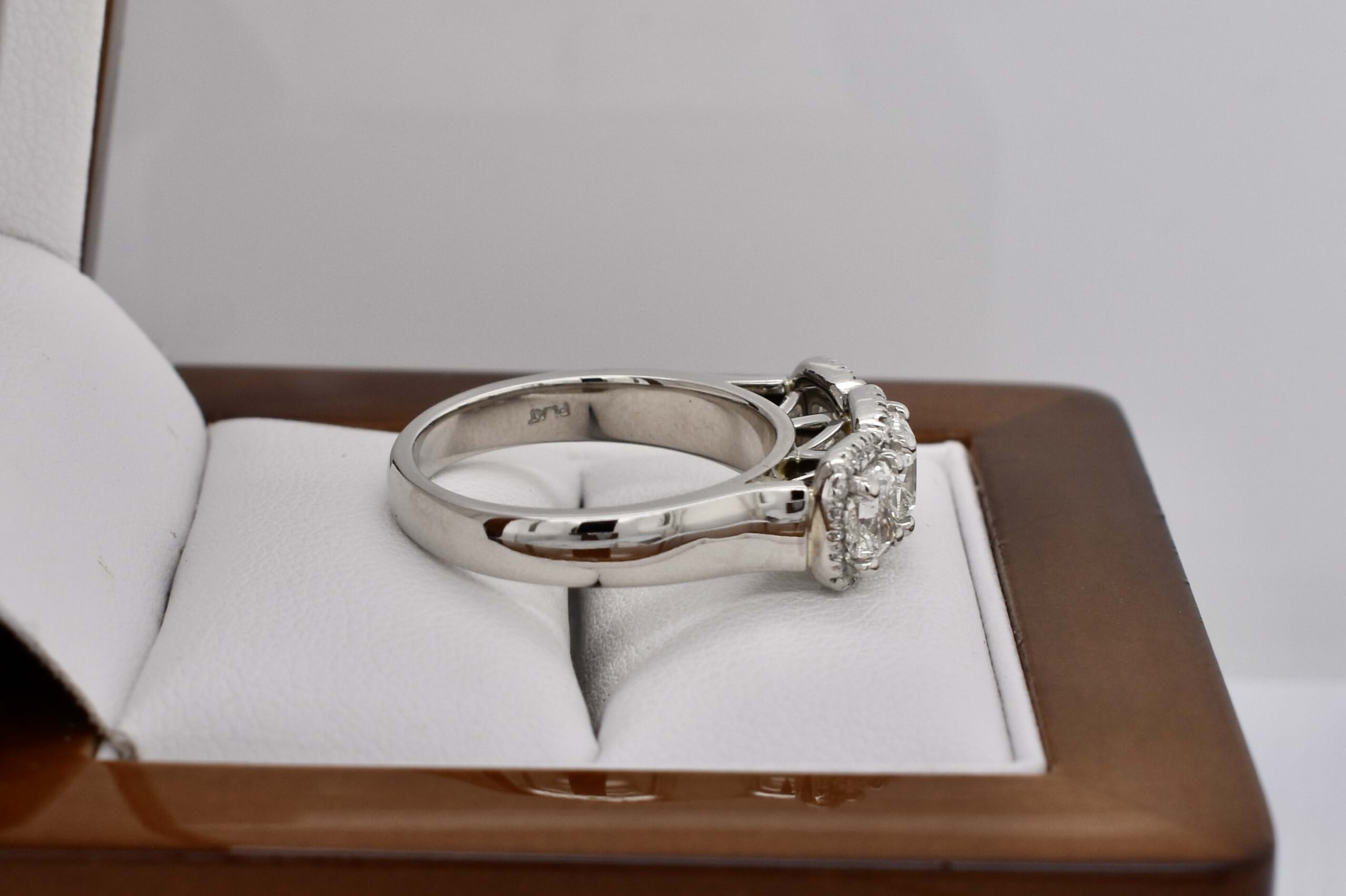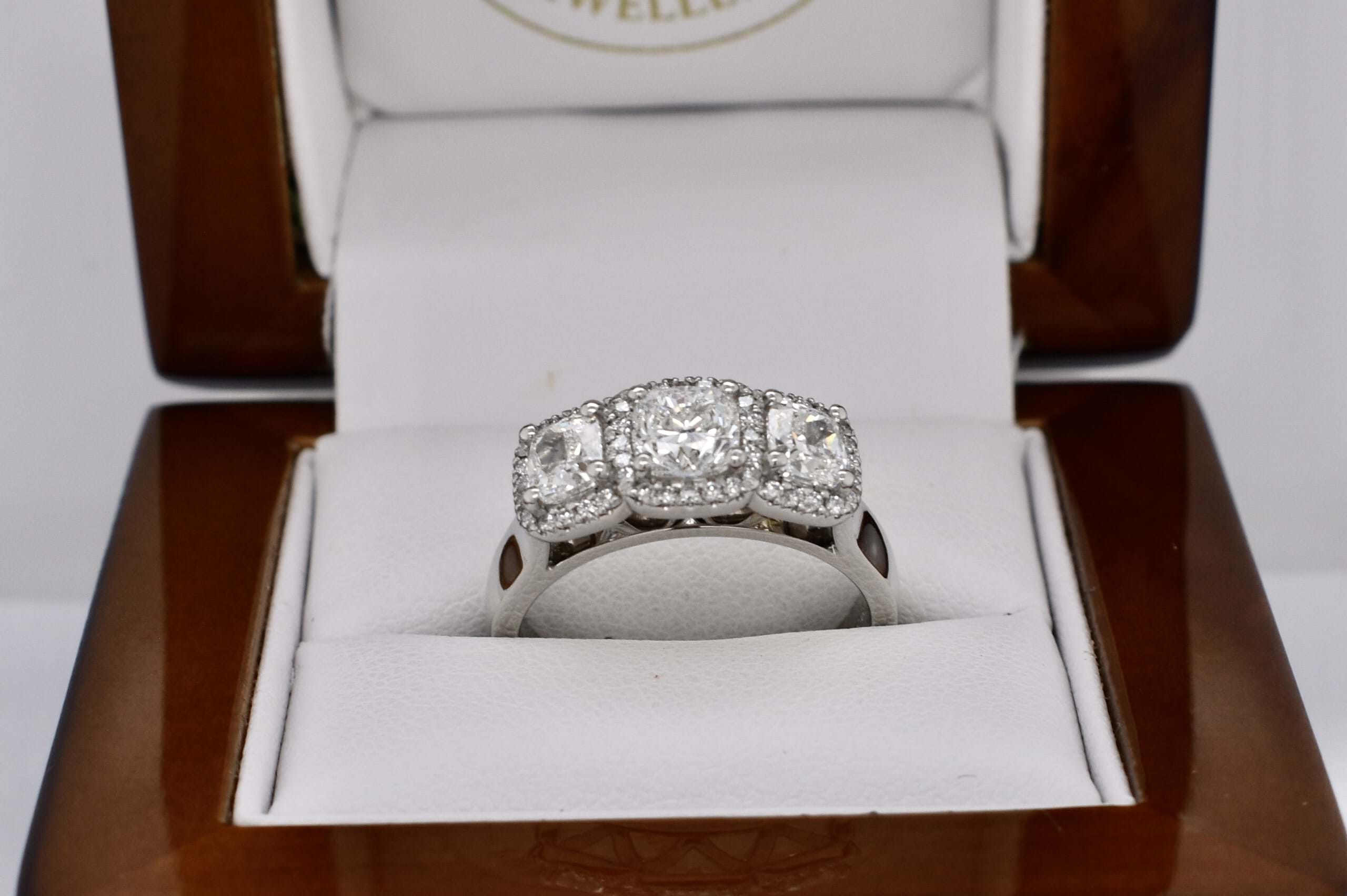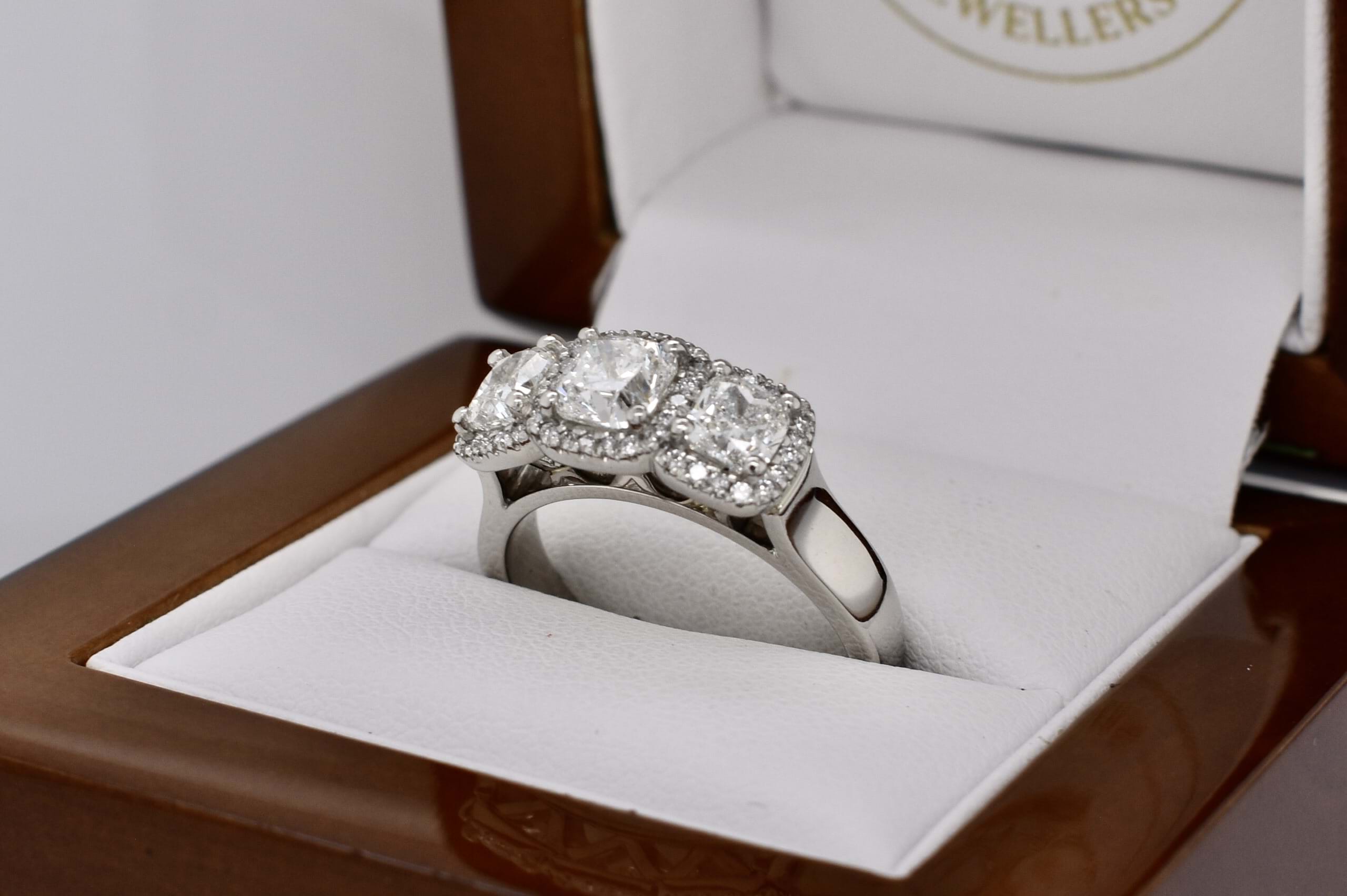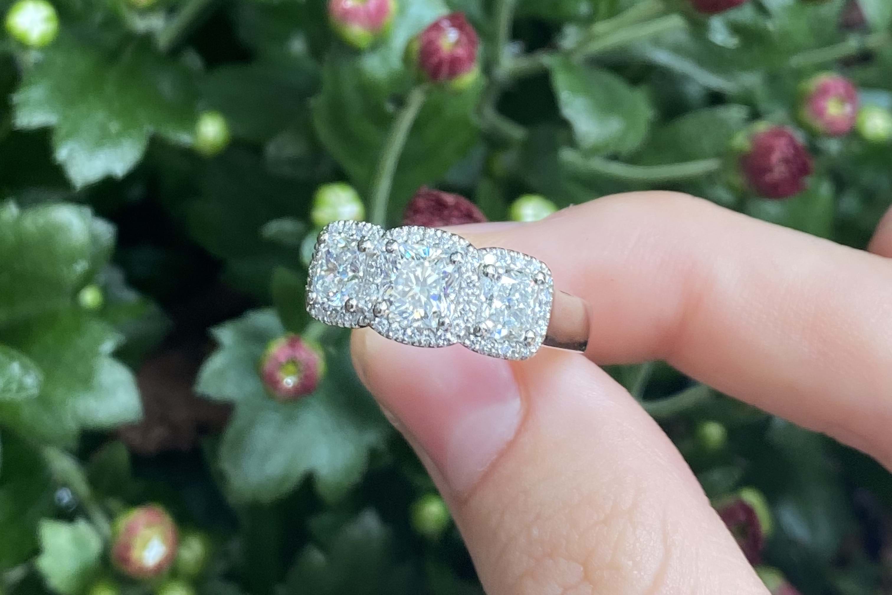 Stunning platinum trilogy ring, featuring a centre cushion cut diamond of 0.80ct G VS2, measuring 5.28x5.22x3.75mm, surrounded each side by a 0.50ct cushion cut diamond measuring 4.6x4.1-4.3mm G VS2. Each diamond has a halo of shimmering diamonds around it, with 46 round brilliant cuts totalling 0.23ct. Total diamond weight 2.03ct. Finished on a tapering half round 4.3-3mm band. Finger size N+. Independent Valuation Supplied.