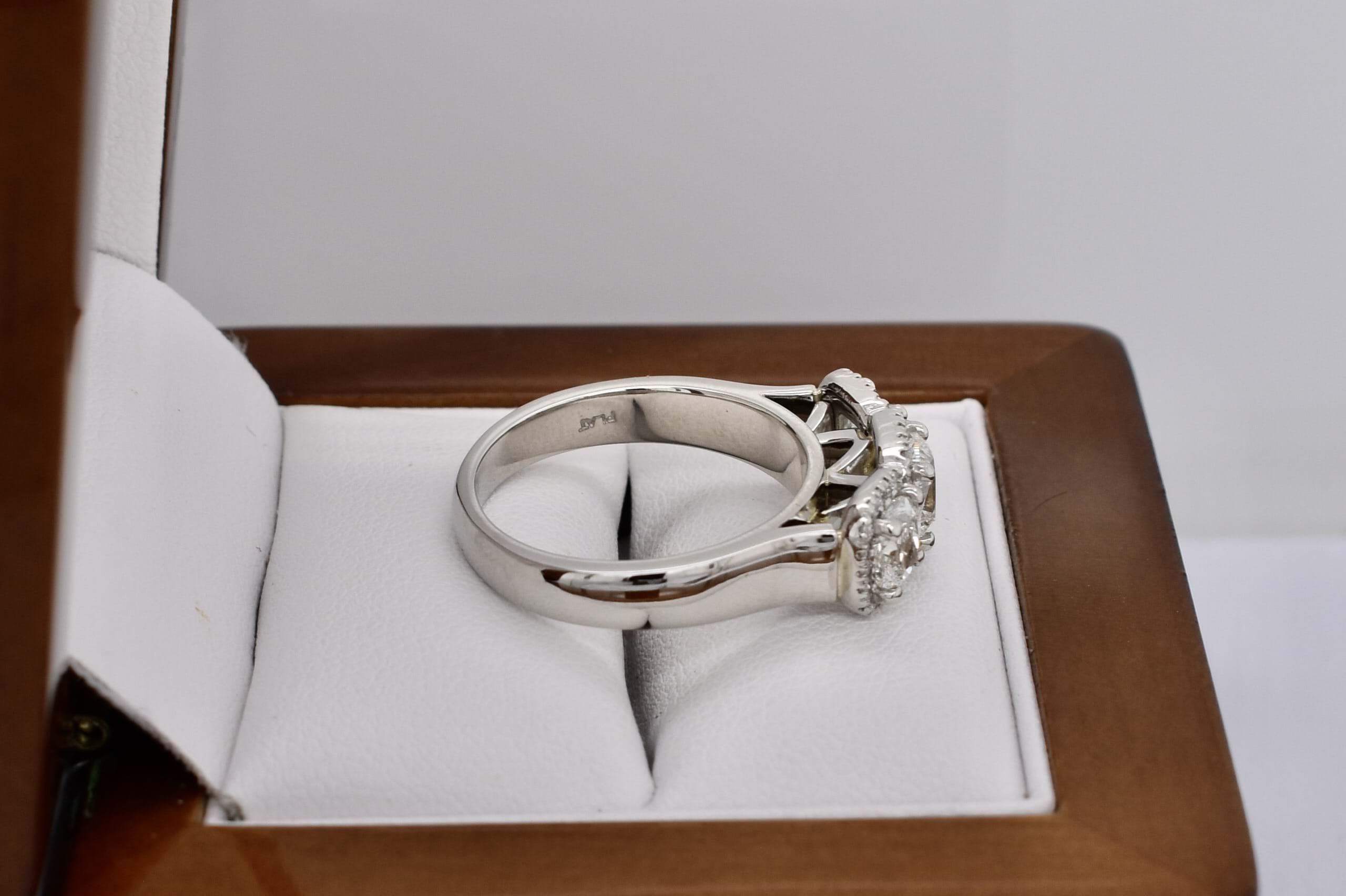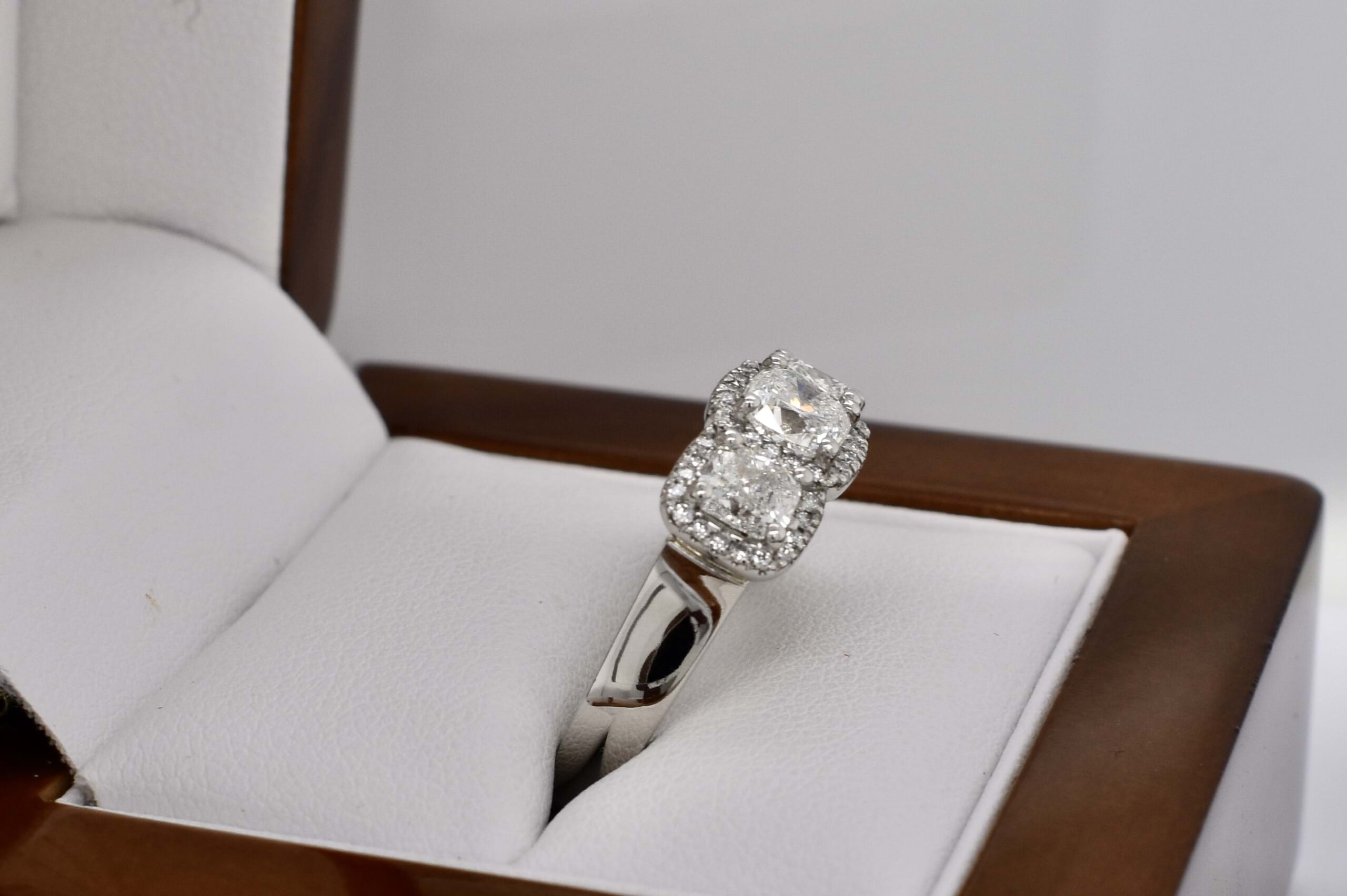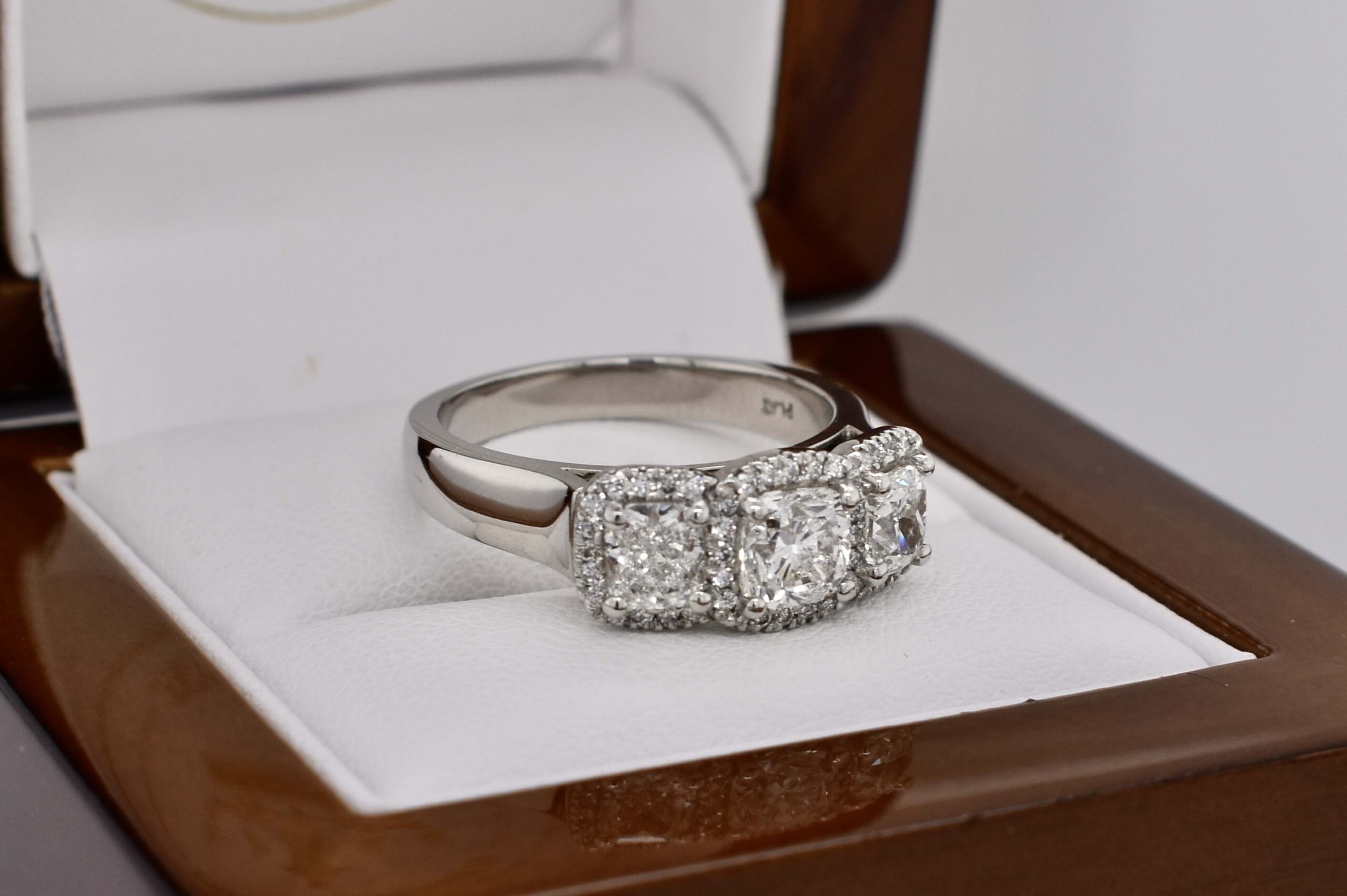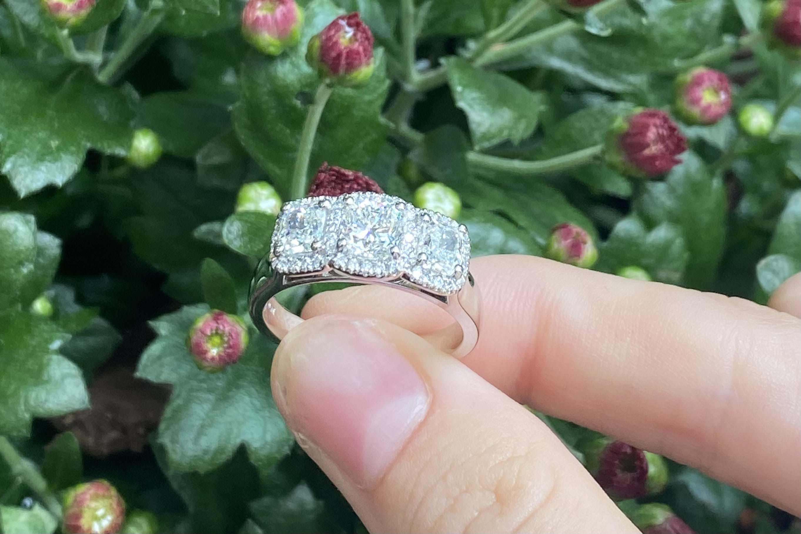 Stunning platinum trilogy ring, featuring a centre cushion cut diamond of 0.80ct G VS2, measuring 5.28x5.22x3.75mm, surrounded each side by a 0.50ct cushion cut diamond measuring 4.6x4.1-4.3mm G VS2. Each diamond has a halo of shimmering diamonds around it, with 46 round brilliant cuts totalling 0.23ct. Total diamond weight 2.03ct. Finished on a tapering half round 4.3-3mm band. Finger size N+. Independent Valuation Supplied.