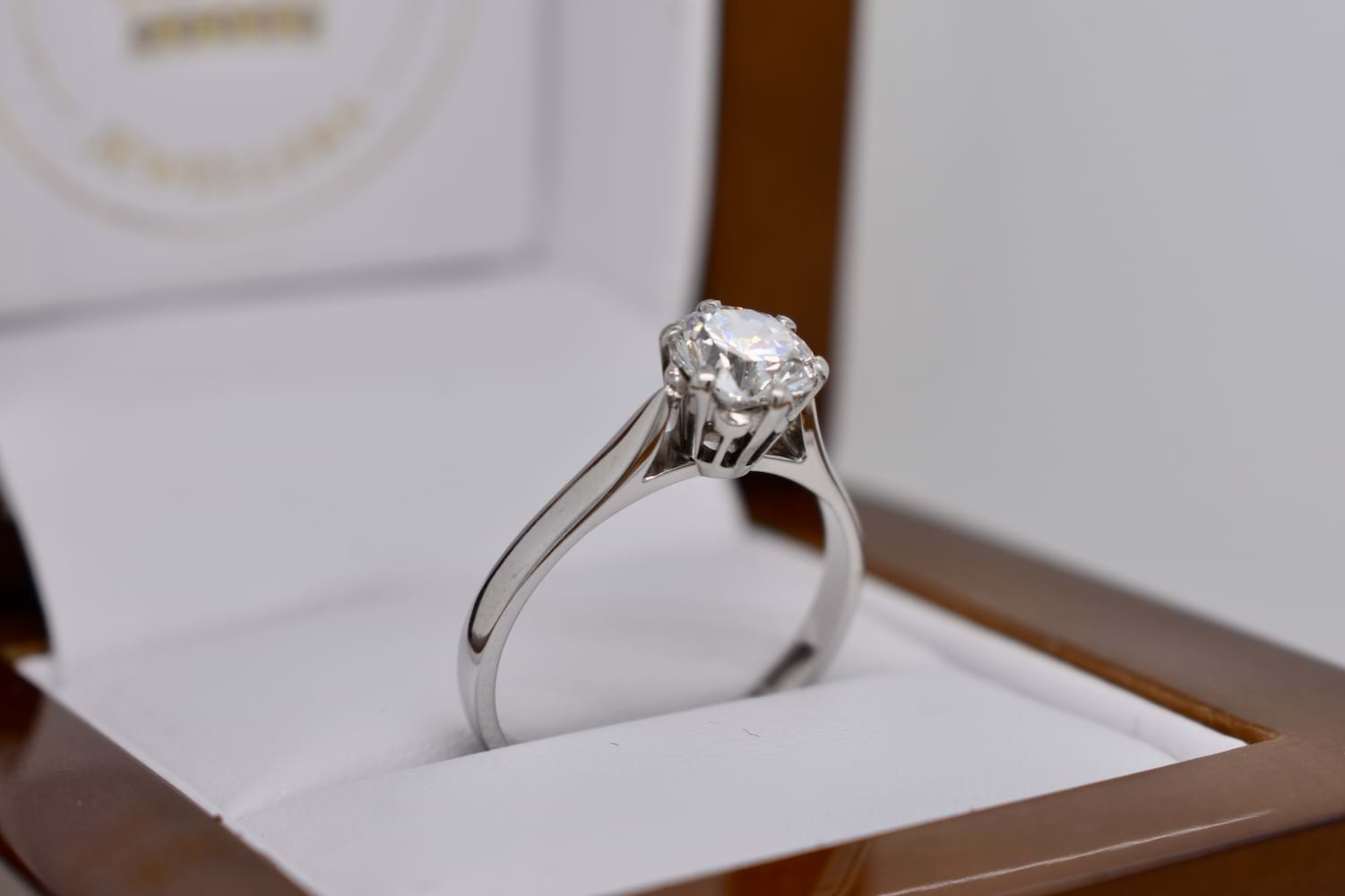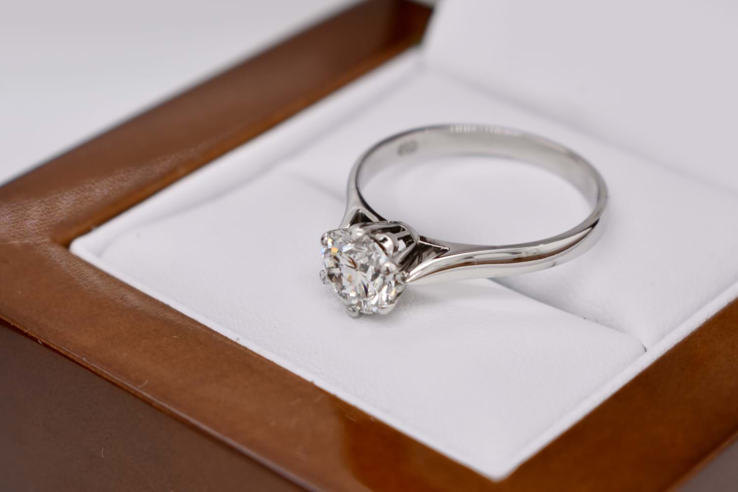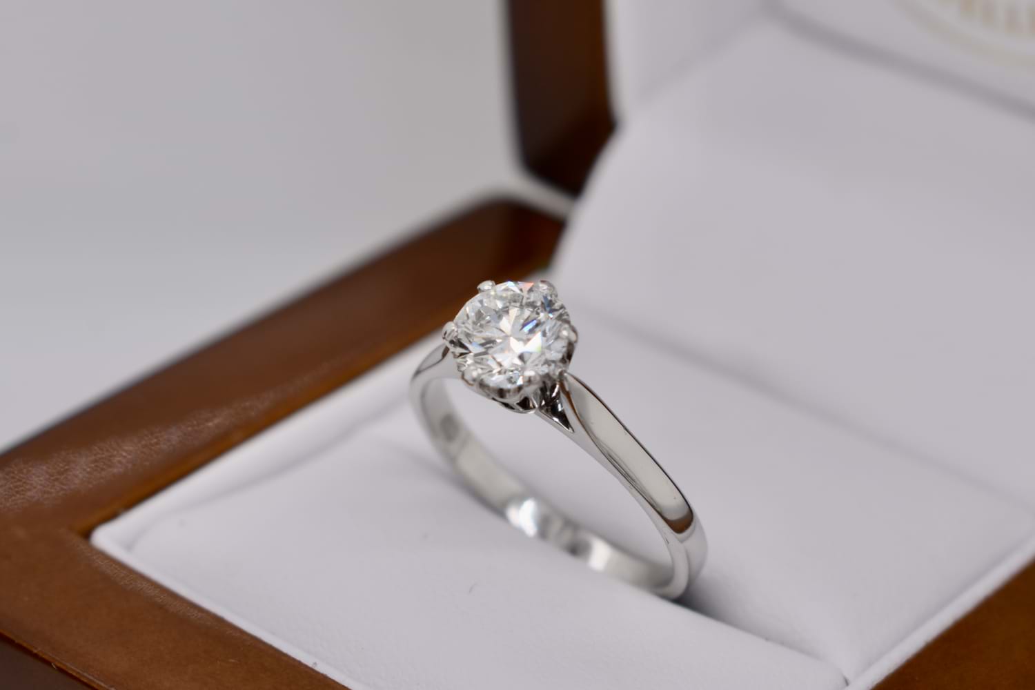 In exceptional condition this handmade 18ct white gold traditional 6 claw solitaire engagement ring features a shimmering round brilliant cut diamond. This high white diamond weighs 1.12cts (F/SI1) and the ring has been to our workshop to be cleaned, polished, rhodiumed plated and the setting has been checked. Finger size O+ Independent Valuation Supplied