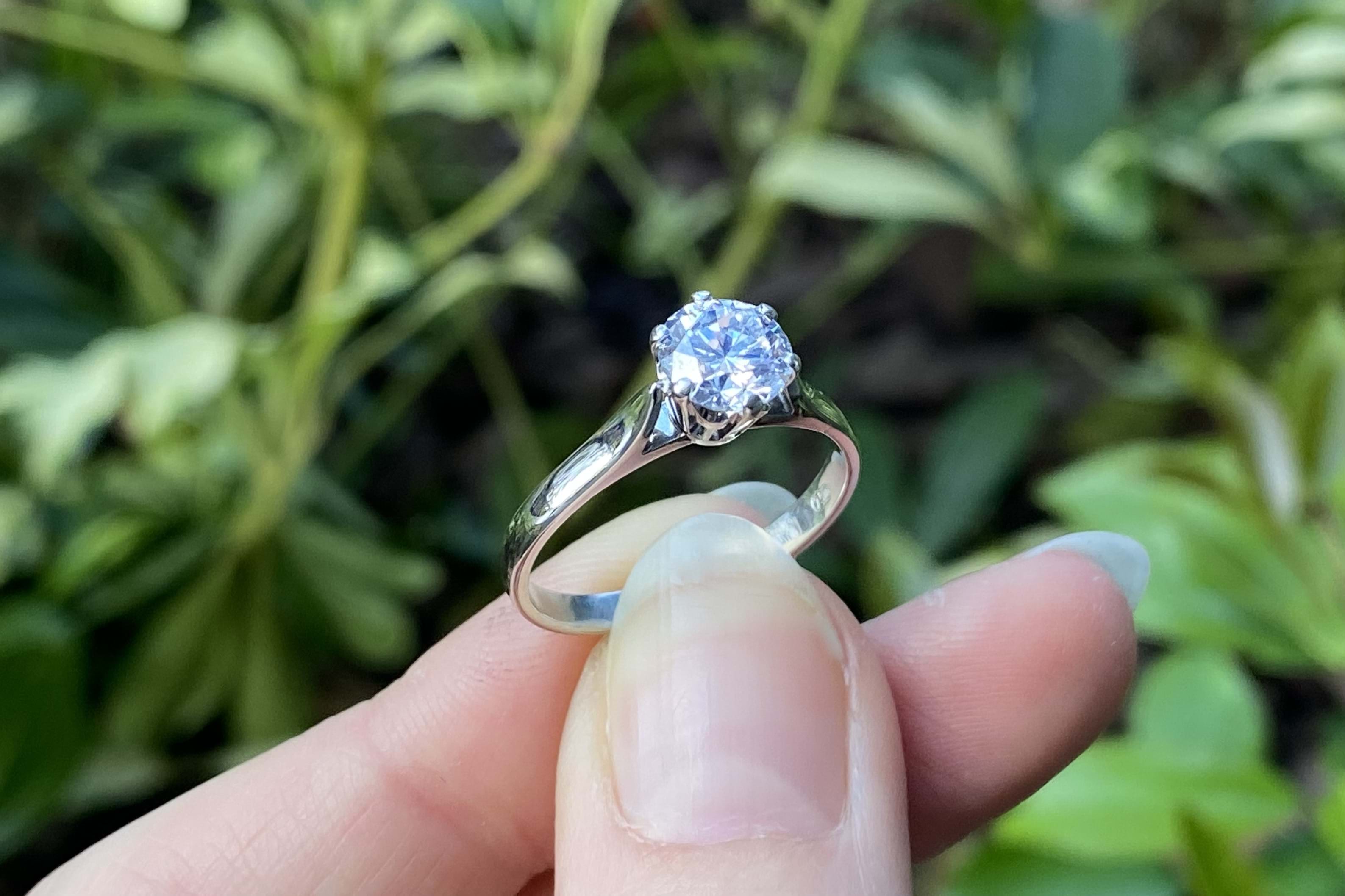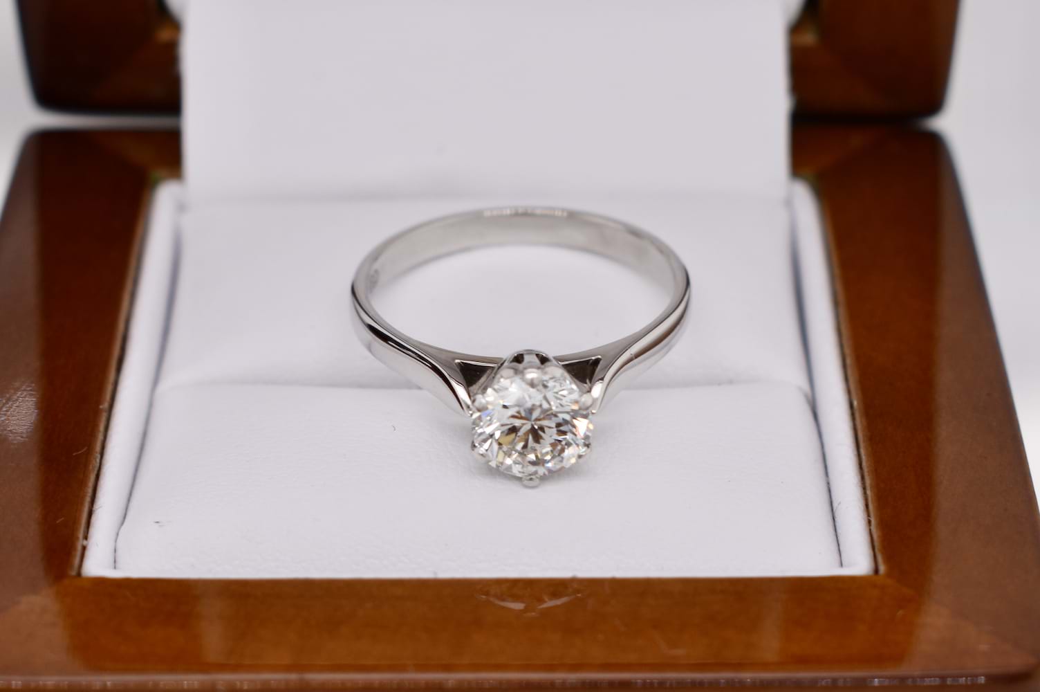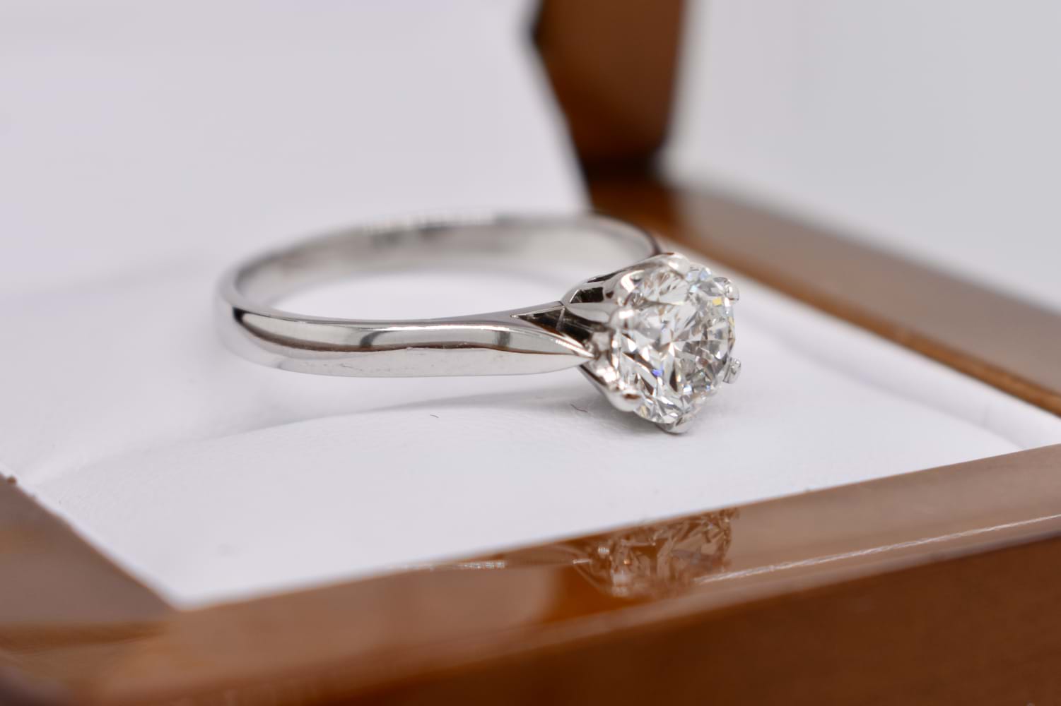 In exceptional condition this handmade 18ct white gold traditional 6 claw solitaire engagement ring features a shimmering round brilliant cut diamond. This high white diamond weighs 1.12cts (F/SI1) and the ring has been to our workshop to be cleaned, polished, rhodiumed plated and the setting has been checked. Finger size O+ Independent Valuation Supplied