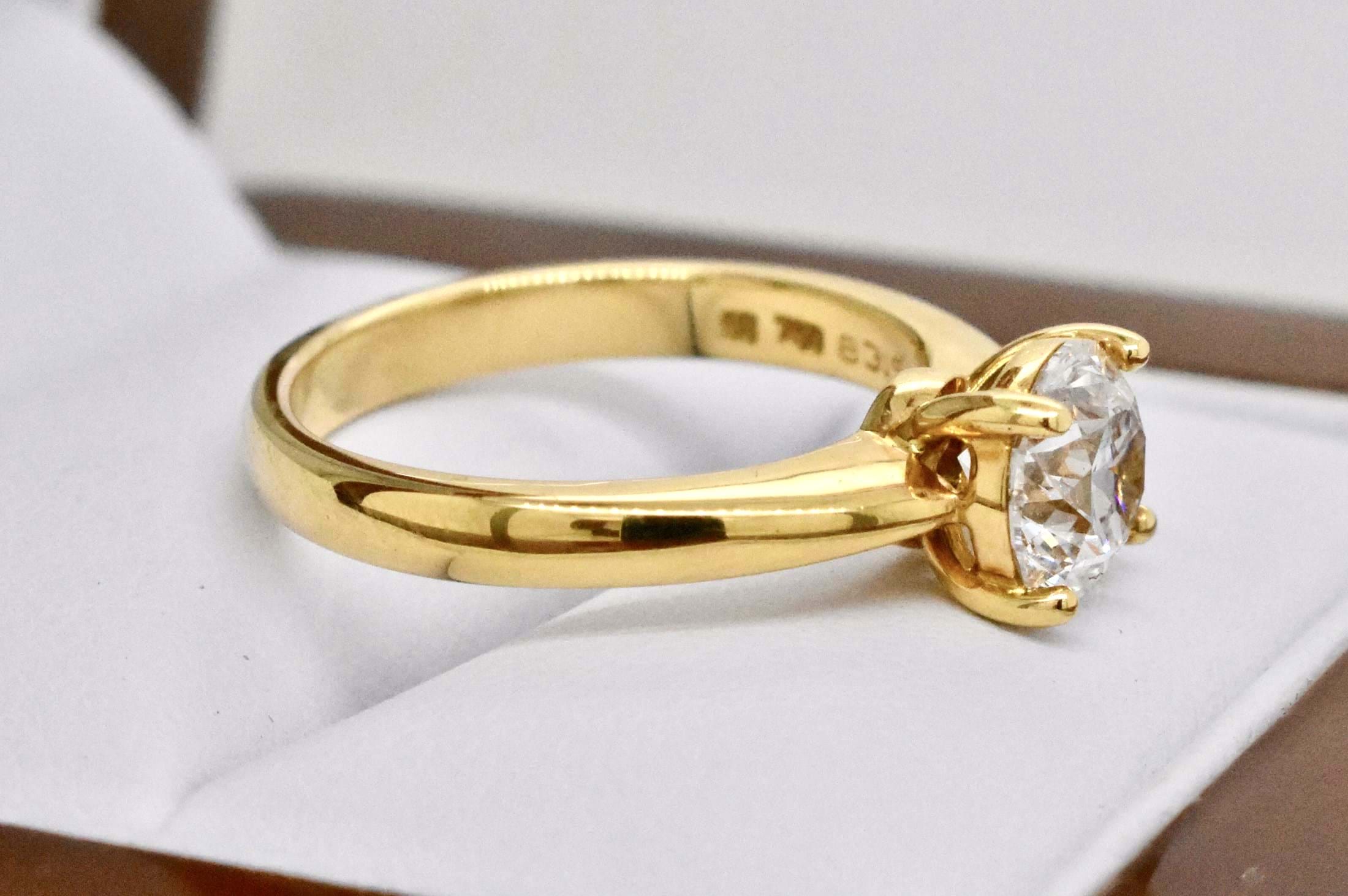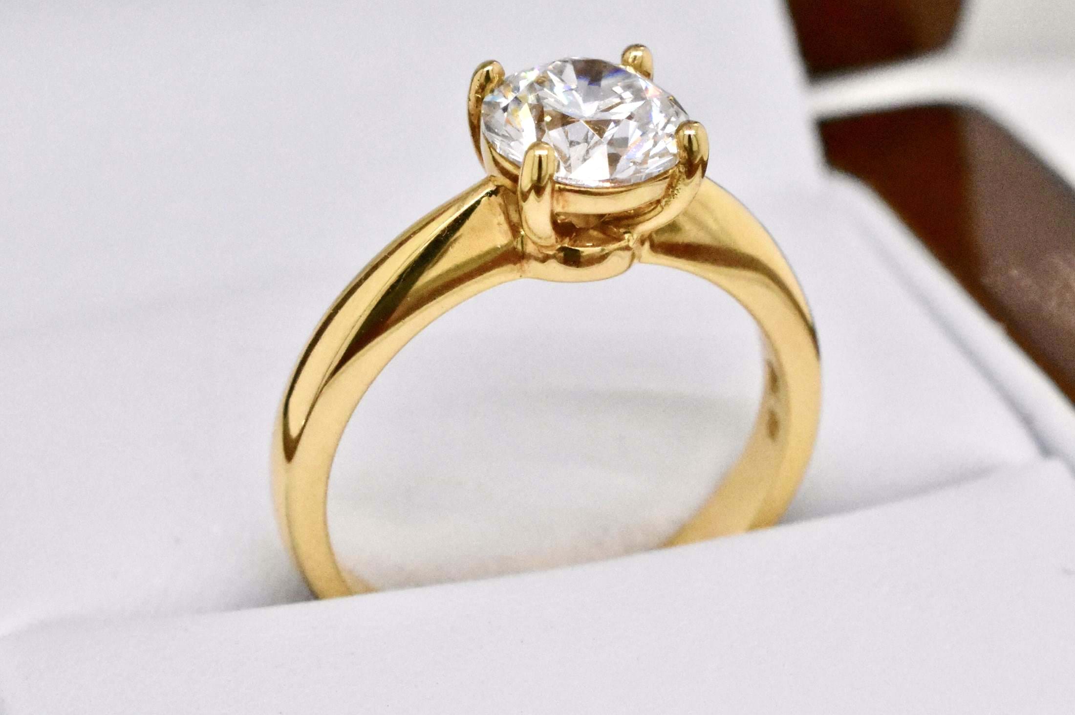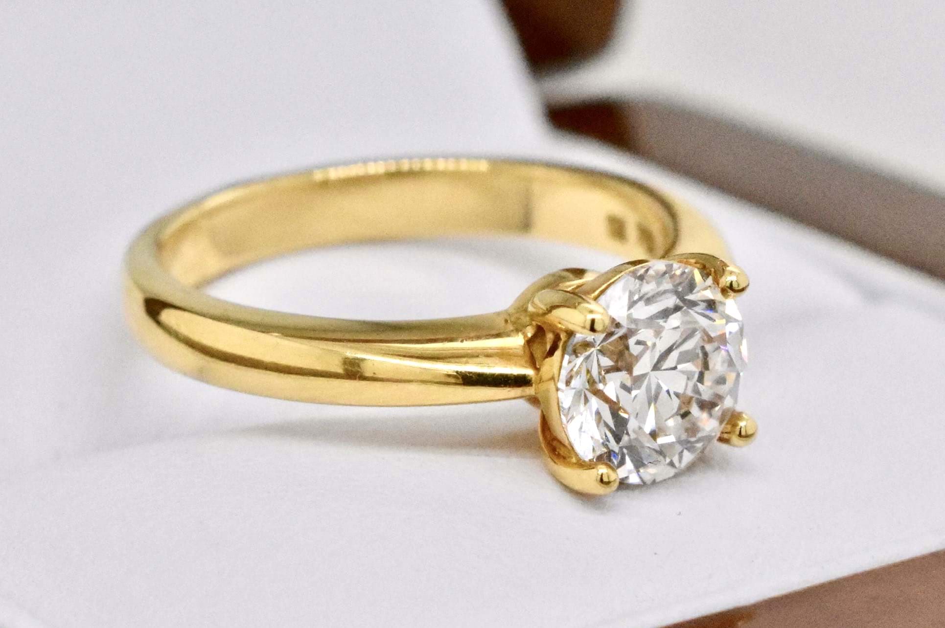 A stunning handmade 18ct yellow gold solitiare ring featuring an impressive white sparkler! This fantastic 1.54ct (E/VS2) diamond is laser inscribed and certified by the GIA and is of exceptional quality. Finger size N+ Independent Valuation Supplied