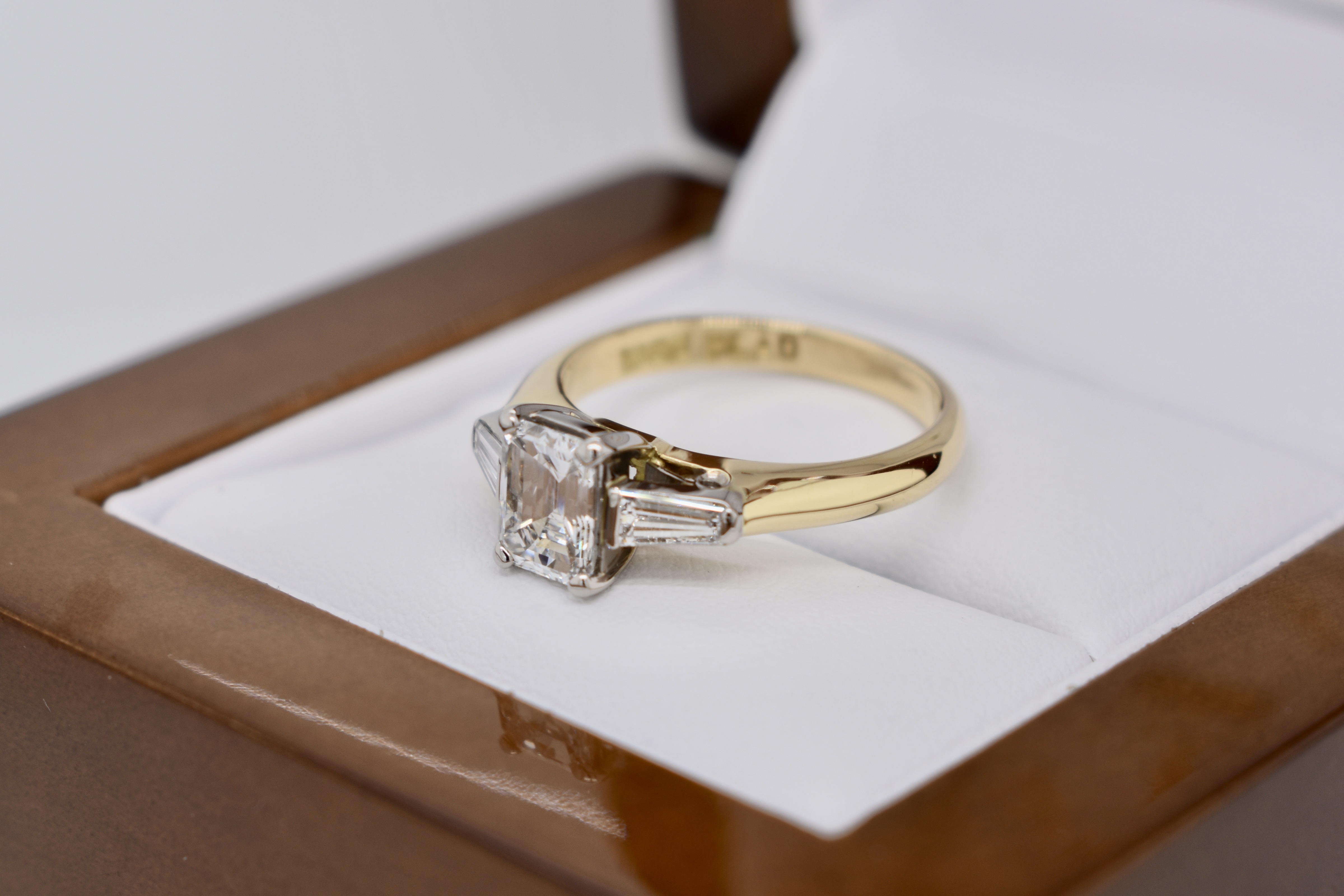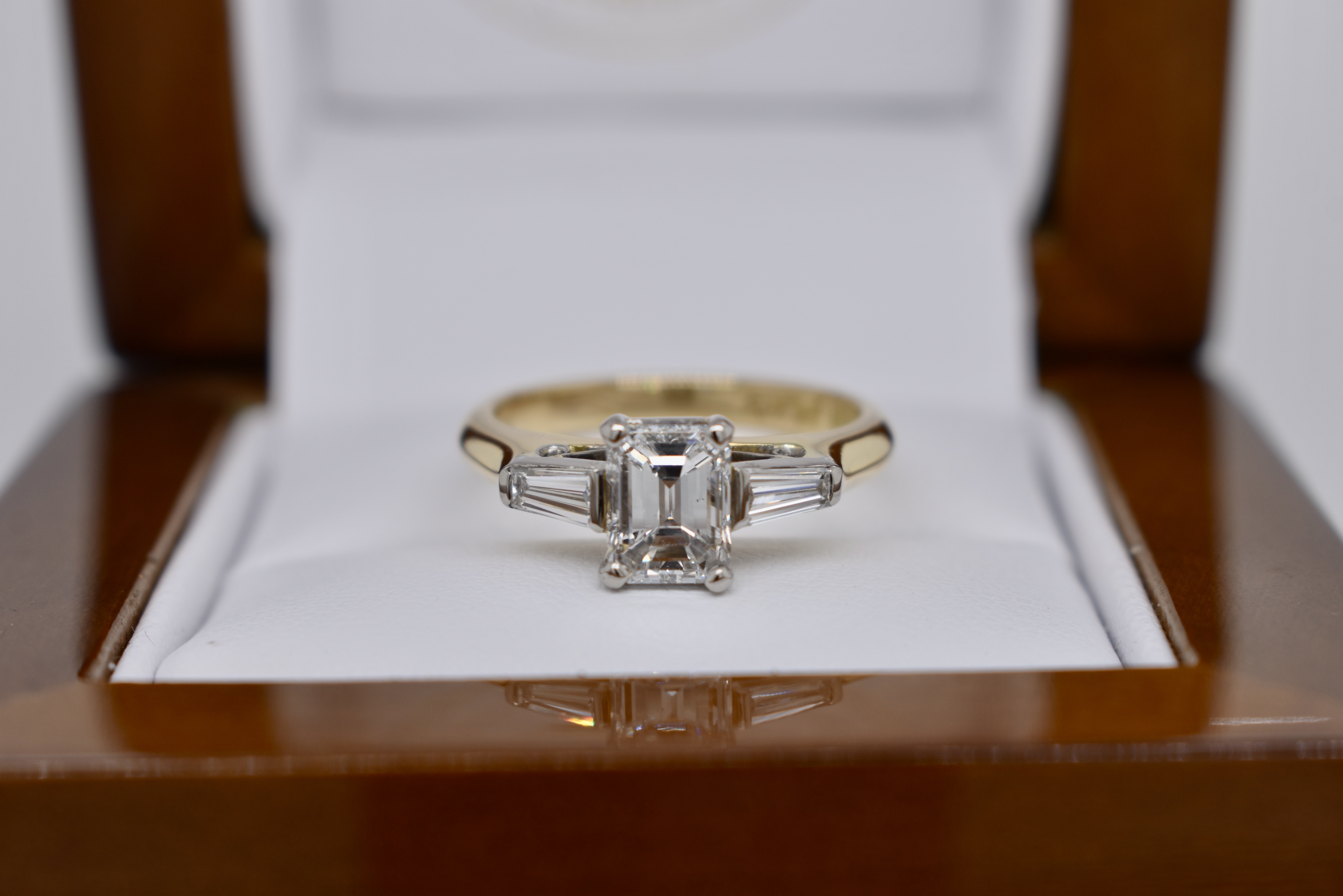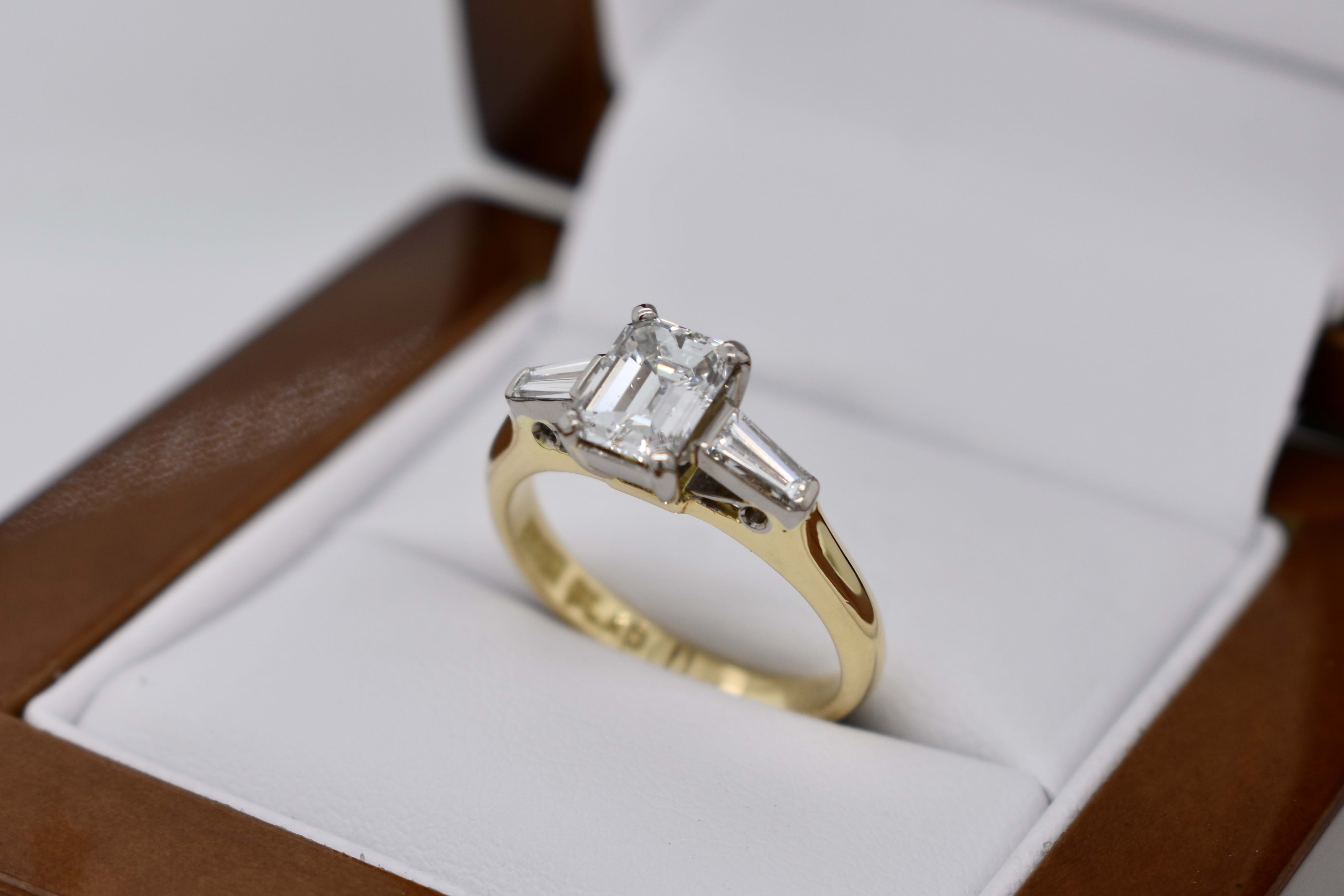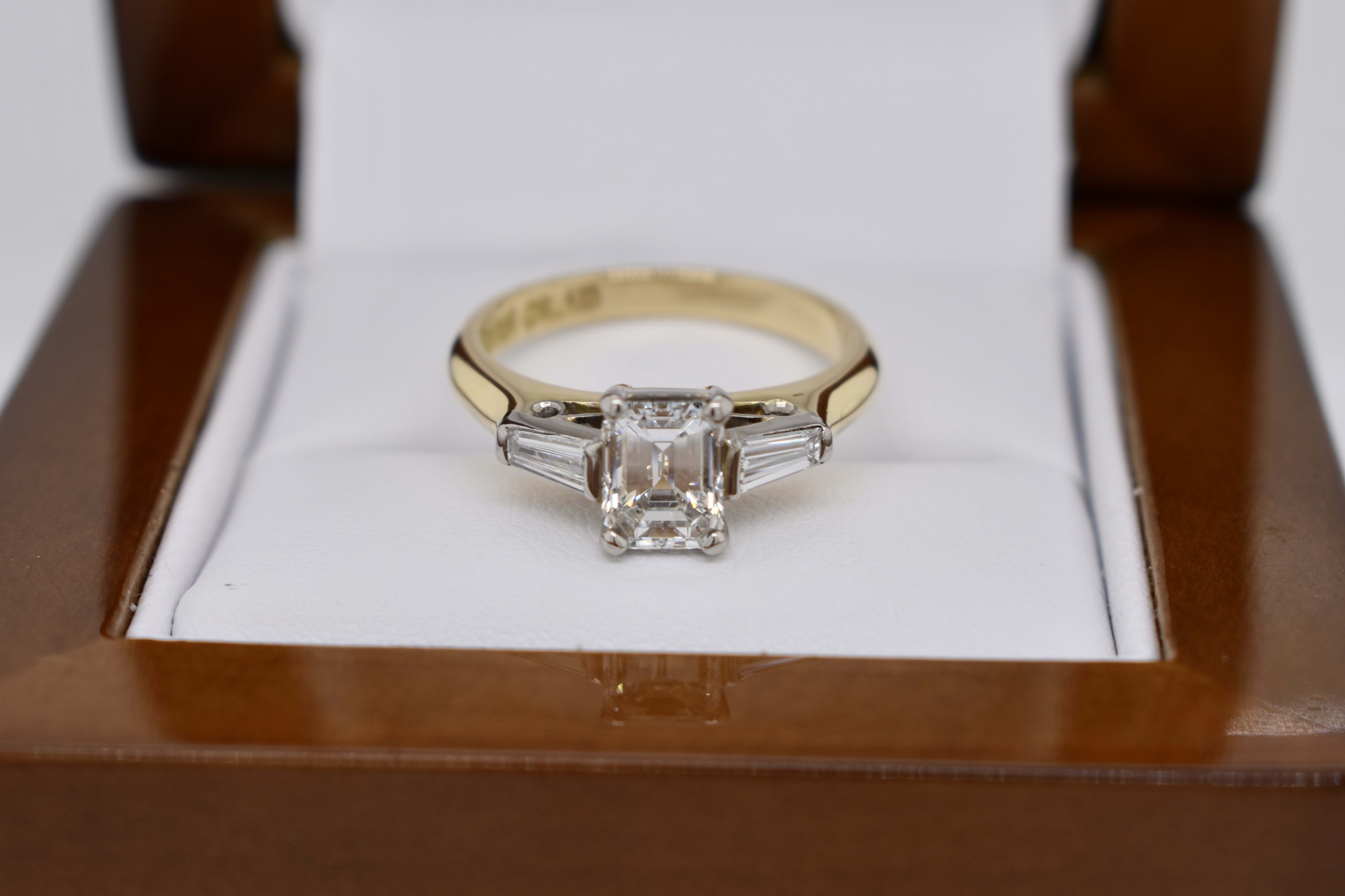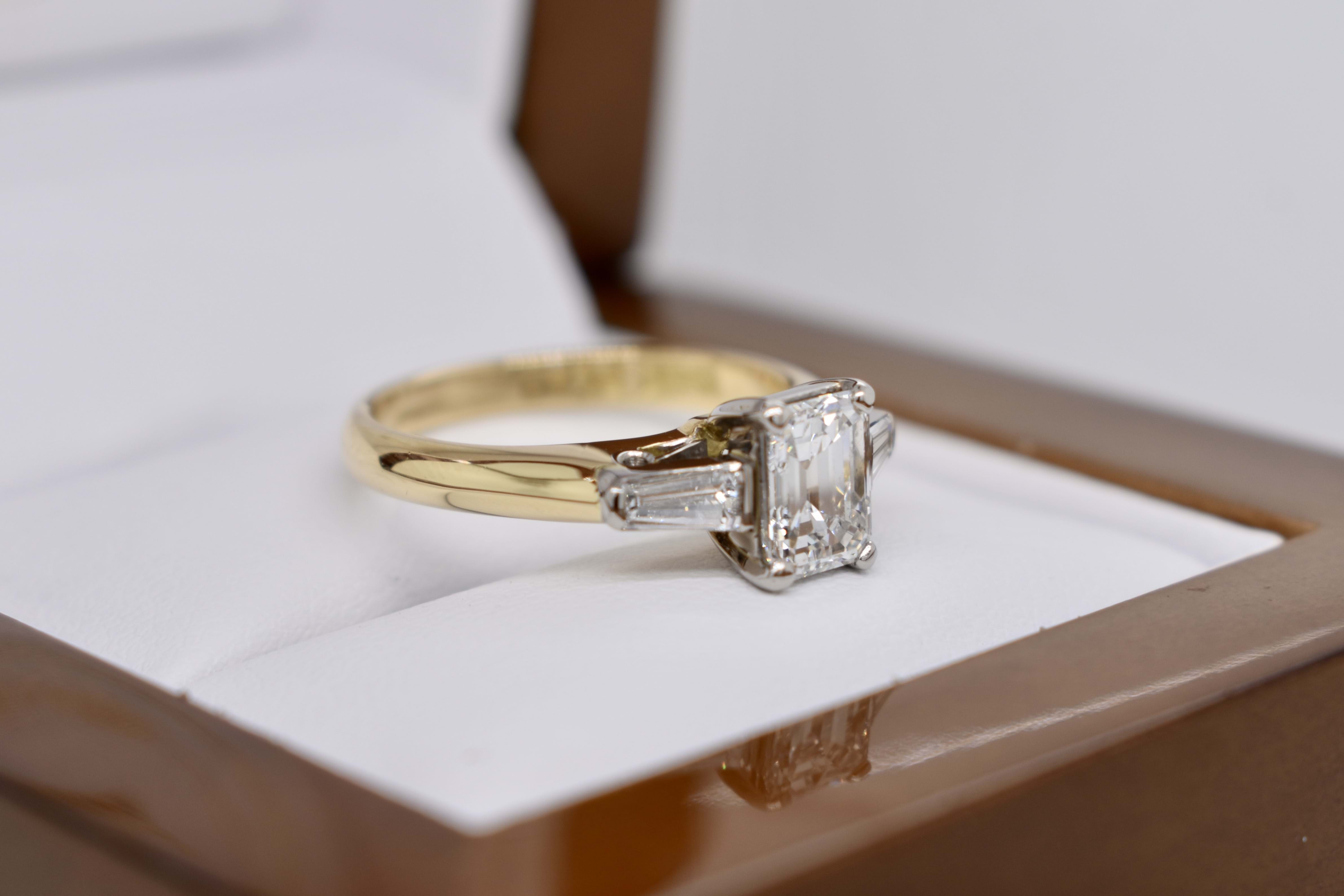 Stunning and scintillating 1.00ct emerald cut diamond (FVS2) four claw set in 18ct white gold and flanked by a shimmering tapered baguette diamond on each side end cap set with swept up 18ct yellow gold shoulders on a half round band. The two tapered baguettes are F colour and VS clarity and total 0.27cts. Finger size O. Independent Valuation Supplied