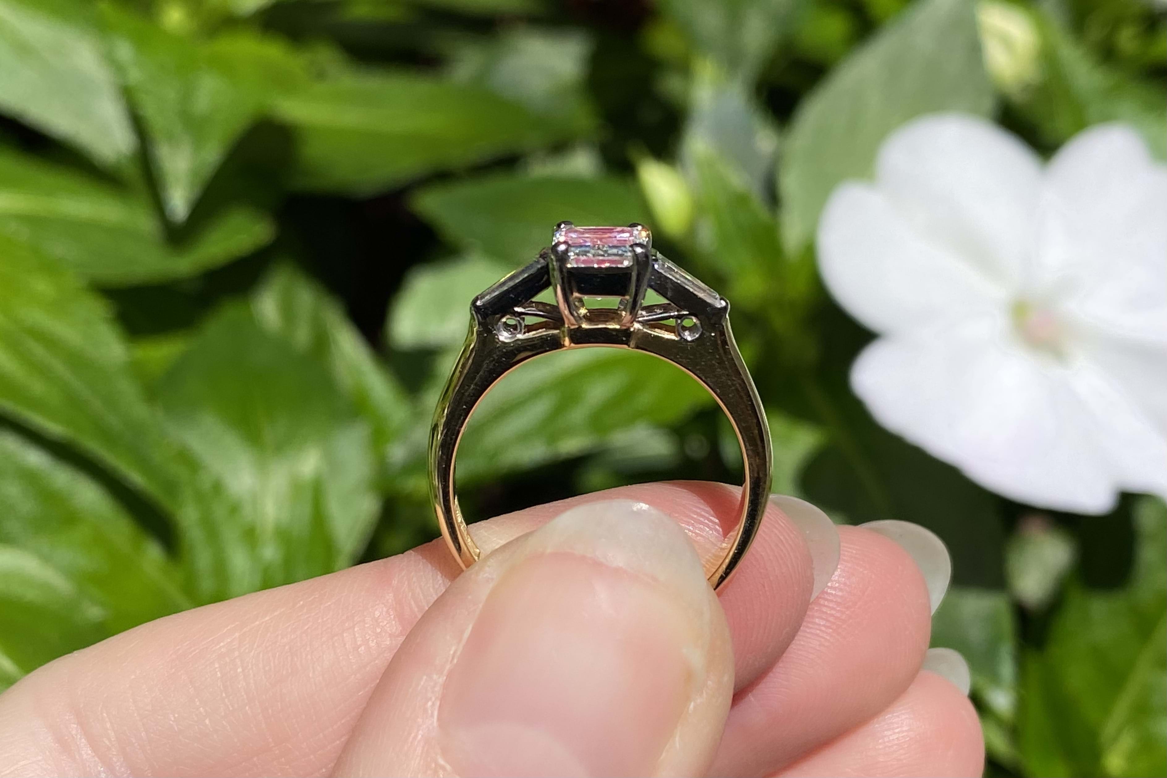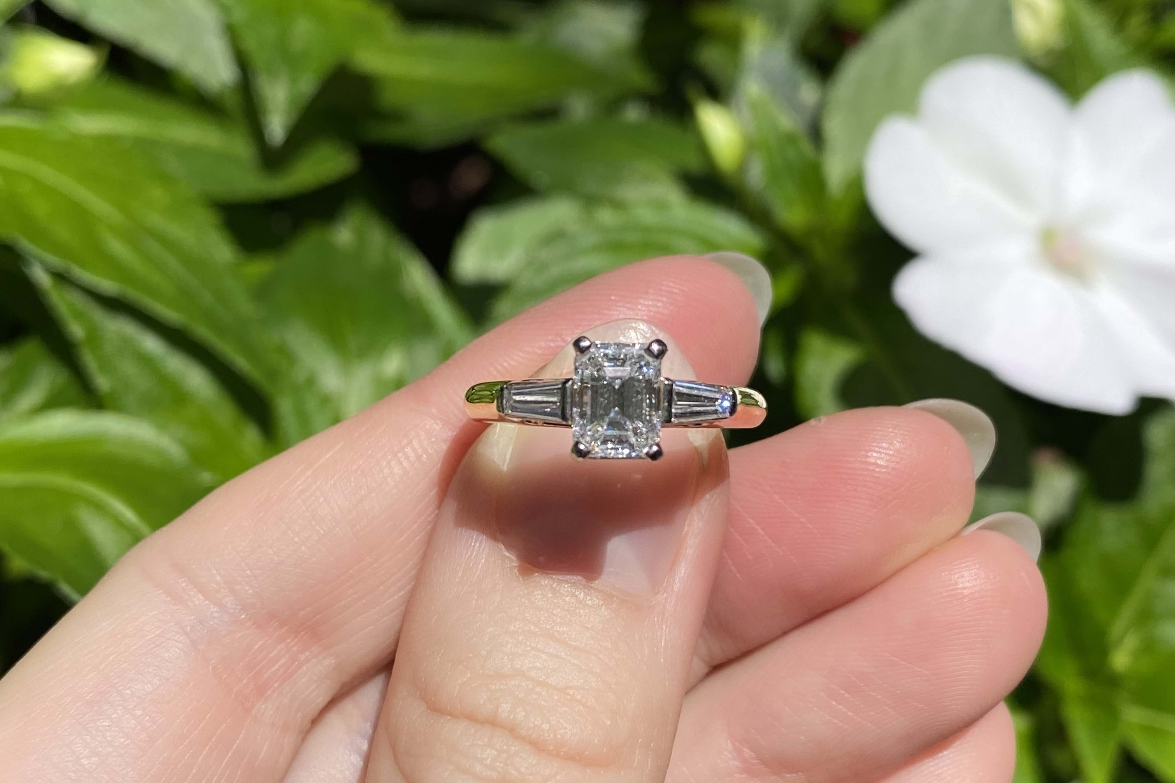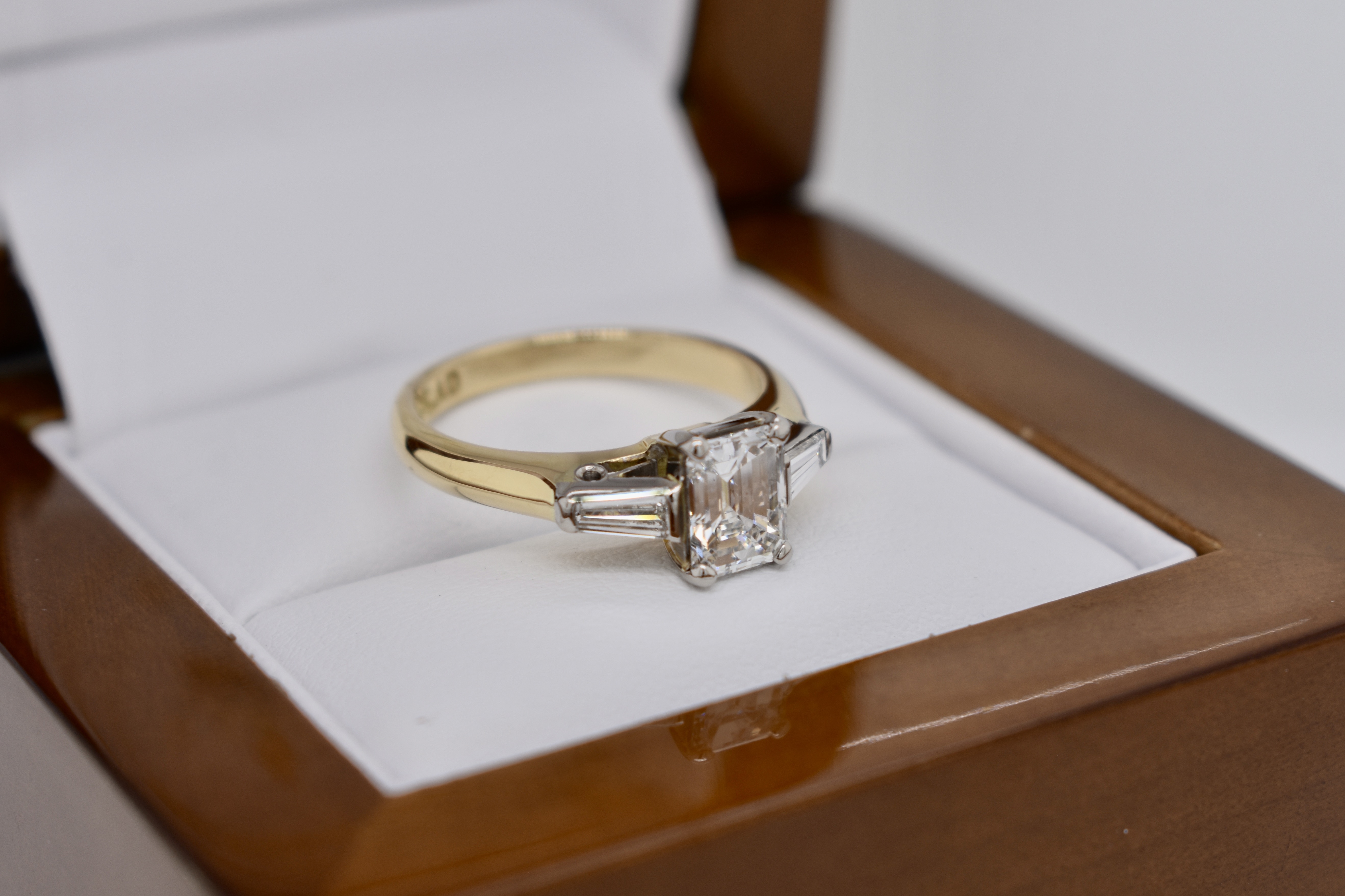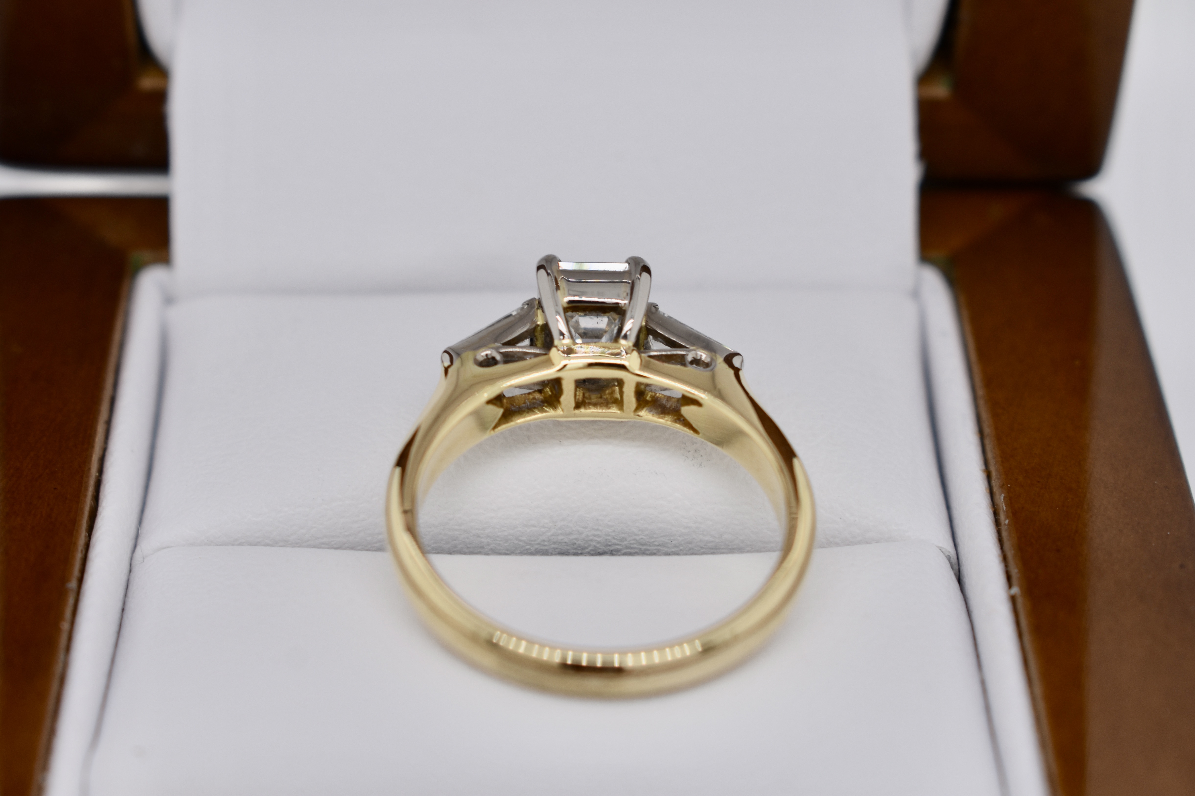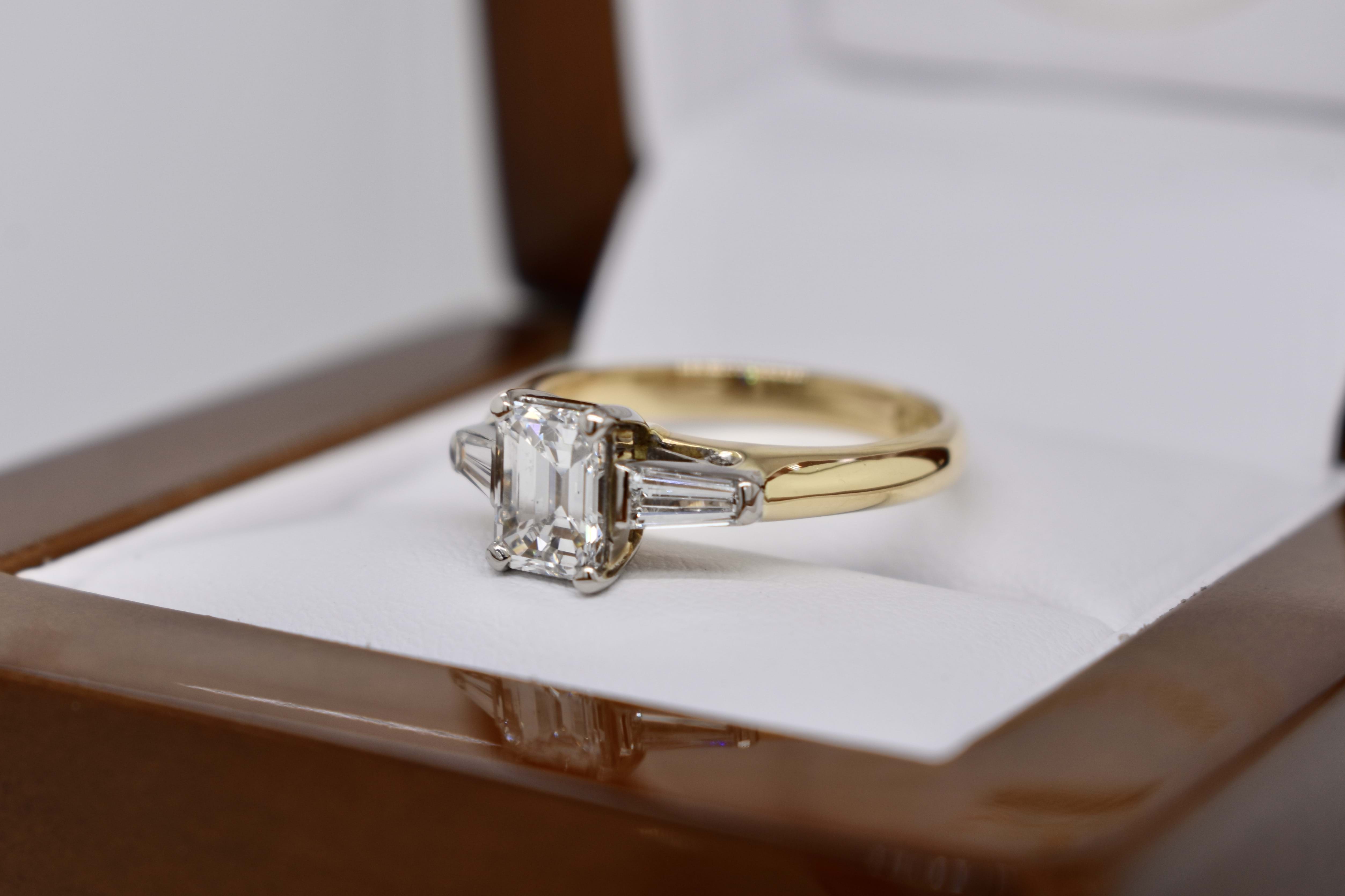 Stunning and scintillating 1.00ct emerald cut diamond (FVS2) four claw set in 18ct white gold and flanked by a shimmering tapered baguette diamond on each side end cap set with swept up 18ct yellow gold shoulders on a half round band. The two tapered baguettes are F colour and VS clarity and total 0.27cts. Finger size O. Independent Valuation Supplied