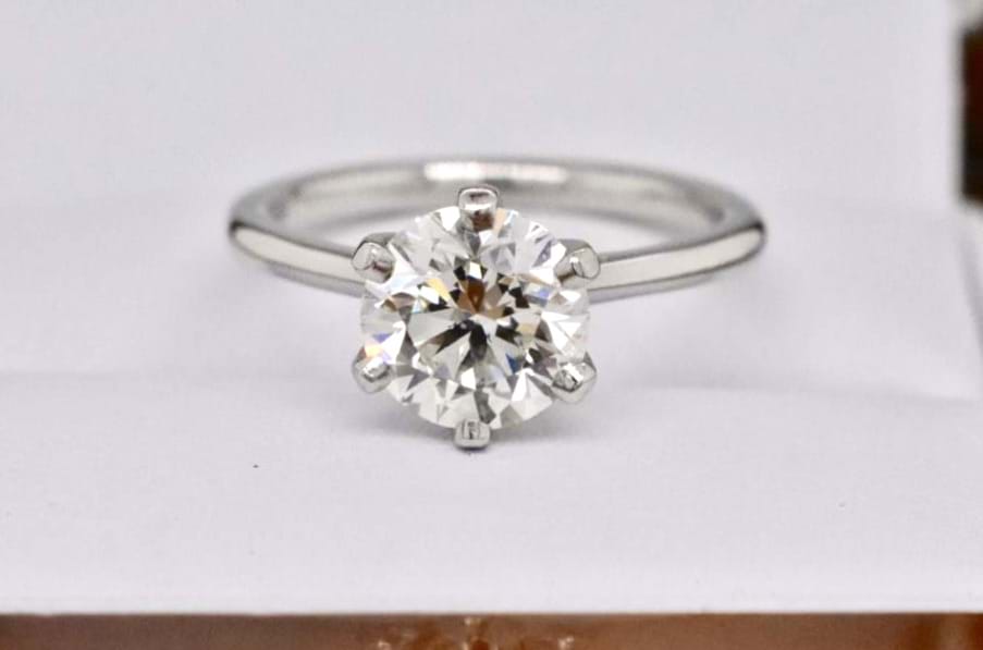 The epitome of elegance, this gorgeous platinum solitaire engagement ring features a beautifully feminine six claw basket on a fine knife edge band. With a scintilating 1.51ct round brilliant cut diamond, with a colour F and clarity VS2 grading from the GIA, this engagement ring is stunning when pair with a plain or diamond wedding band. Size J. Independent Valuation & GIA Cert Supplied