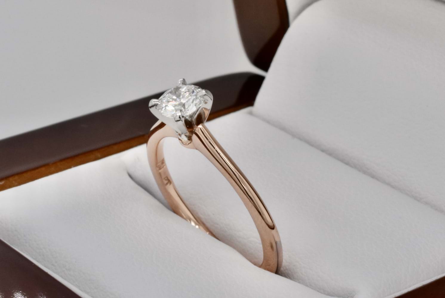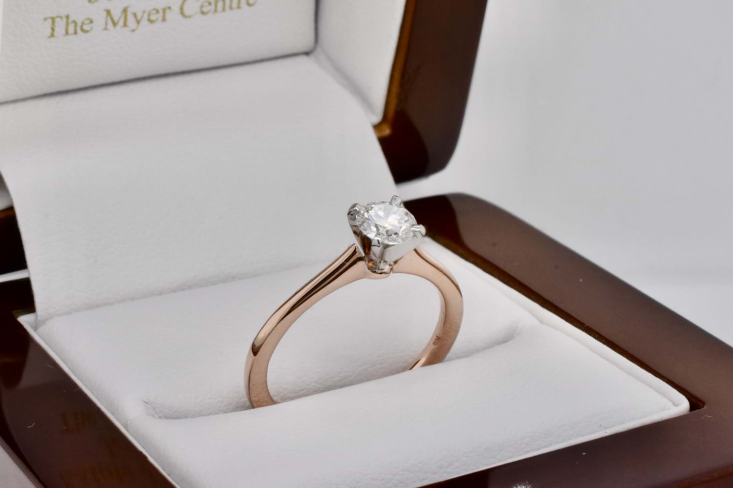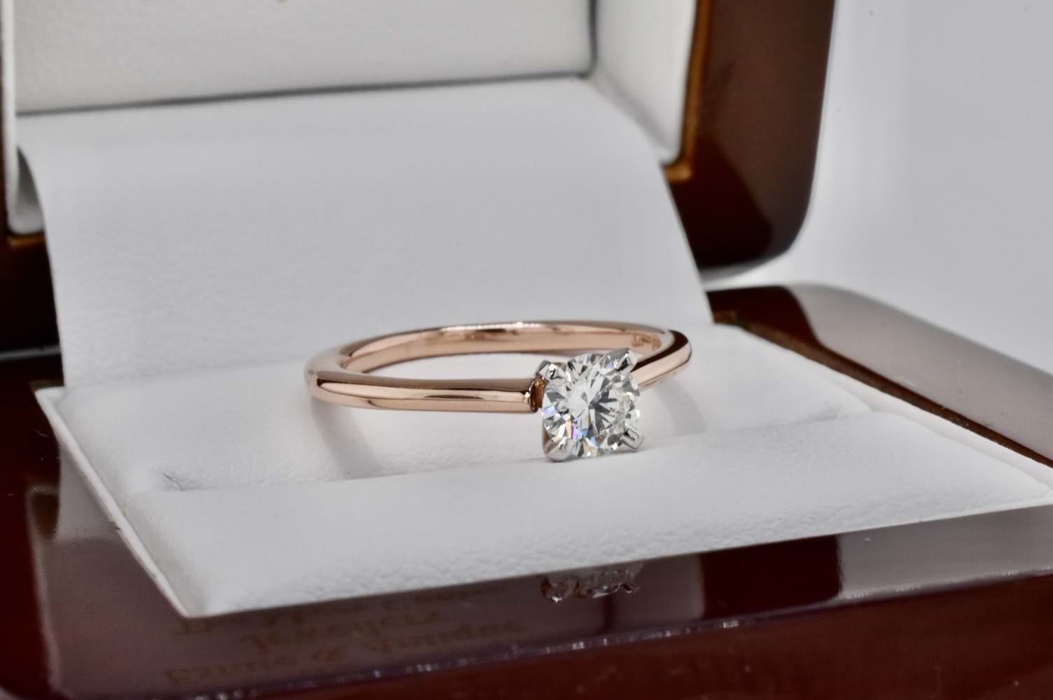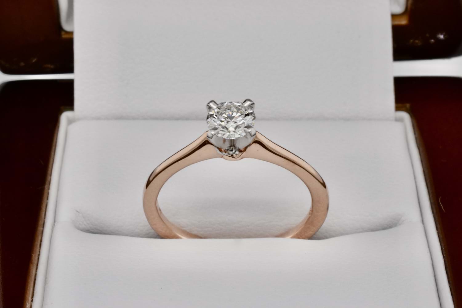A shimmering round brilliant cut diamond set into a 14ct rose gold ring with a white gold four prong setting. The diamond is a 0.43ct GVS1 with a GIA report. Finger size K+ Independent Valuation Supplied & GIA Cert Supplied