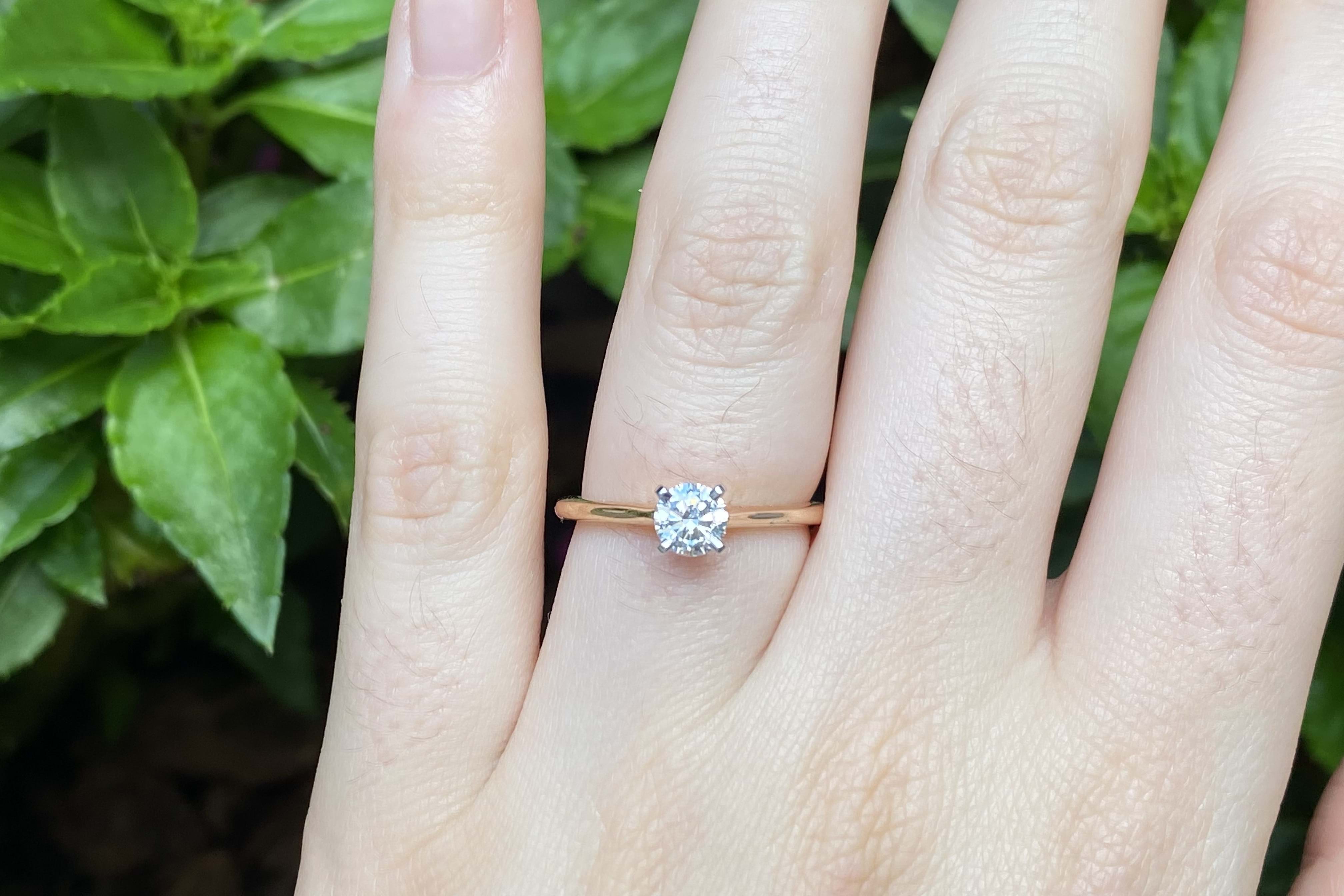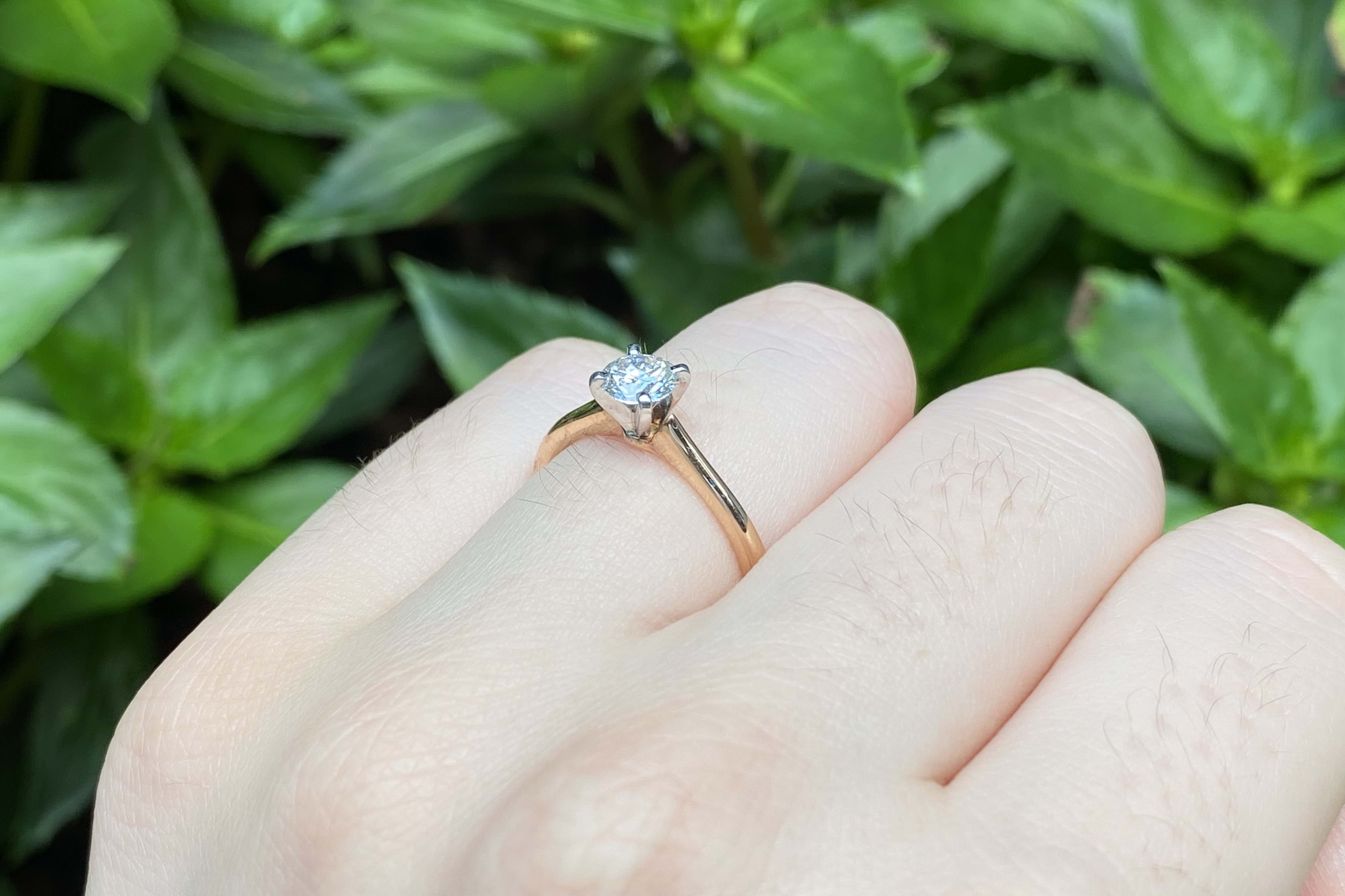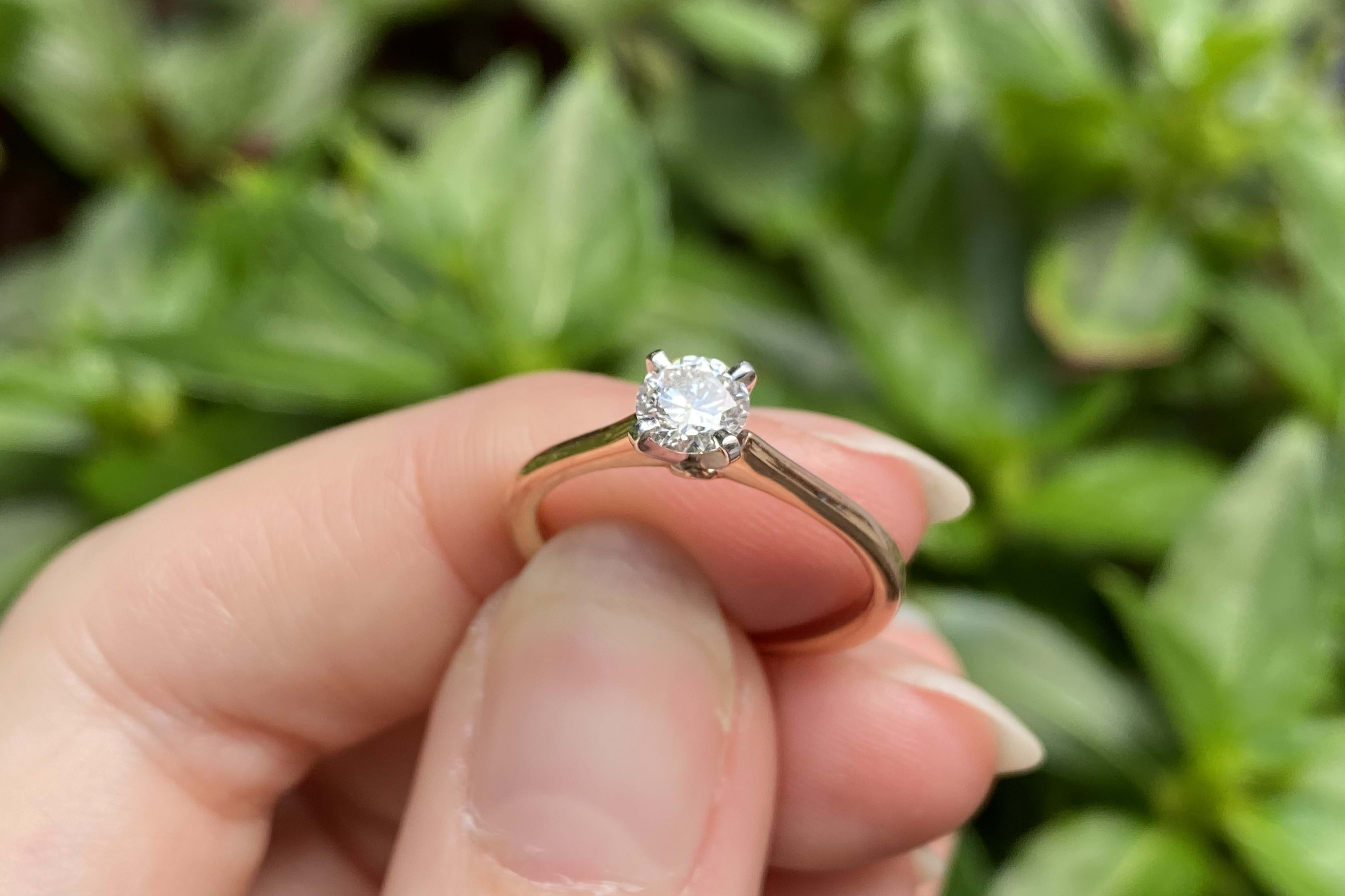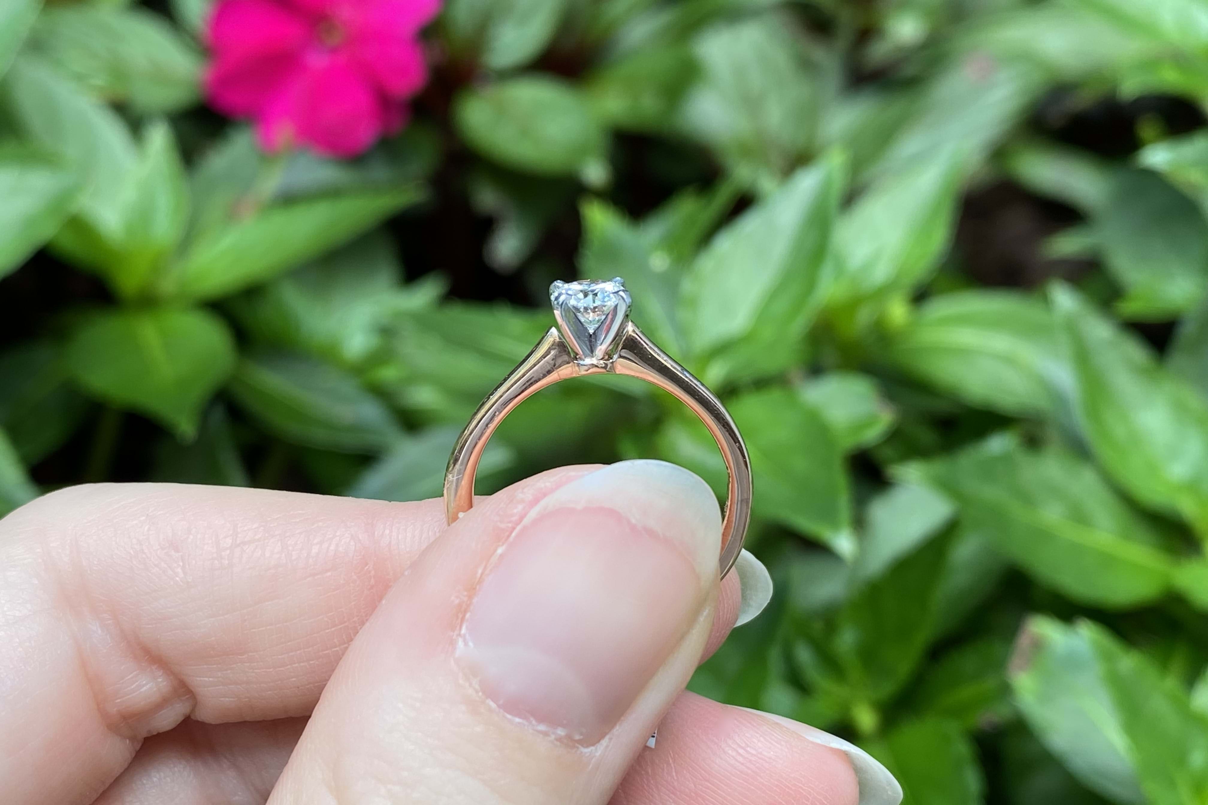 A shimmering round brilliant cut diamond set into a 14ct rose gold ring with a white gold four prong setting. The diamond is a 0.43ct GVS1 with a GIA report. Finger size K+ Independent Valuation Supplied & GIA Cert Supplied