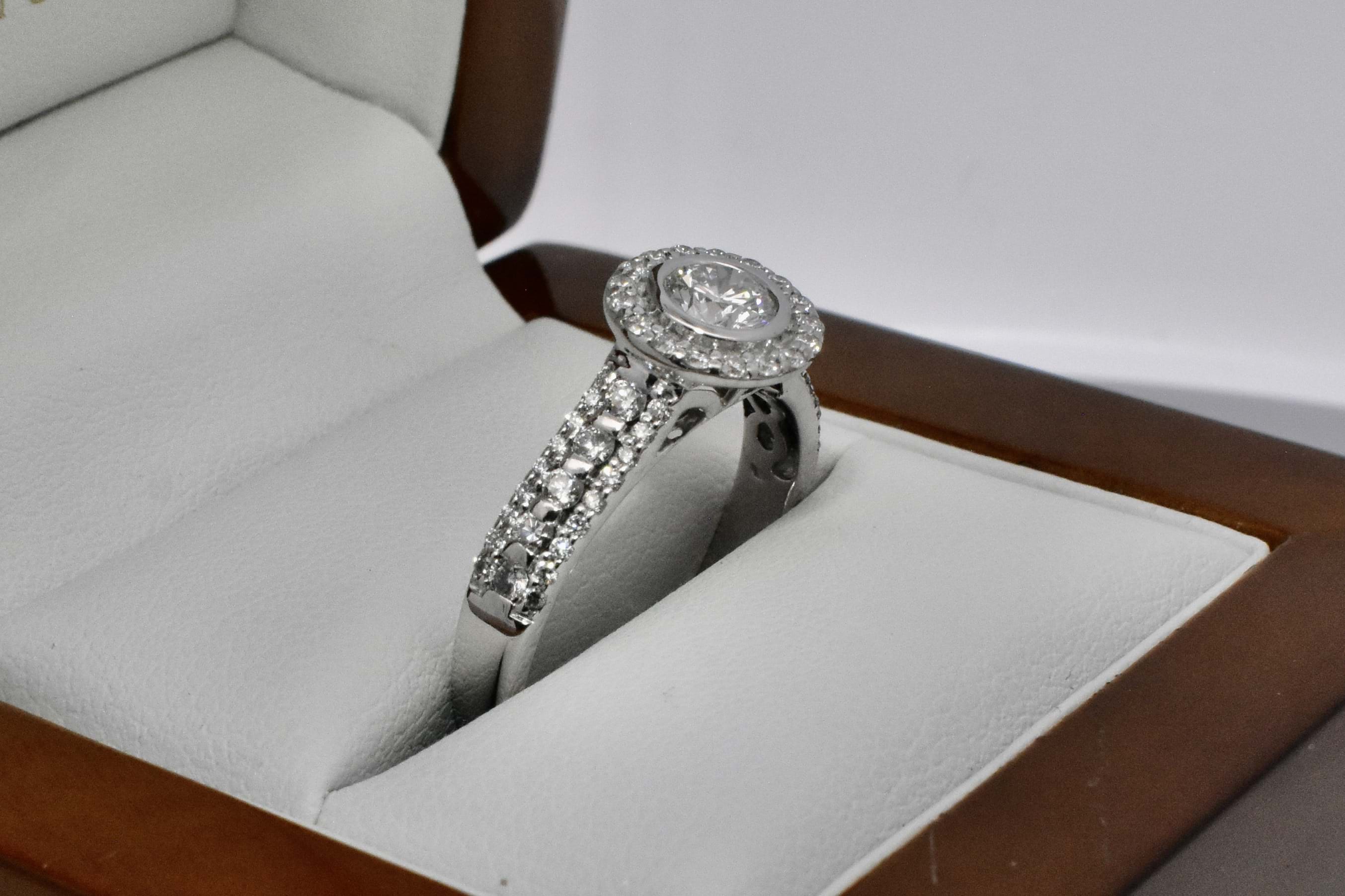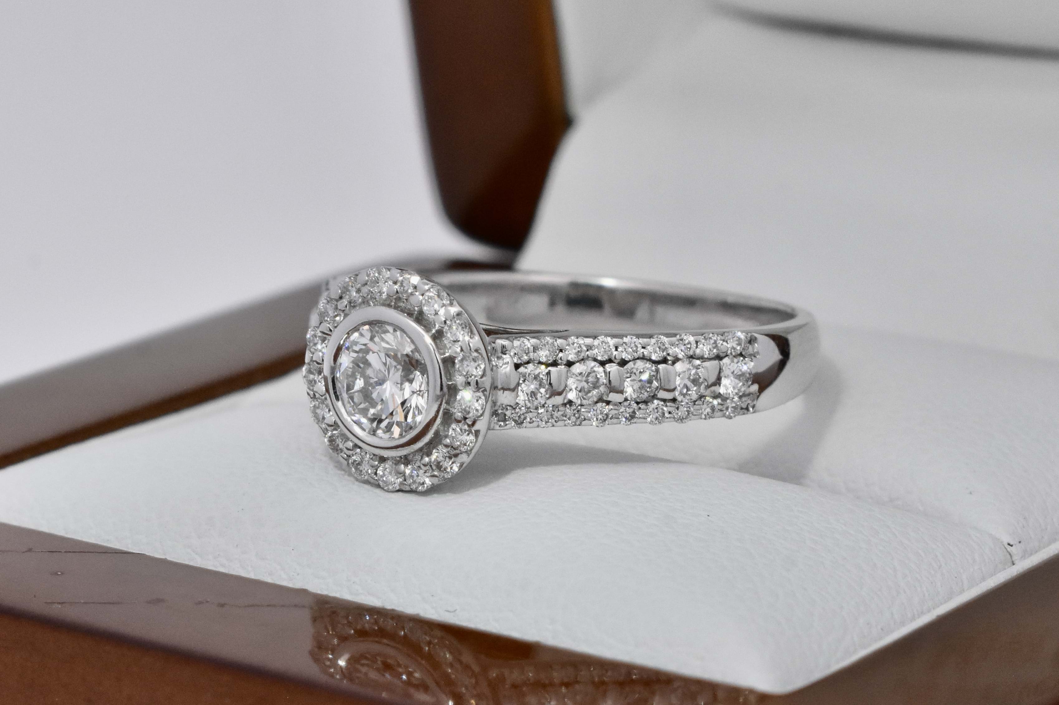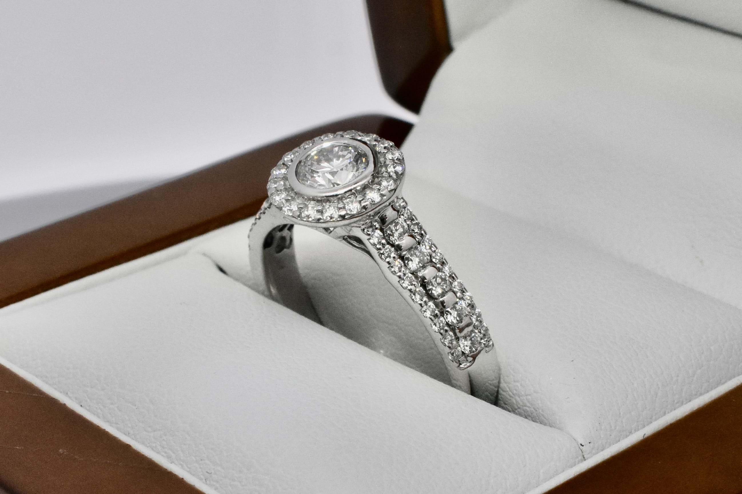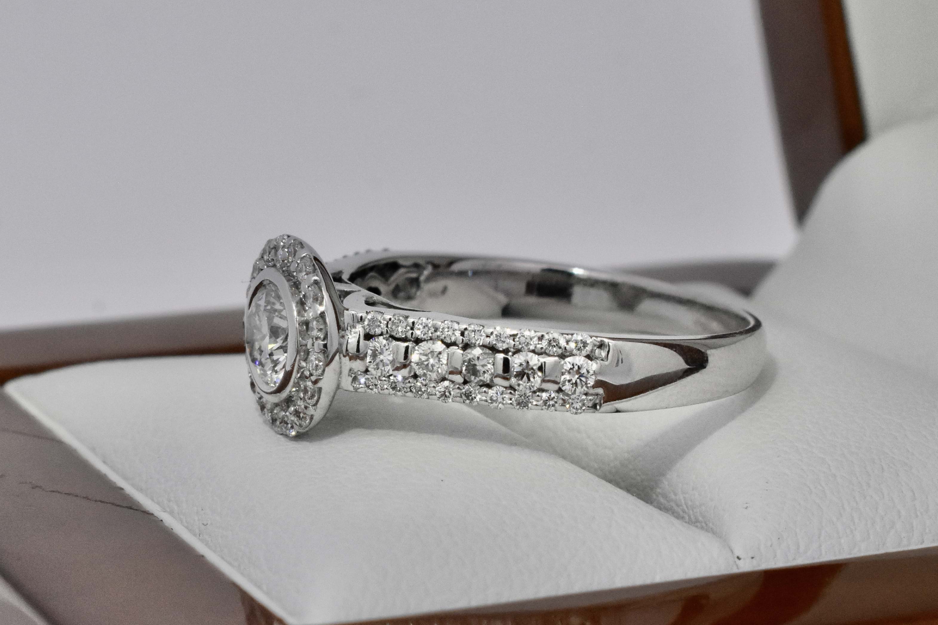 A timeless and elegant ring, this piece is made in 18ct white gold with a centre 0.40ct round brilliant cut diamond, bezel set with a halo of RBC diamonds which continue down the shoulders gracefully in three rows with the middle row accented by plain white gold detail for an additional 0.60ct making the total weight of the ring 1.00ct H/SI with plain tapered band and sweet cutout gallery detail. Finger size Q. This ring can be worn by itself or with other bands. Independent Valuation Supplied