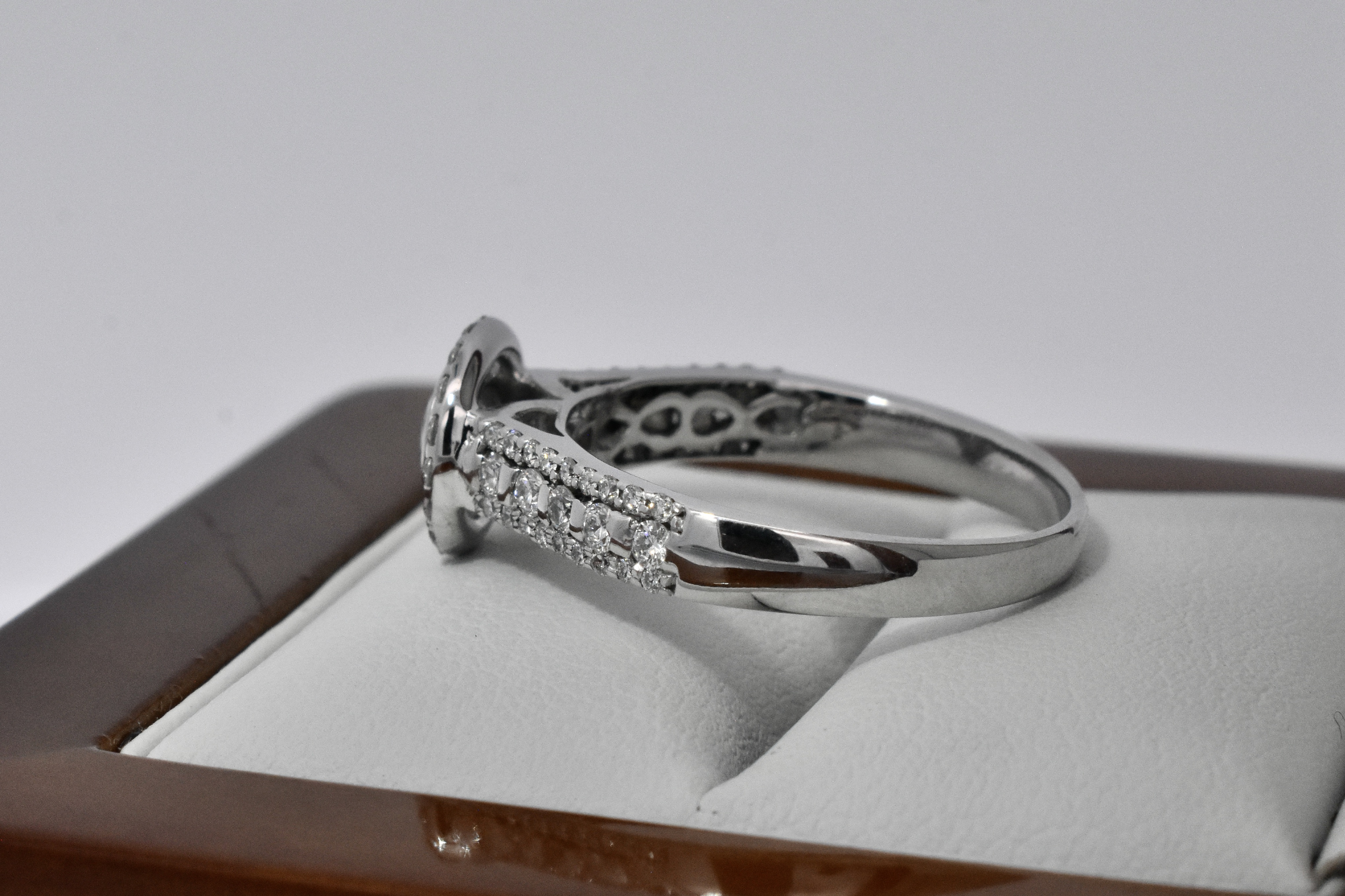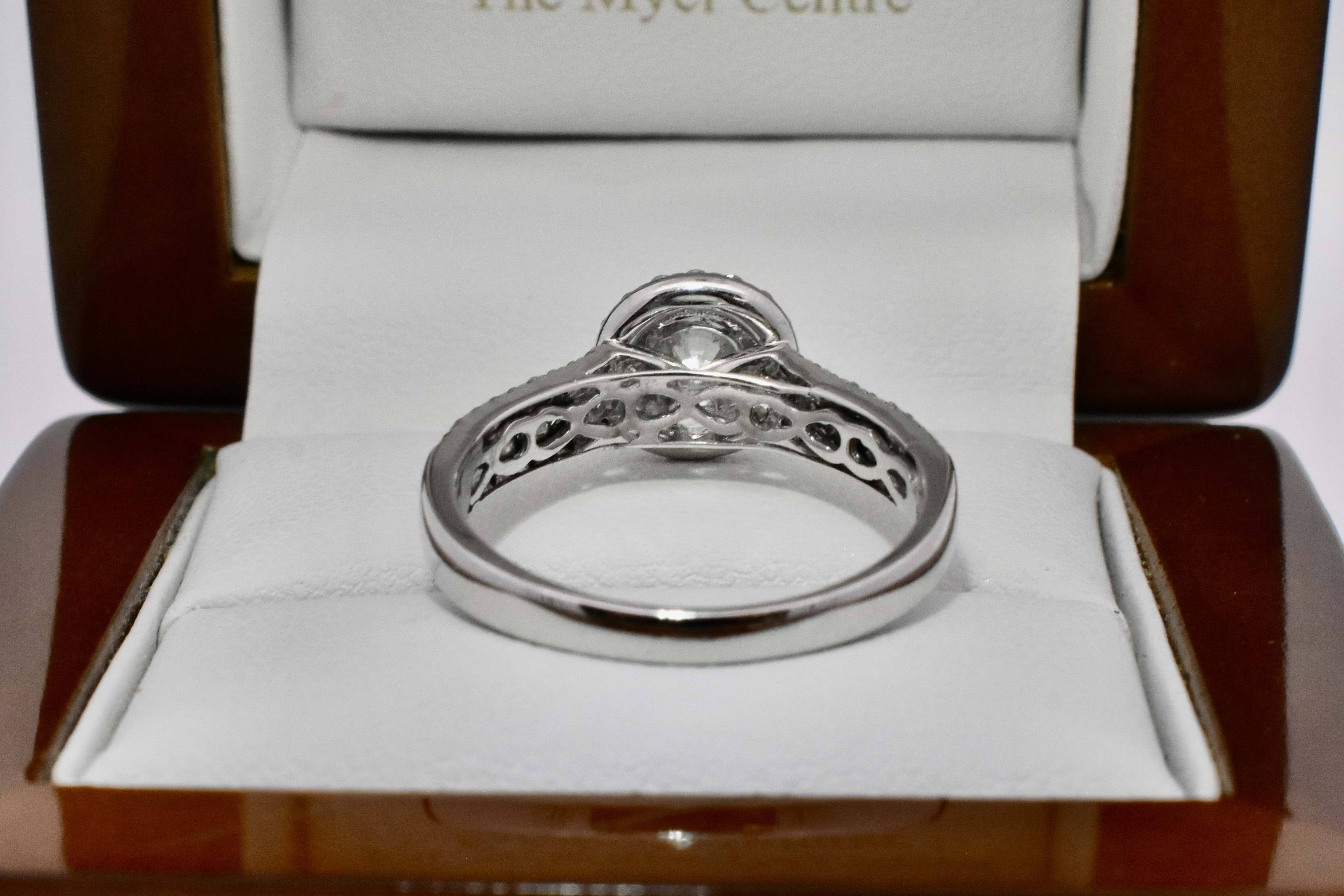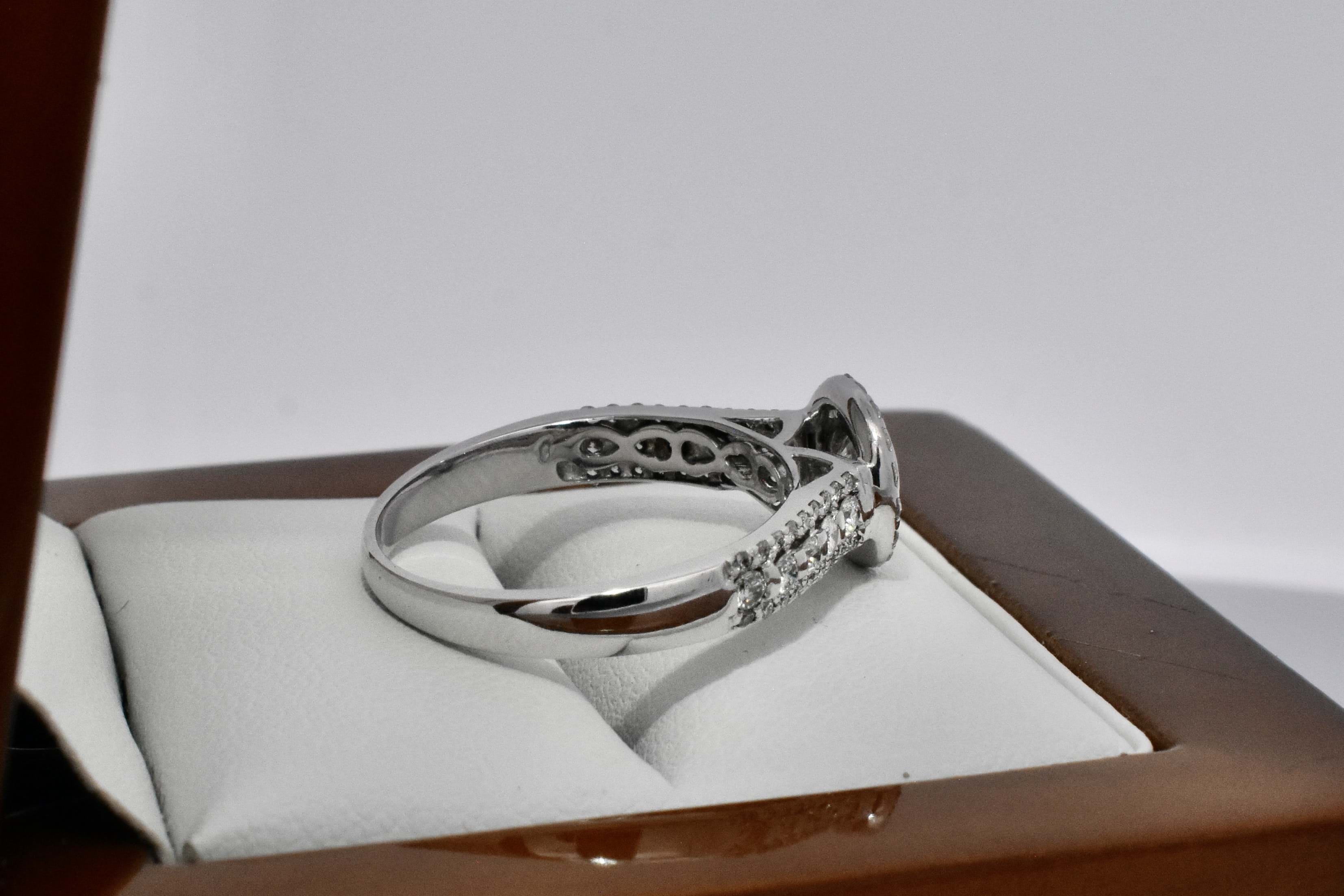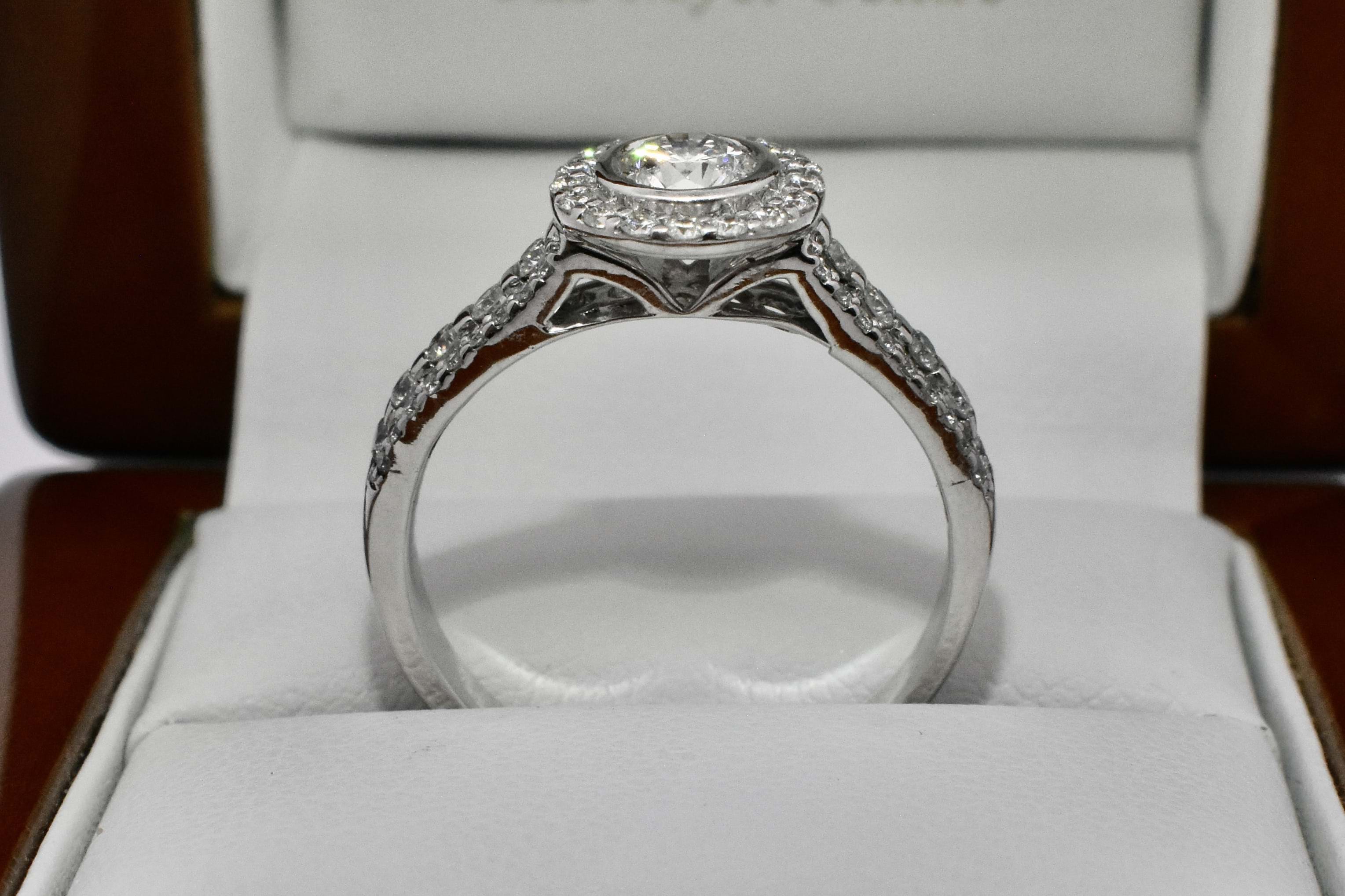 A timeless and elegant ring, this piece is made in 18ct white gold with a centre 0.40ct round brilliant cut diamond, bezel set with a halo of RBC diamonds which continue down the shoulders gracefully in three rows with the middle row accented by plain white gold detail for an additional 0.60ct making the total weight of the ring 1.00ct H/SI with plain tapered band and sweet cutout gallery detail. Finger size Q. This ring can be worn by itself or with other bands. Independent Valuation Supplied