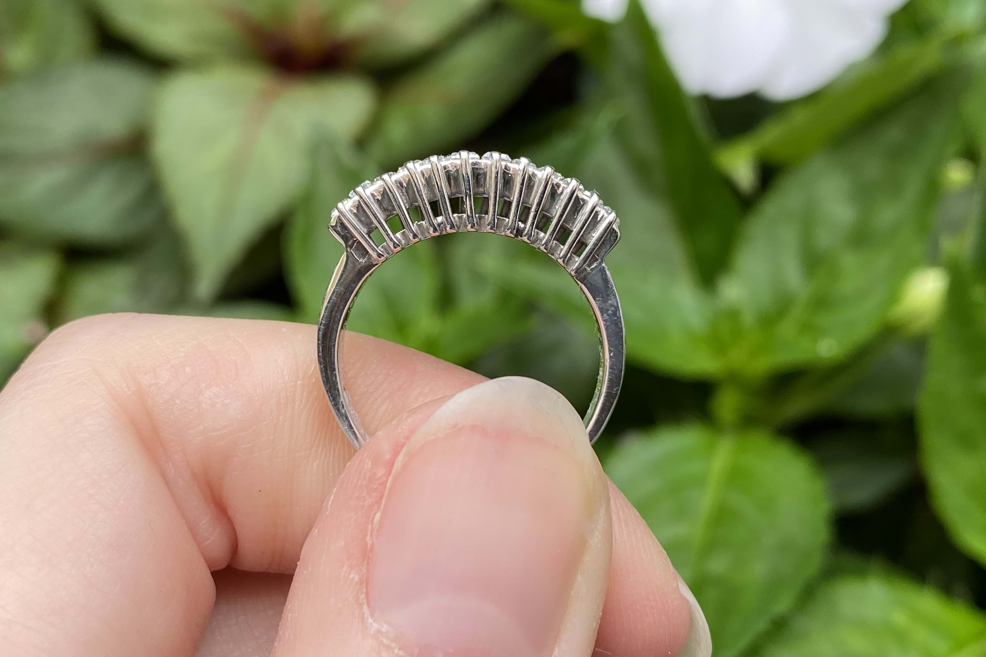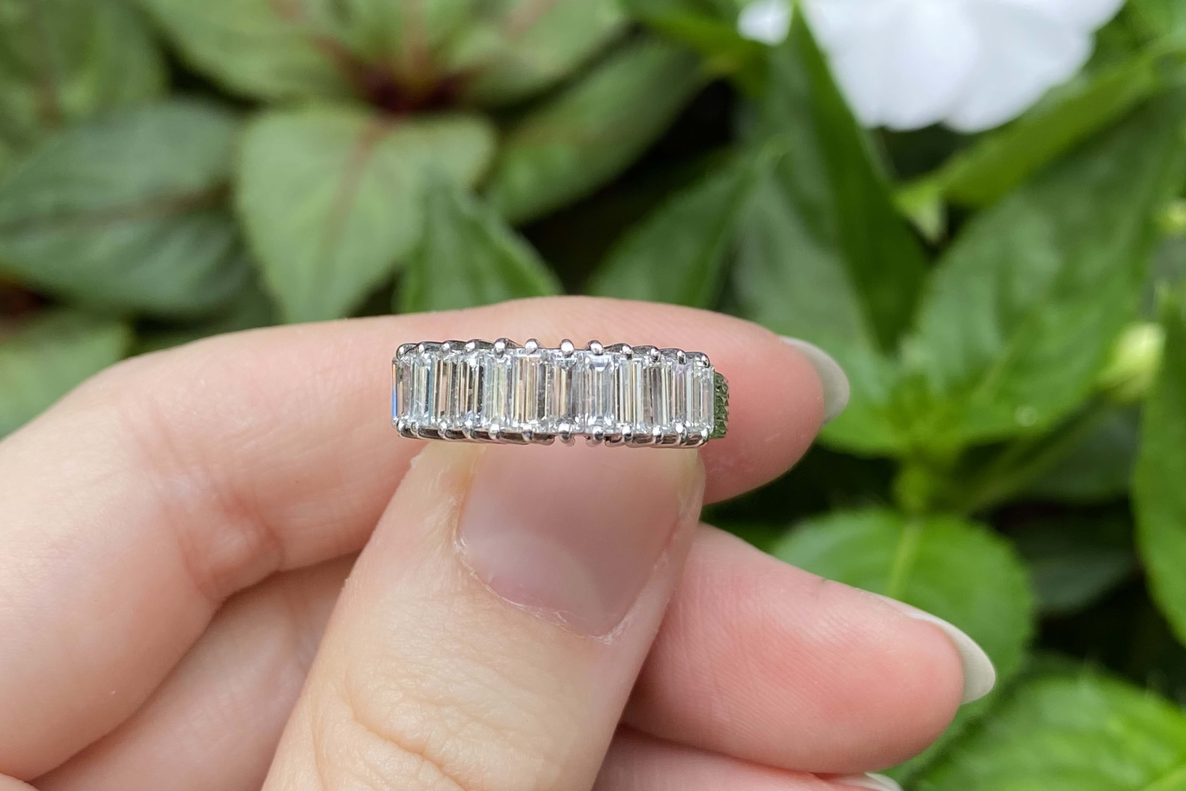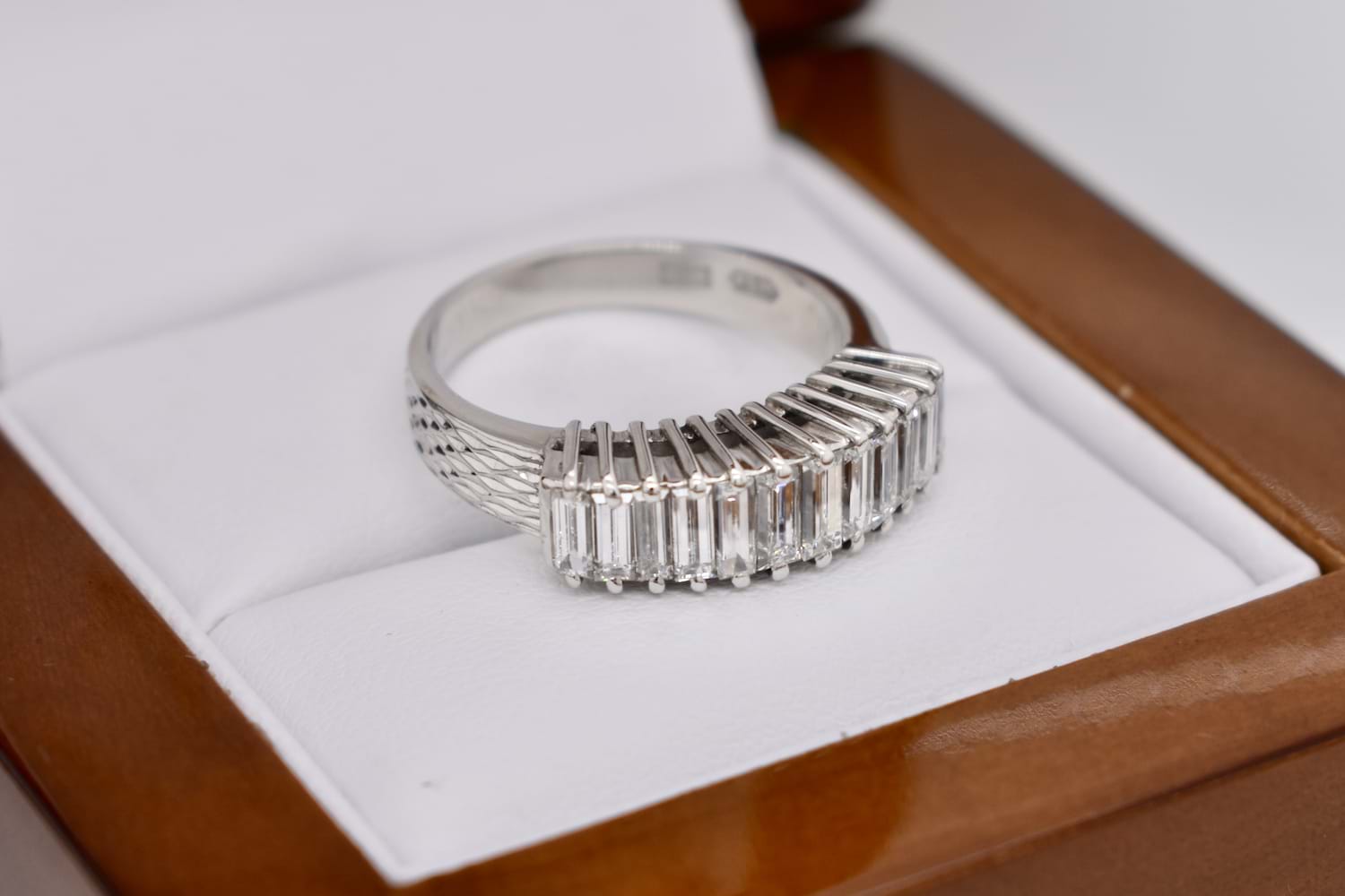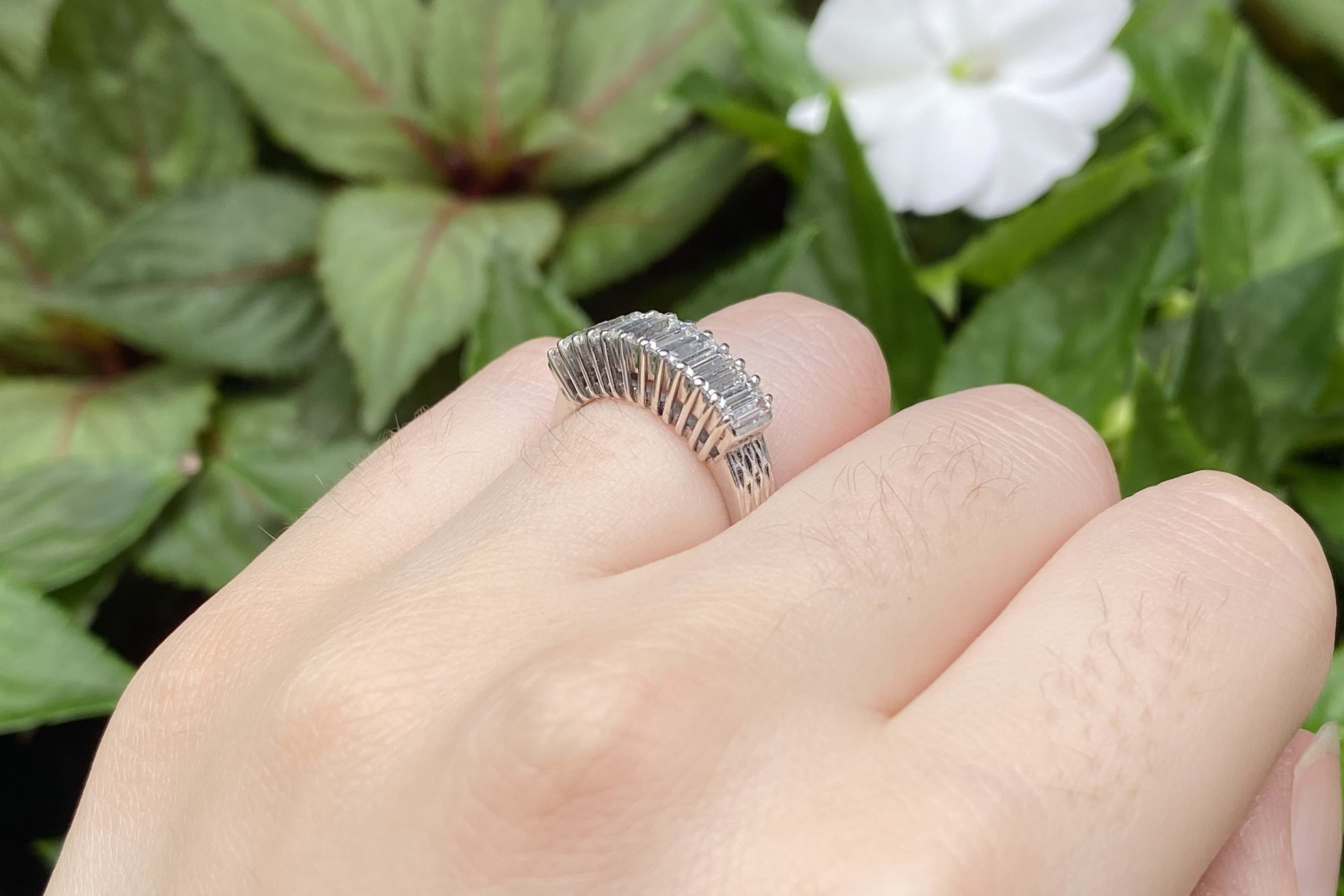 A magnificent vintage look statement ring with a total 1.50ct of sparkling, white baguette cut GI/VS diamonds in claw settings with a raised gallery and plain band. Finger size L+
