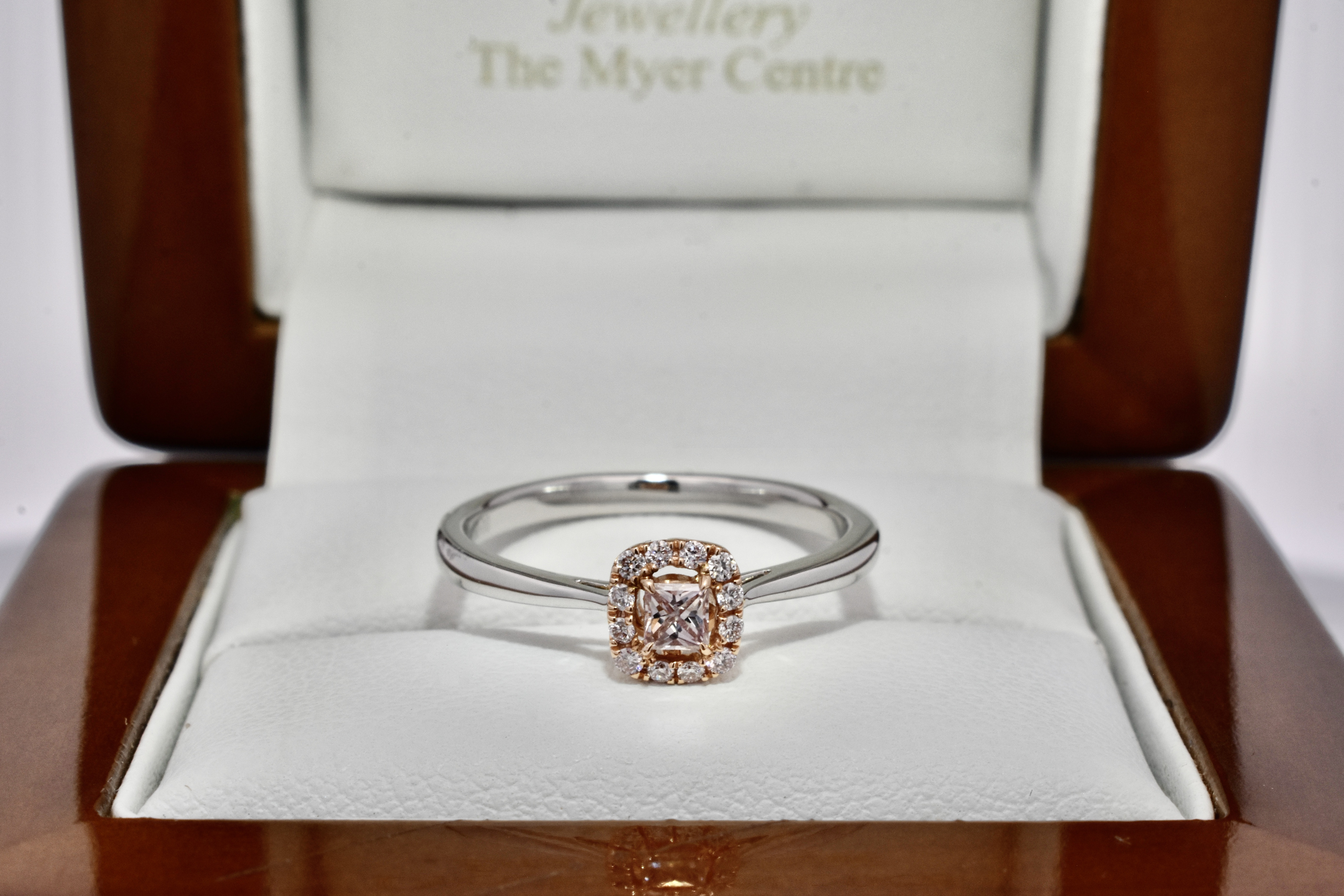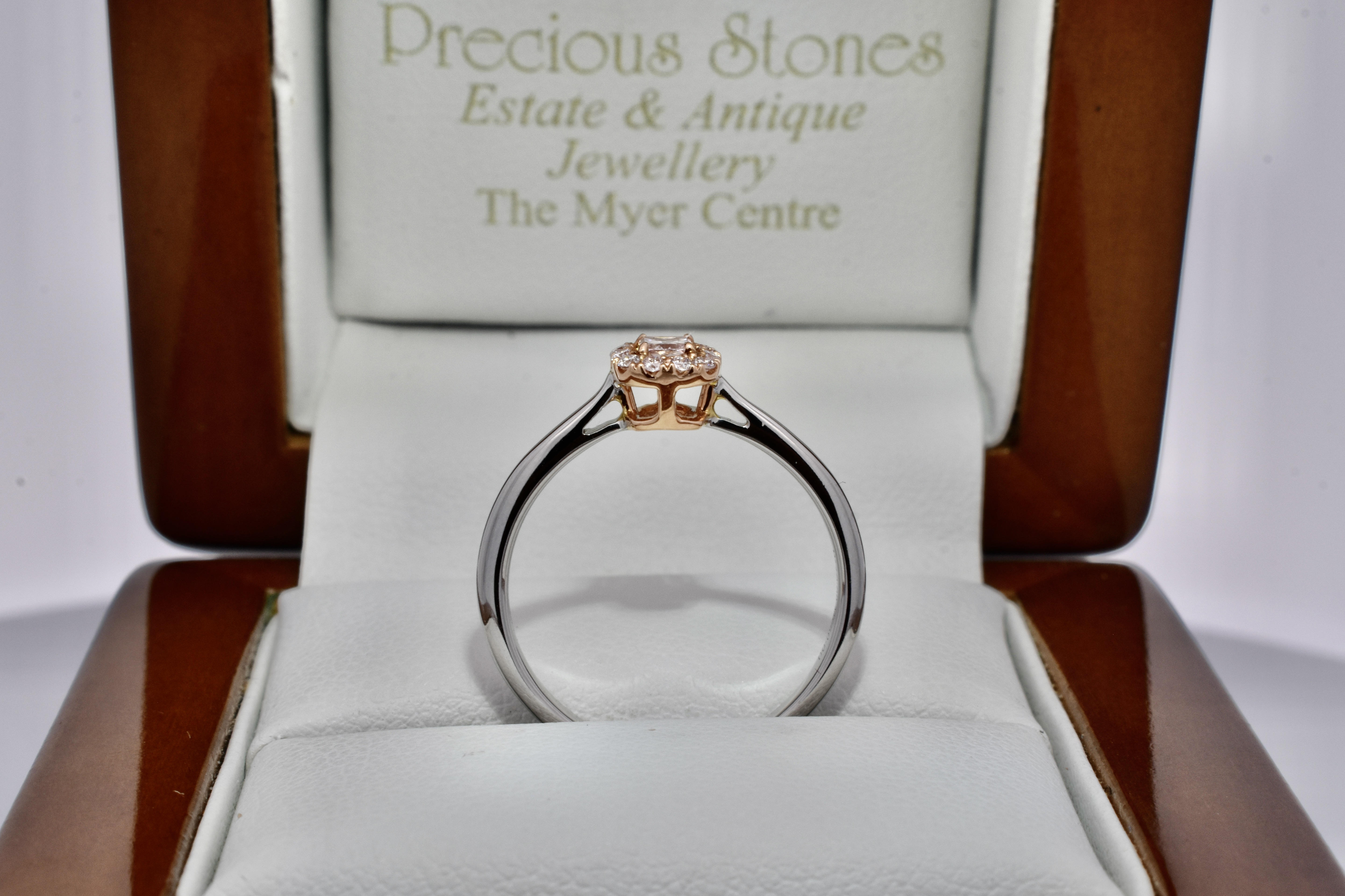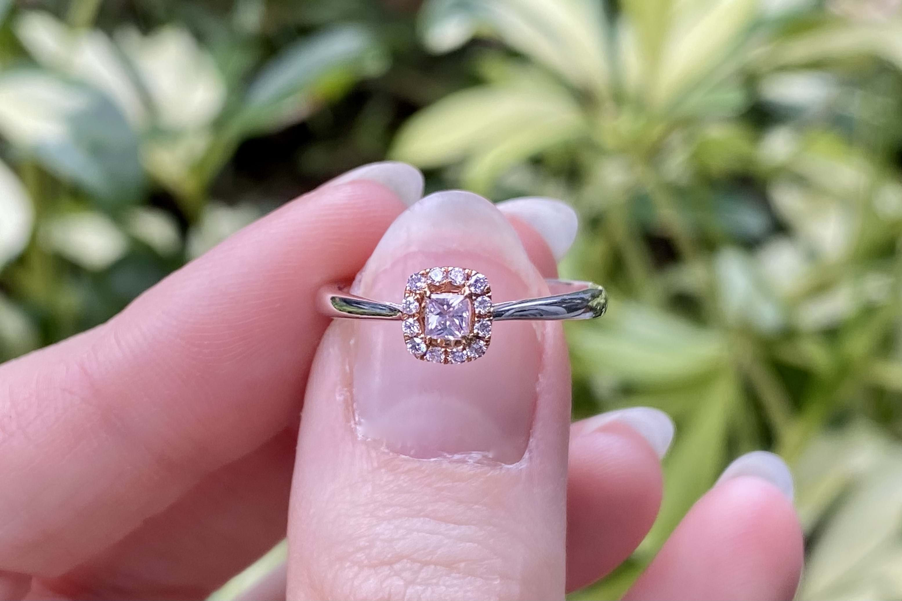 A dainty and elegant natural pink diamond ring, crafted in 18ct white and rose gold with a centre princess cut pink diamond of 0.09ct FLBP/P1 and a halo of twelve additional pink diamonds equalling 0.07ct NCP/SI in complementary rose gold, on a plain tapered white gold band. Finger size L