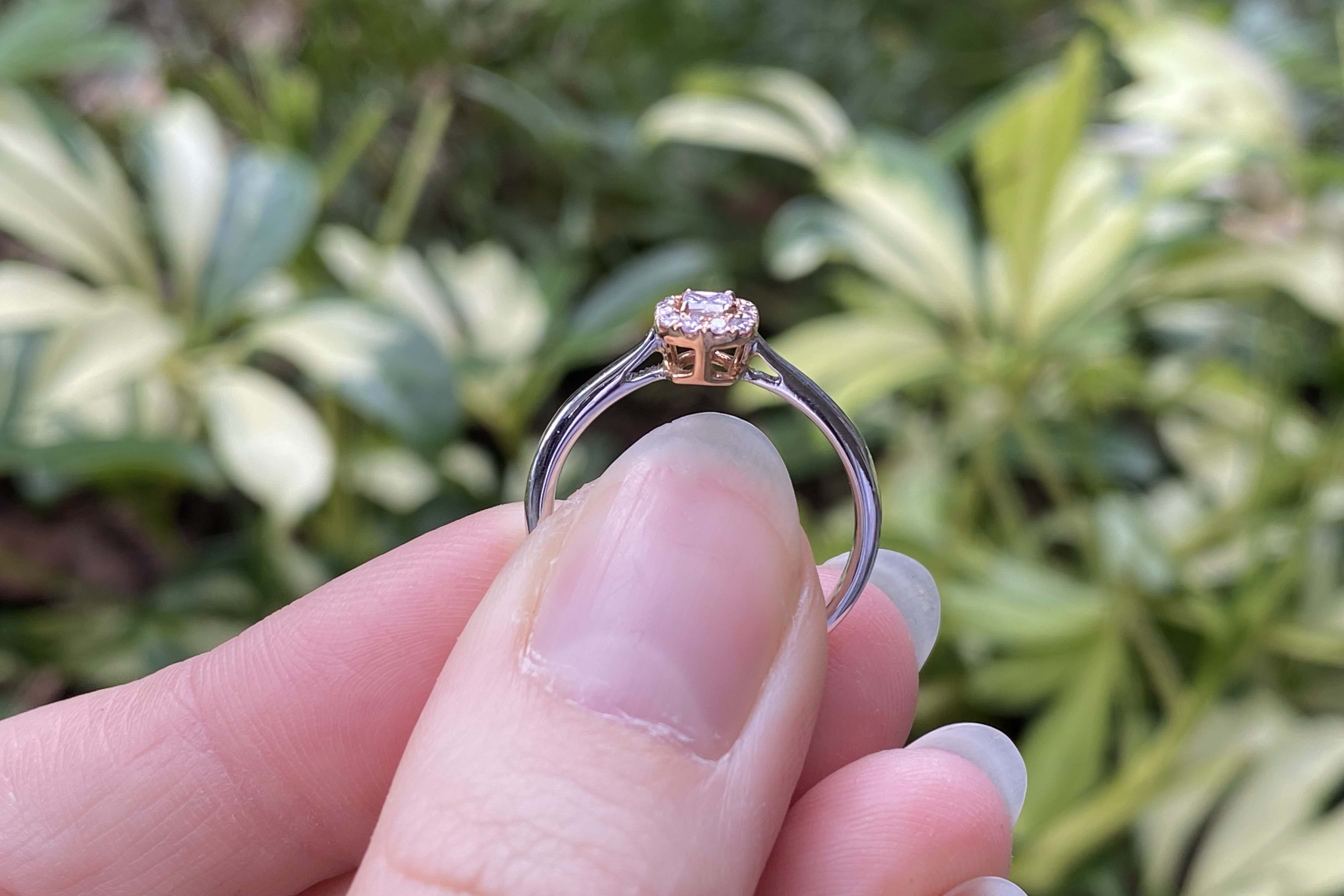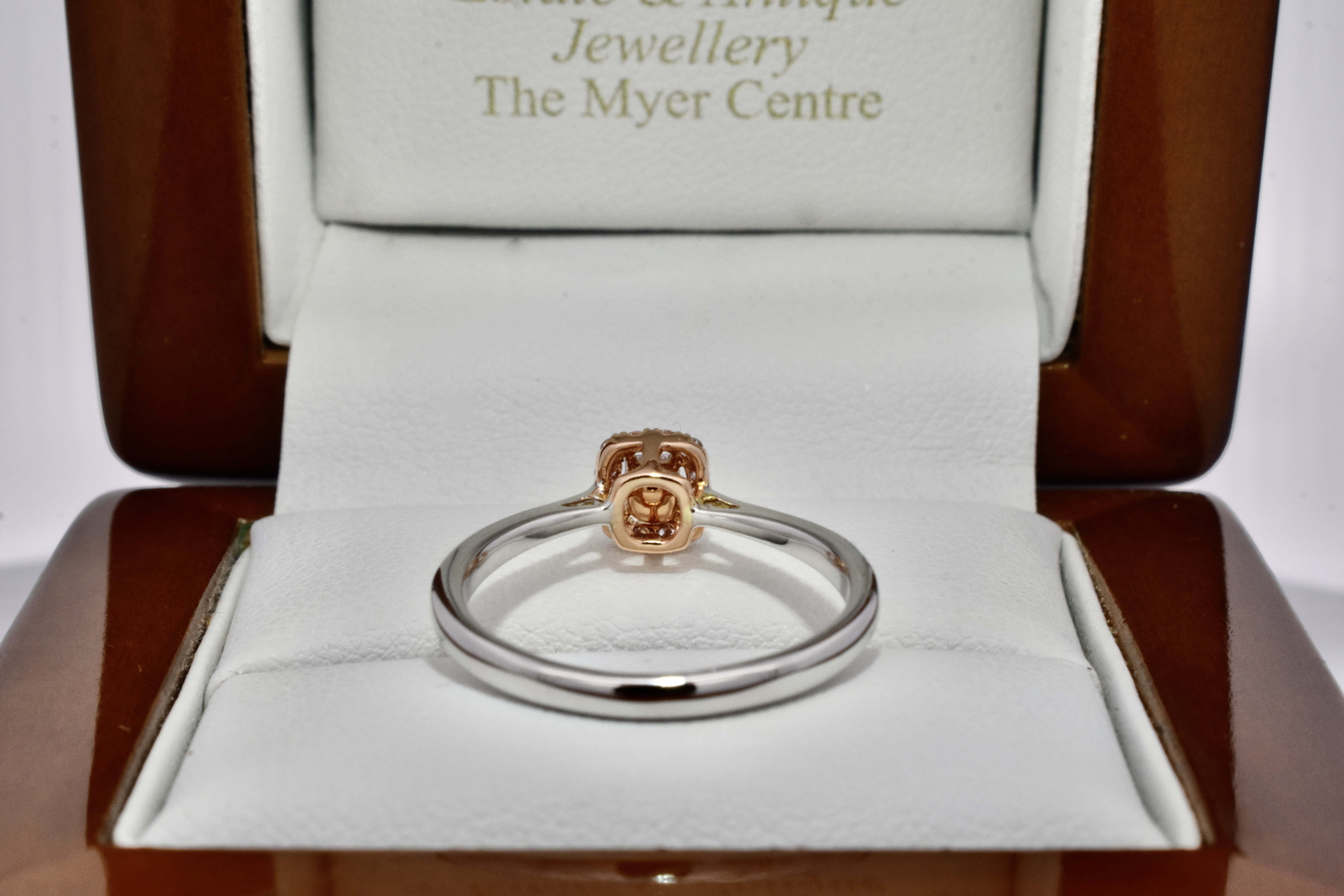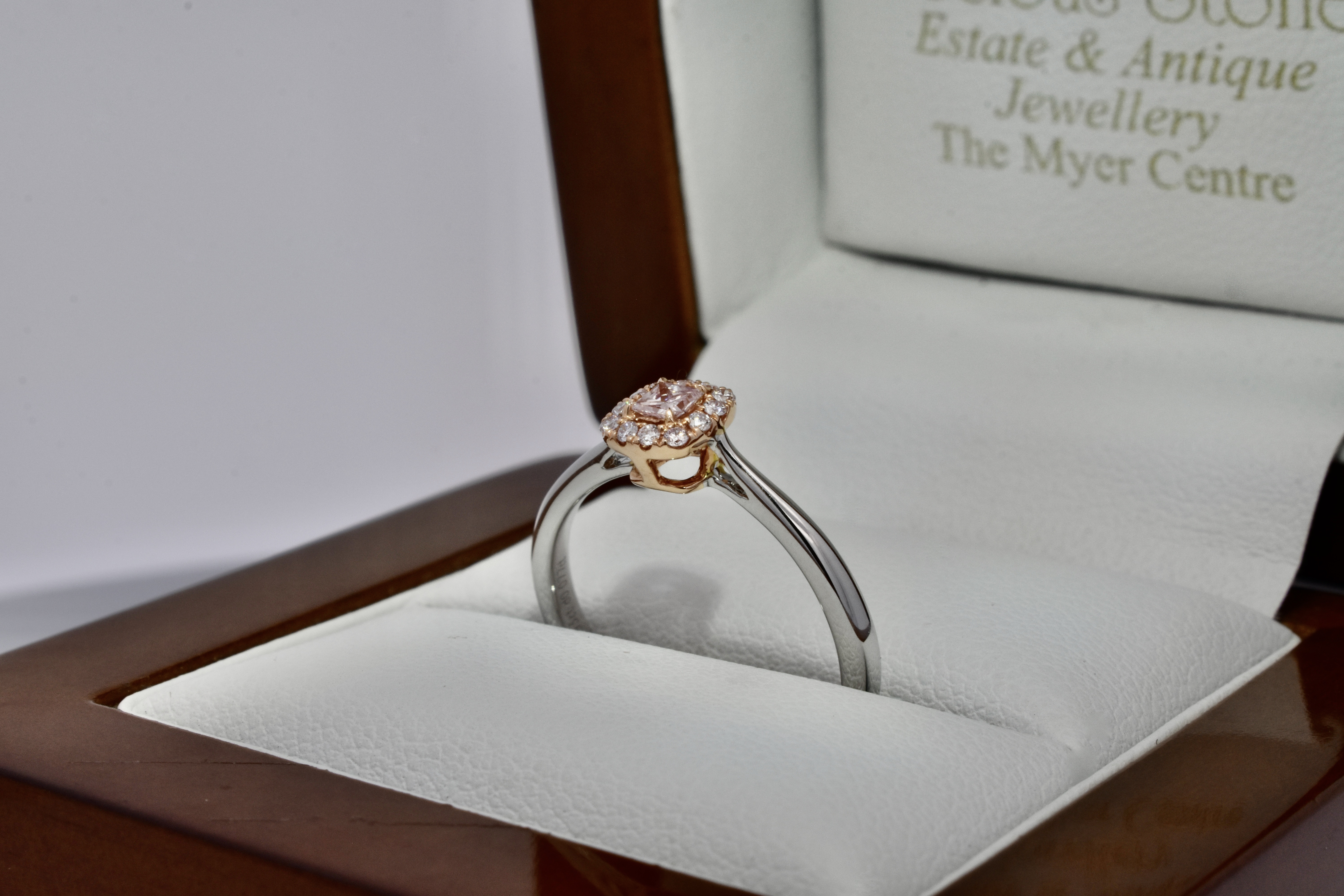 A dainty and elegant natural pink diamond ring, crafted in 18ct white and rose gold with a centre princess cut pink diamond of 0.09ct FLBP/P1 and a halo of twelve additional pink diamonds equalling 0.07ct NCP/SI in complementary rose gold, on a plain tapered white gold band. Finger size L
