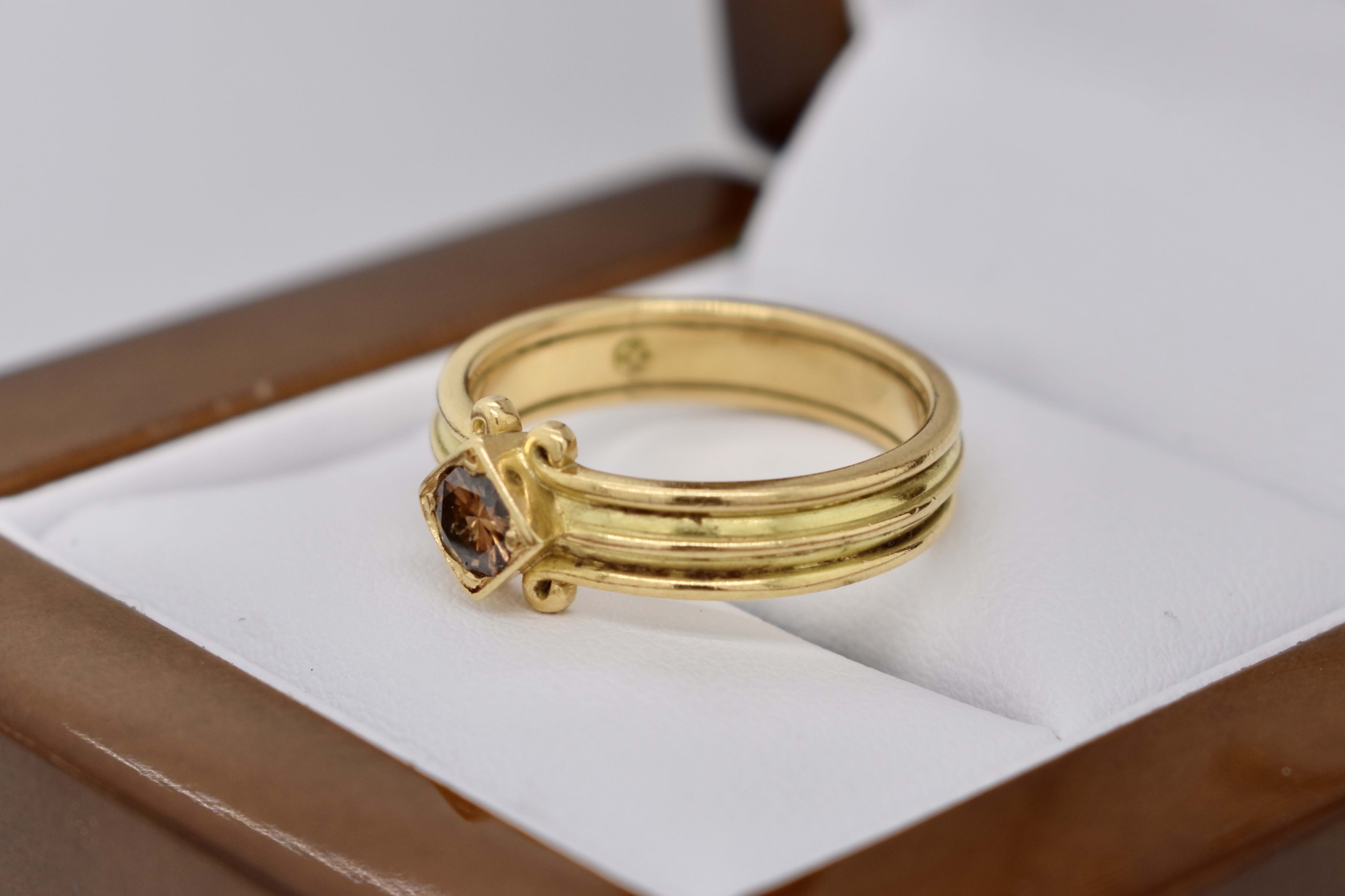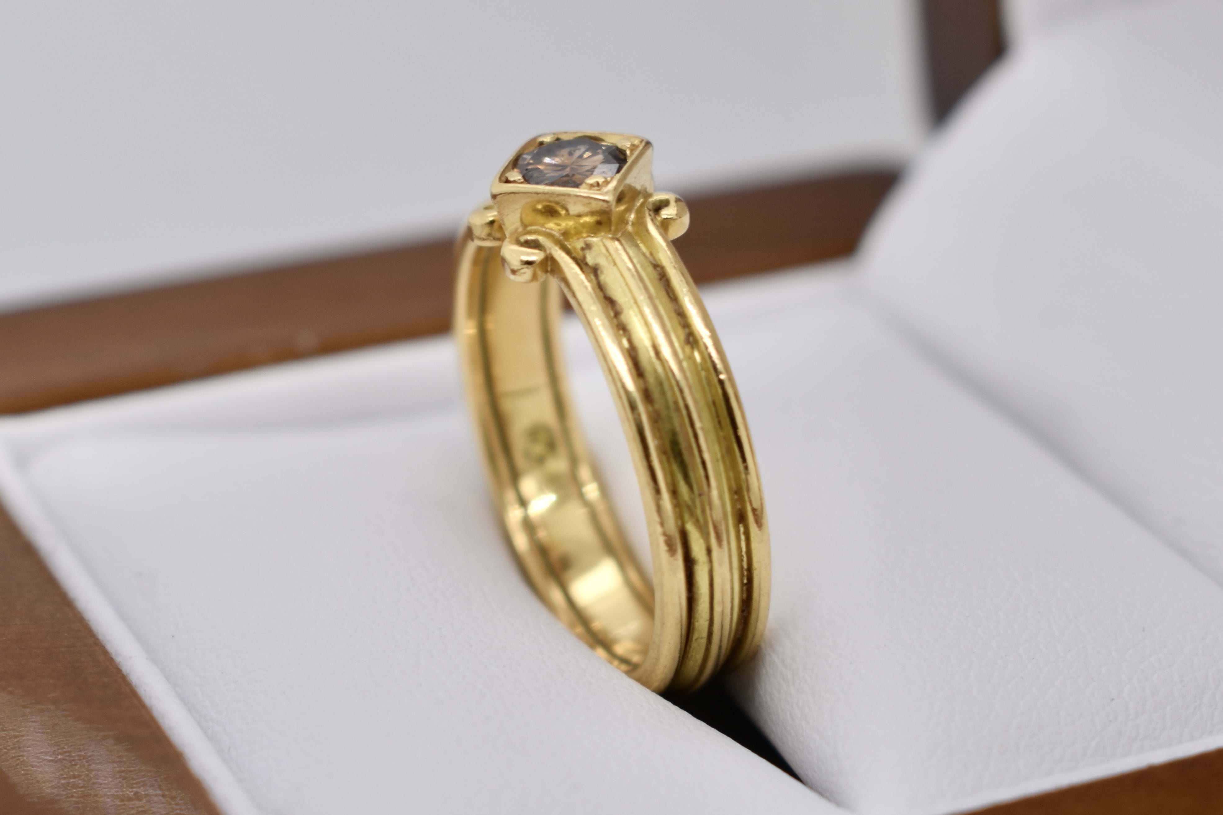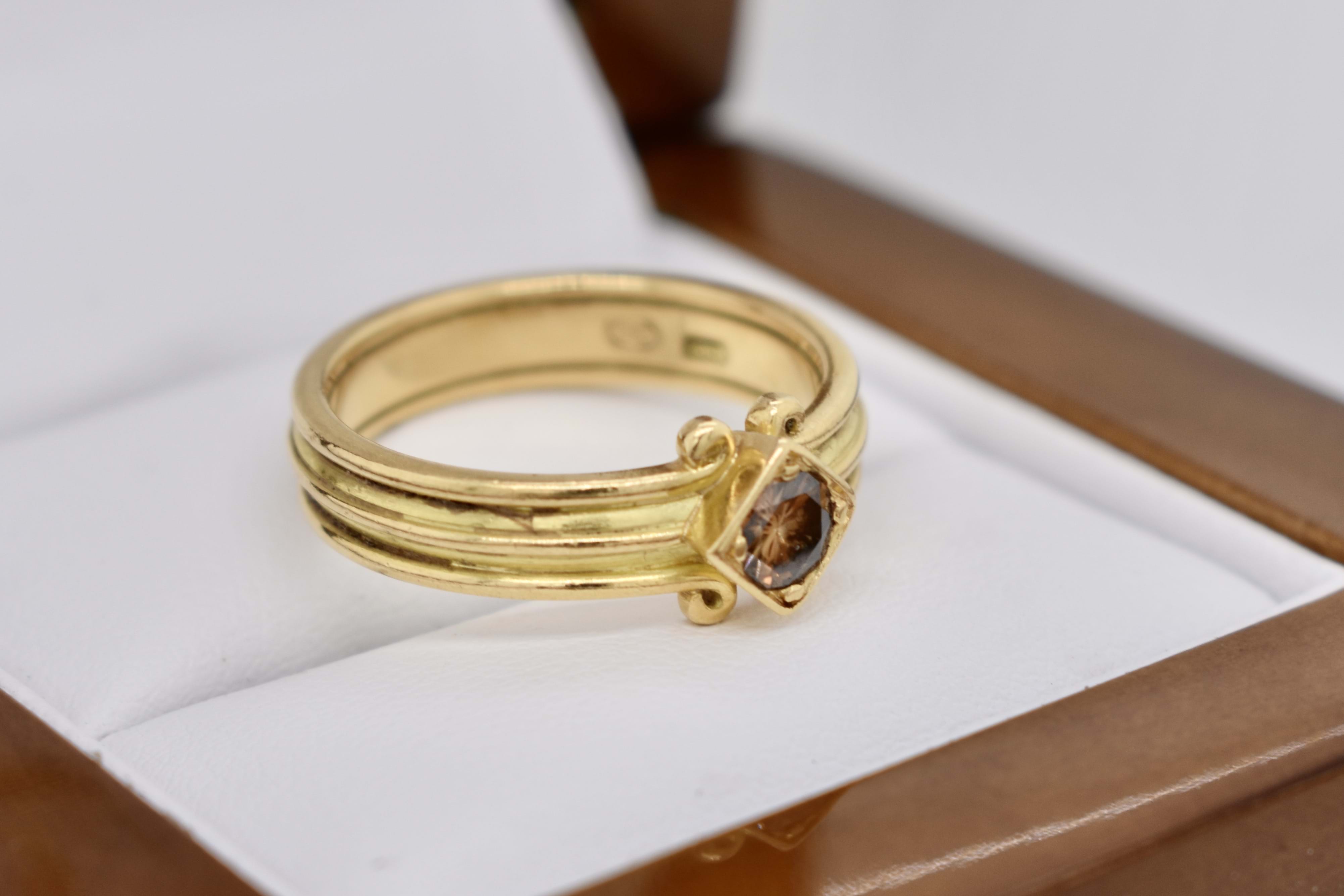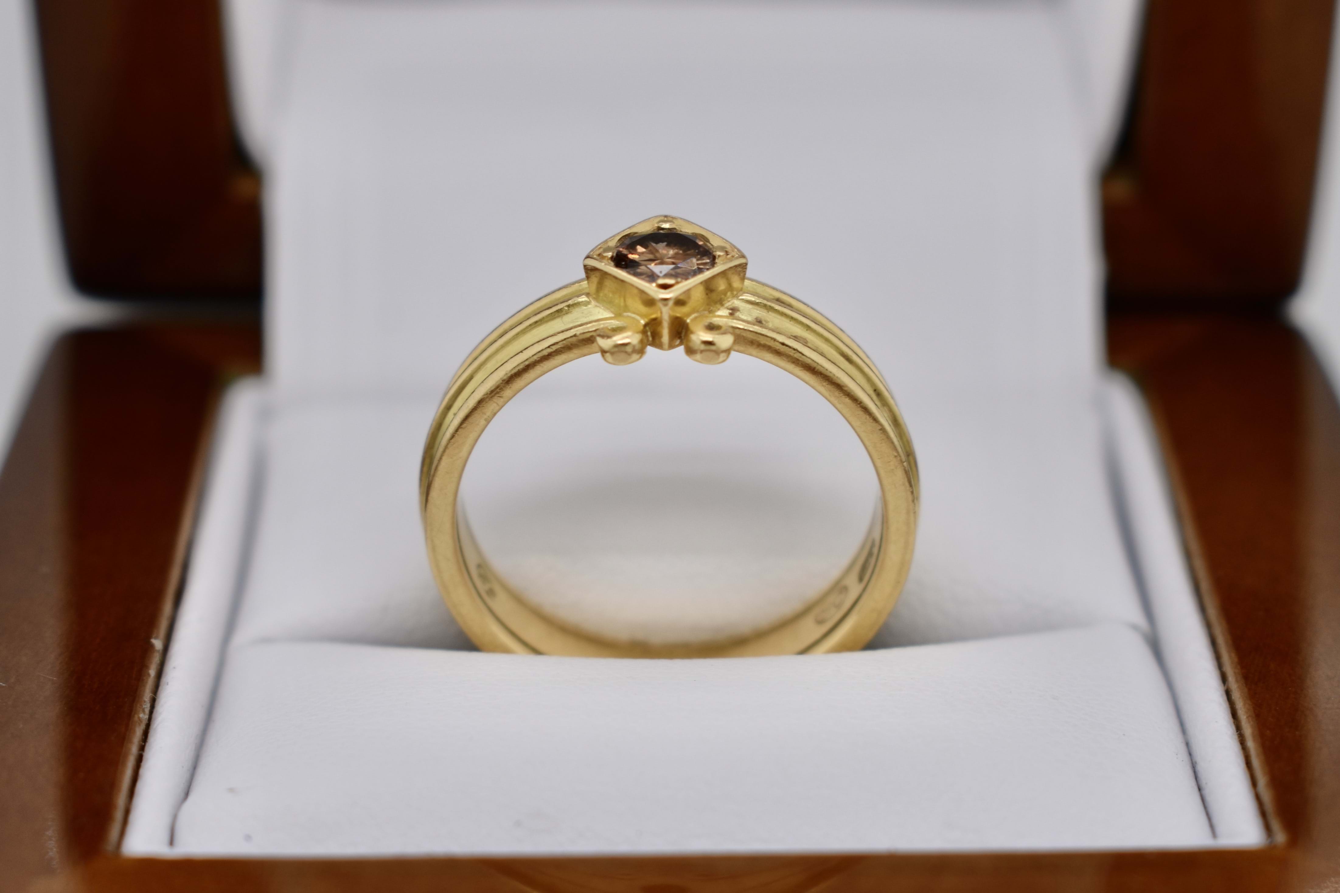 A unique 0.30ct round cognac deep brown diamond (SI/1) band. Diagonally square set in 18ct yellow gold, this handmade band has a grooved scroll feature and measures 4.44mm. Finger size N. Independent Valuation Supplied.