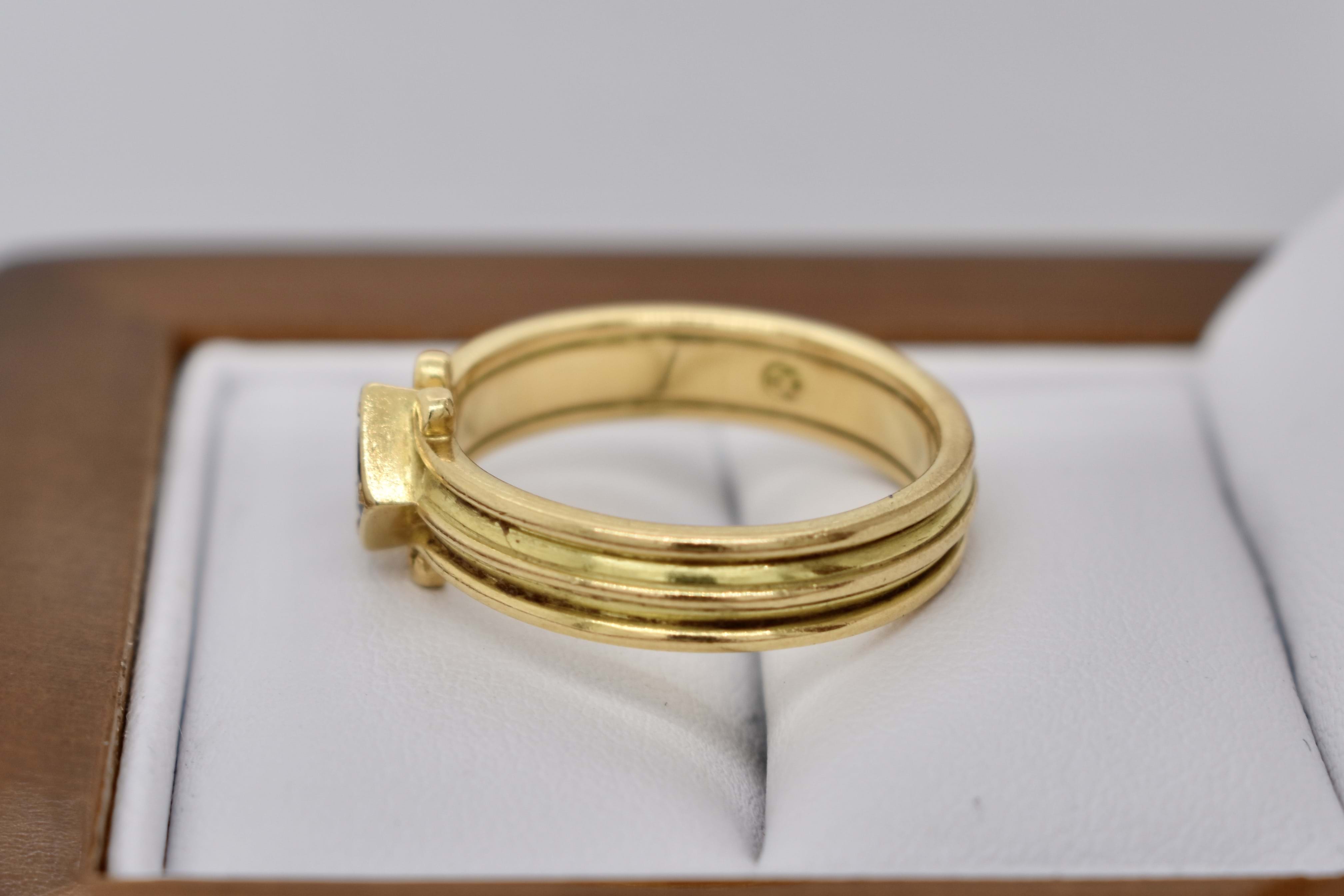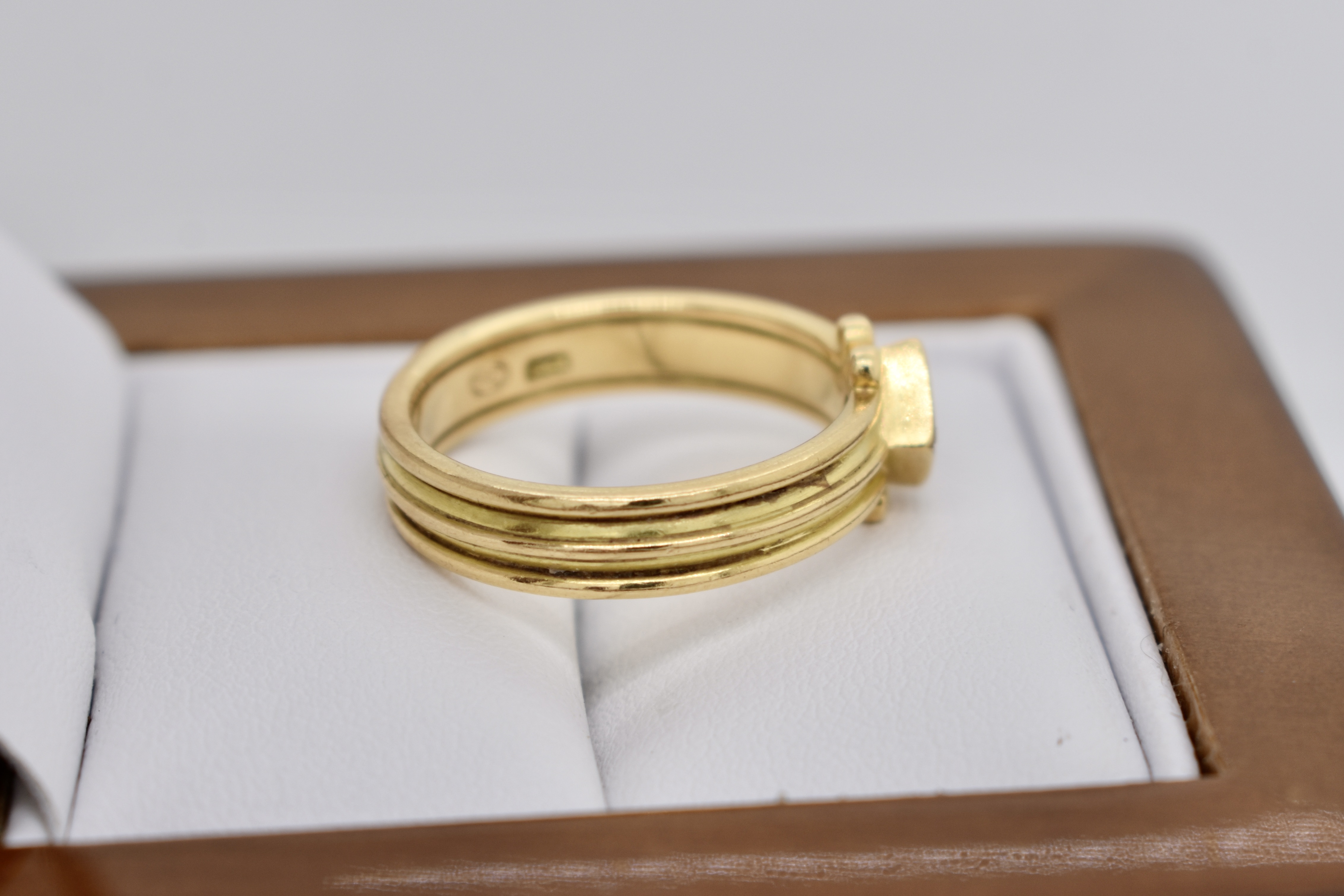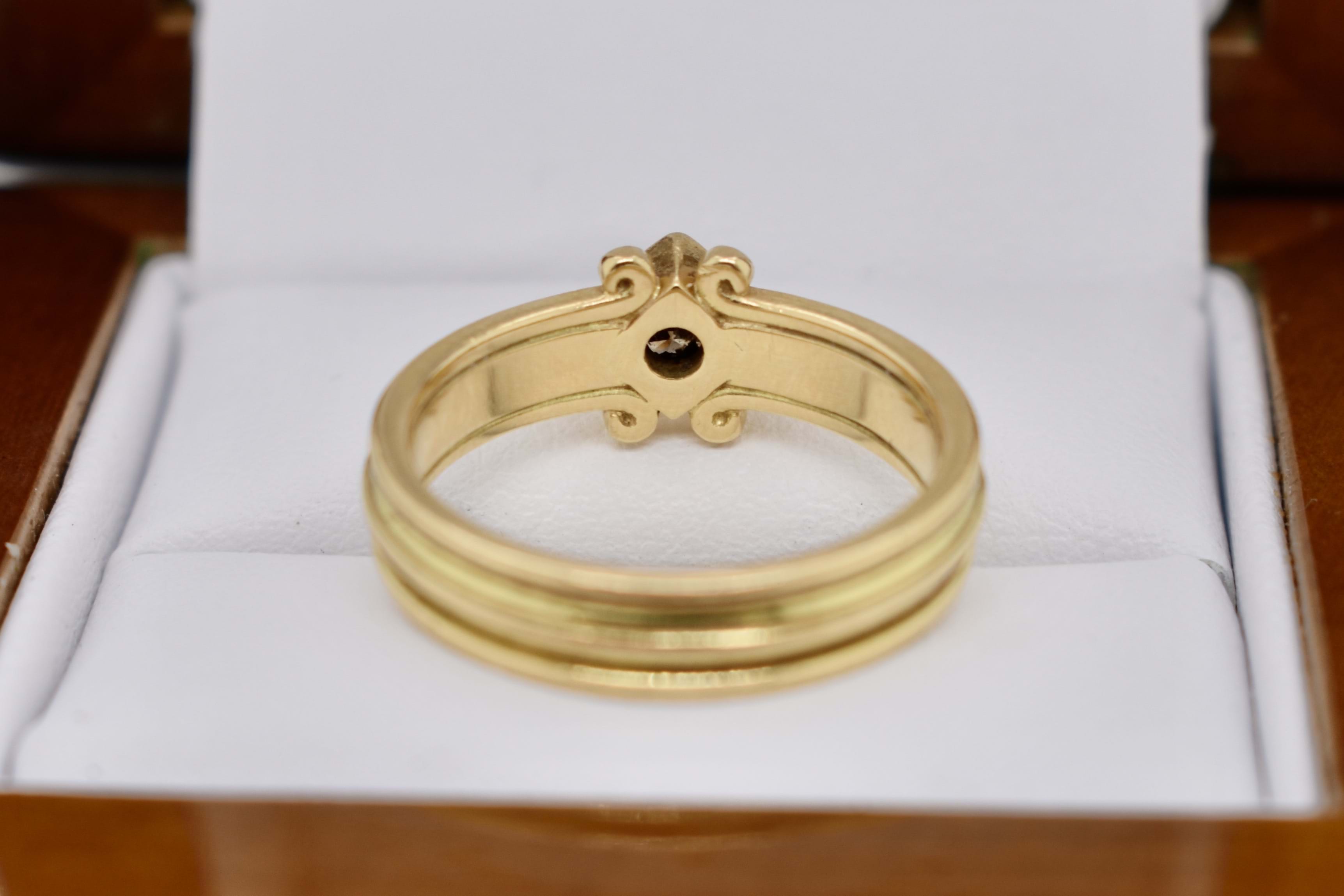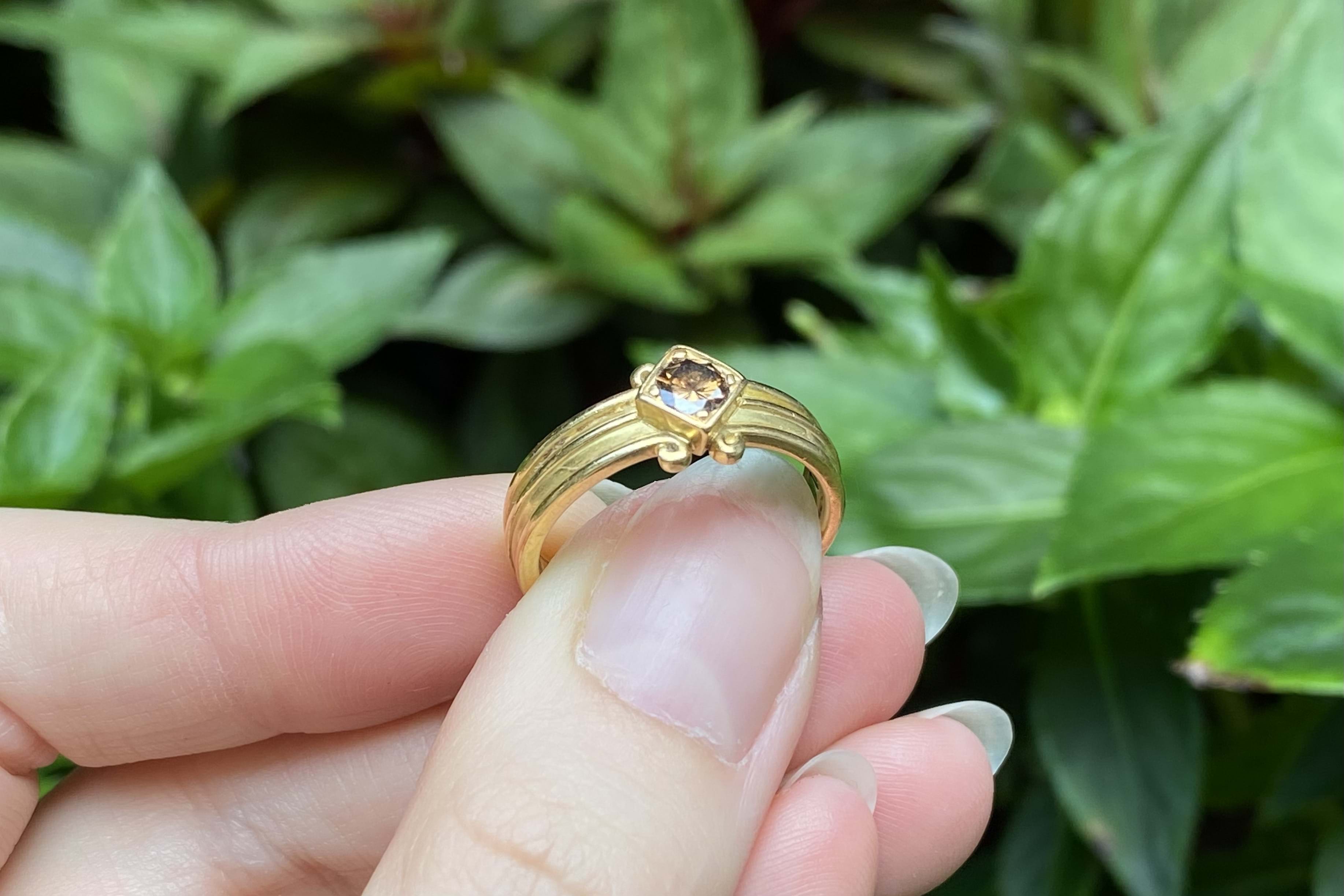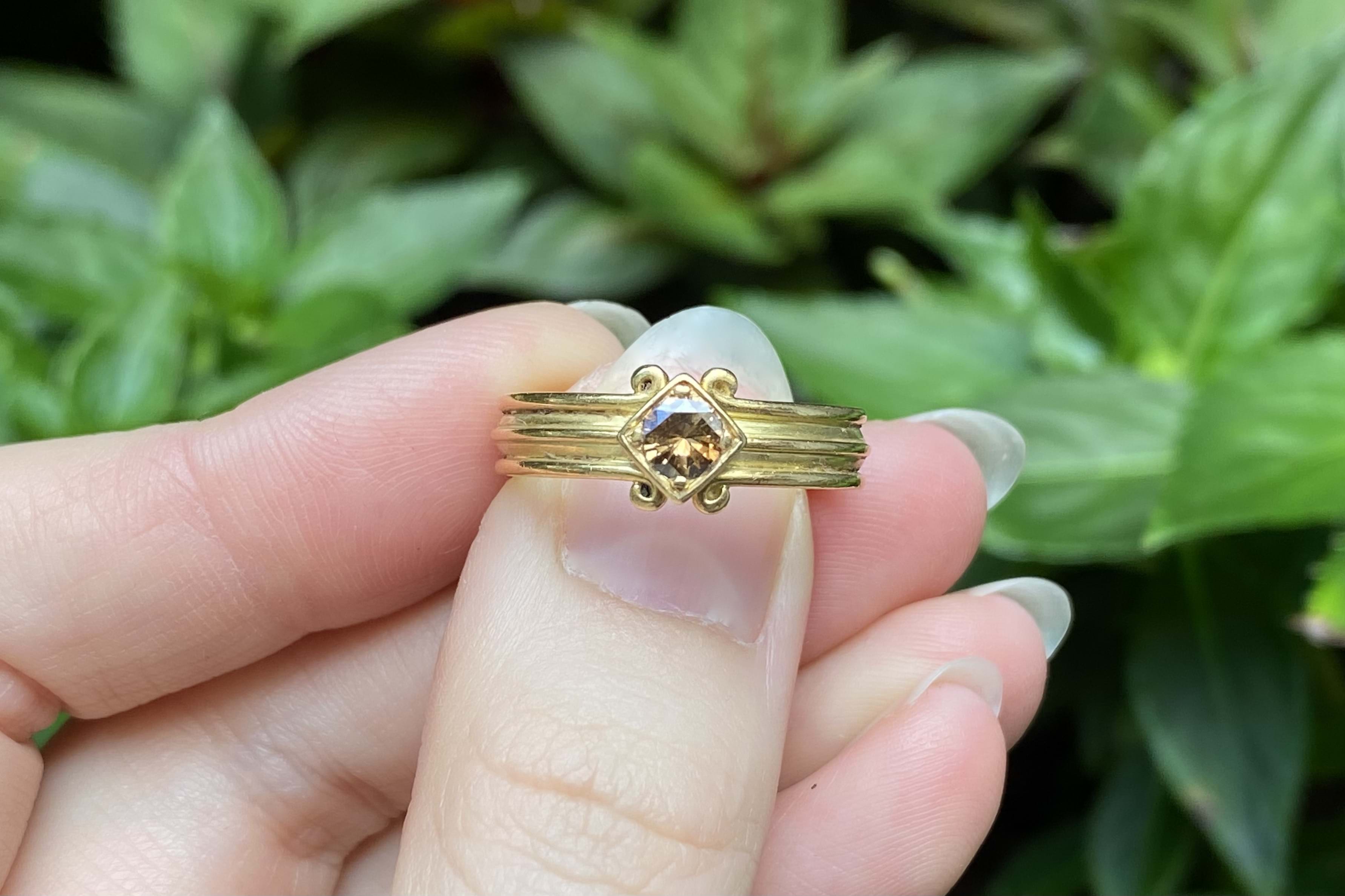 A unique 0.30ct round cognac deep brown diamond (SI/1) band. Diagonally square set in 18ct yellow gold, this handmade band has a grooved scroll feature and measures 4.44mm. Finger size N. Independent Valuation Supplied.