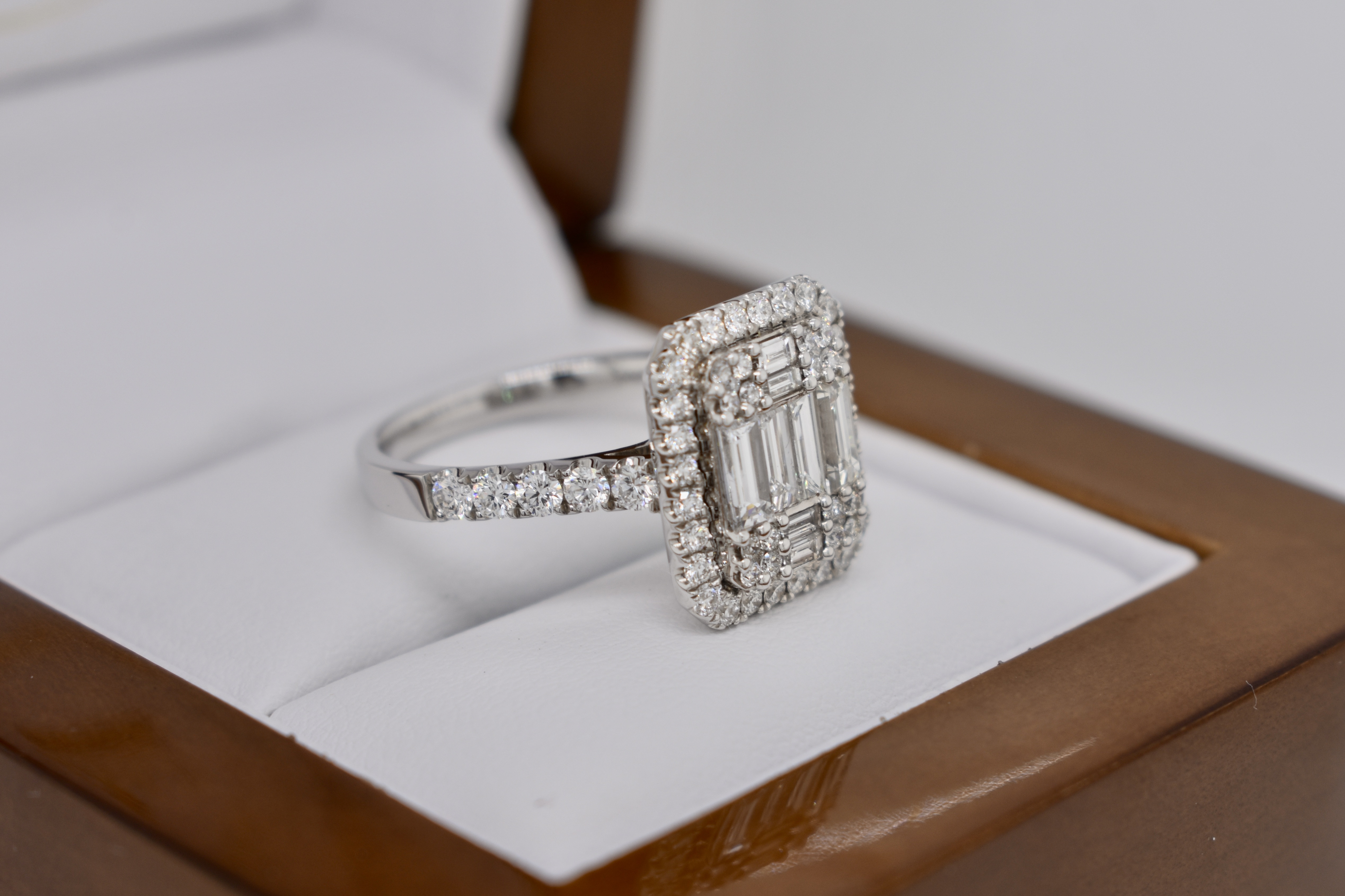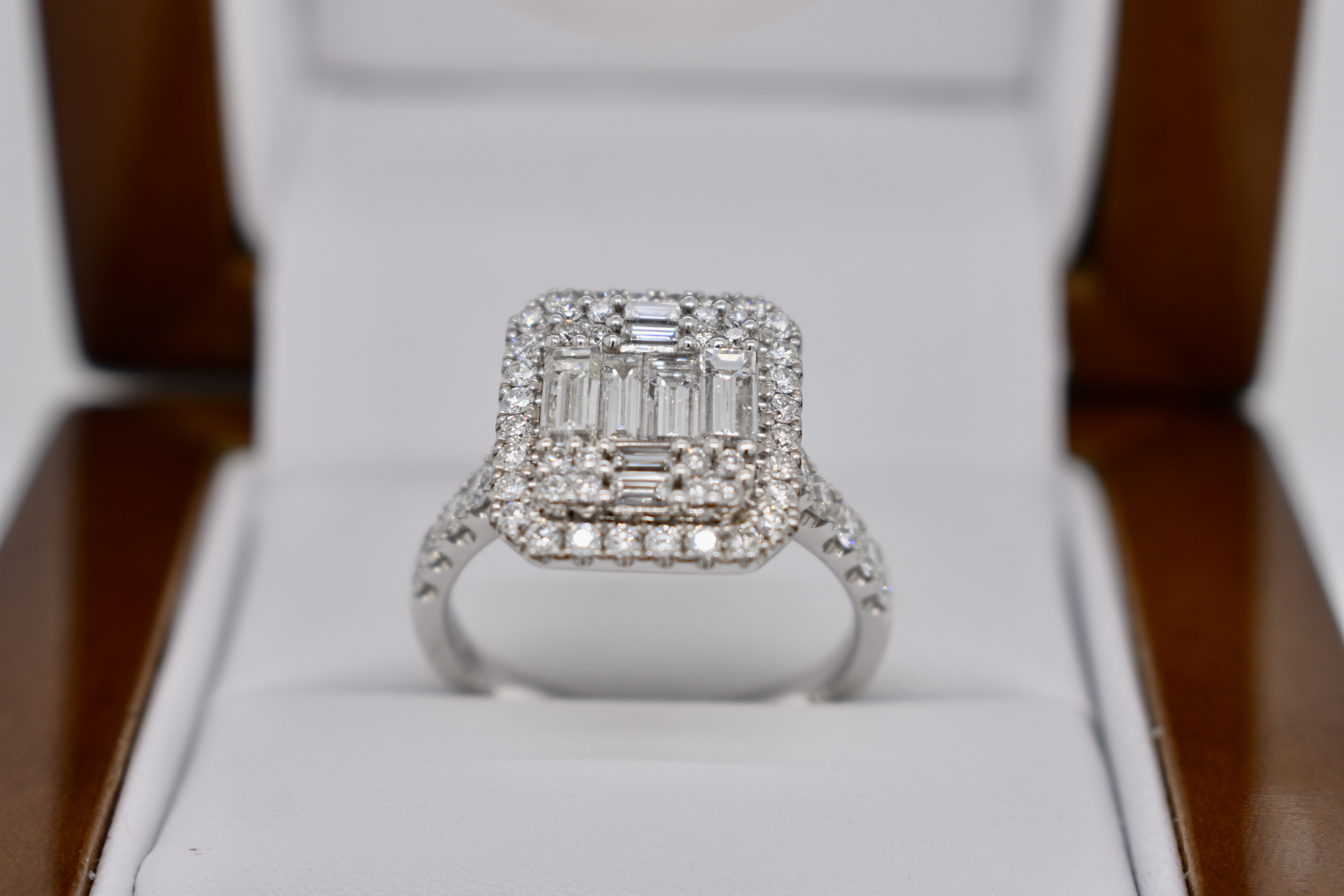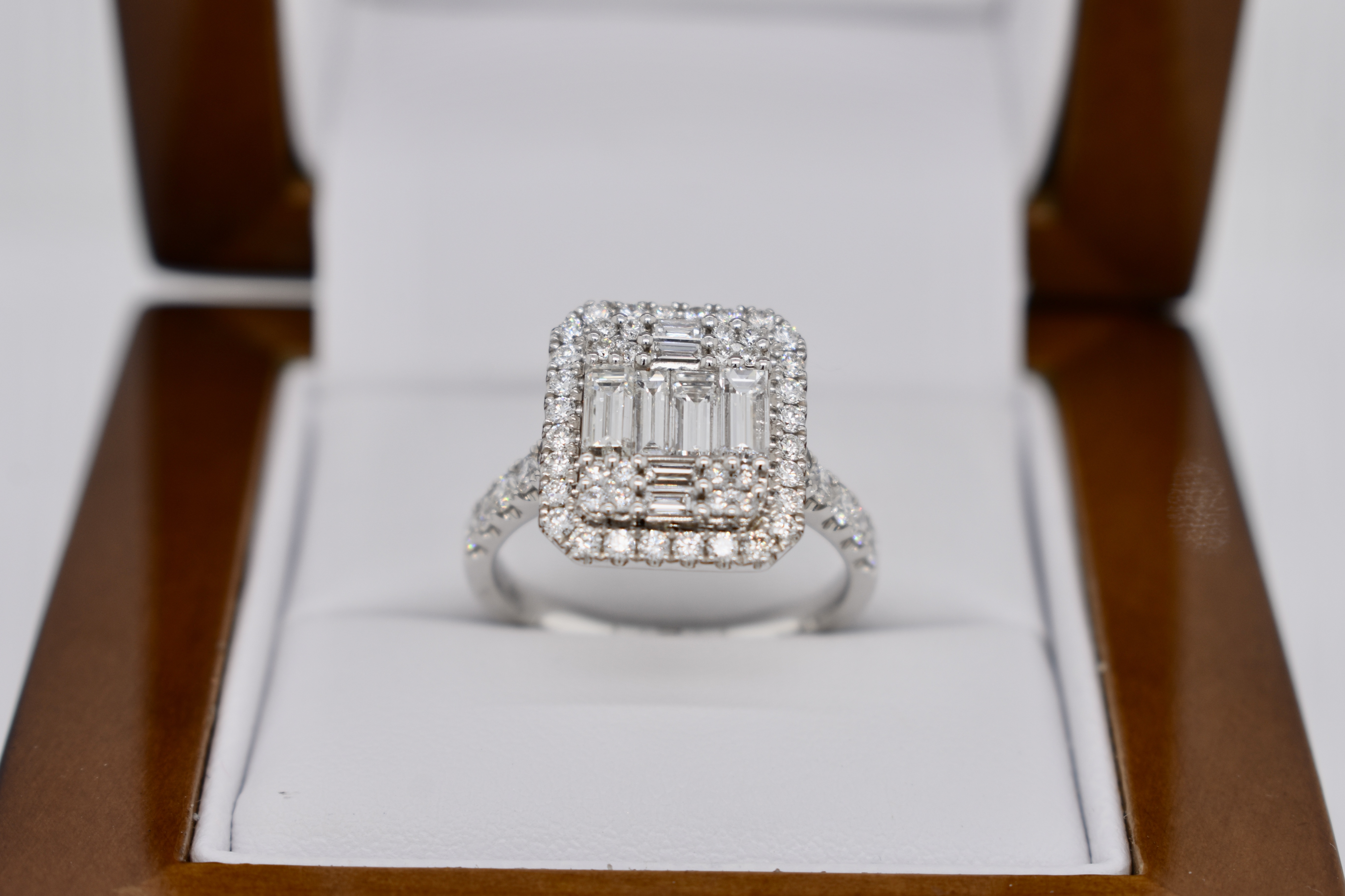 This dazzling diamond ring has a mosaic of 66 diamonds giving the illusion of a large emerald cut diamond ring. It is crafted in 18ct white gold, with 58 round brilliant cut diamonds equalling 0.71ct and 8 baguette diamonds equalling 0.87ct FG-VS/SI. The diamonds also continue down the 2.24mm band, adding even more sparkle to the look. Finger size M+. Independent Valuation Supplied