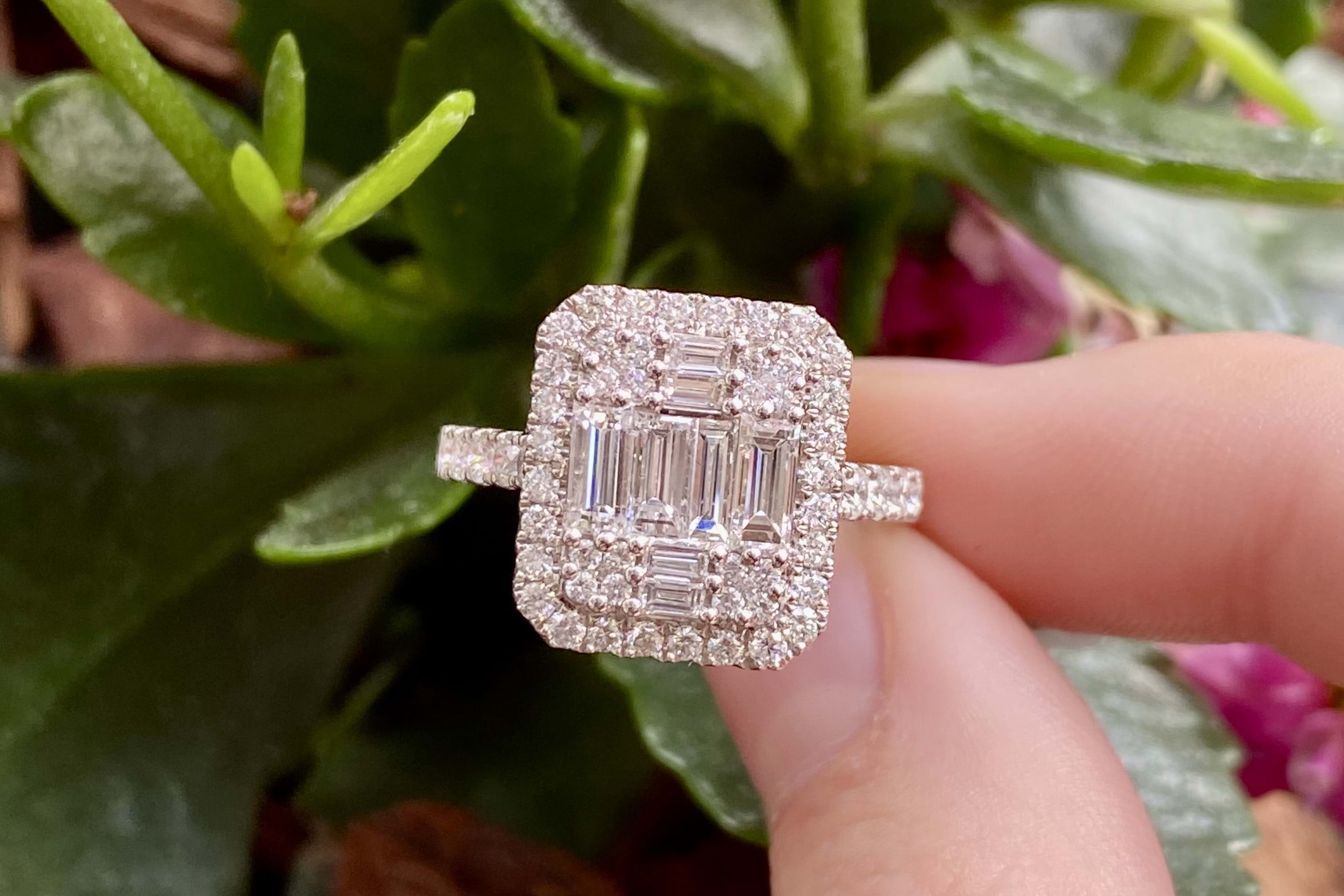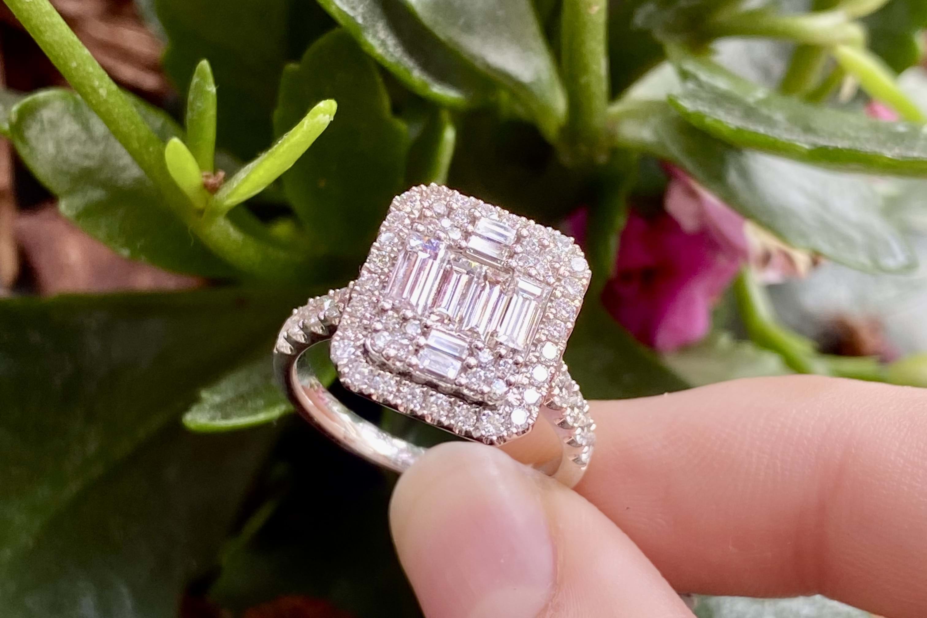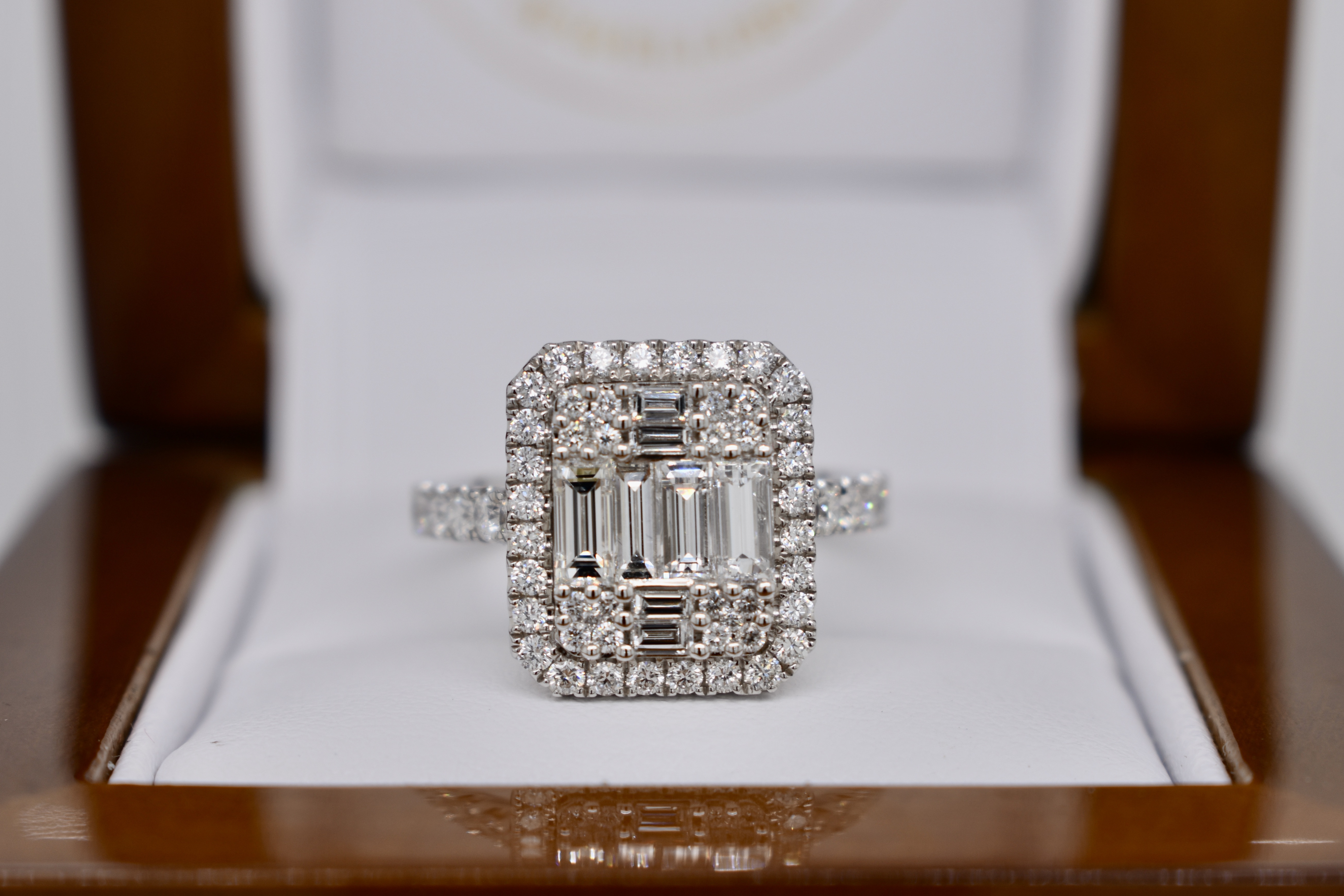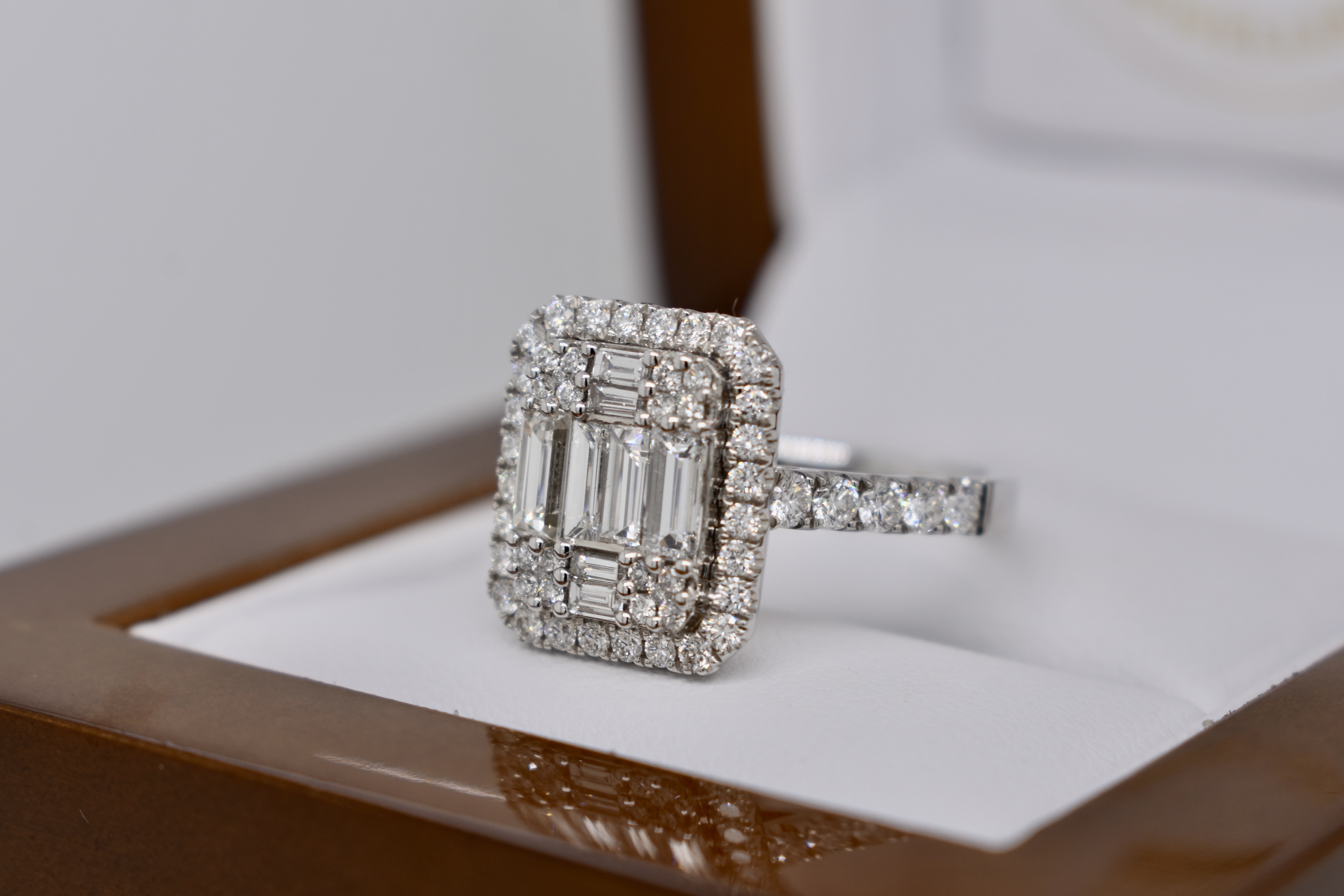 This dazzling diamond ring has a mosaic of 66 diamonds giving the illusion of a large emerald cut diamond ring. It is crafted in 18ct white gold, with 58 round brilliant cut diamonds equalling 0.71ct and 8 baguette diamonds equalling 0.87ct FG-VS/SI. The diamonds also continue down the 2.24mm band, adding even more sparkle to the look. Finger size M+. Independent Valuation Supplied