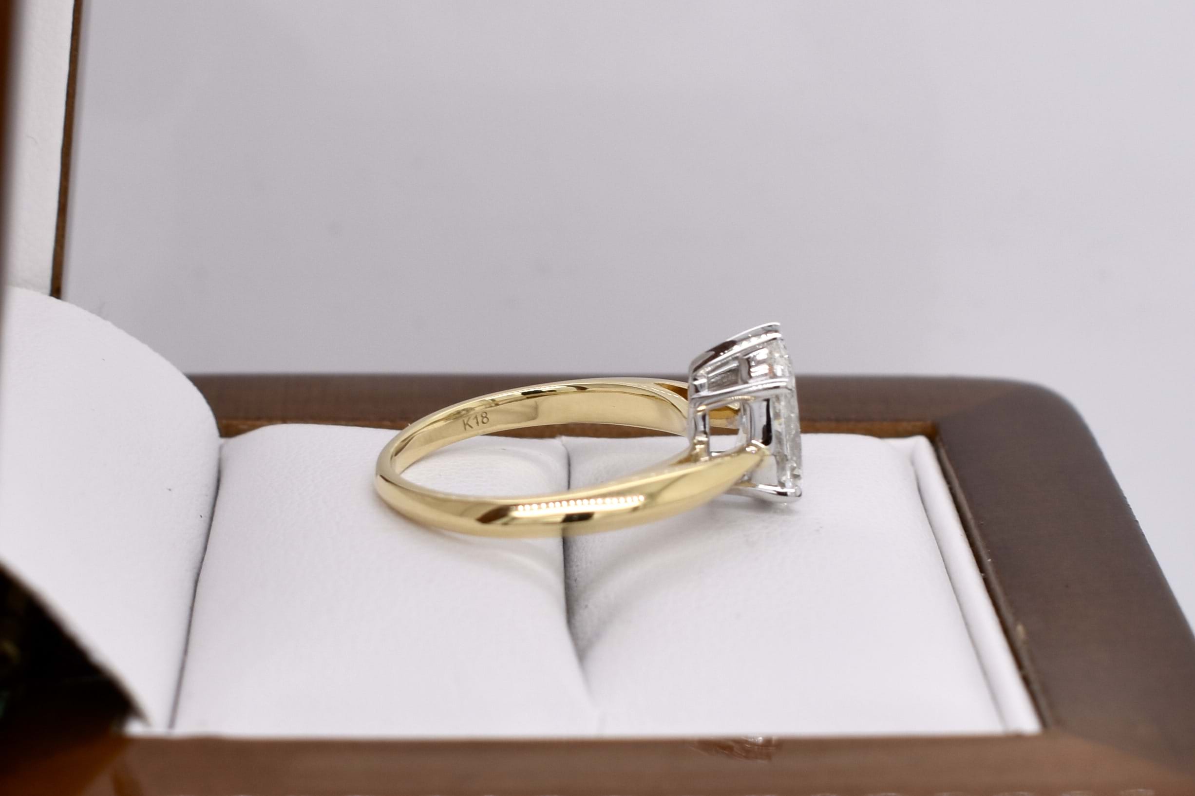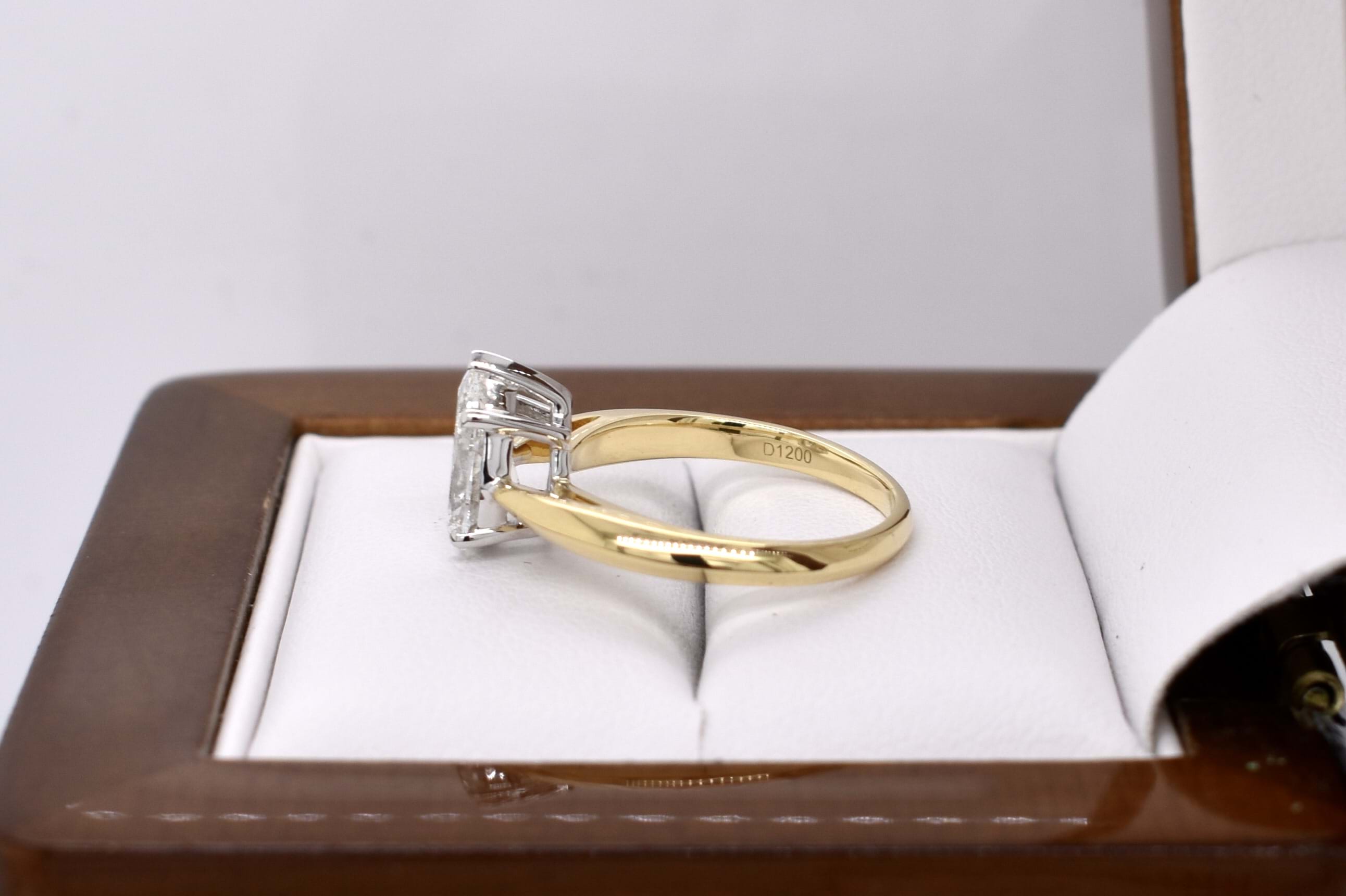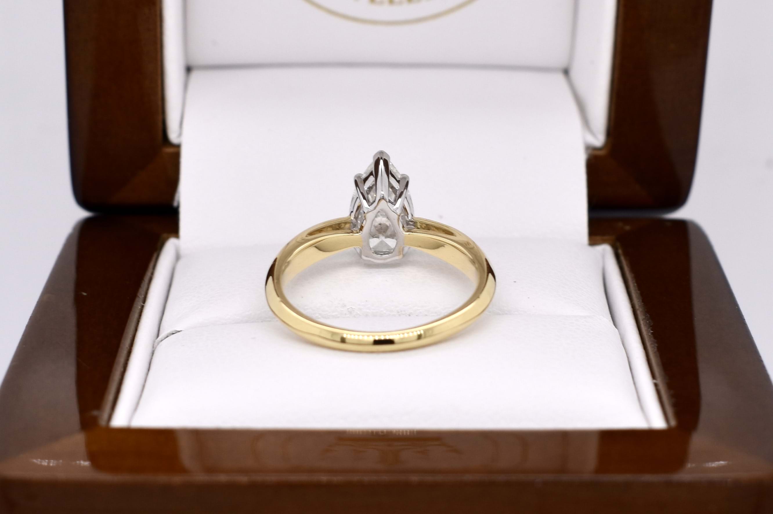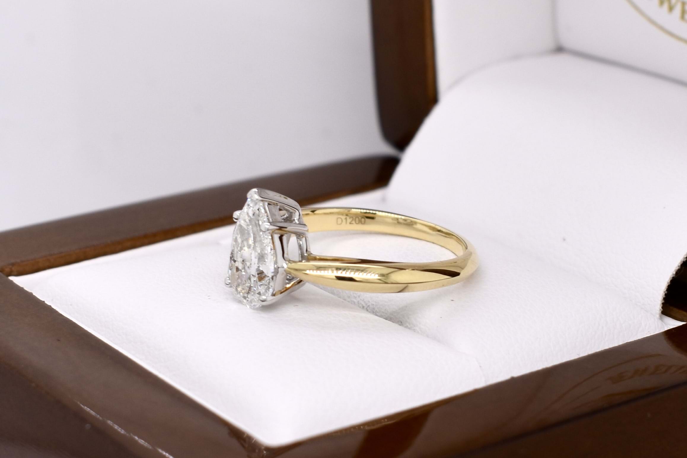 Crafted in 18ct yellow gold, this stunning secondhand diamond ring features a solitaire pear shaped 9.67x5.87x3.55mm diamond of 1.20ct H SI2. The diamond has a GIA laser inscription on the girdle and is four claw and cap set on a 1.83mm soft knife edge band with pointed swept up shoulders. Finger size J. Independent Valuation Supplied.