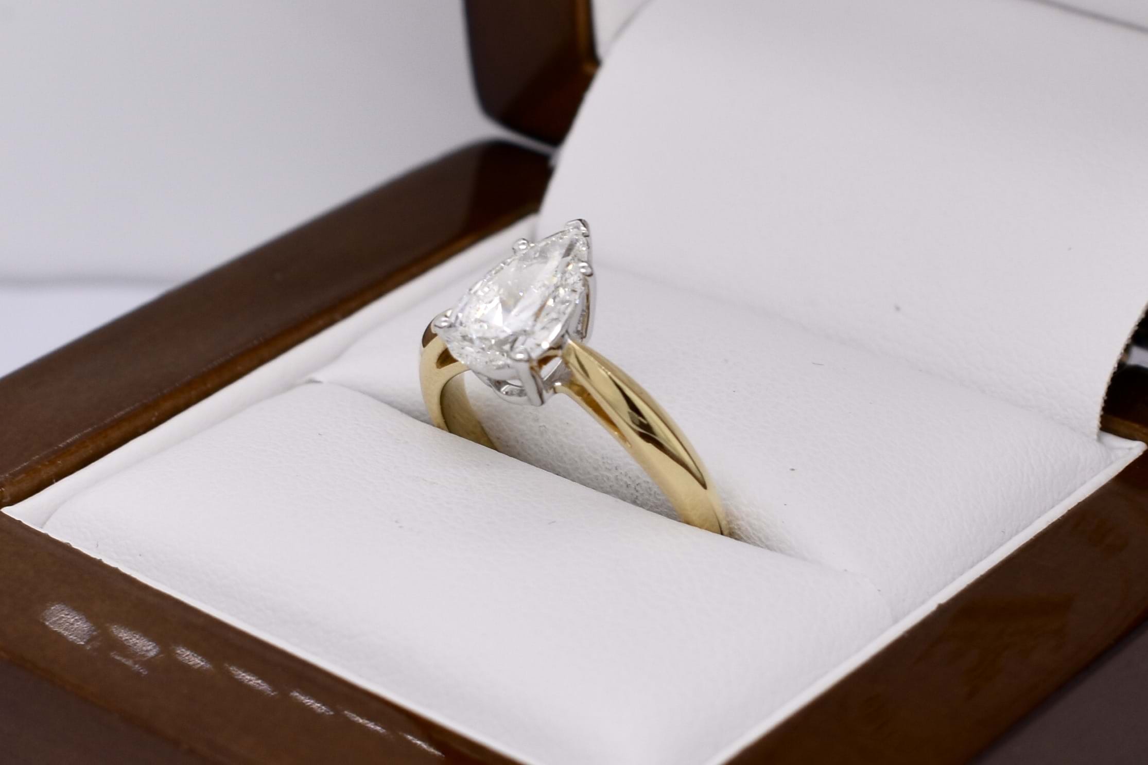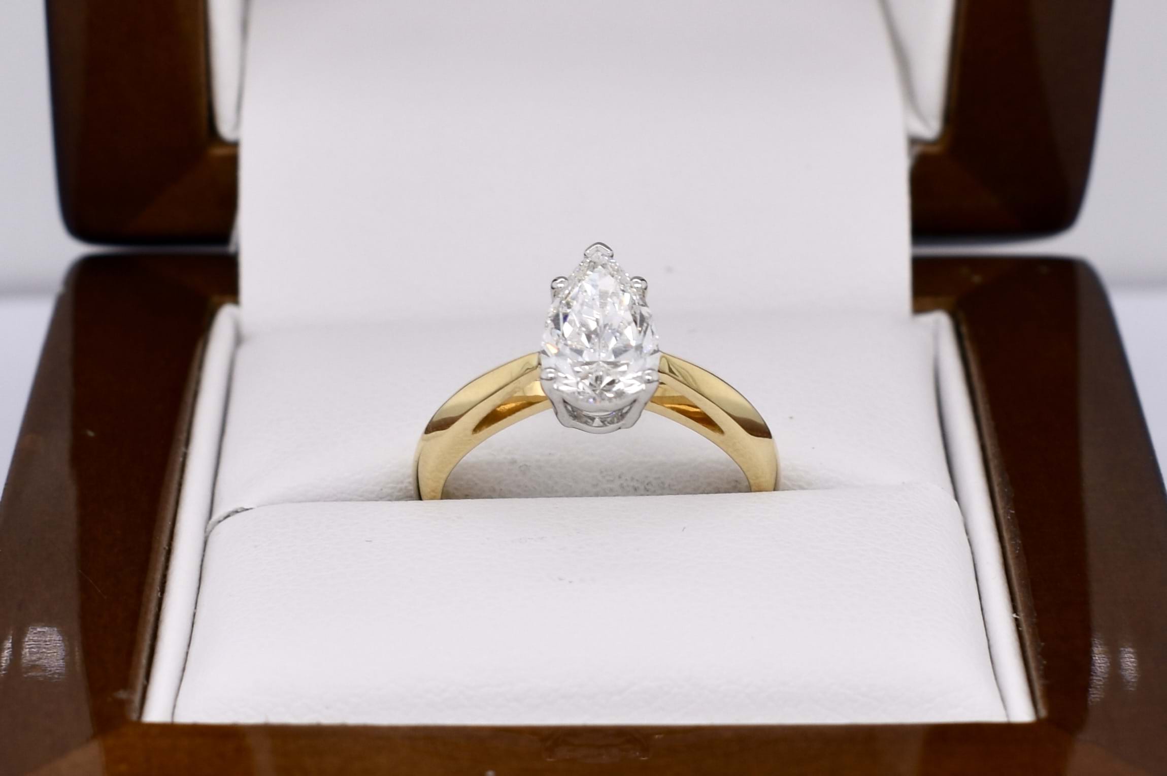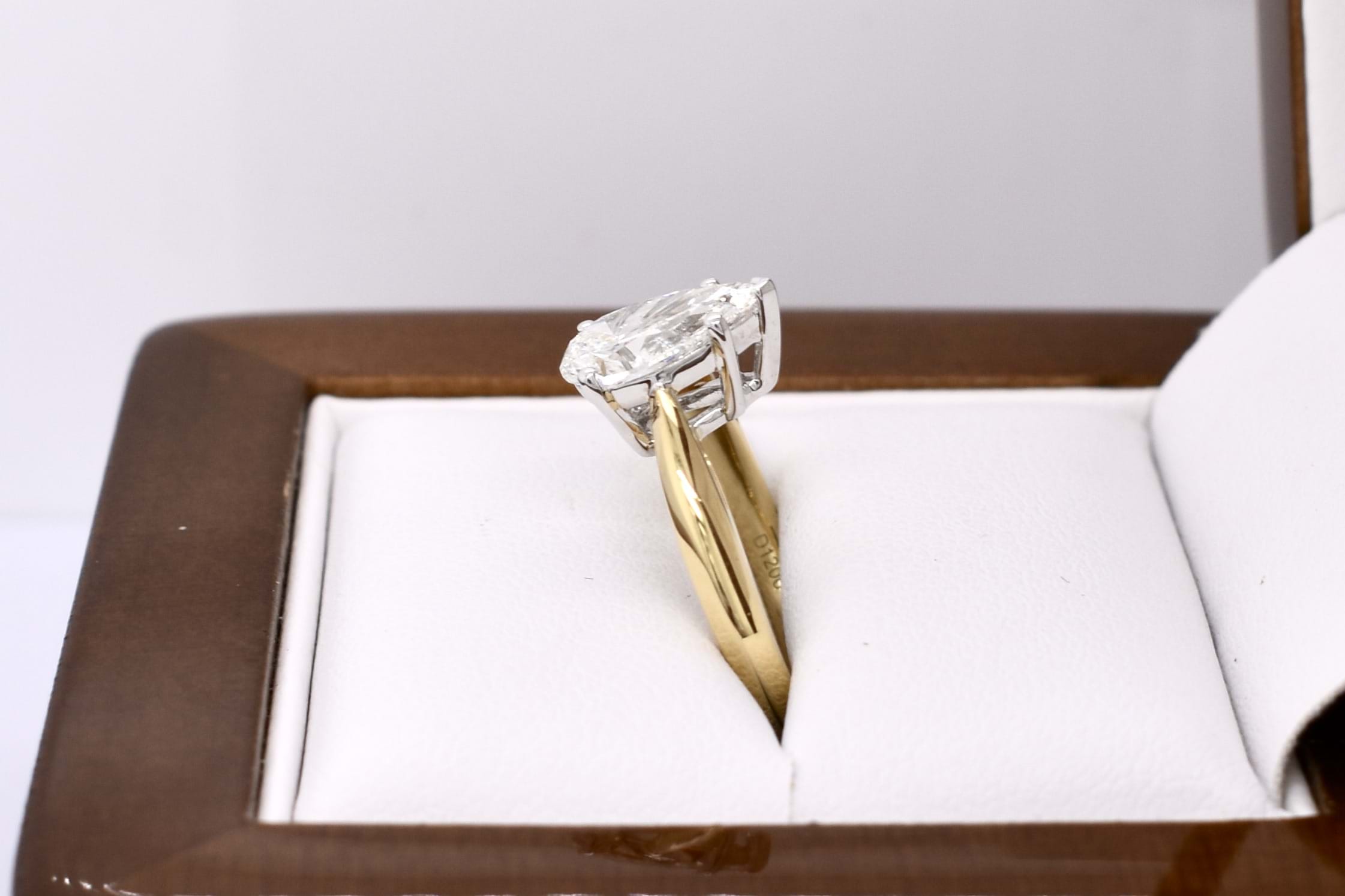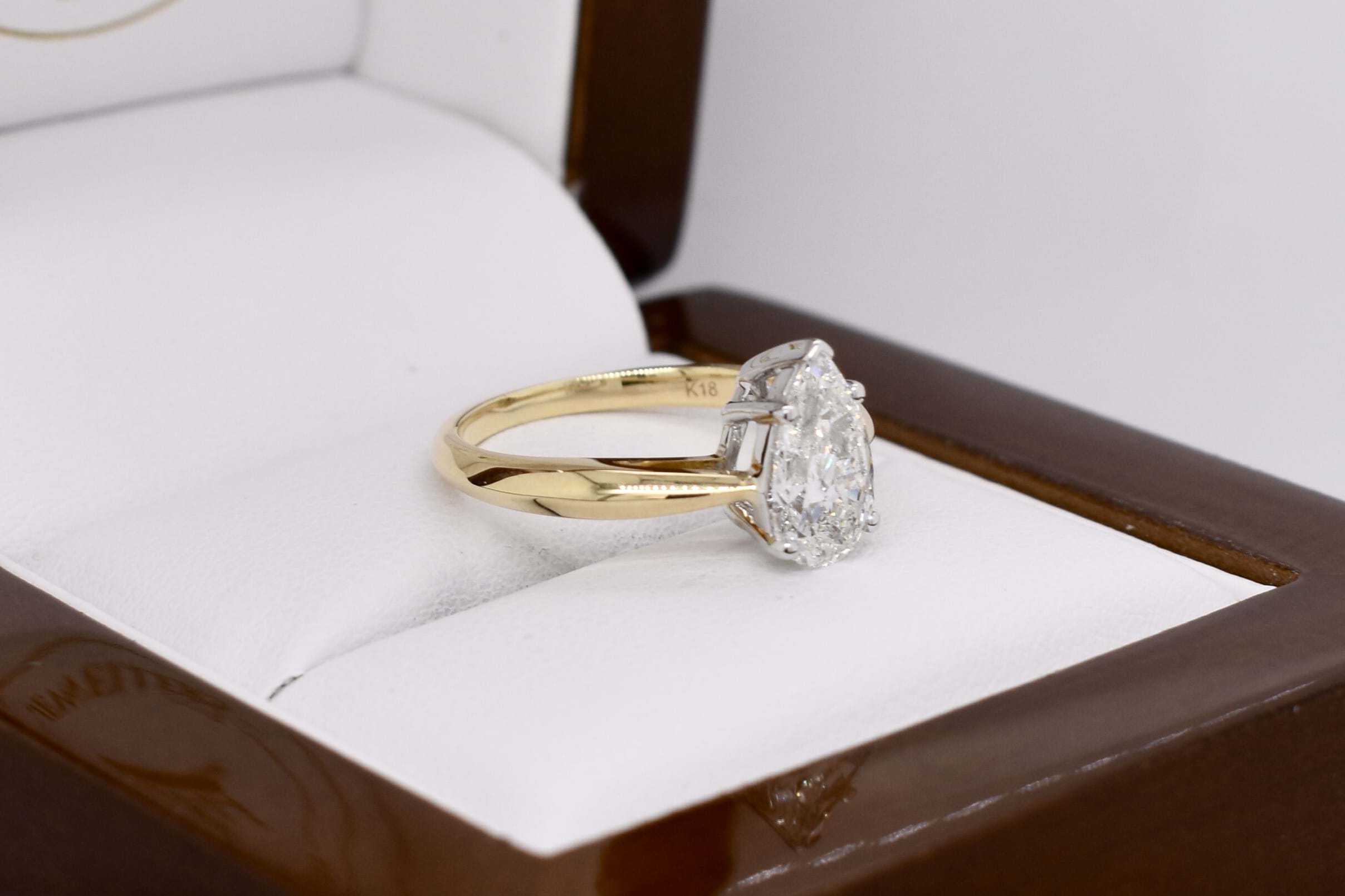 Crafted in 18ct yellow gold, this stunning secondhand diamond ring features a solitaire pear shaped 9.67x5.87x3.55mm diamond of 1.20ct H SI2. The diamond has a GIA laser inscription on the girdle and is four claw and cap set on a 1.83mm soft knife edge band with pointed swept up shoulders. Finger size J. Independent Valuation Supplied.